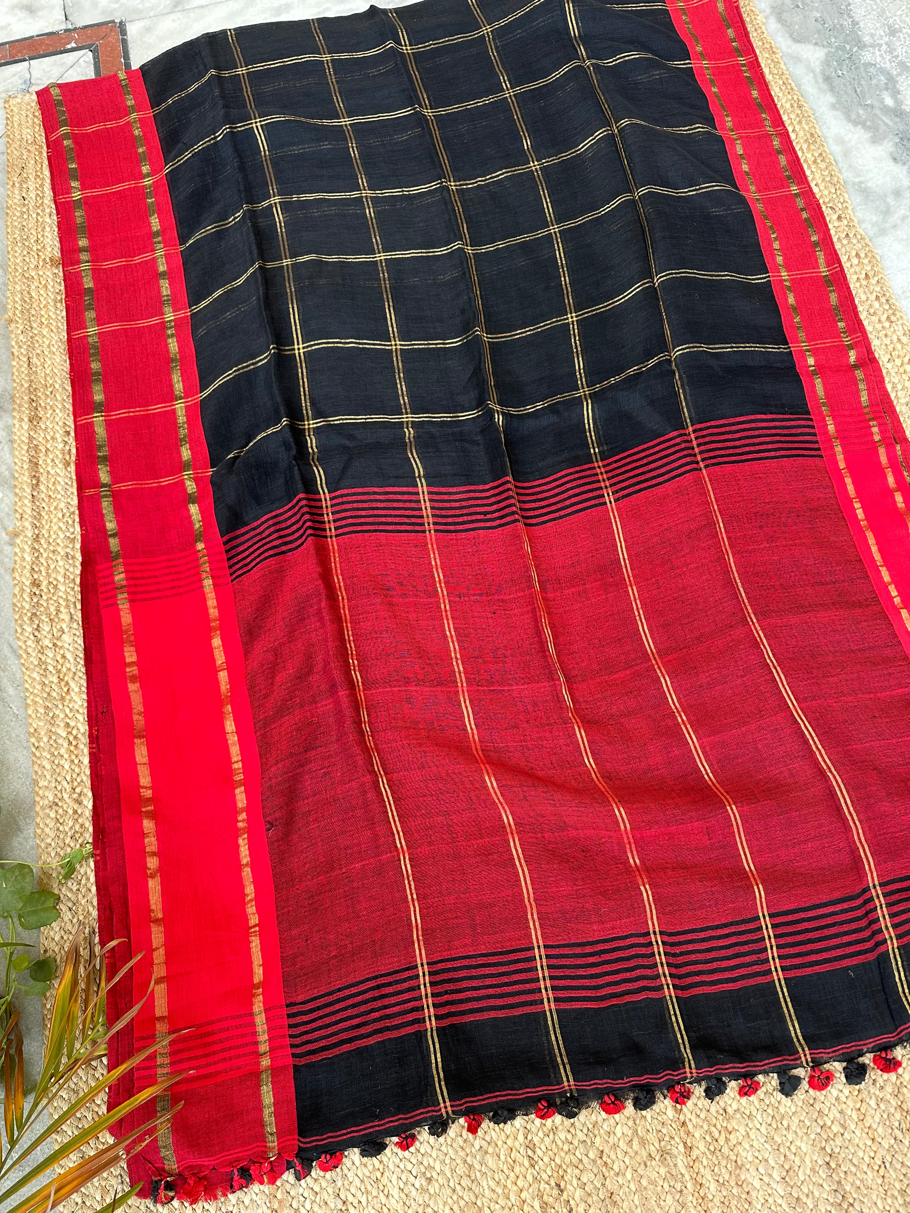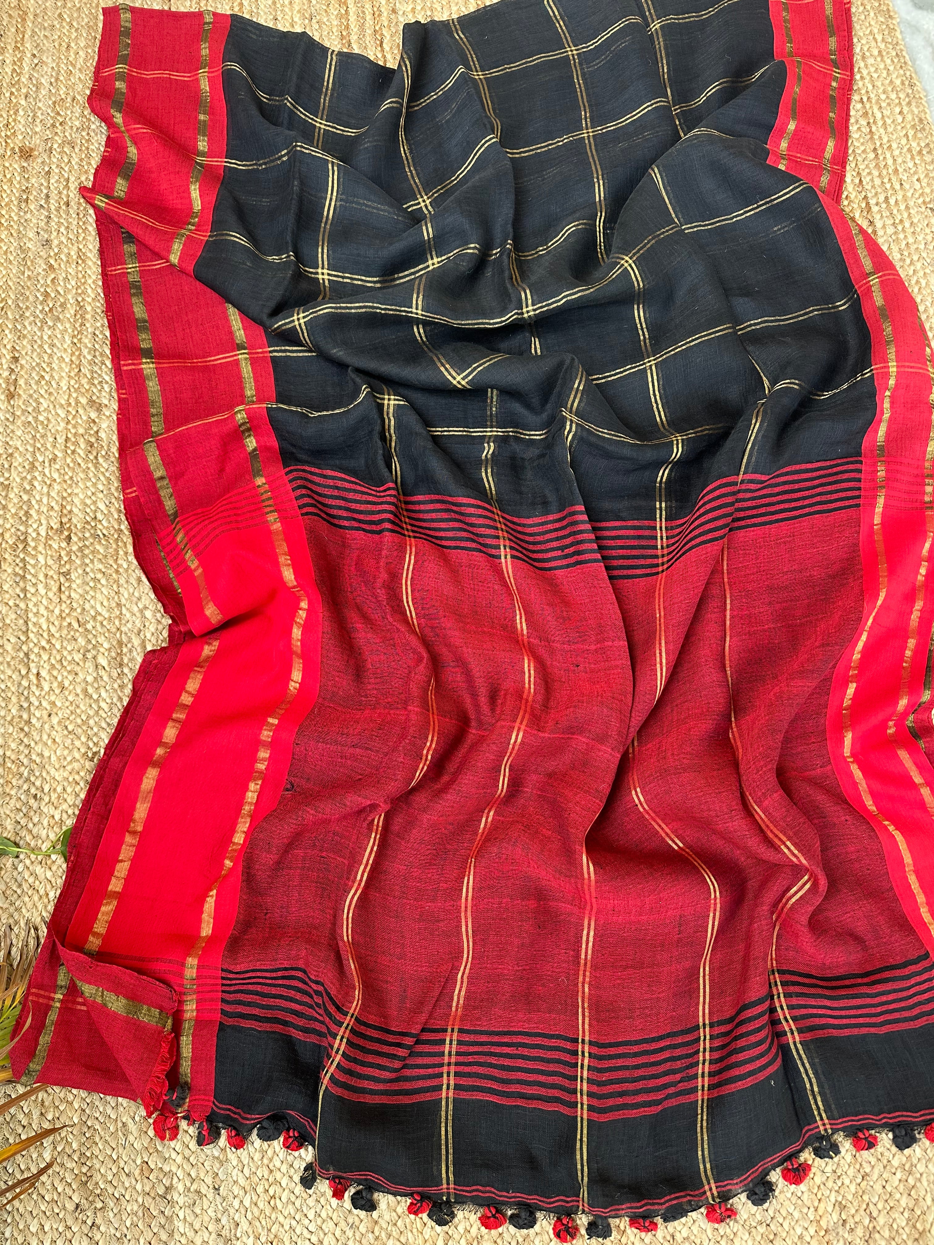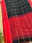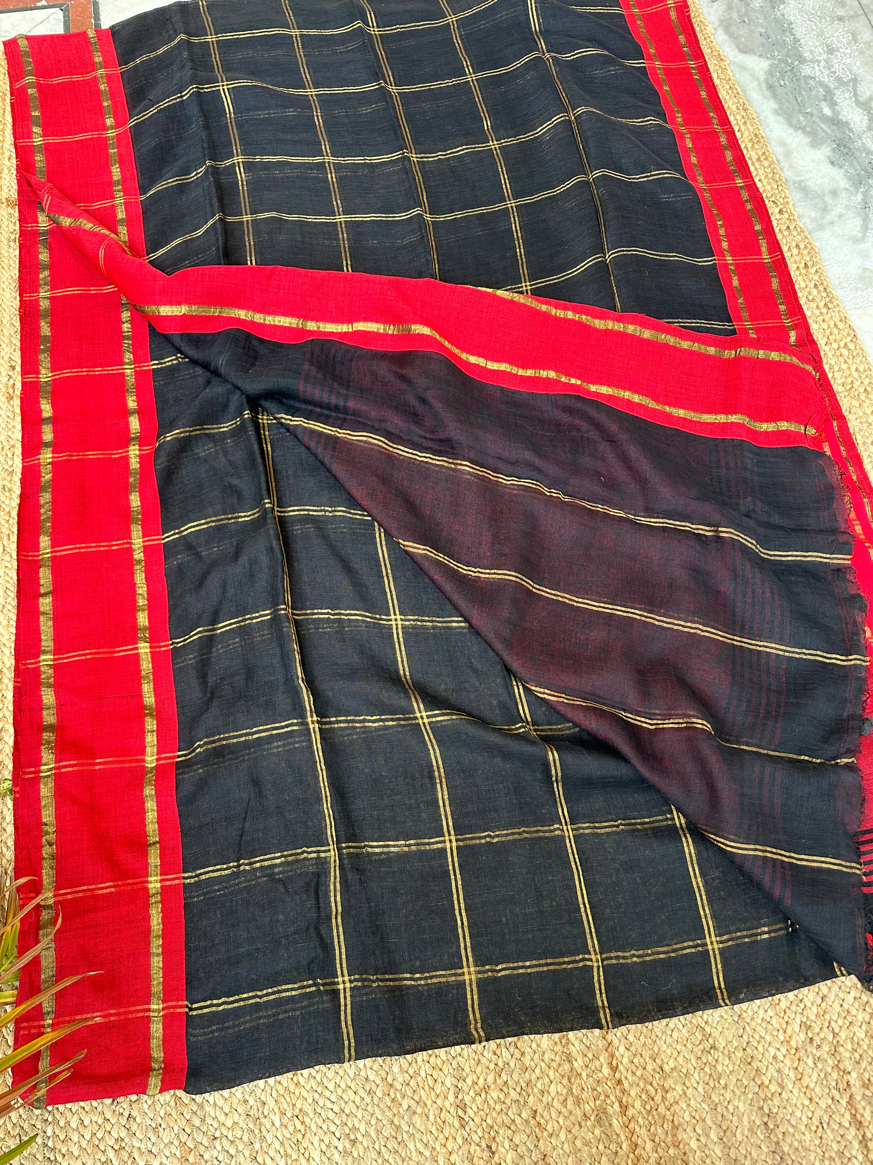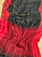 Black Checks Linen Handloom Saree with Red Borders