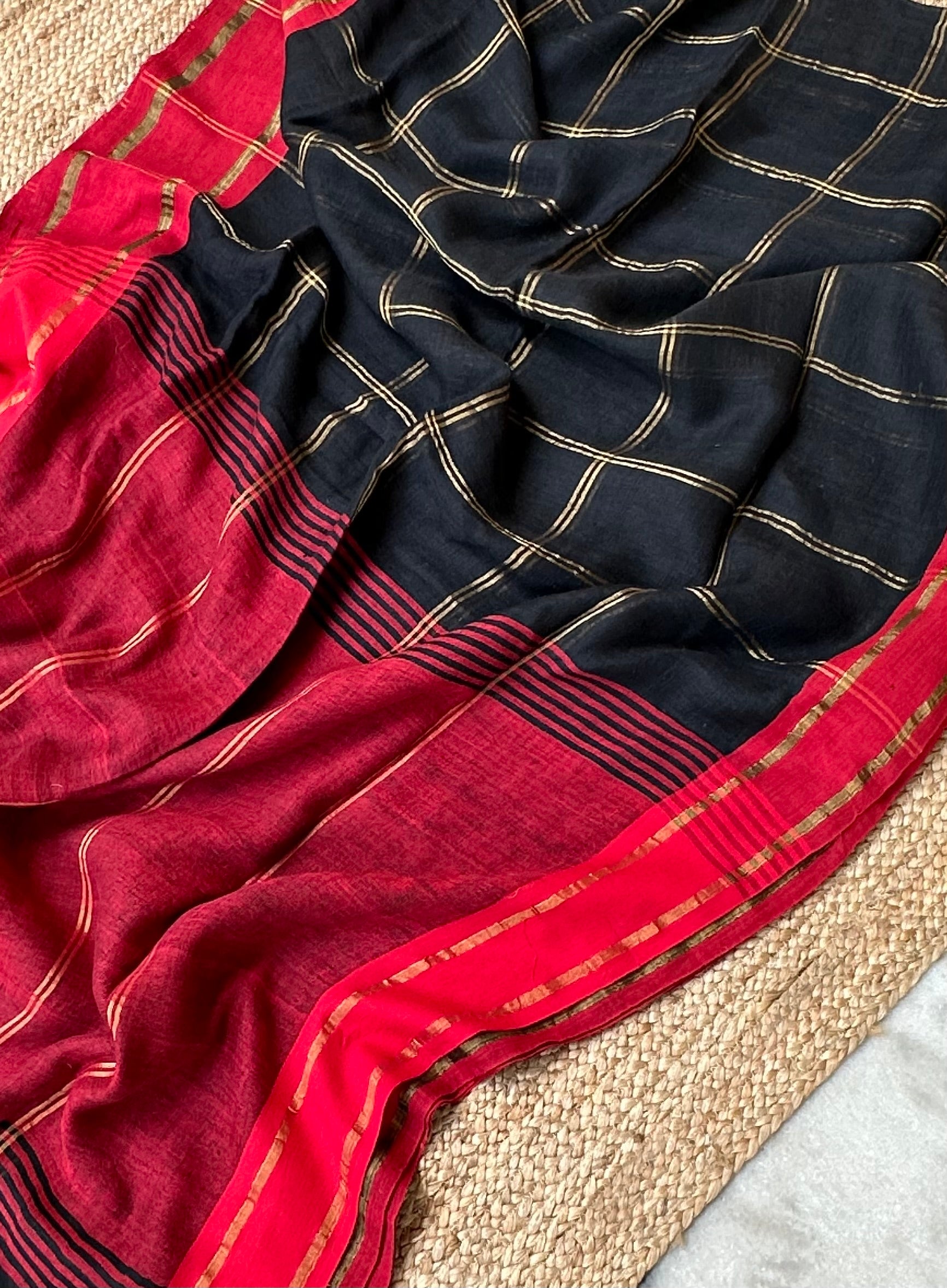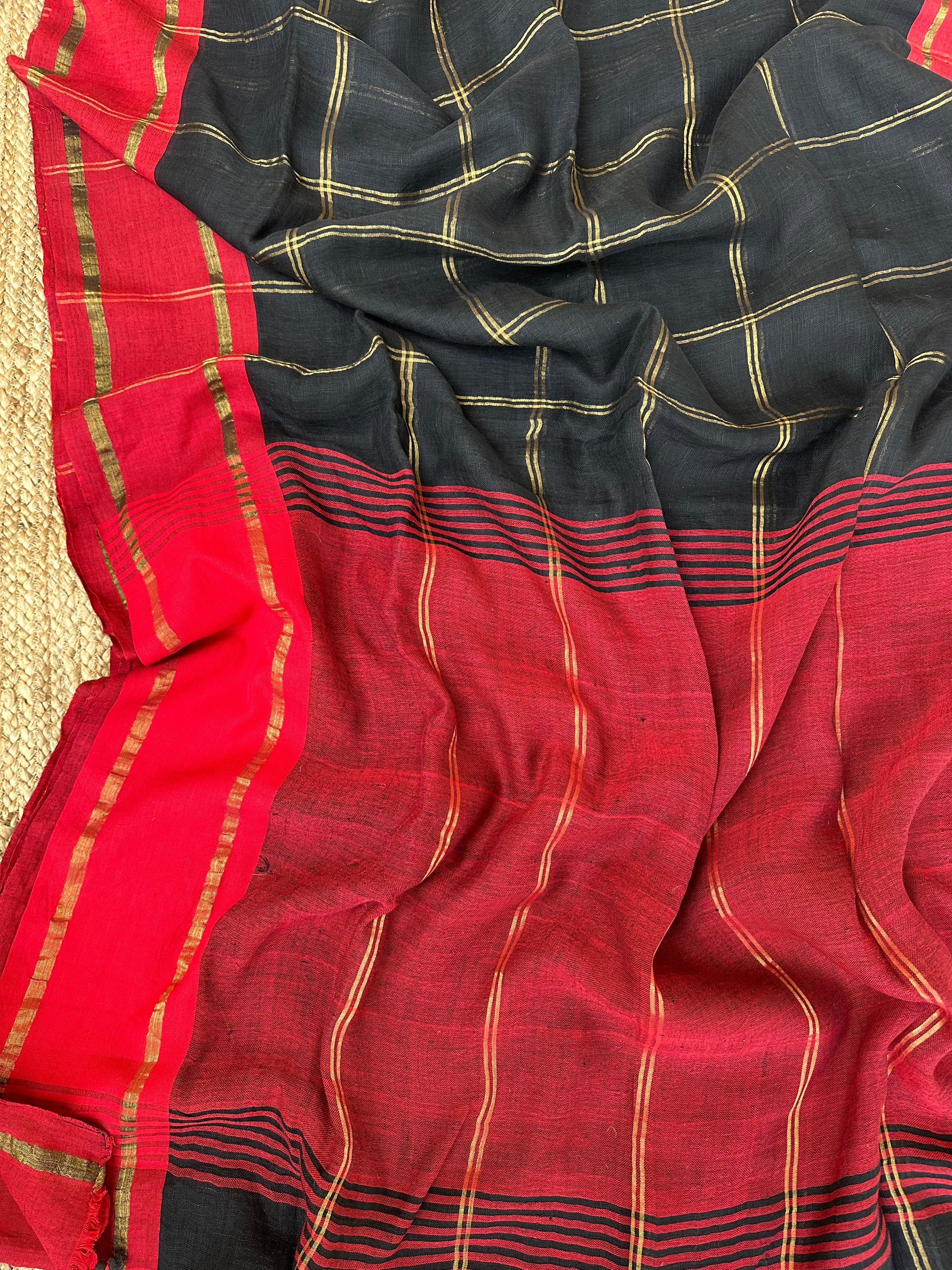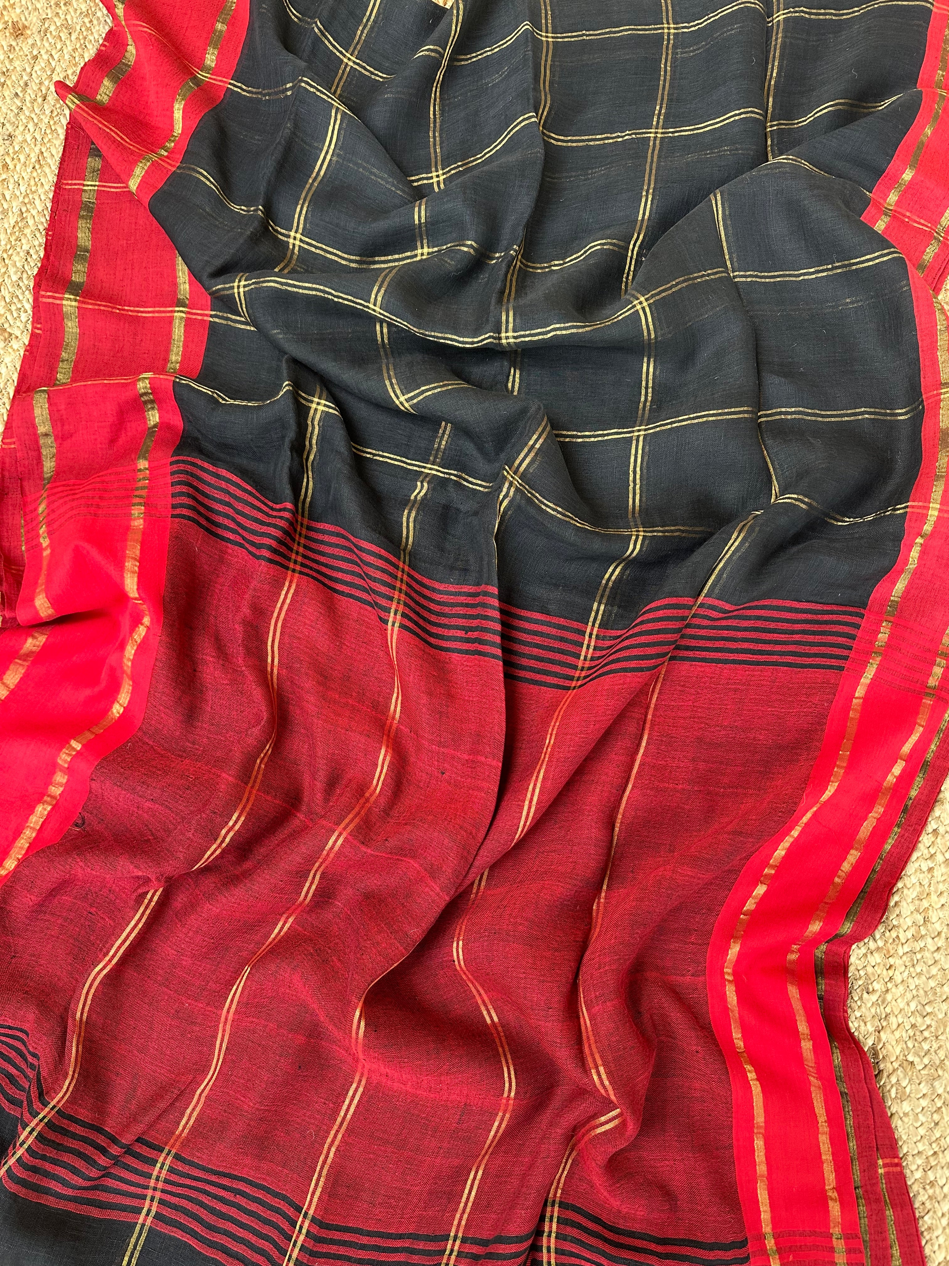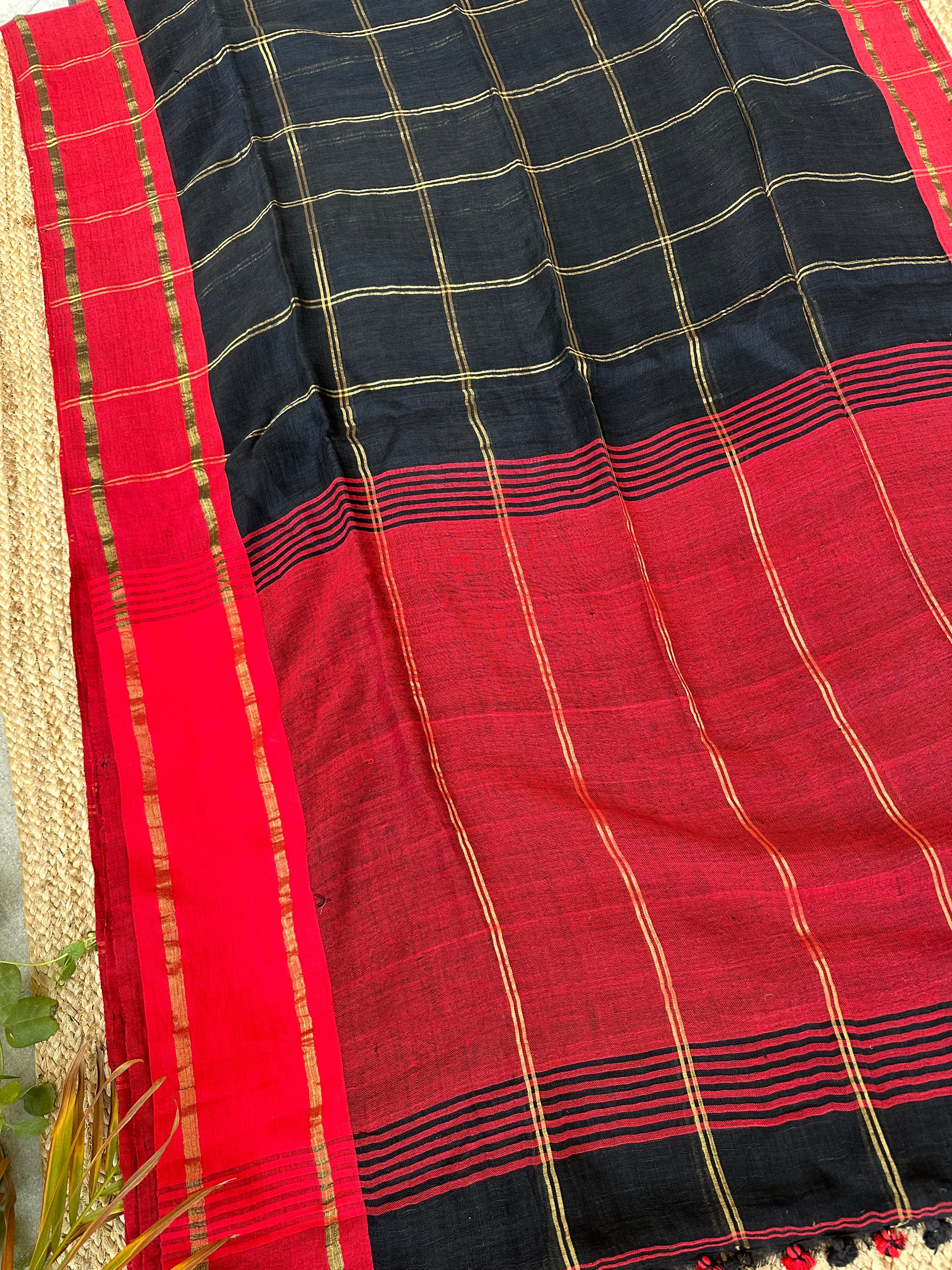Black Checks Linen Handloom Saree with Red Borders
