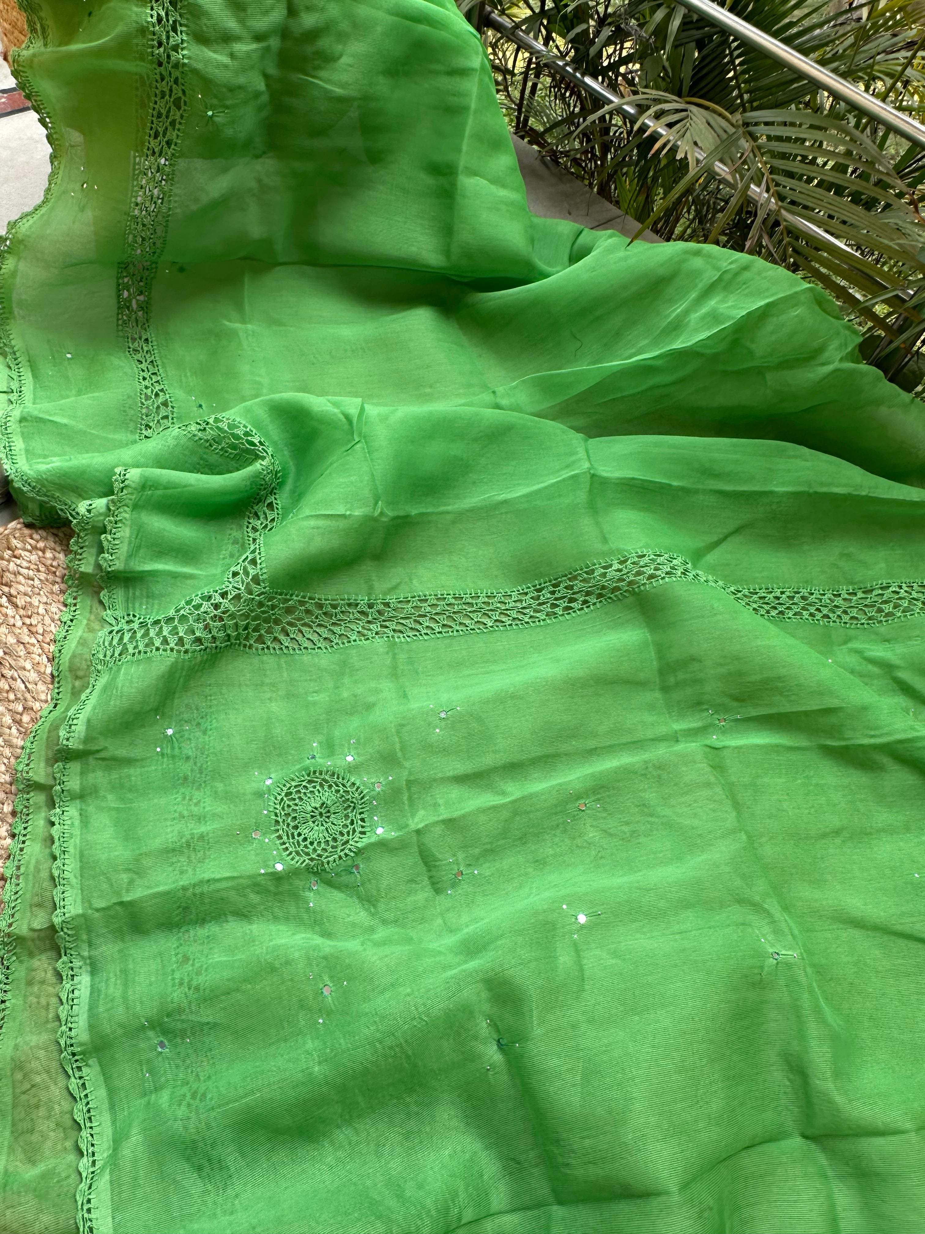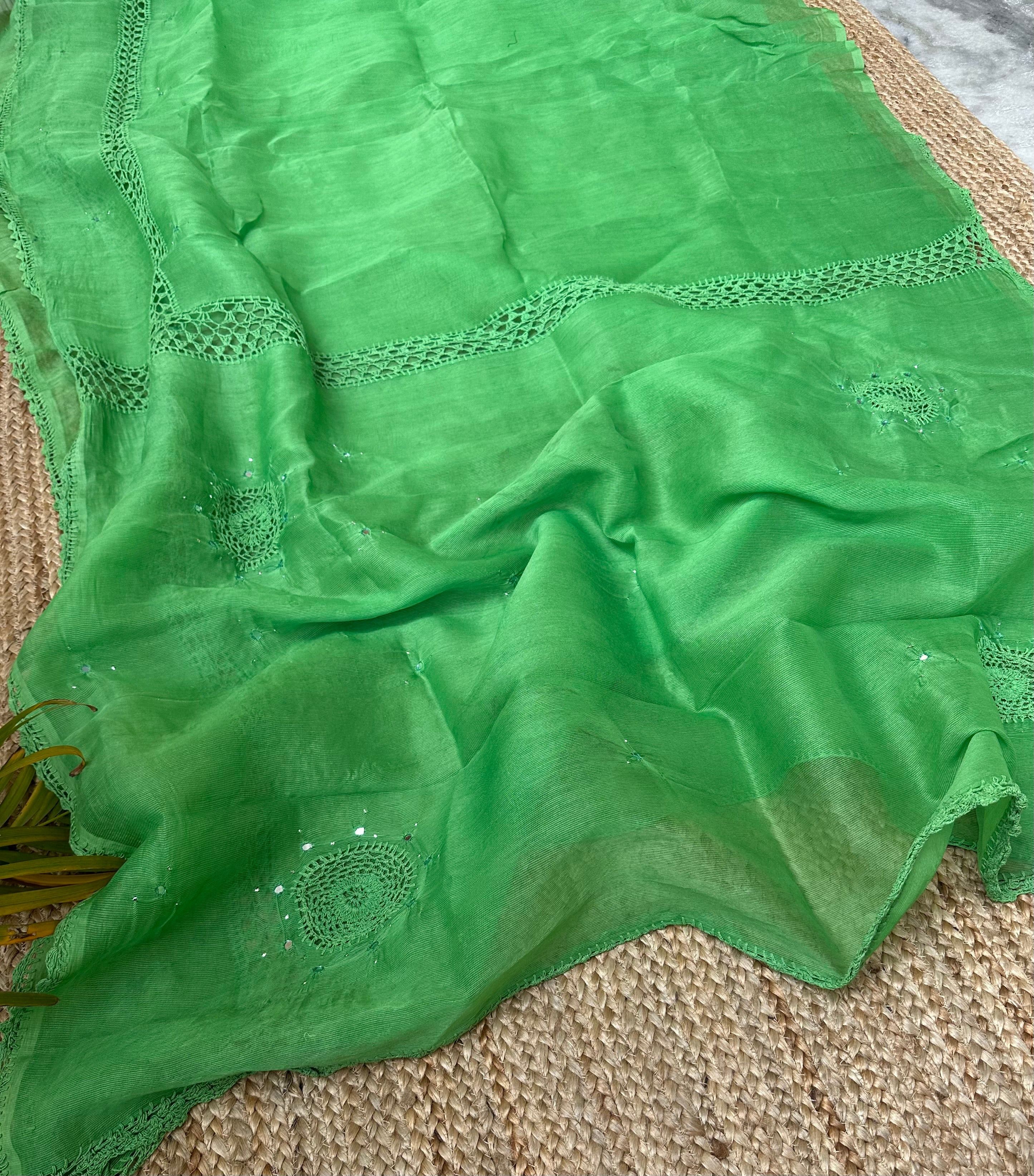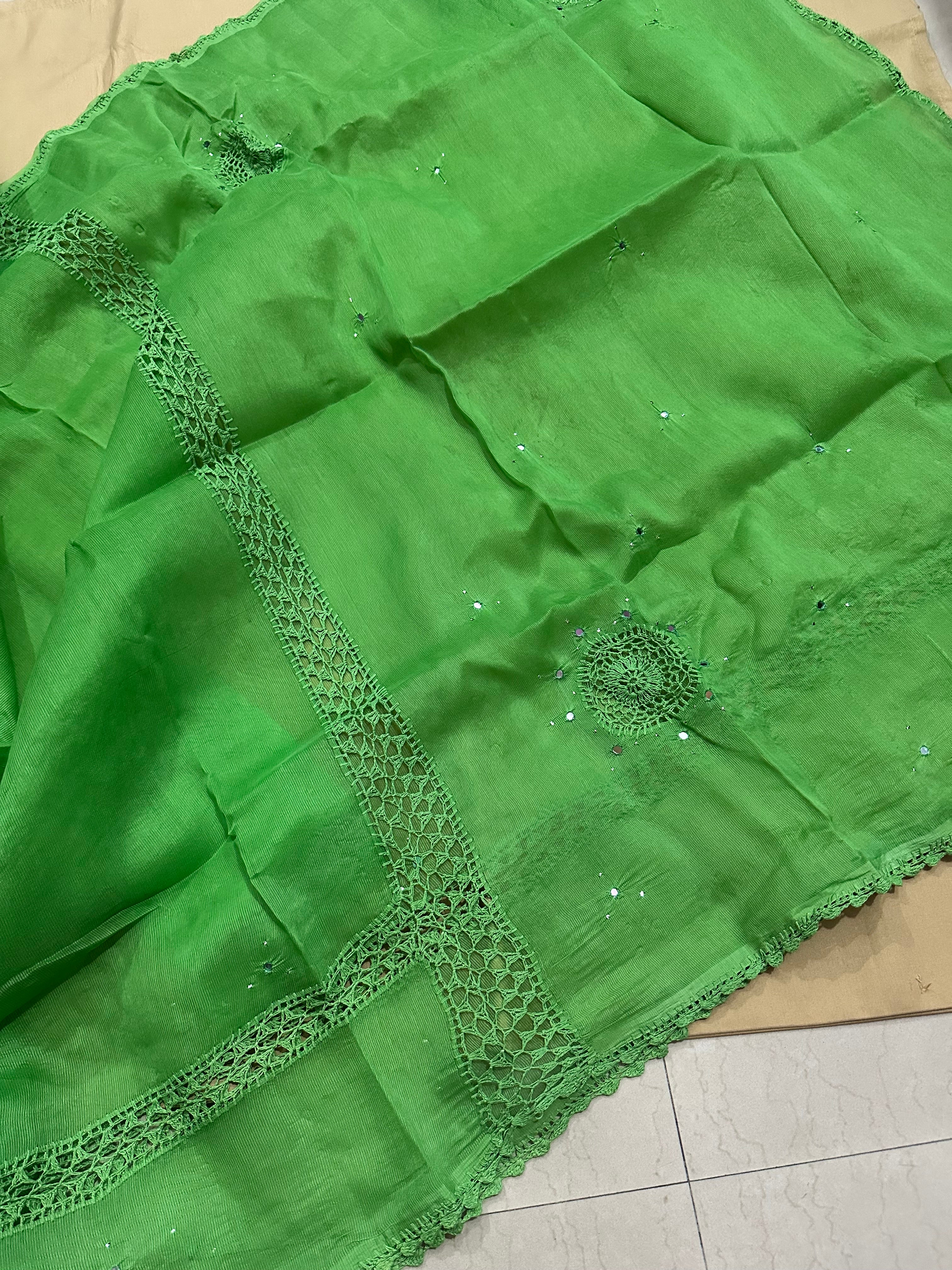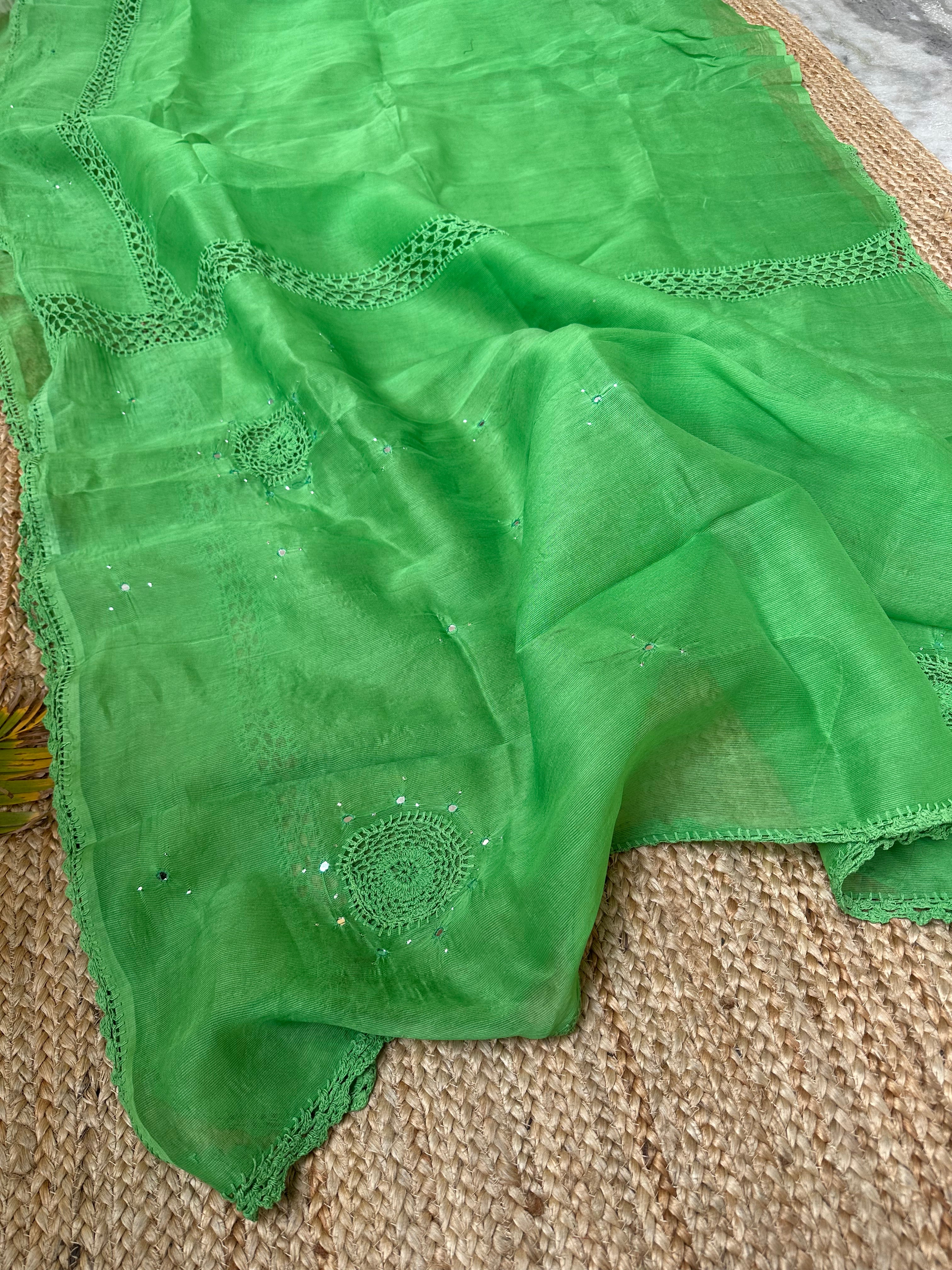 Material: Supernet fabric. Has little shine. Stiffness is medium but comfortable to wear sarees. Have handwork of crochet on pally borders. In between there is hand stitched mirror work making saree perfect for any occasion. Length 5.5 mtrs.
