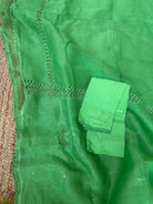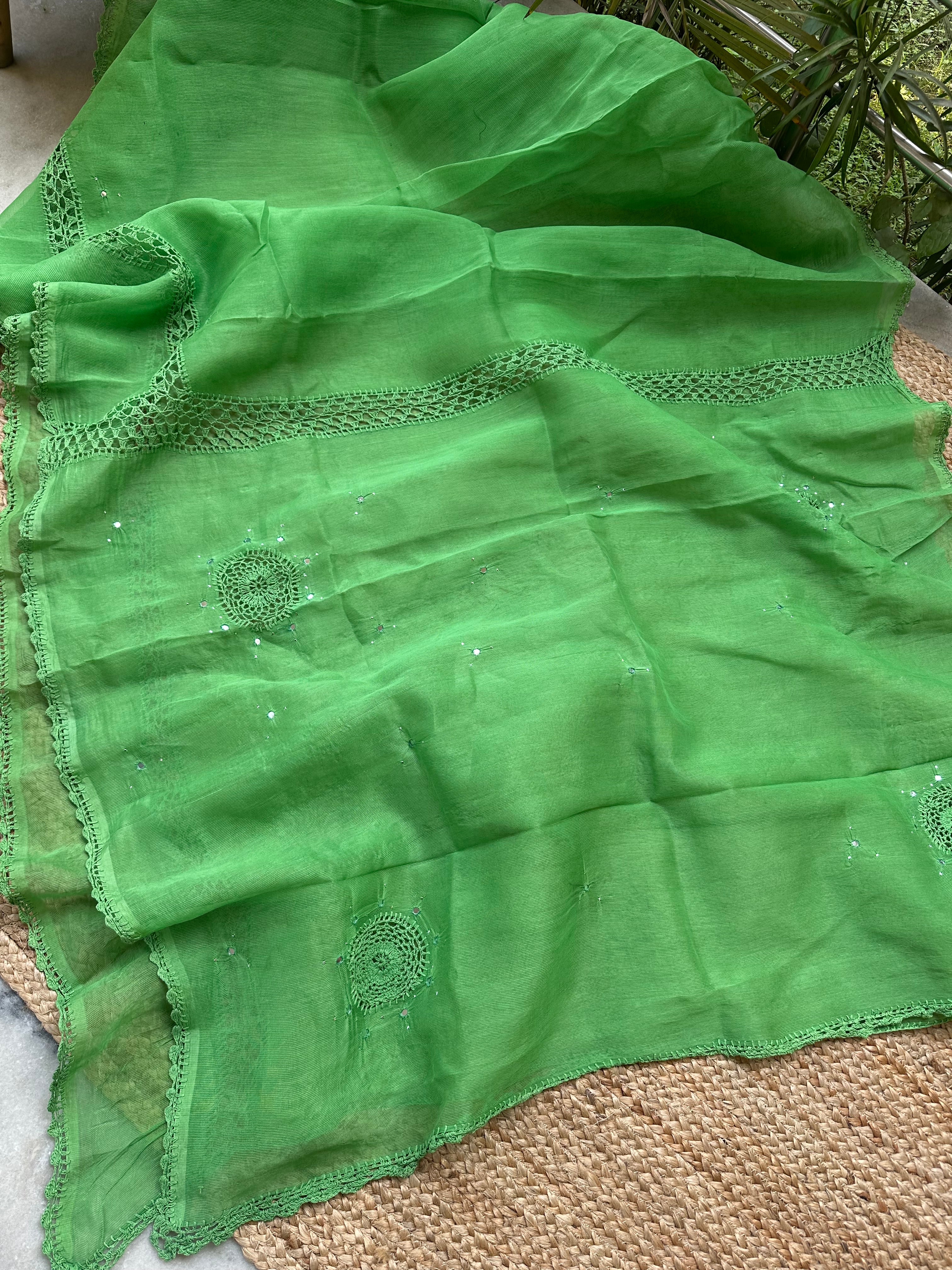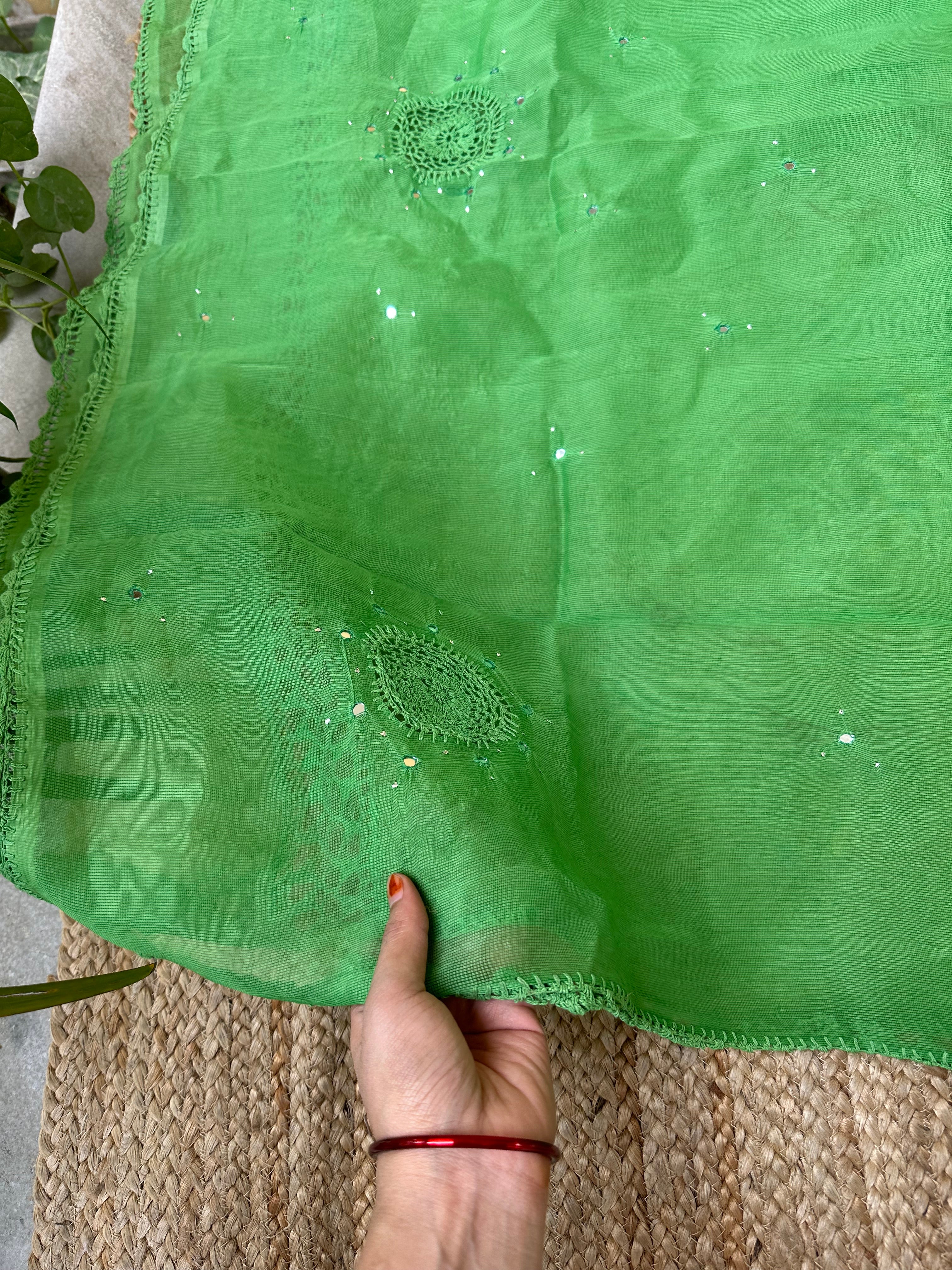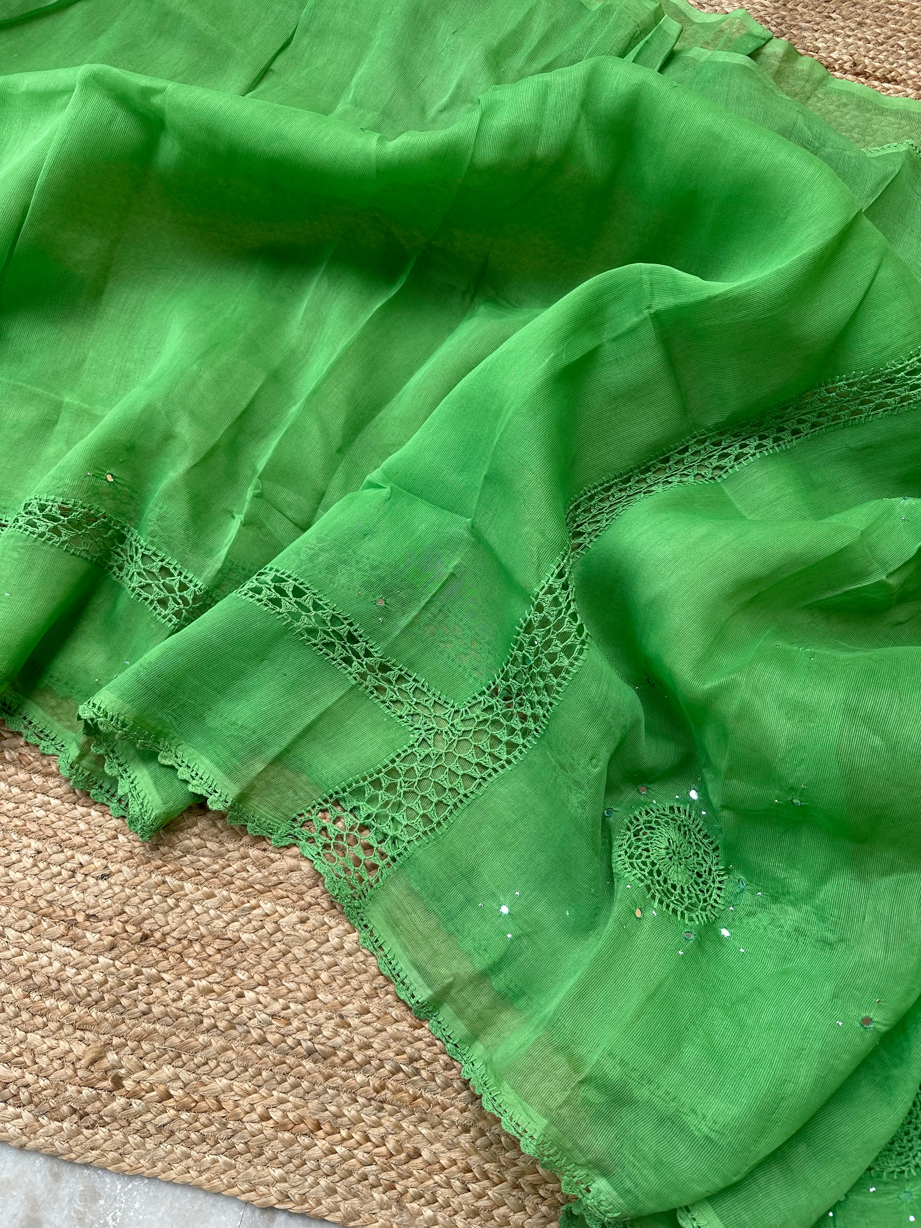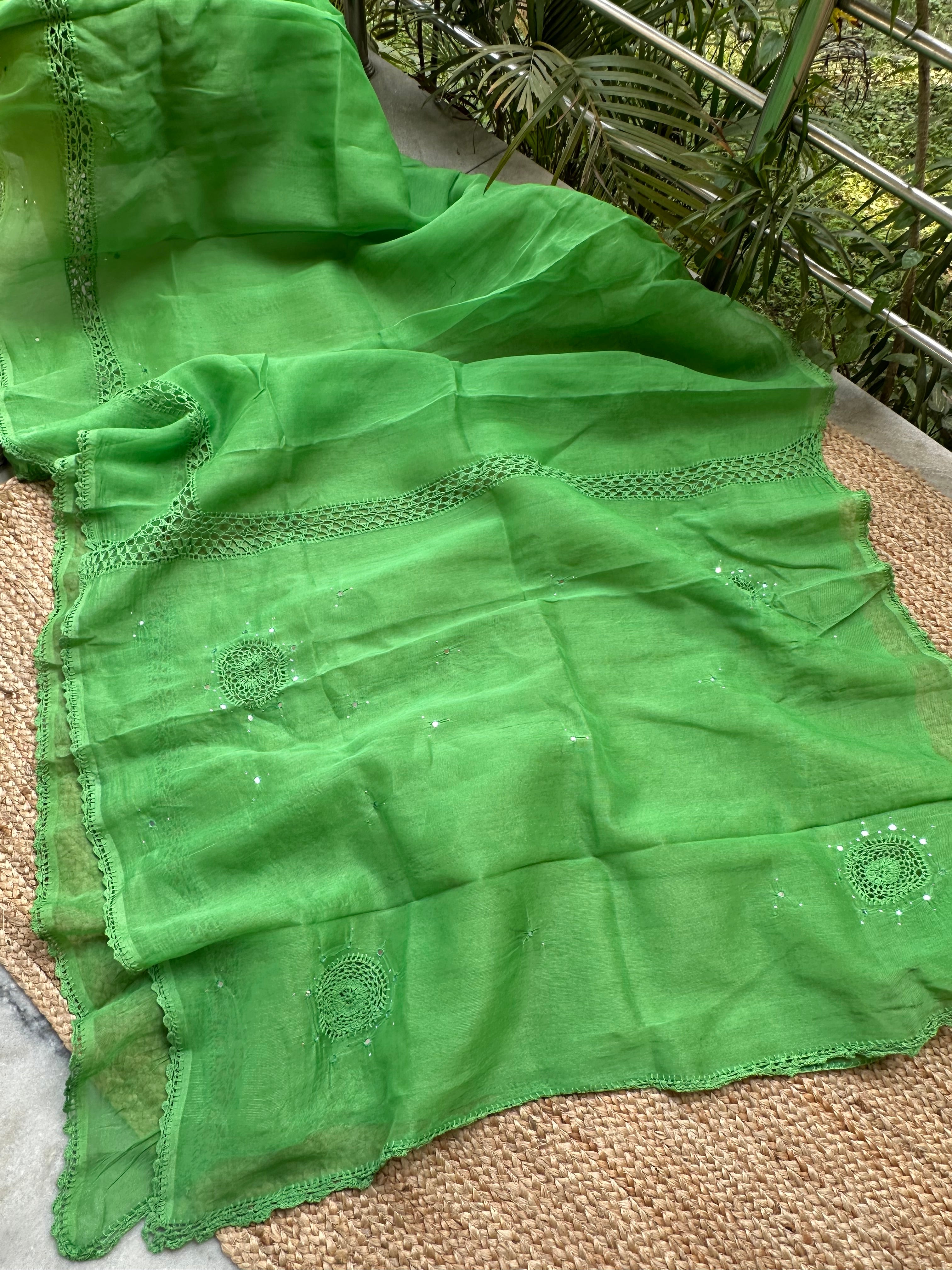 Material: Supernet fabric. Has little shine. Stiffness is medium but comfortable to wear sarees. Have handwork of crochet on pally borders. In between there is hand stitched mirror work making saree perfect for any occasion. Length 5.5 mtrs.