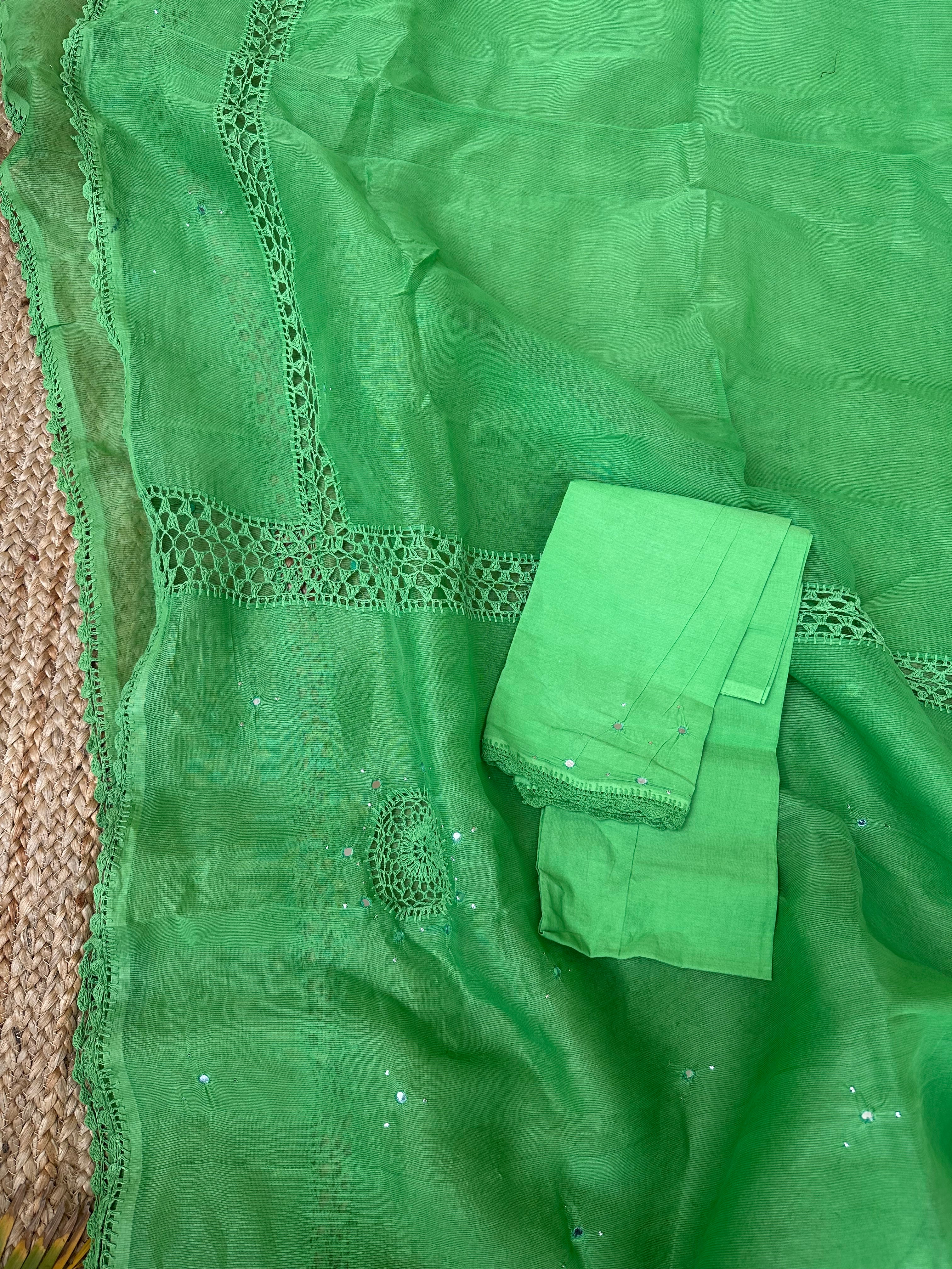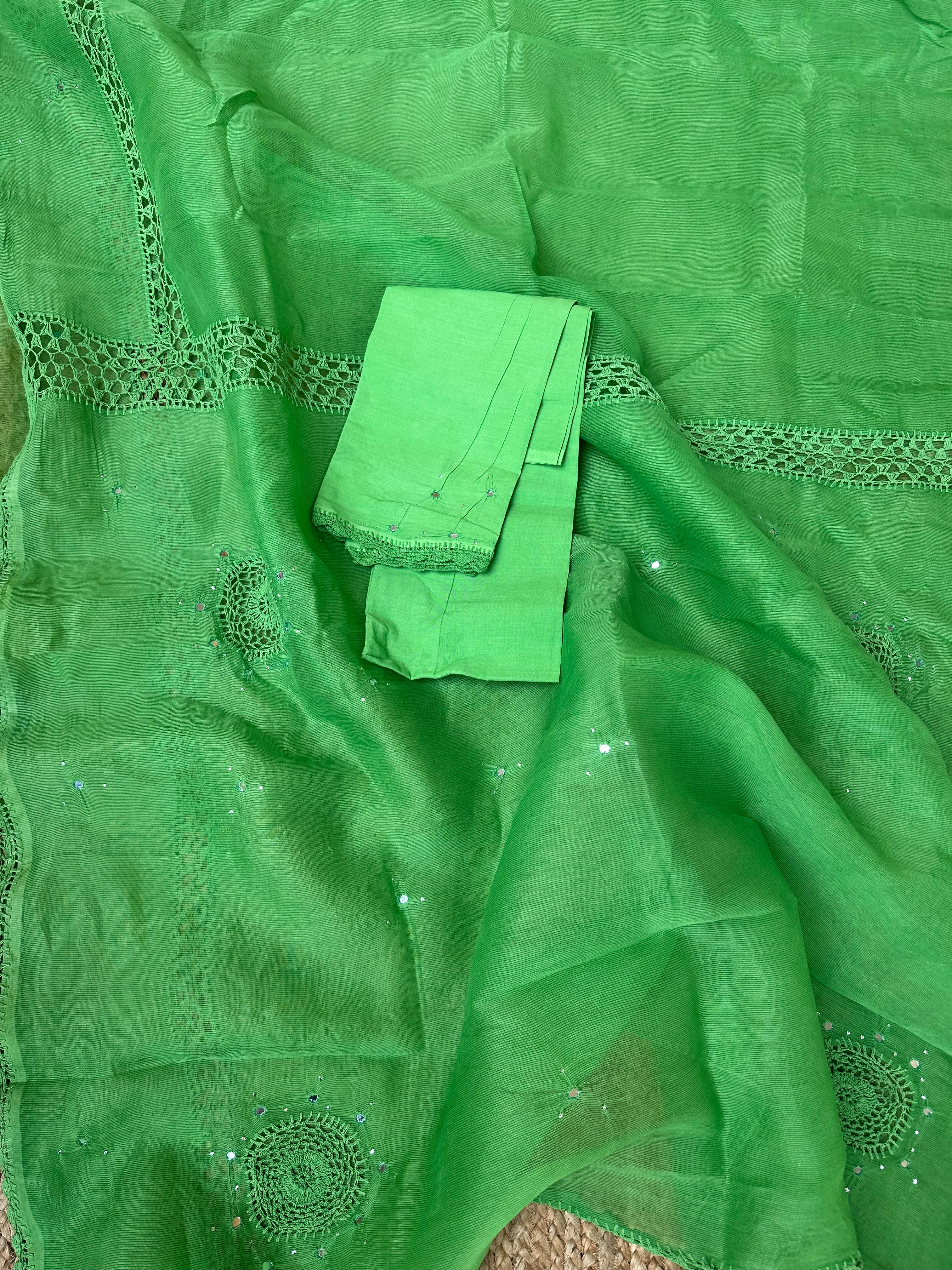 Blouse: Seperate cotton blouse 80 cms in same colour having crochet lace on border for sleeves.