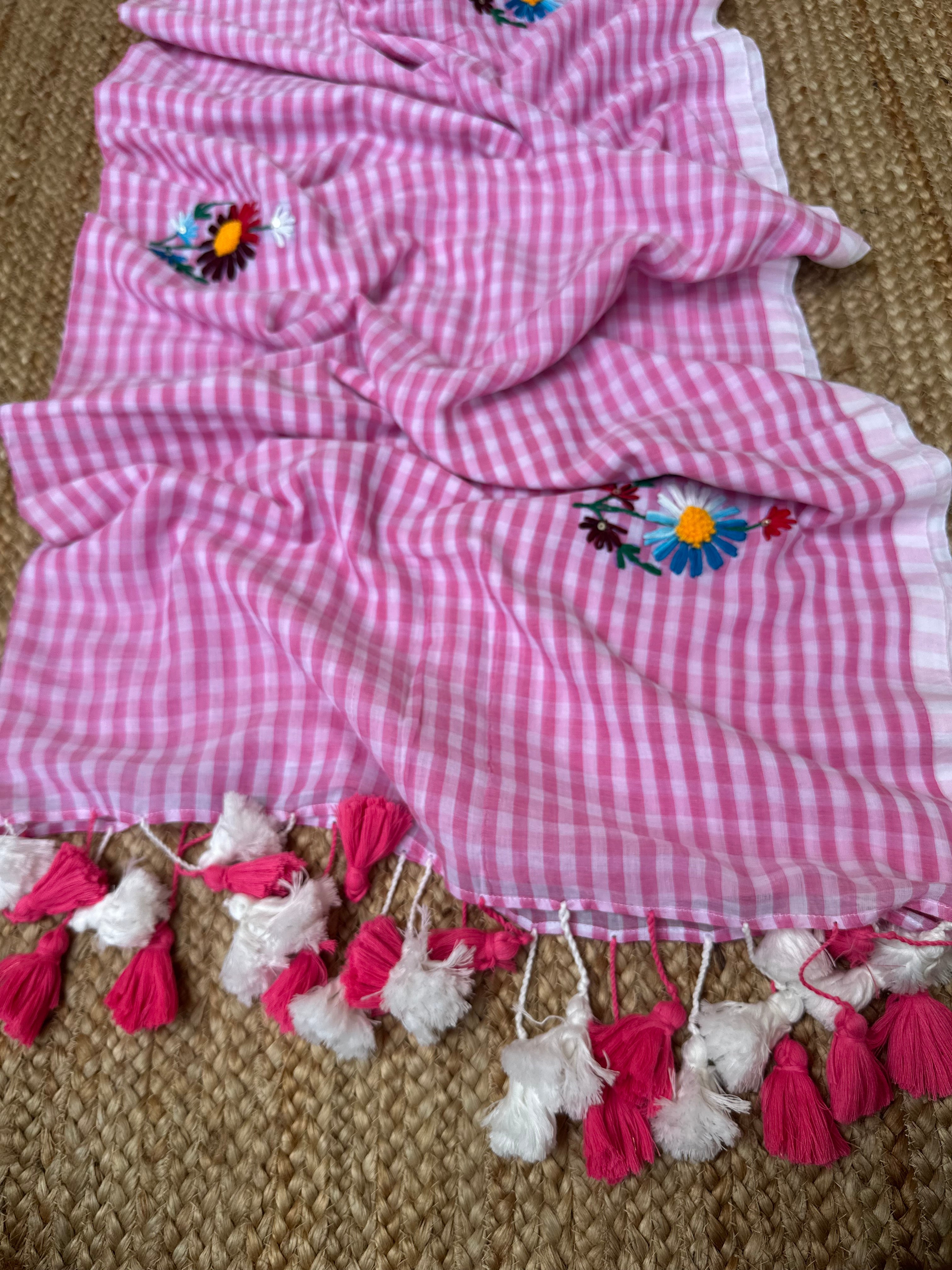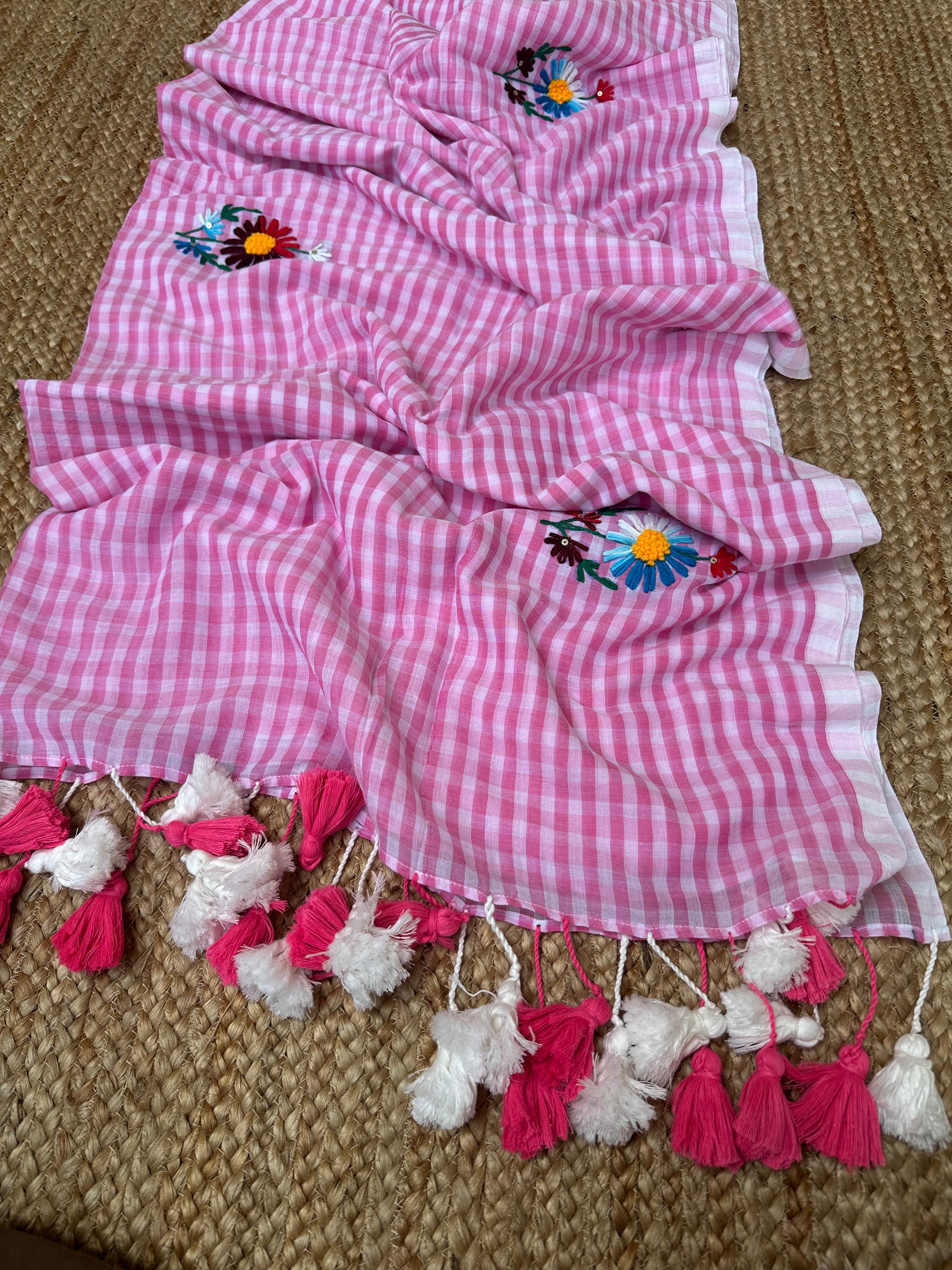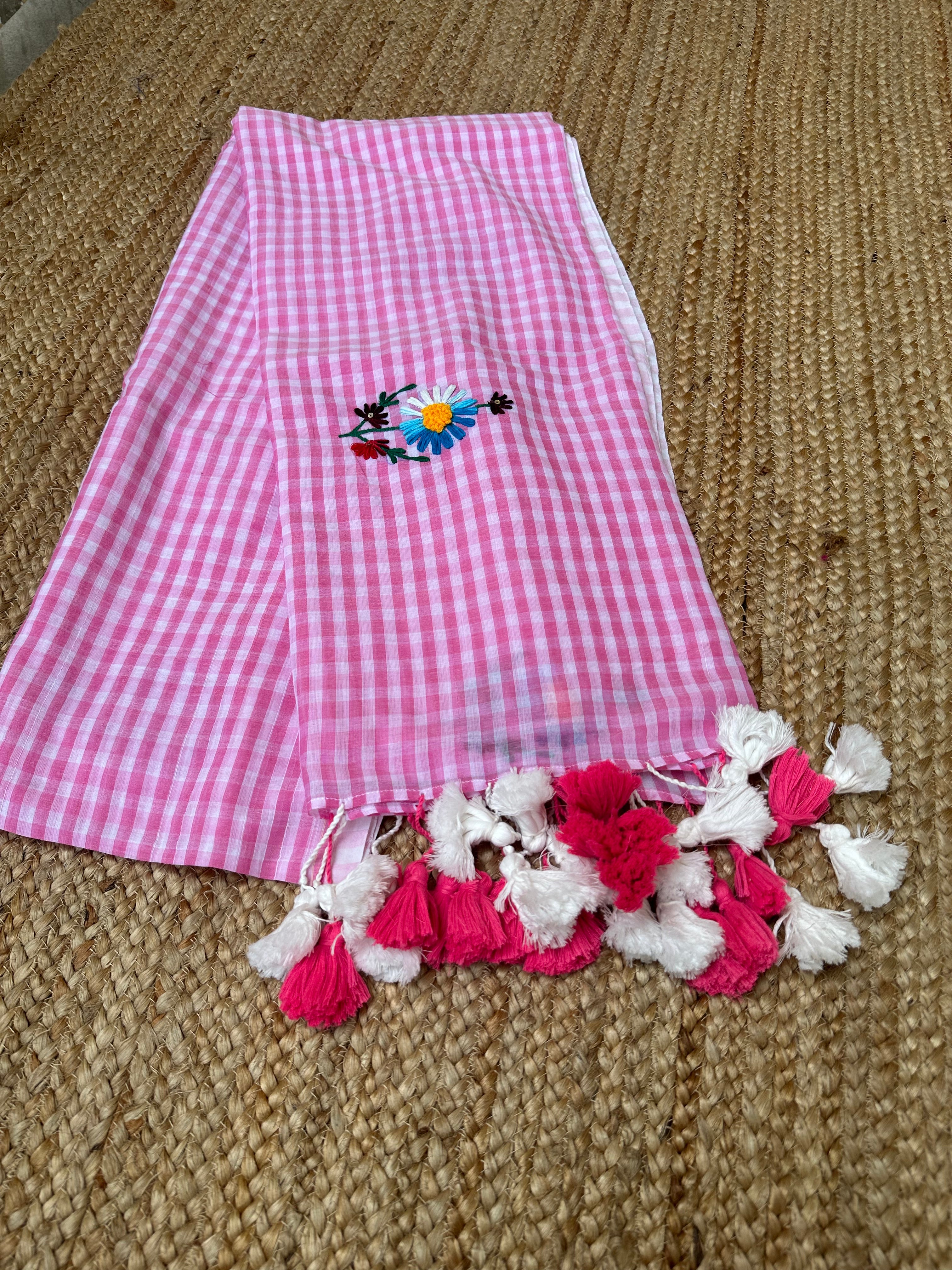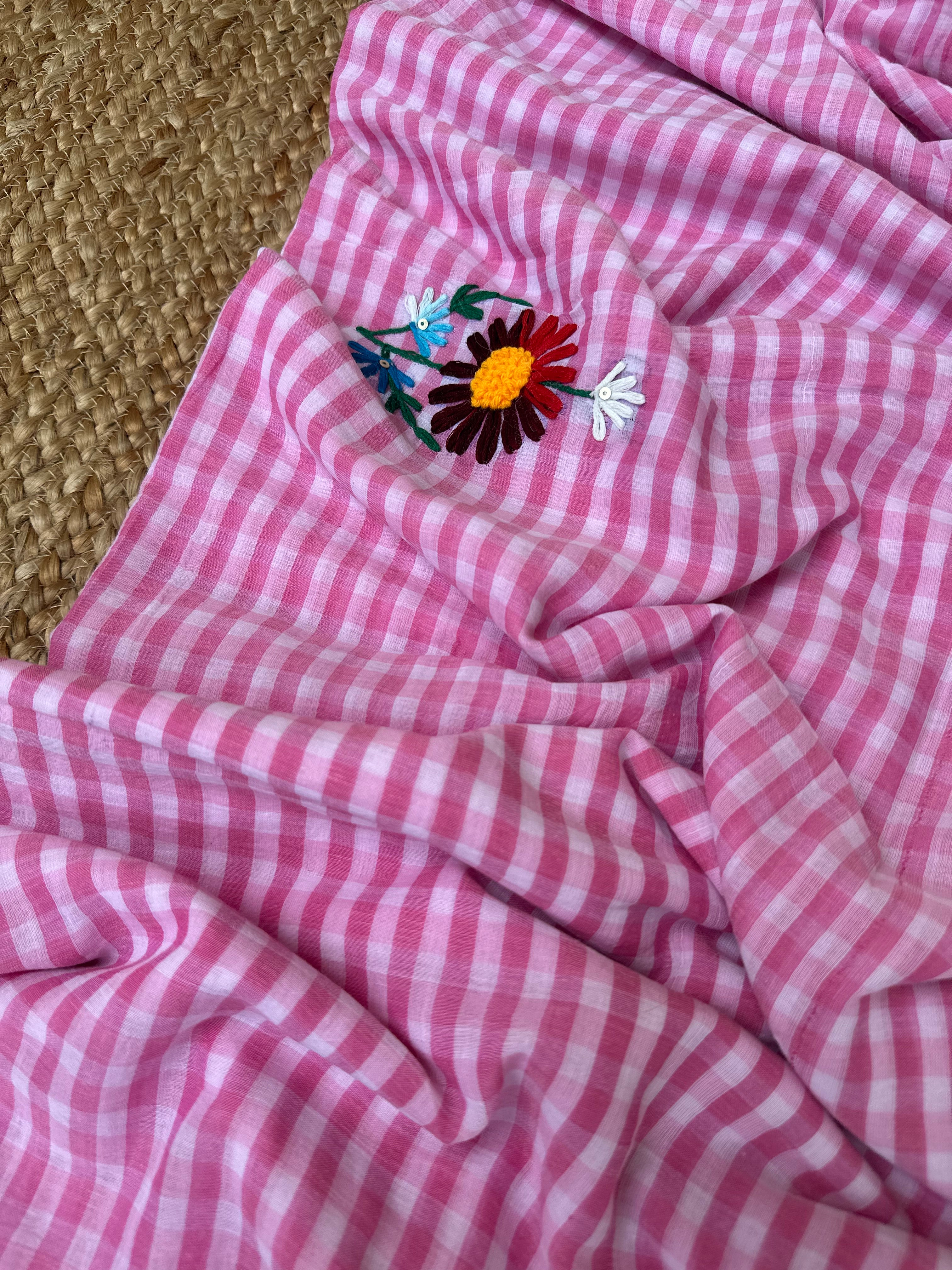 Light Pink checks Mul Cotton Handloom Embroidered Saree