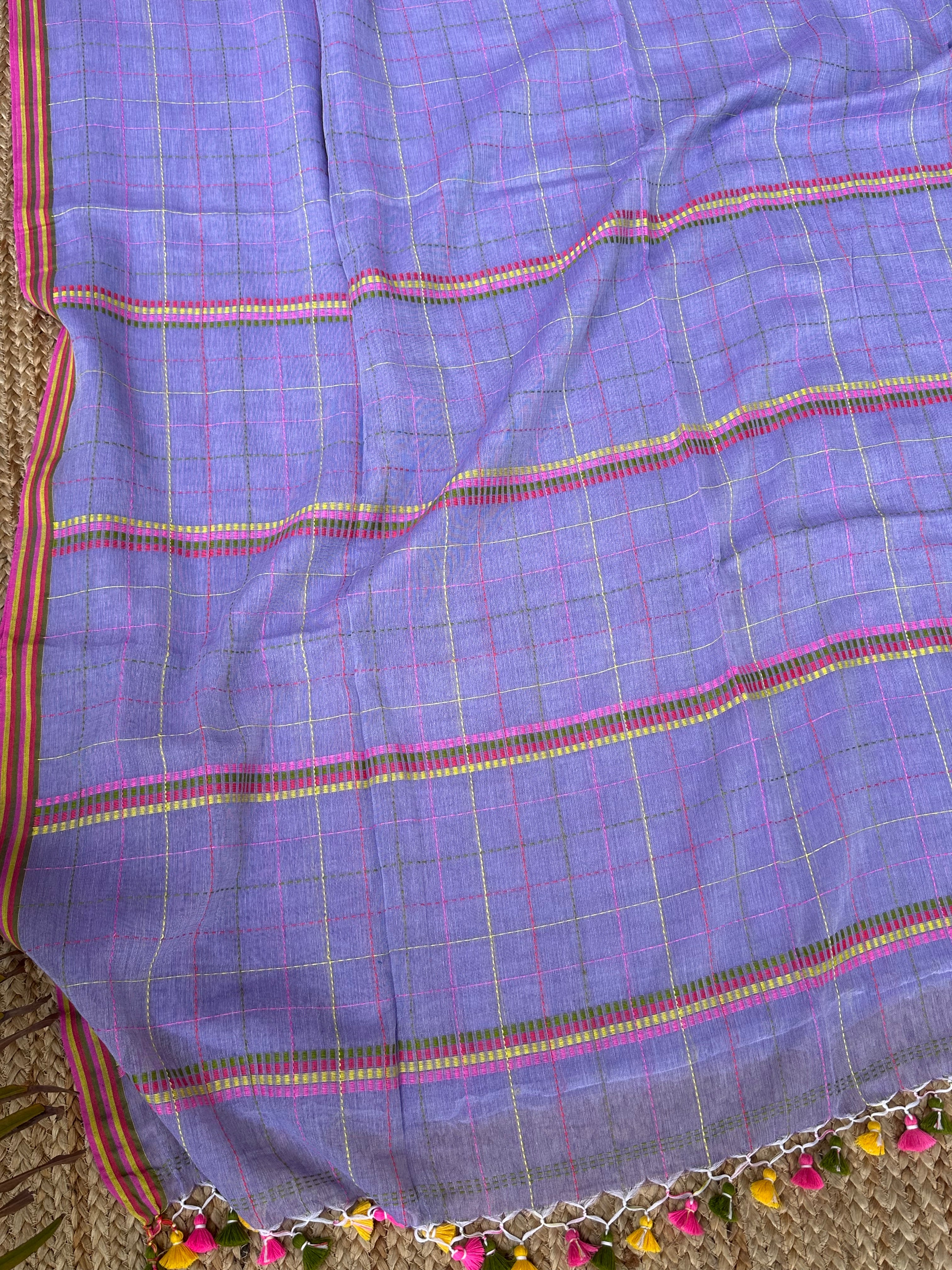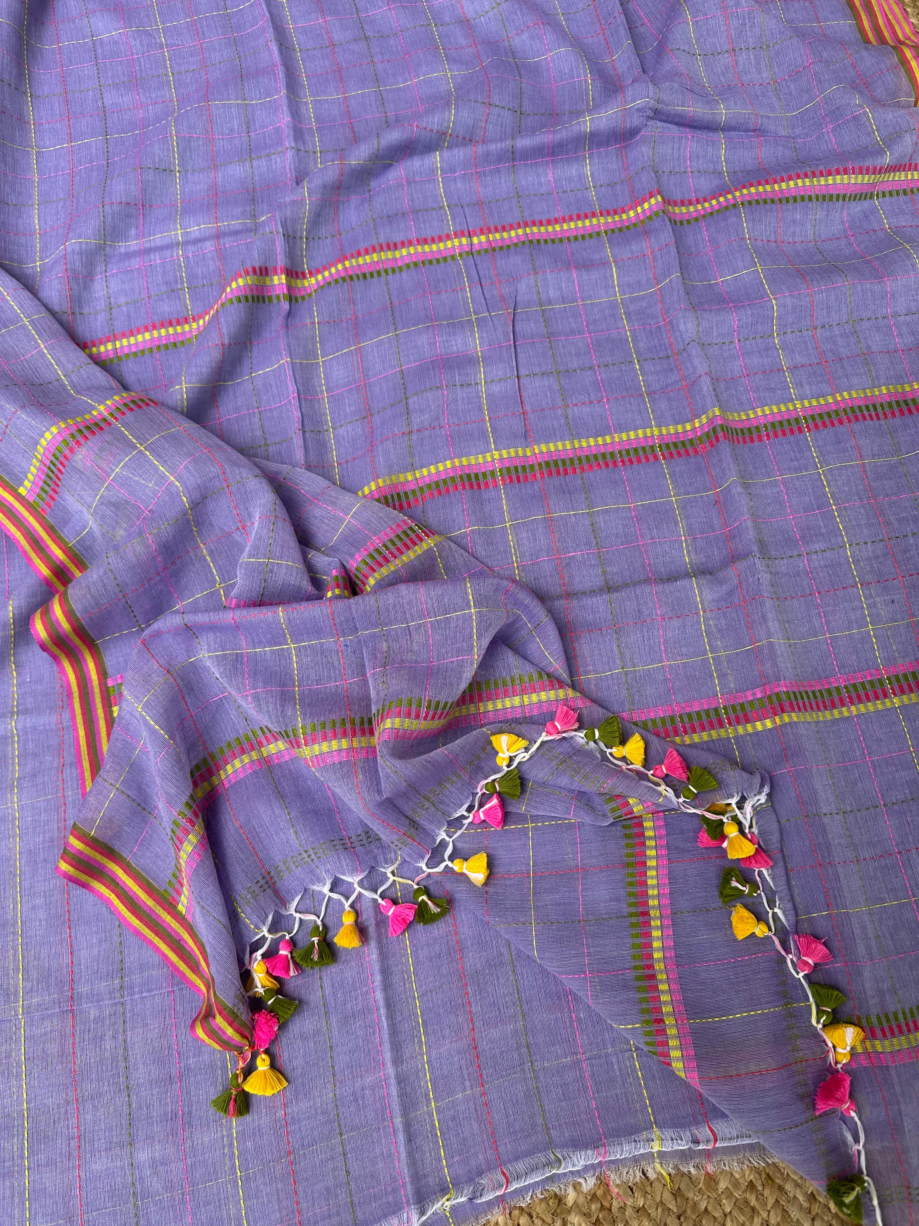 Light Purple Kantha Weaving Checks Cotton Handloom Saree