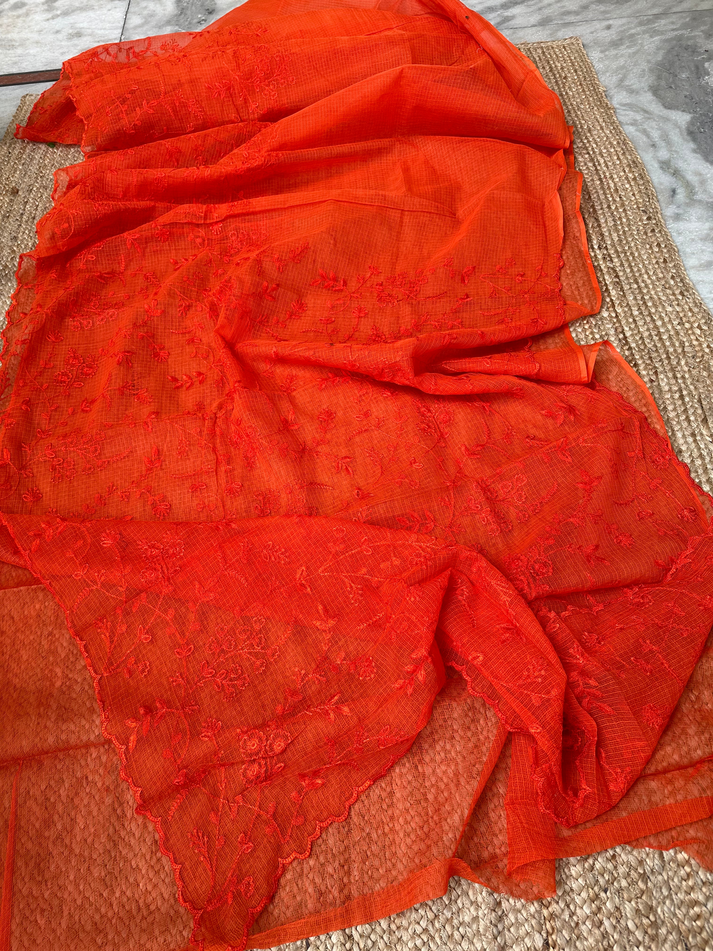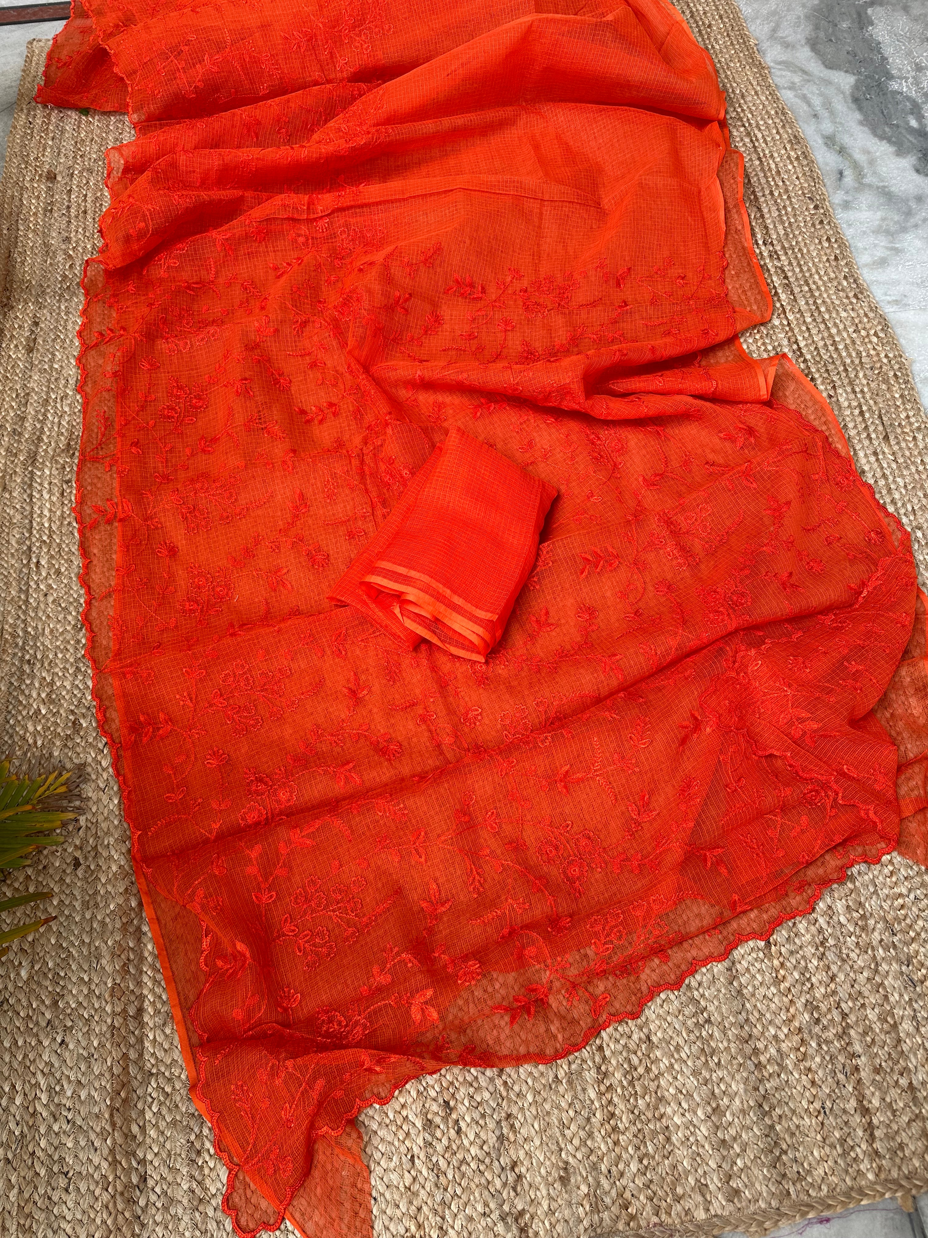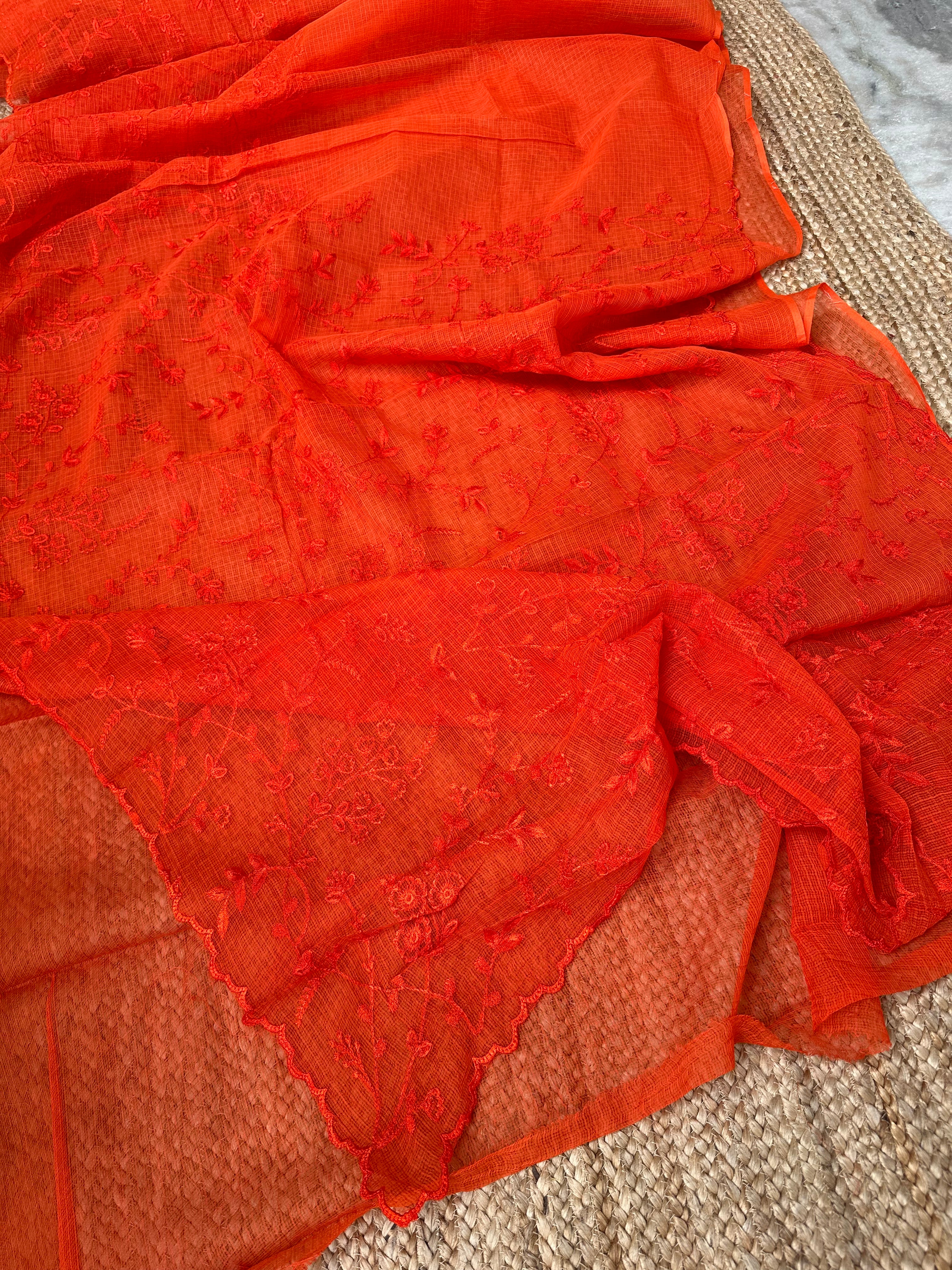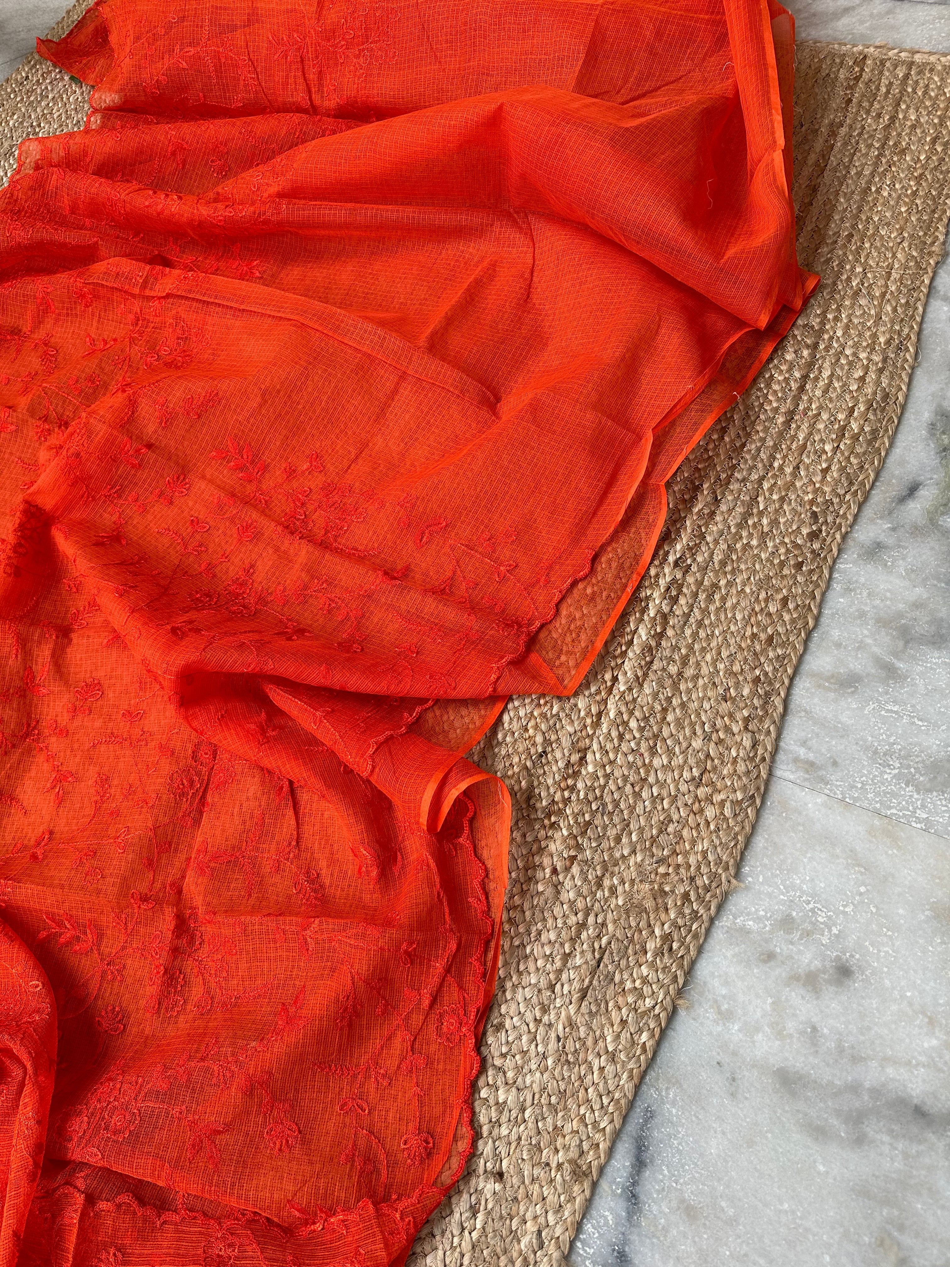 Orange Kota Embroidered Saree