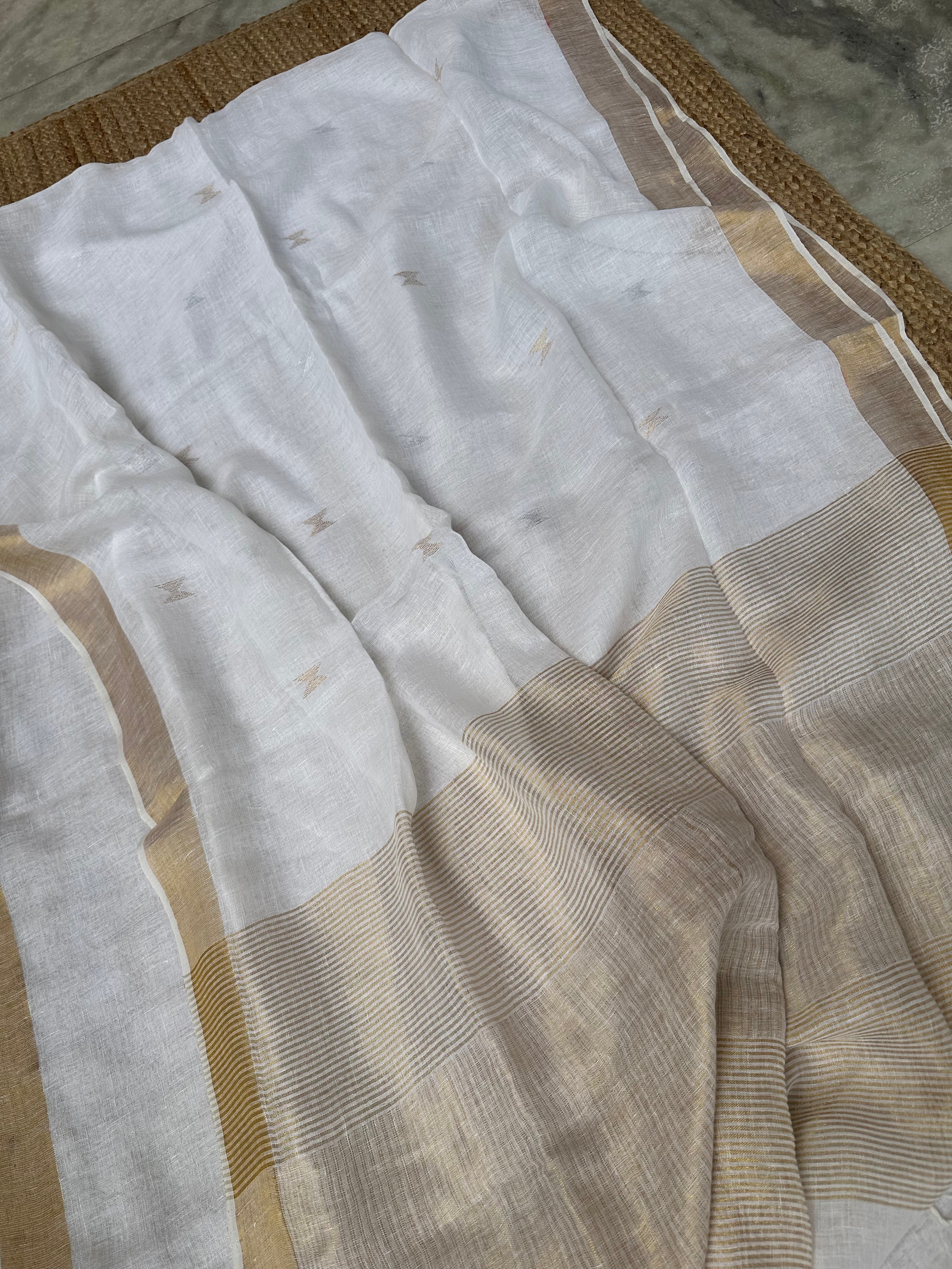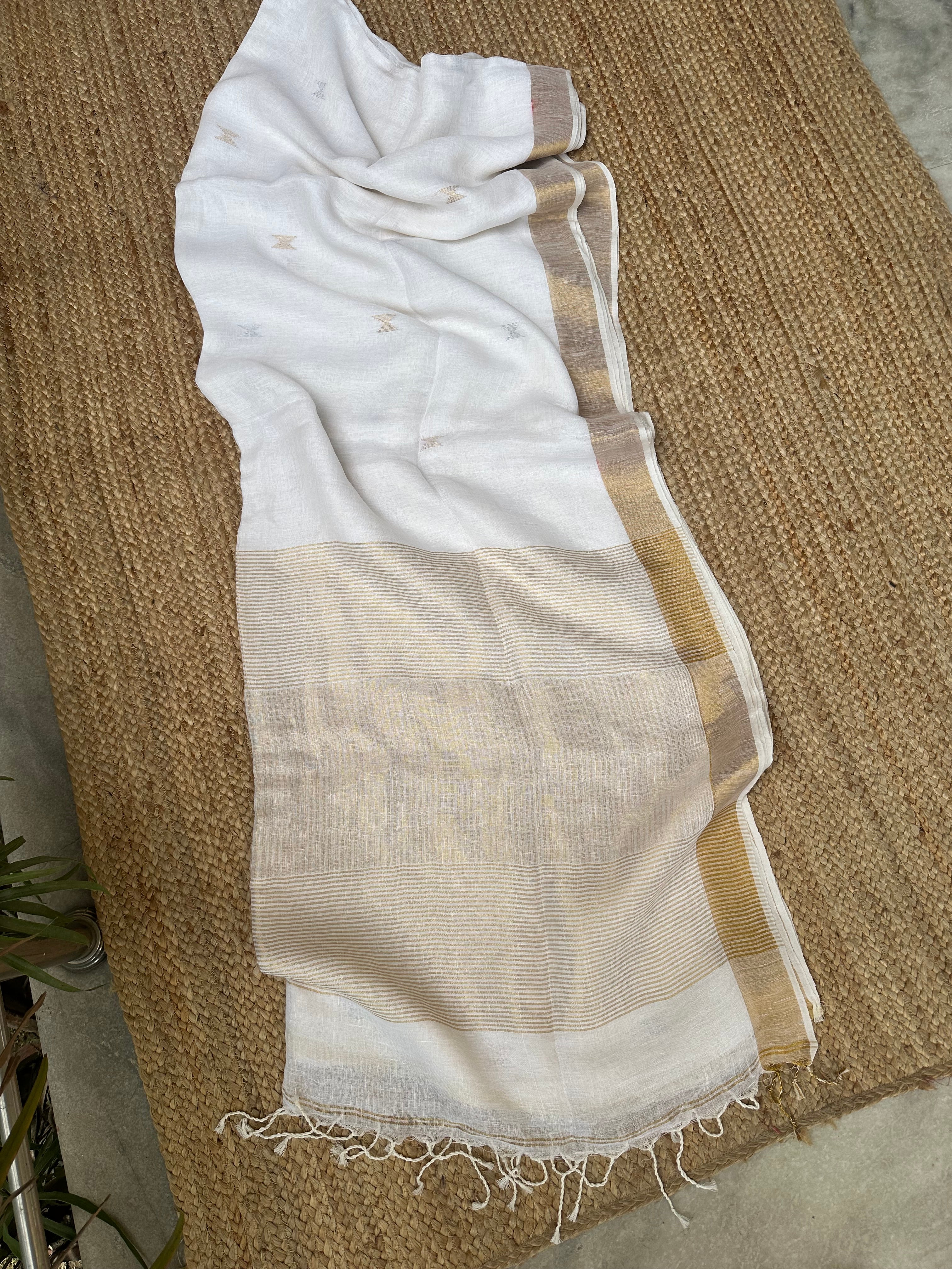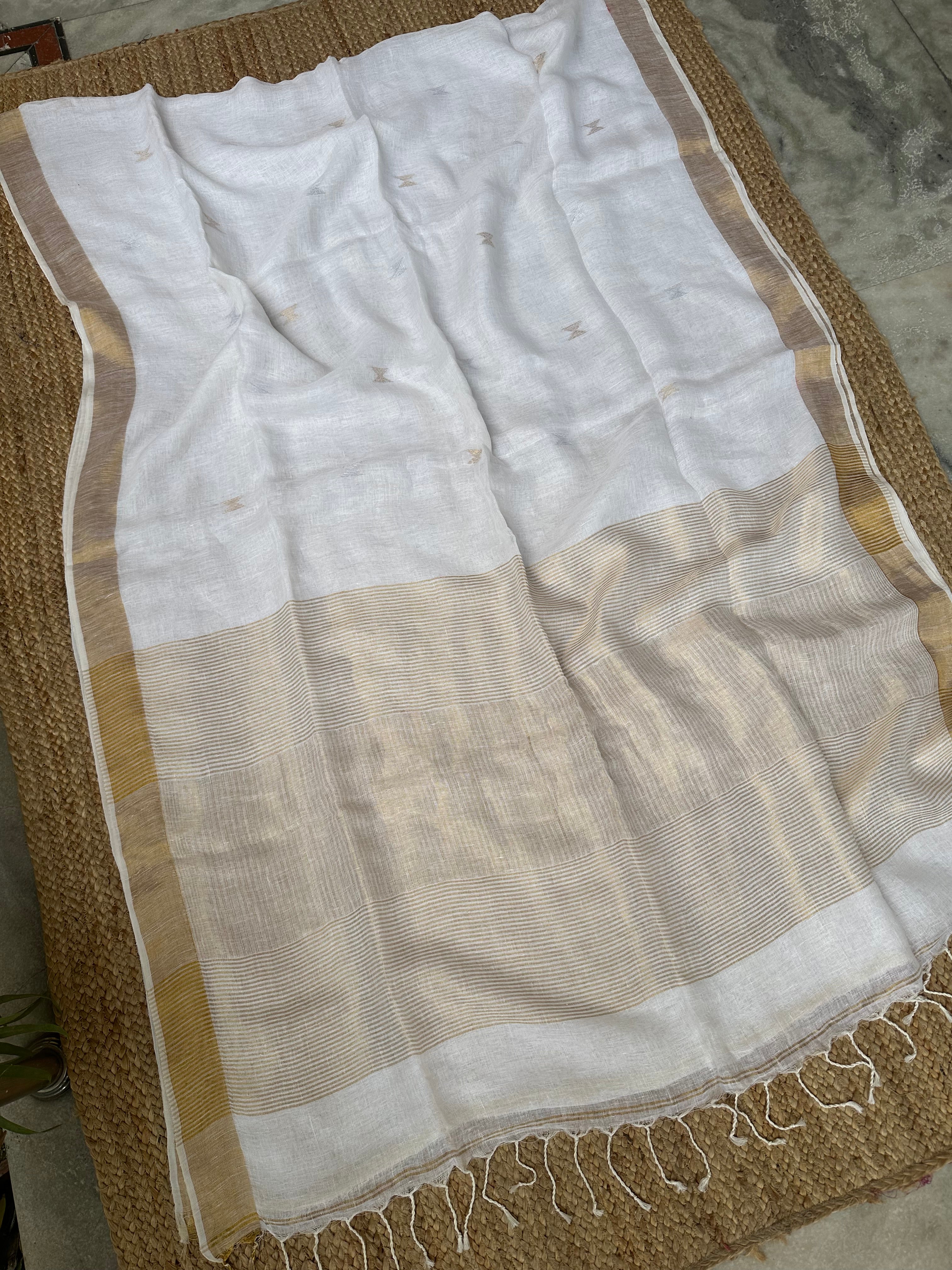 Material: Pure linen by linen handloom sarees with golden zari pallu and small silver golden bootas.