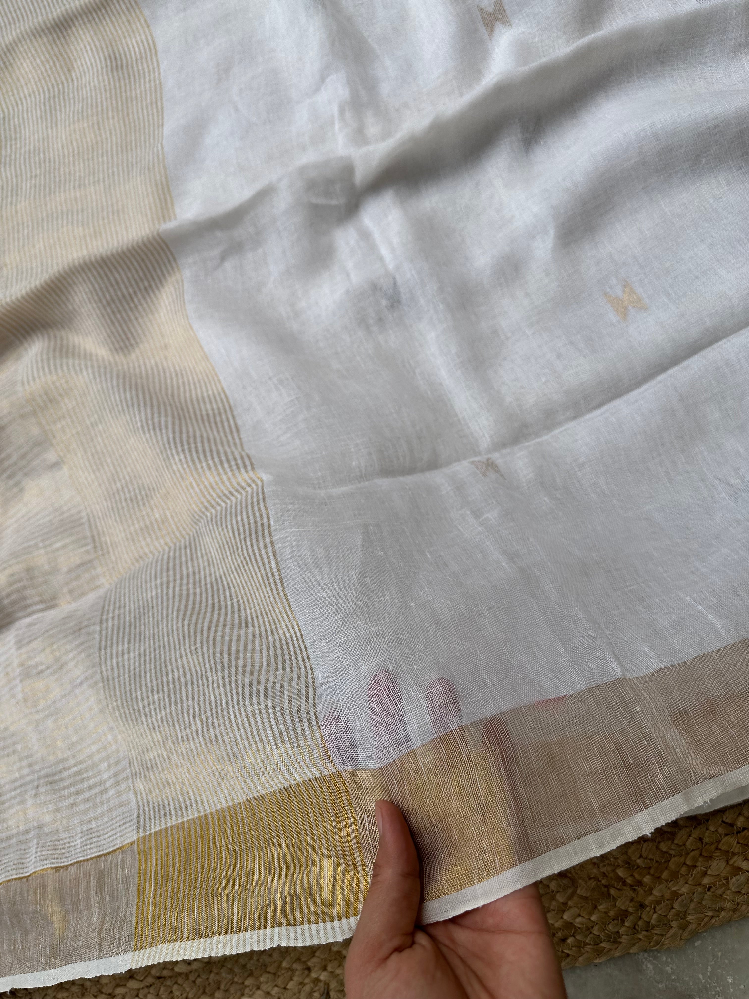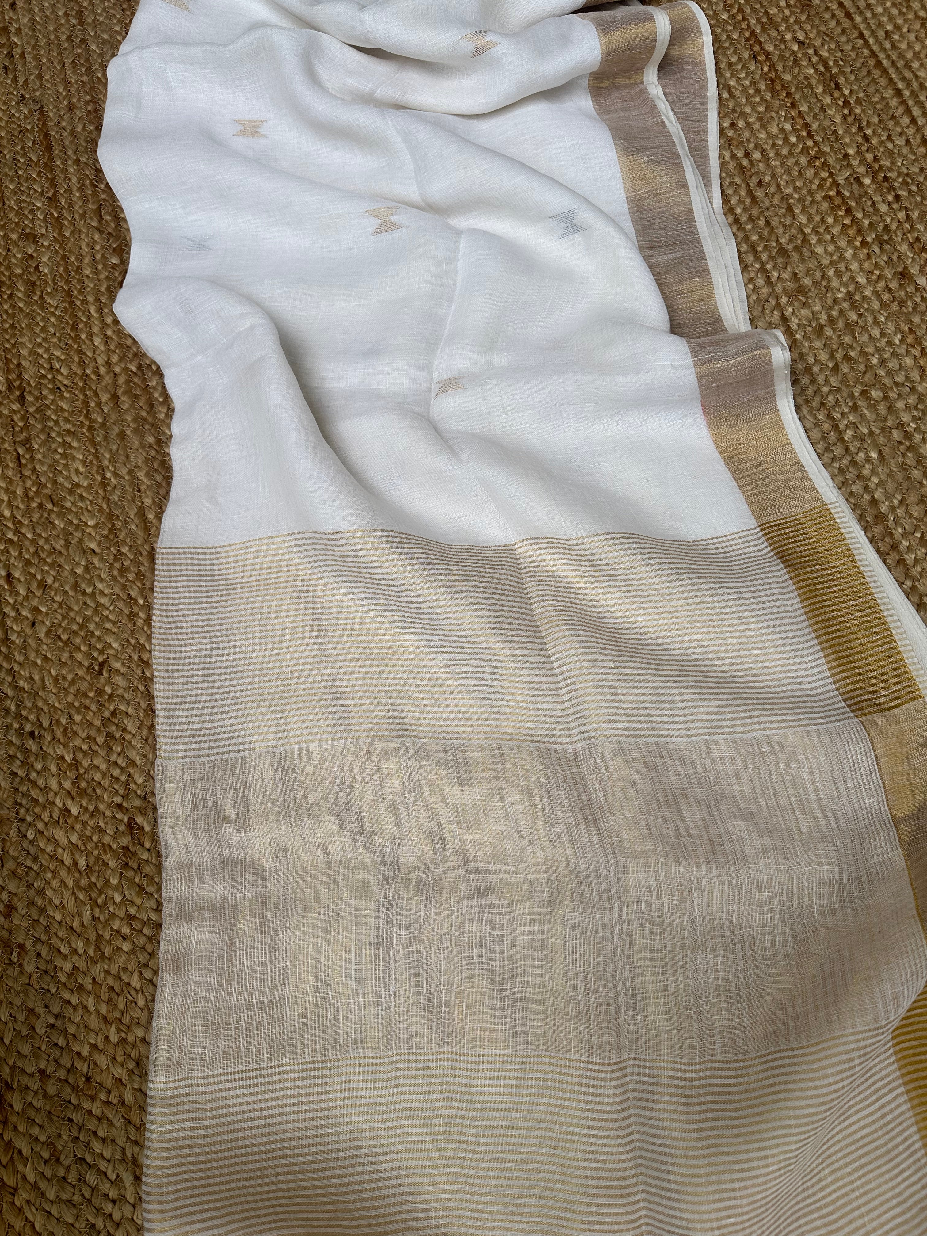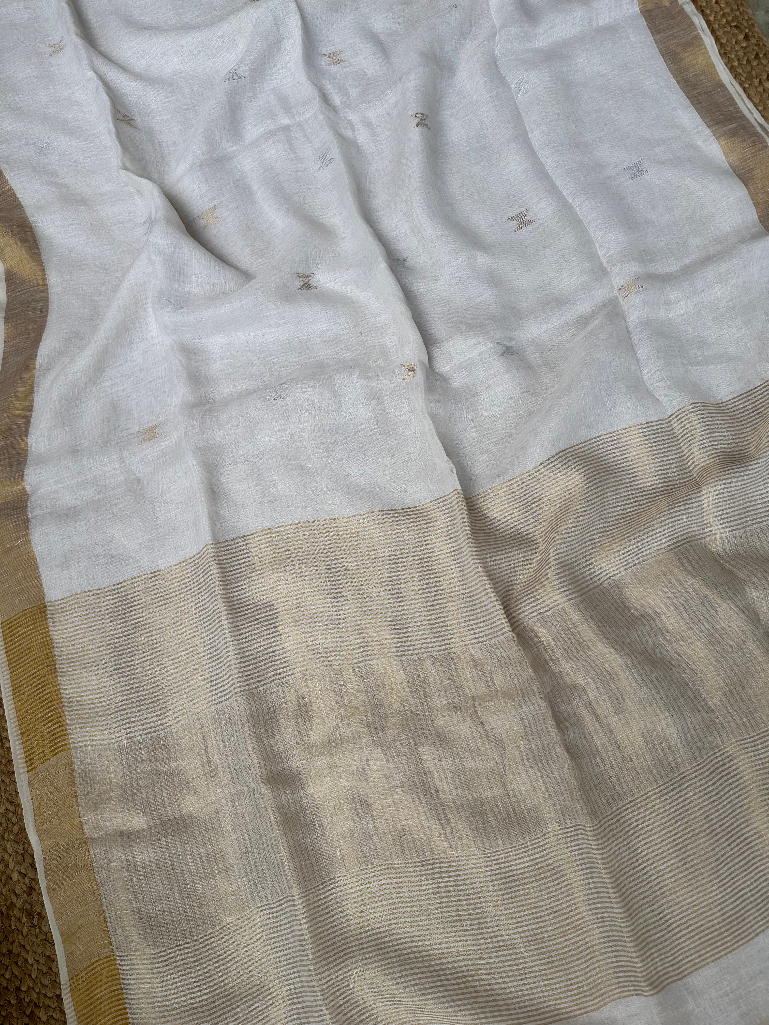 Material: Pure linen by linen handloom sarees with golden zari pallu and small silver golden bootas.