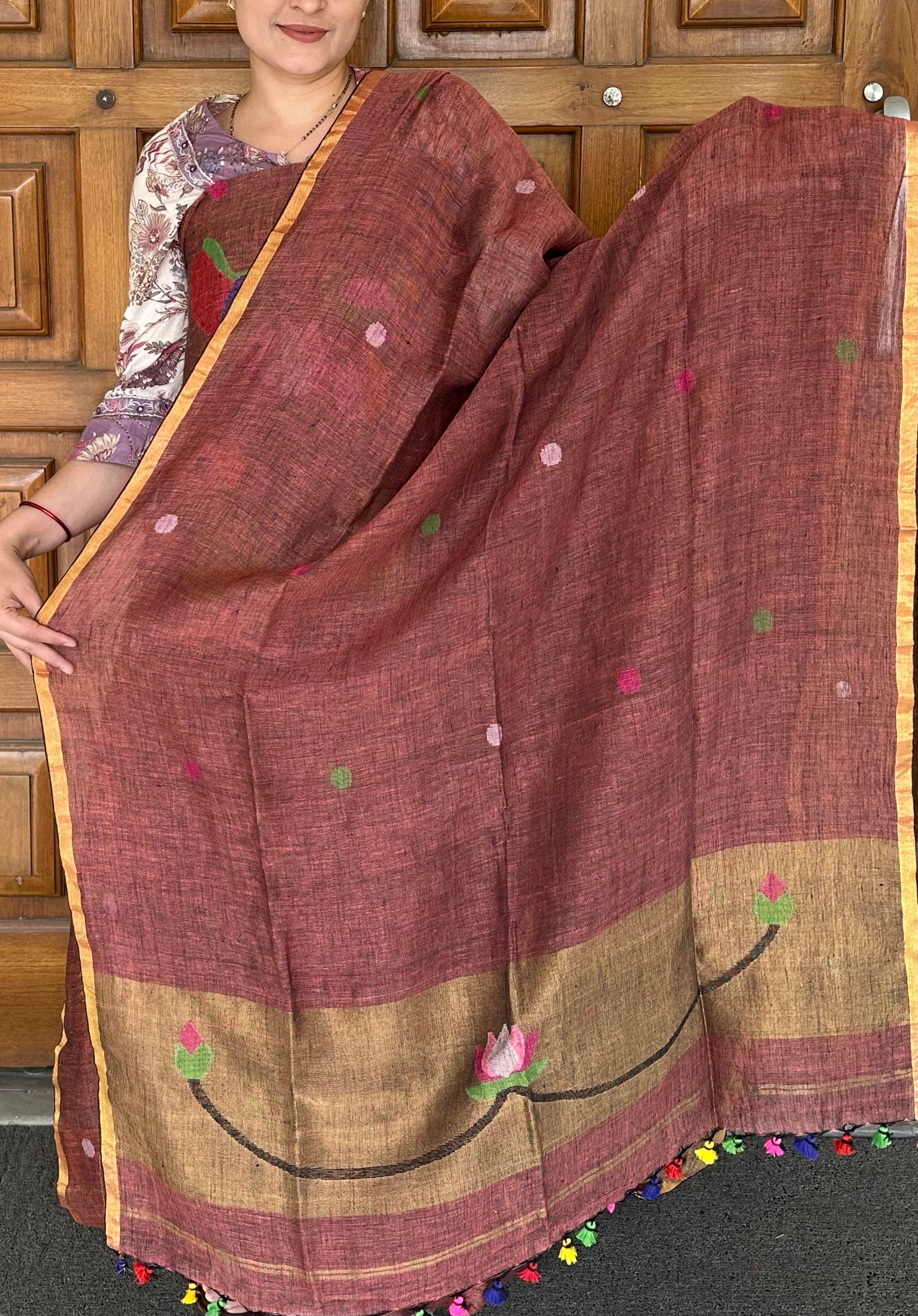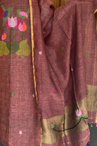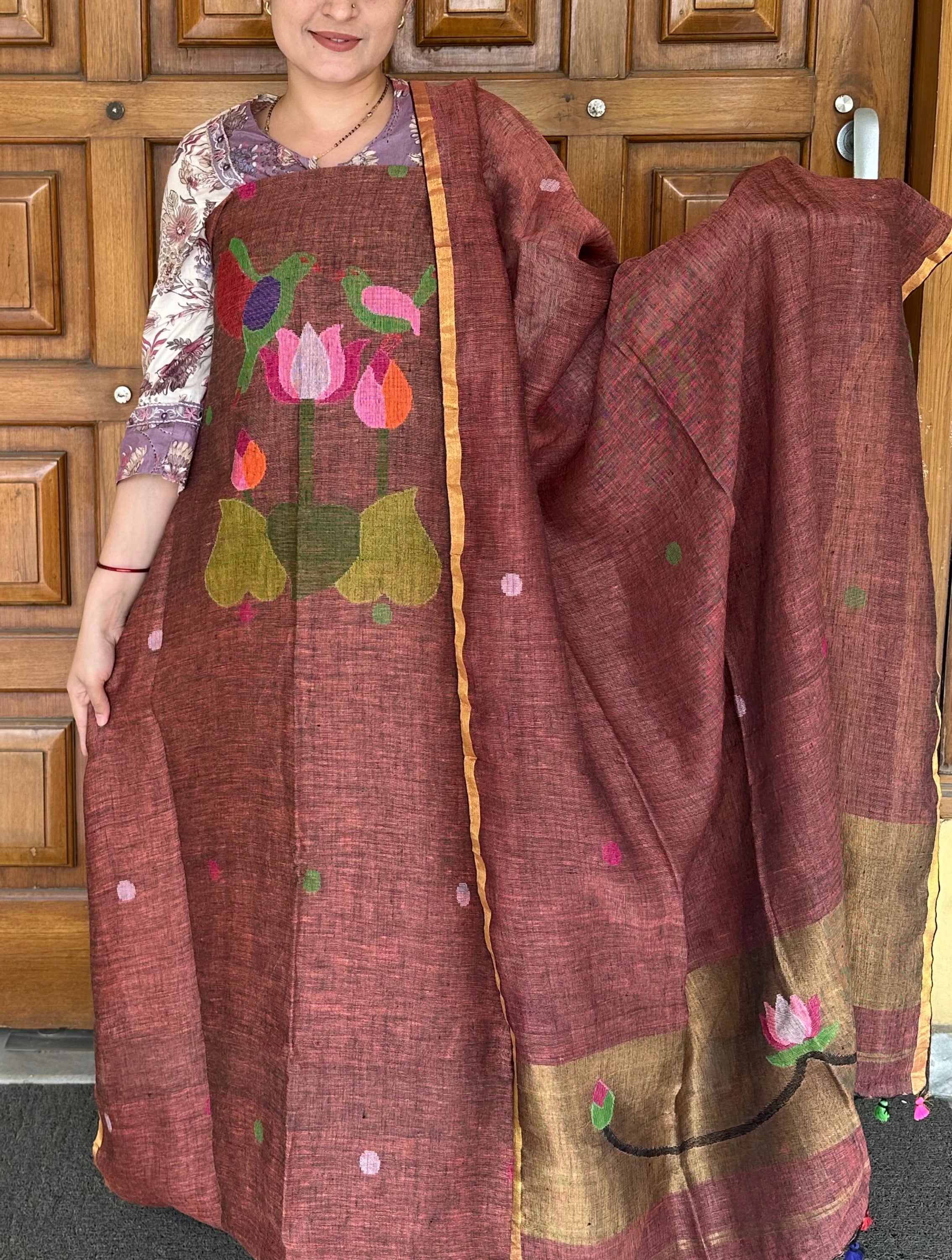 Rust Black Dual Tone Linen Handloom Jamdani Zari Kurta Dupatta Set