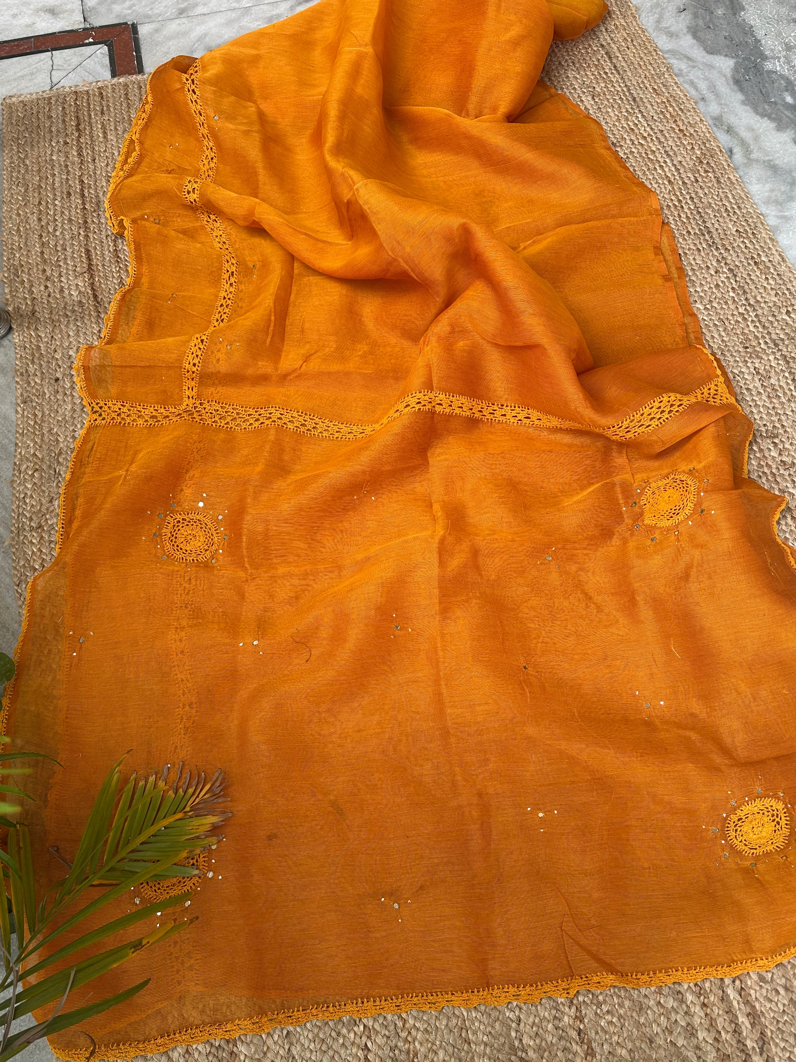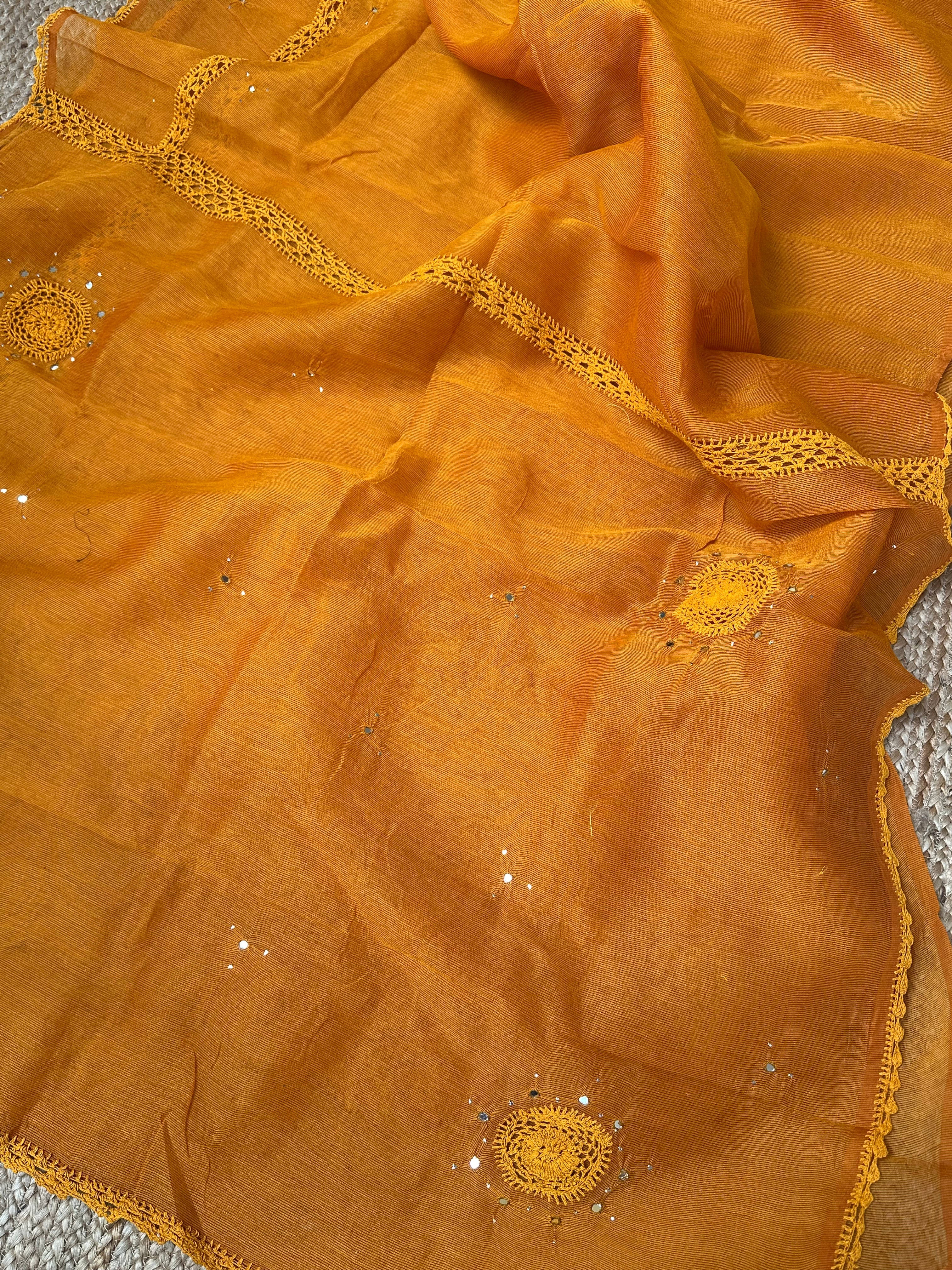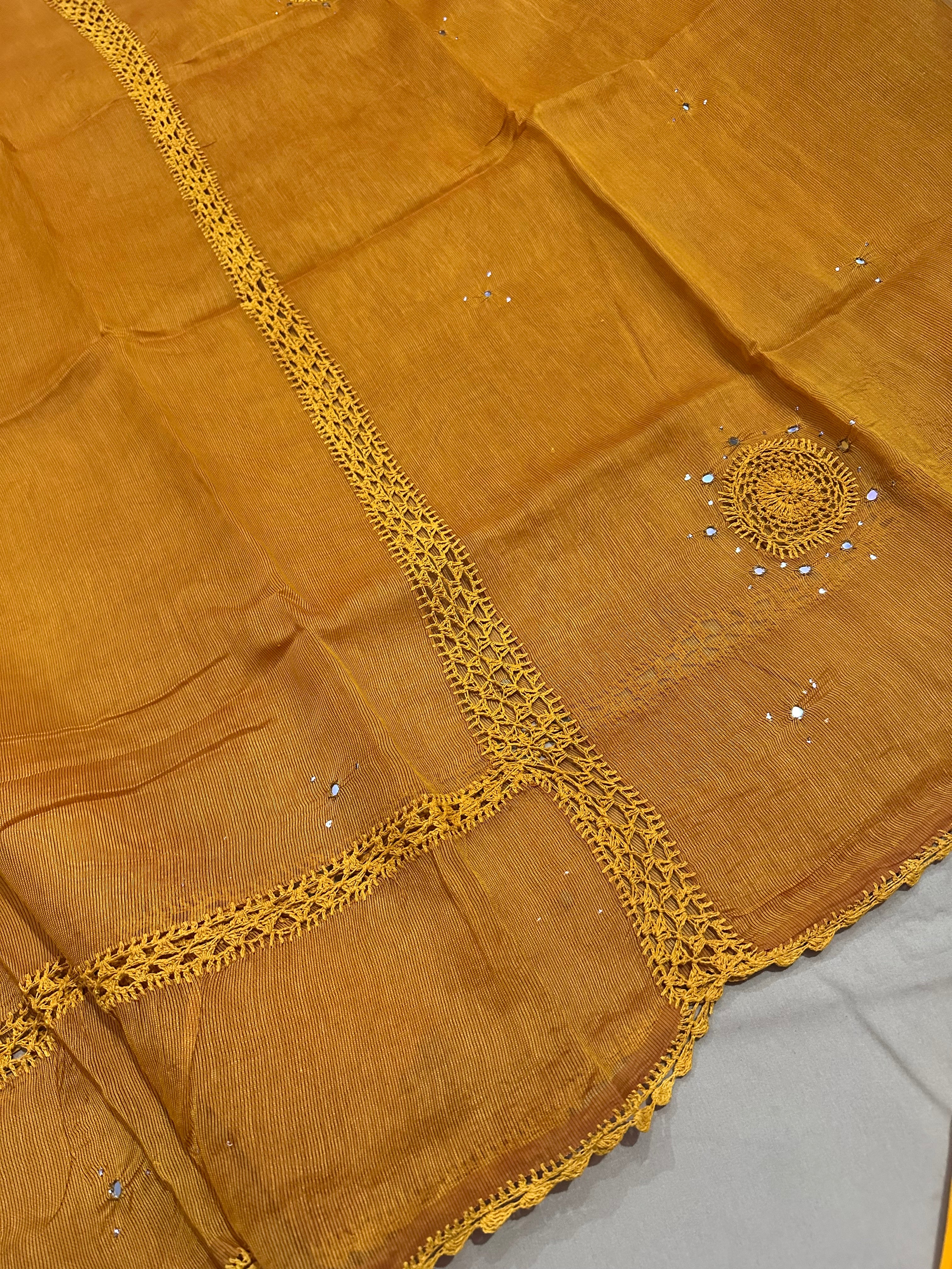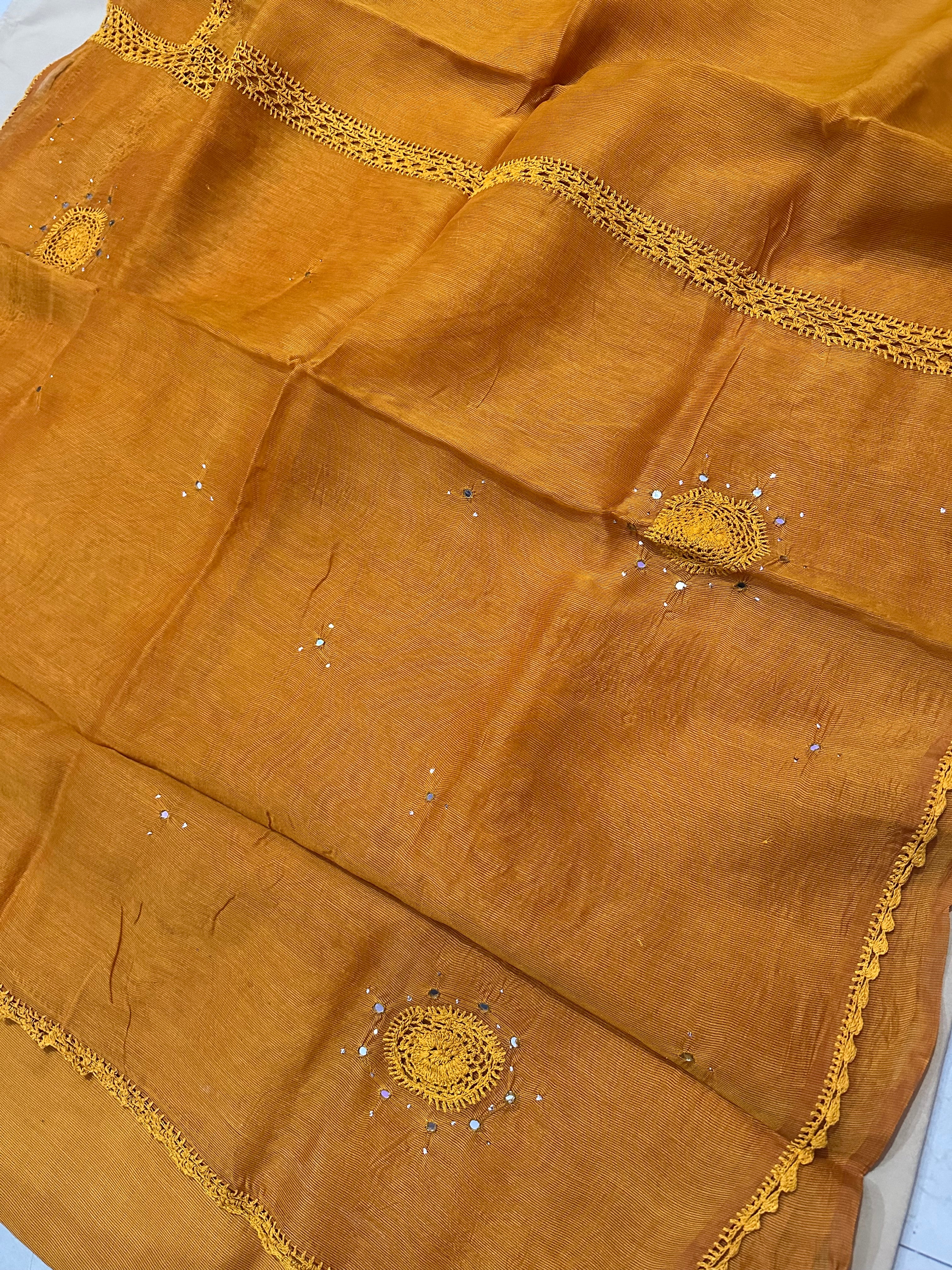 Material: Supernet fabric. Has little shine. Stiffness is medium but comfortable to wear sarees. Have handwork of crochet on pally borders. In between there is hand stitched mirror work making saree perfect for any occasion. Length 5.5 mtrs.
