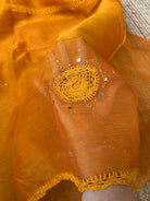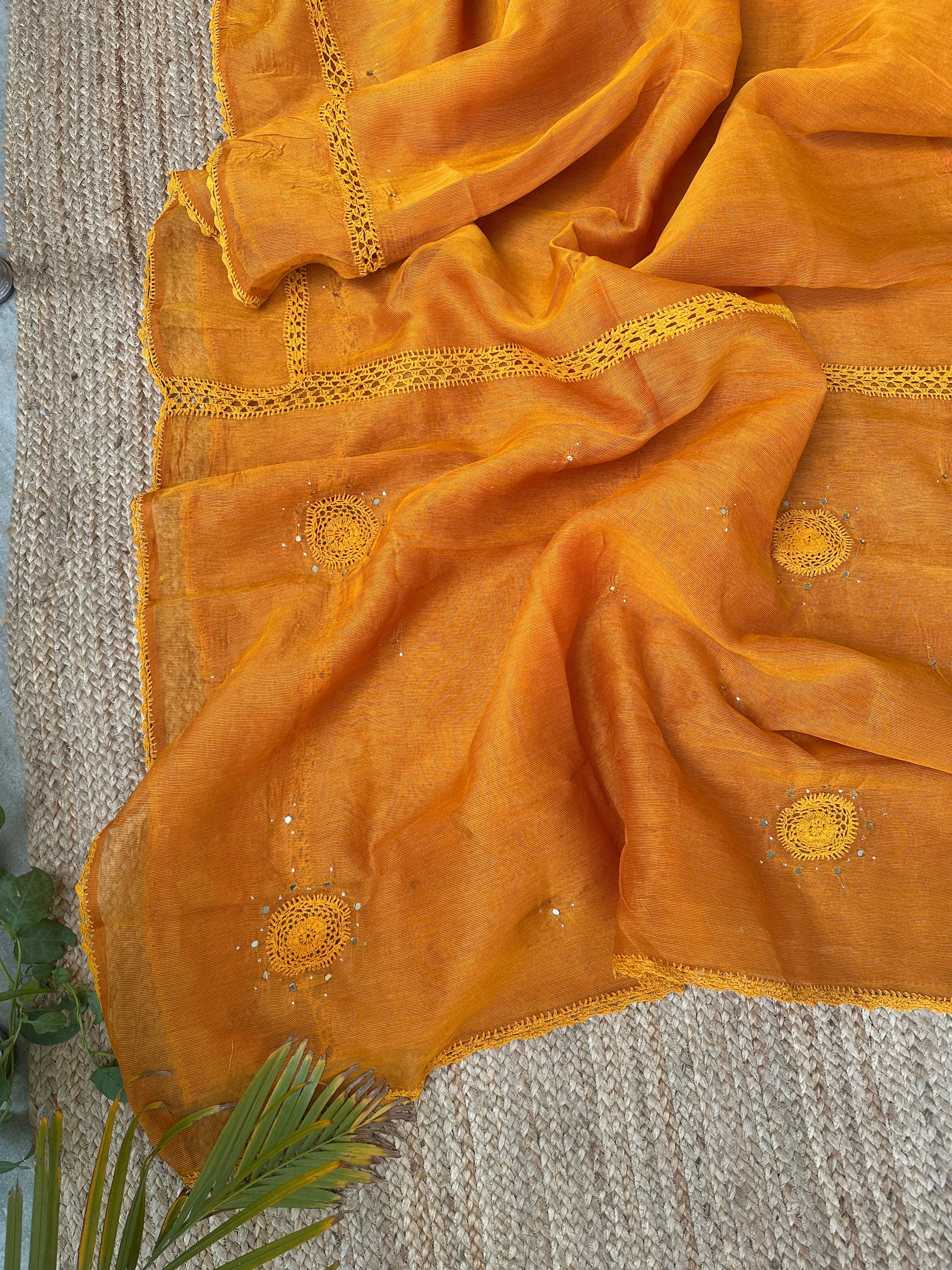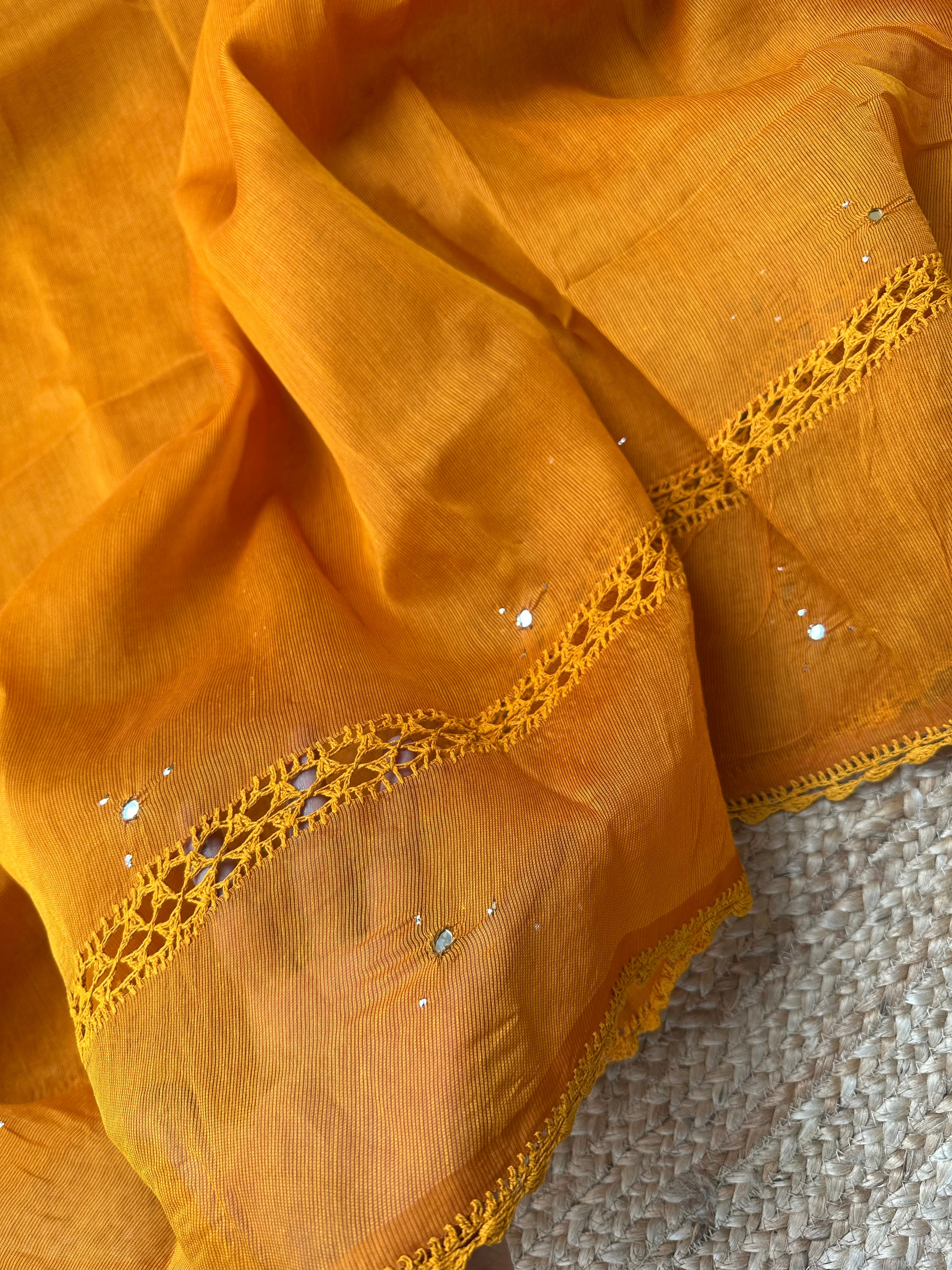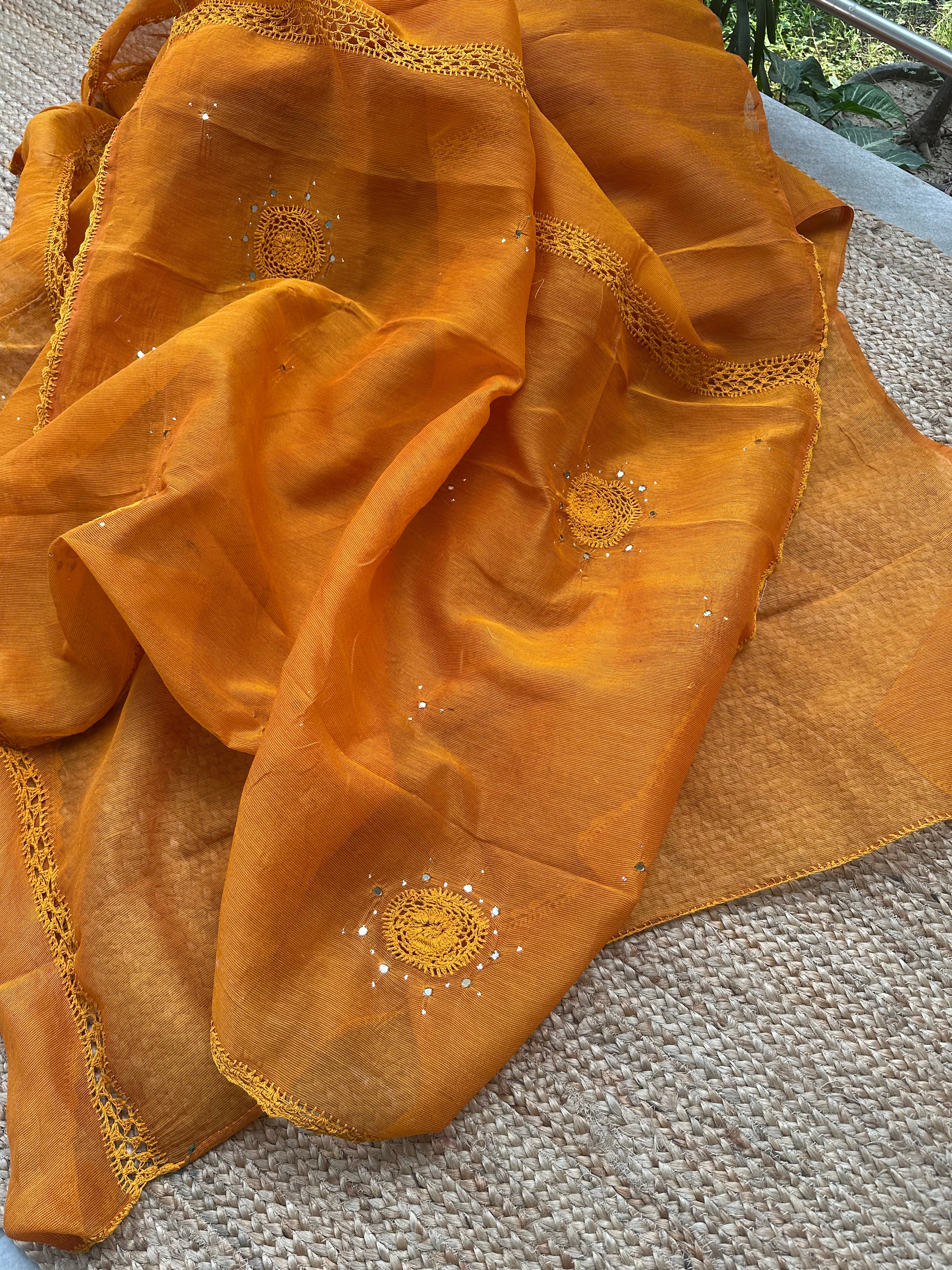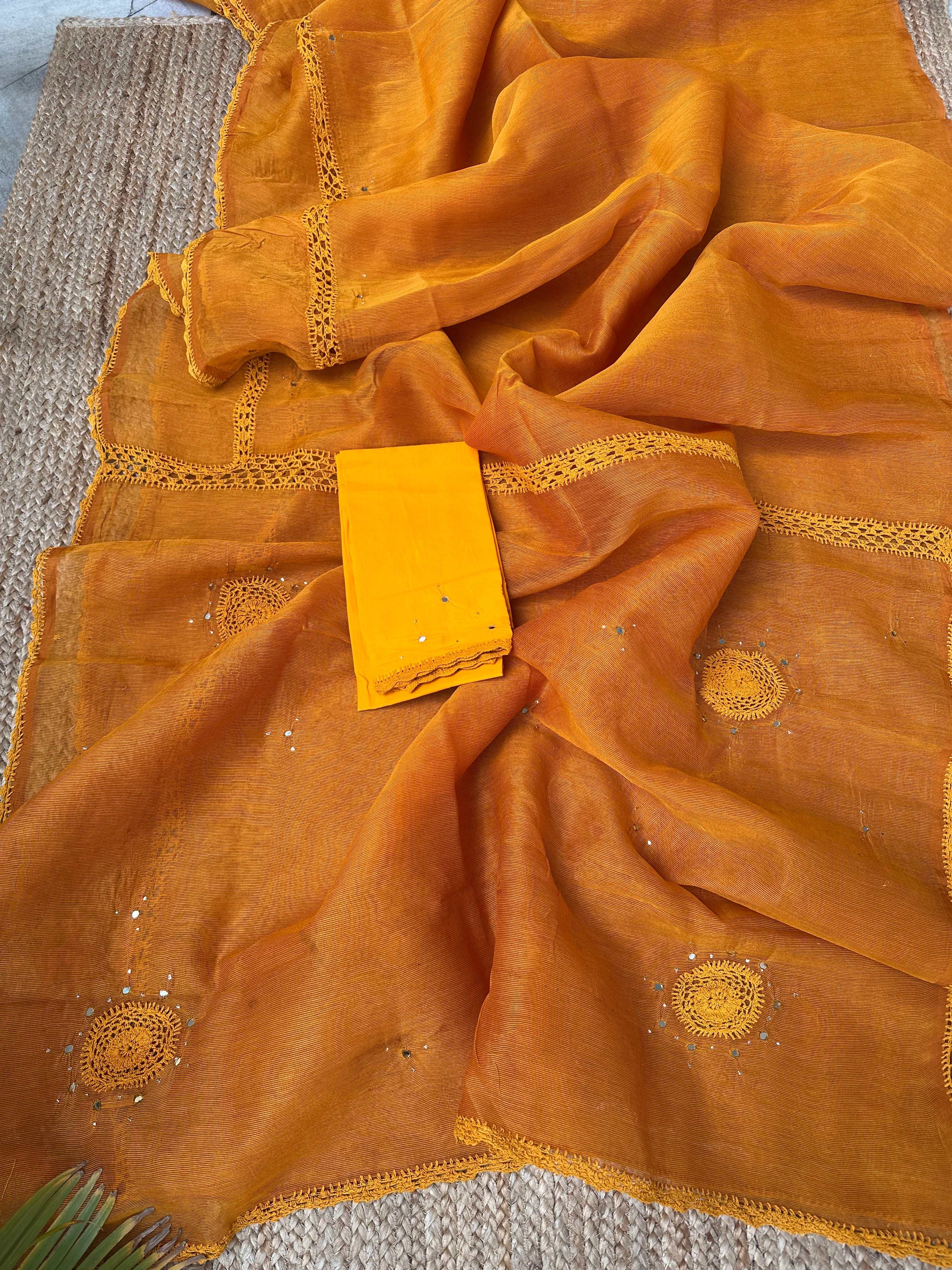 Material: Supernet fabric. Has little shine. Stiffness is medium but comfortable to wear sarees. Have handwork of crochet on pally borders. In between there is hand stitched mirror work making saree perfect for any occasion. Length 5.5 mtrs.