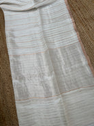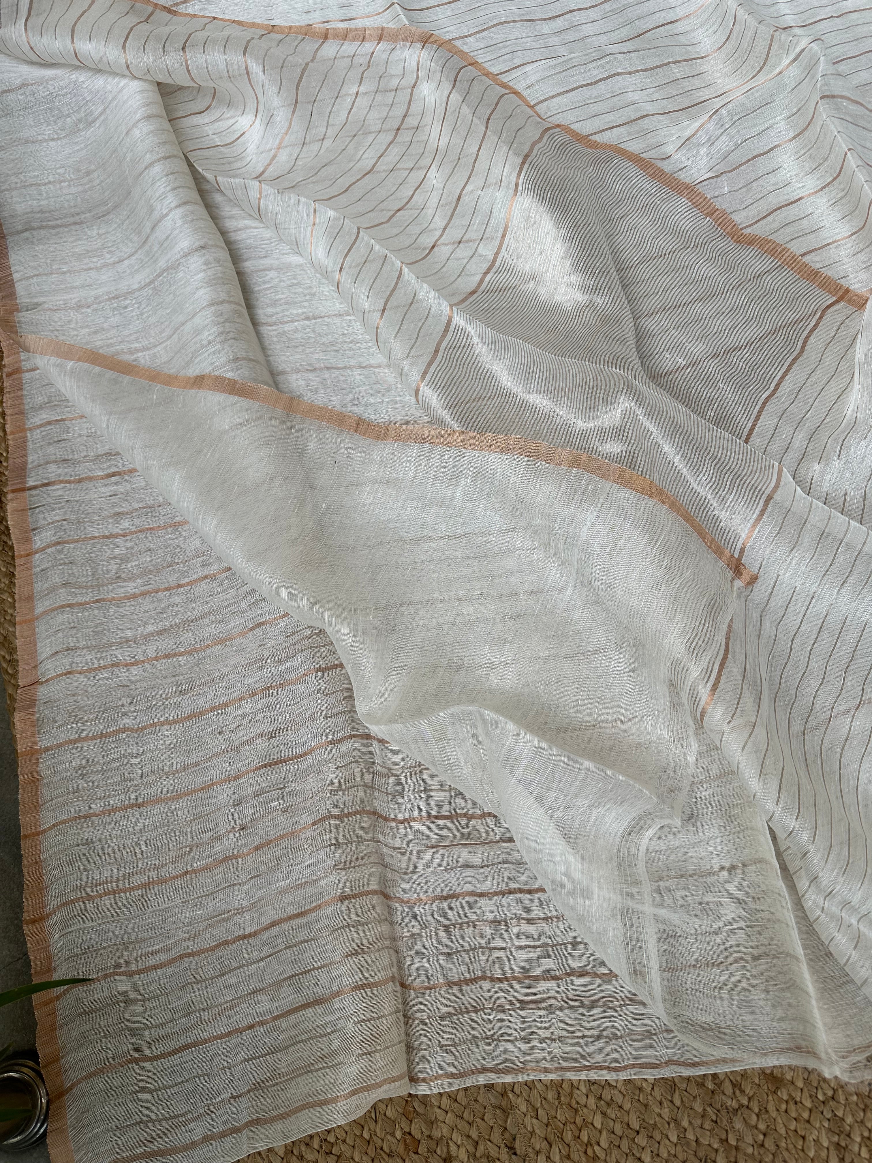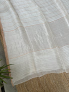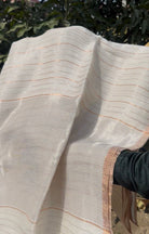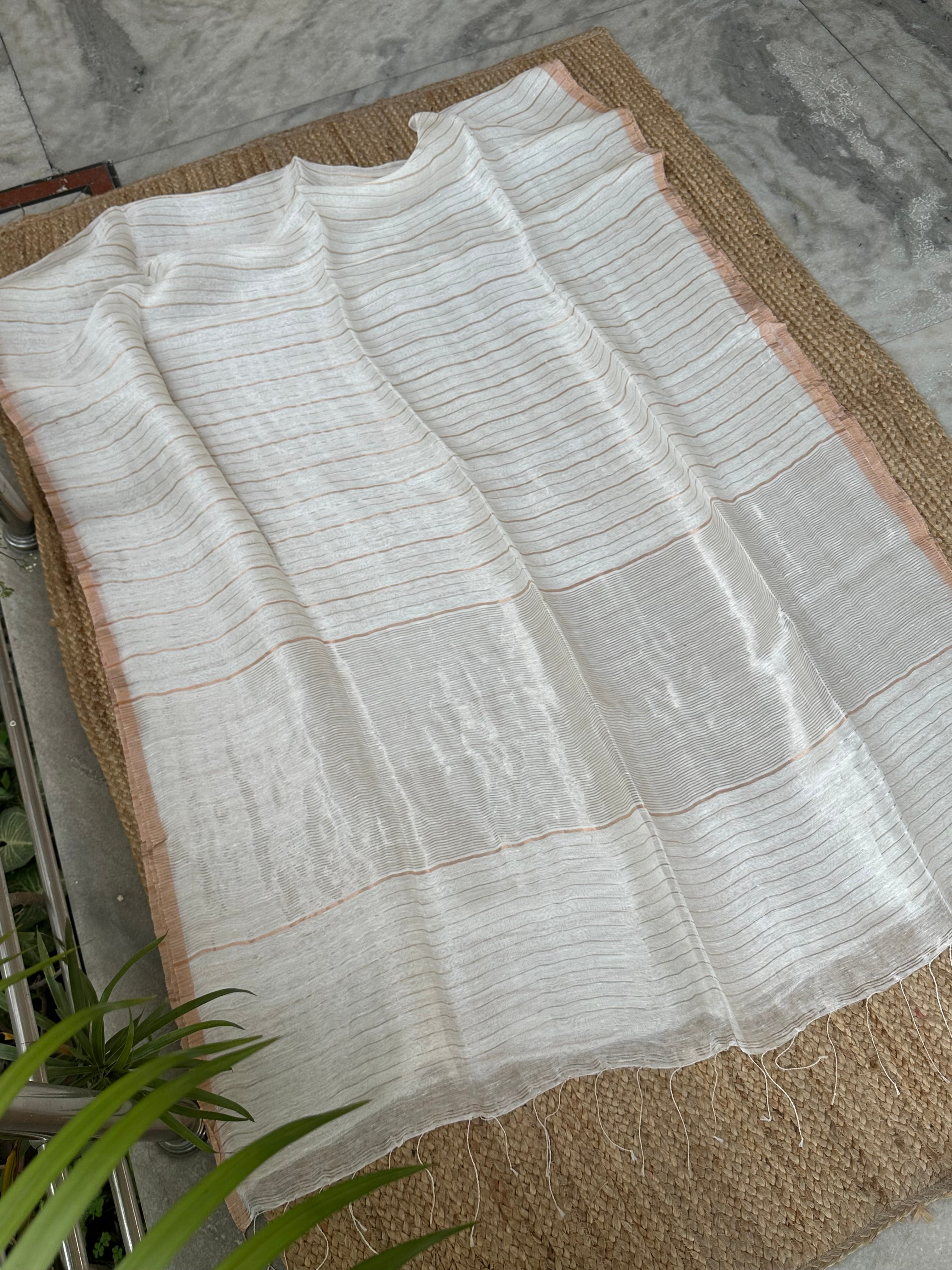 White Pure Linen Silk Handloom Dual Zari Striped Saree