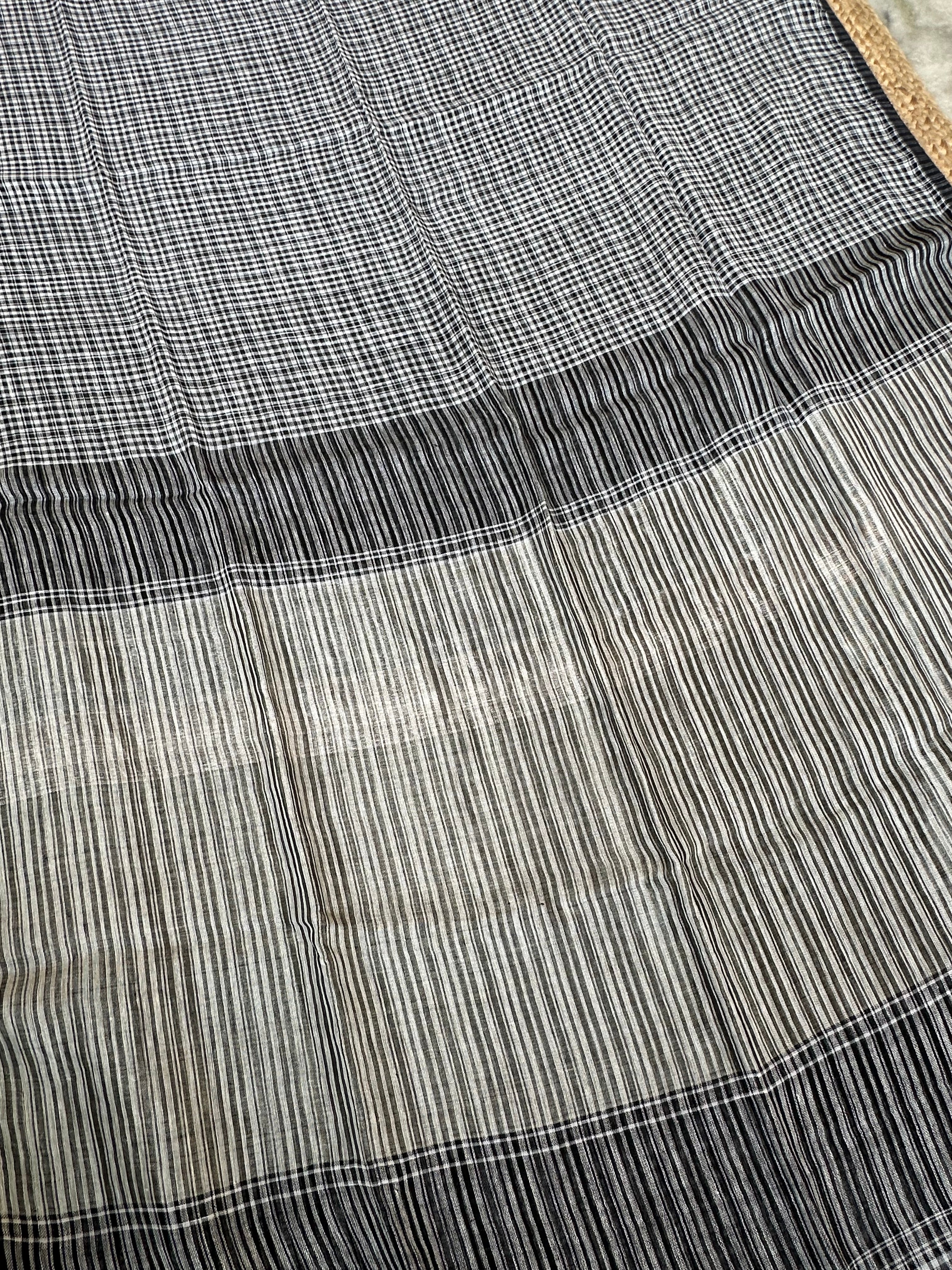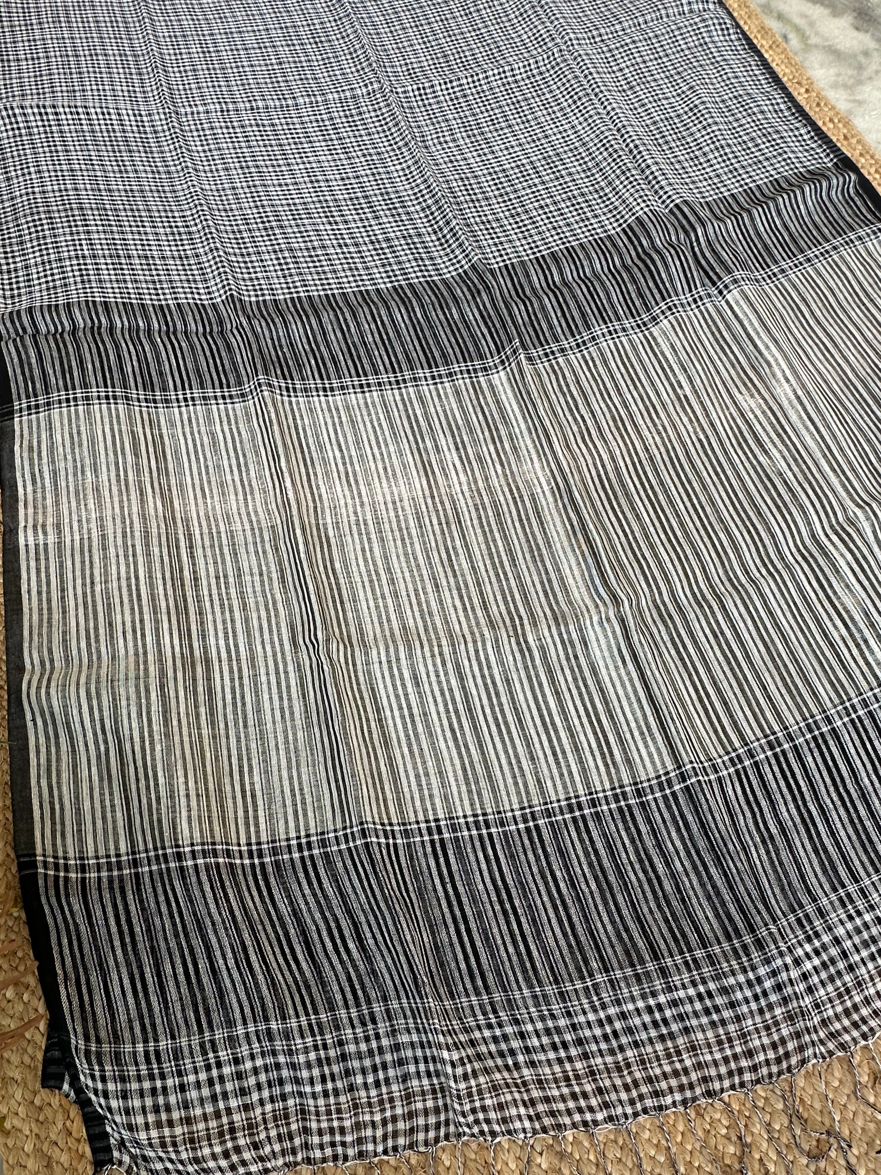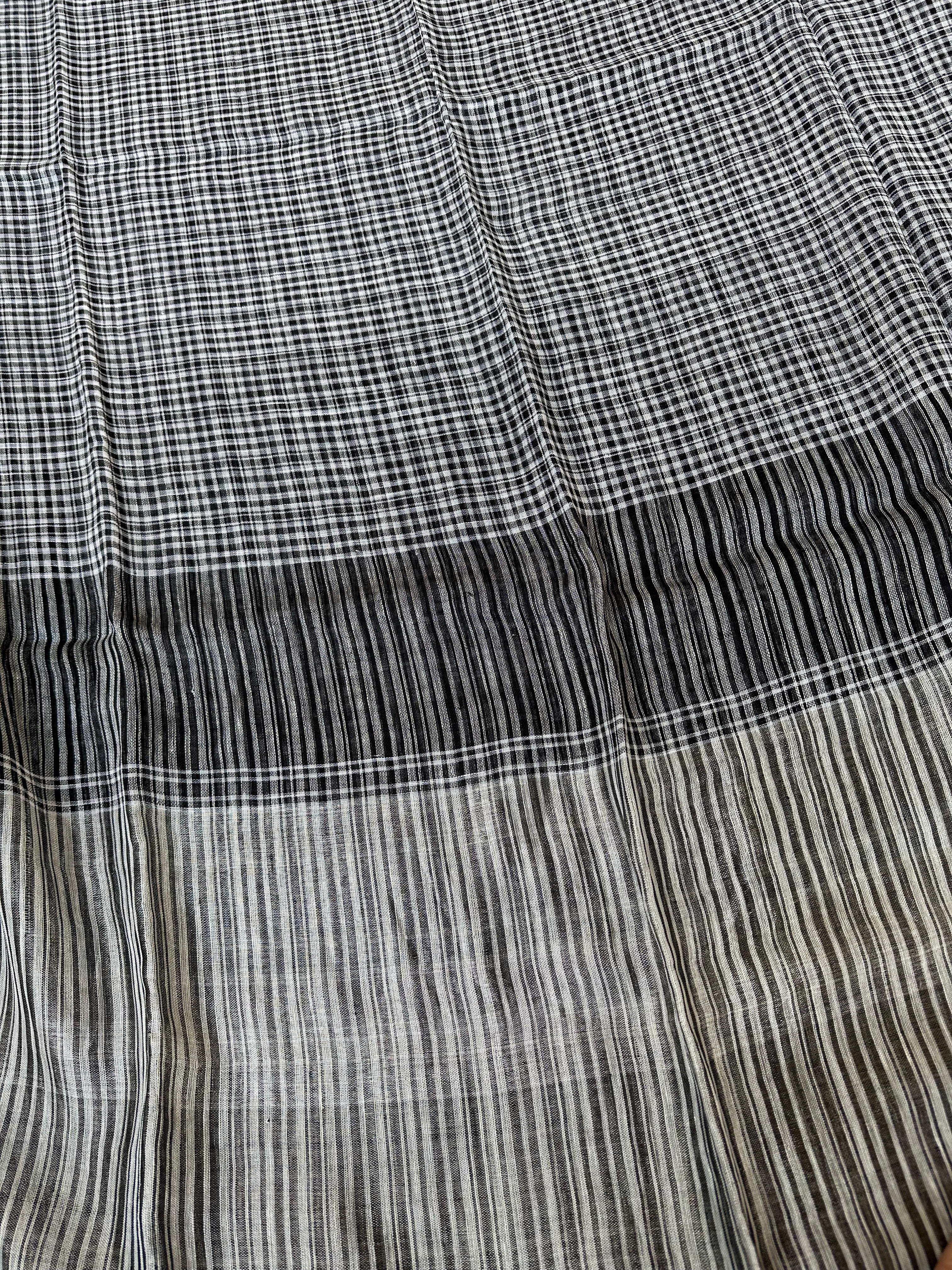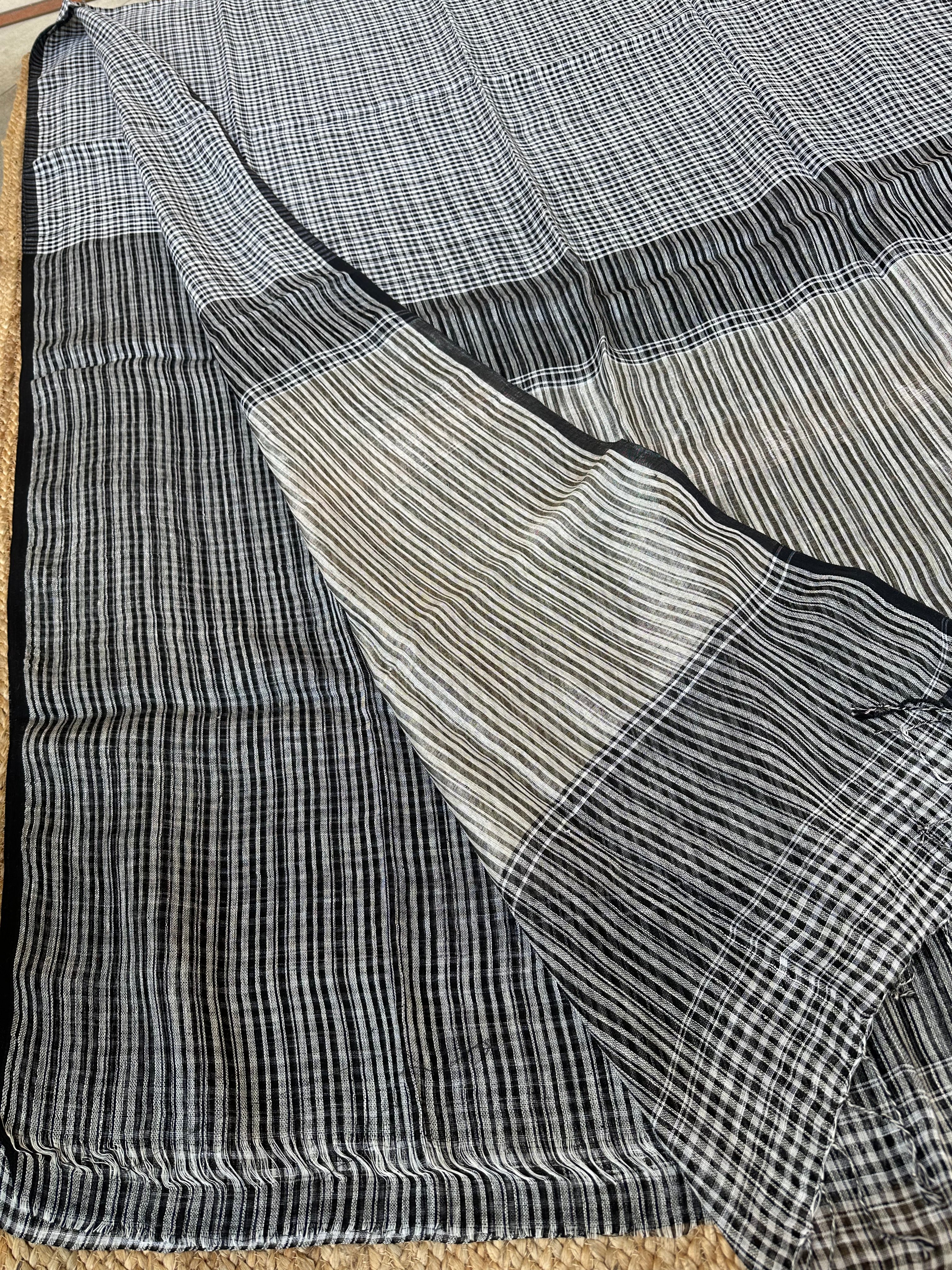 Black Linen Handloom Small Checks Silver Pallu Saree