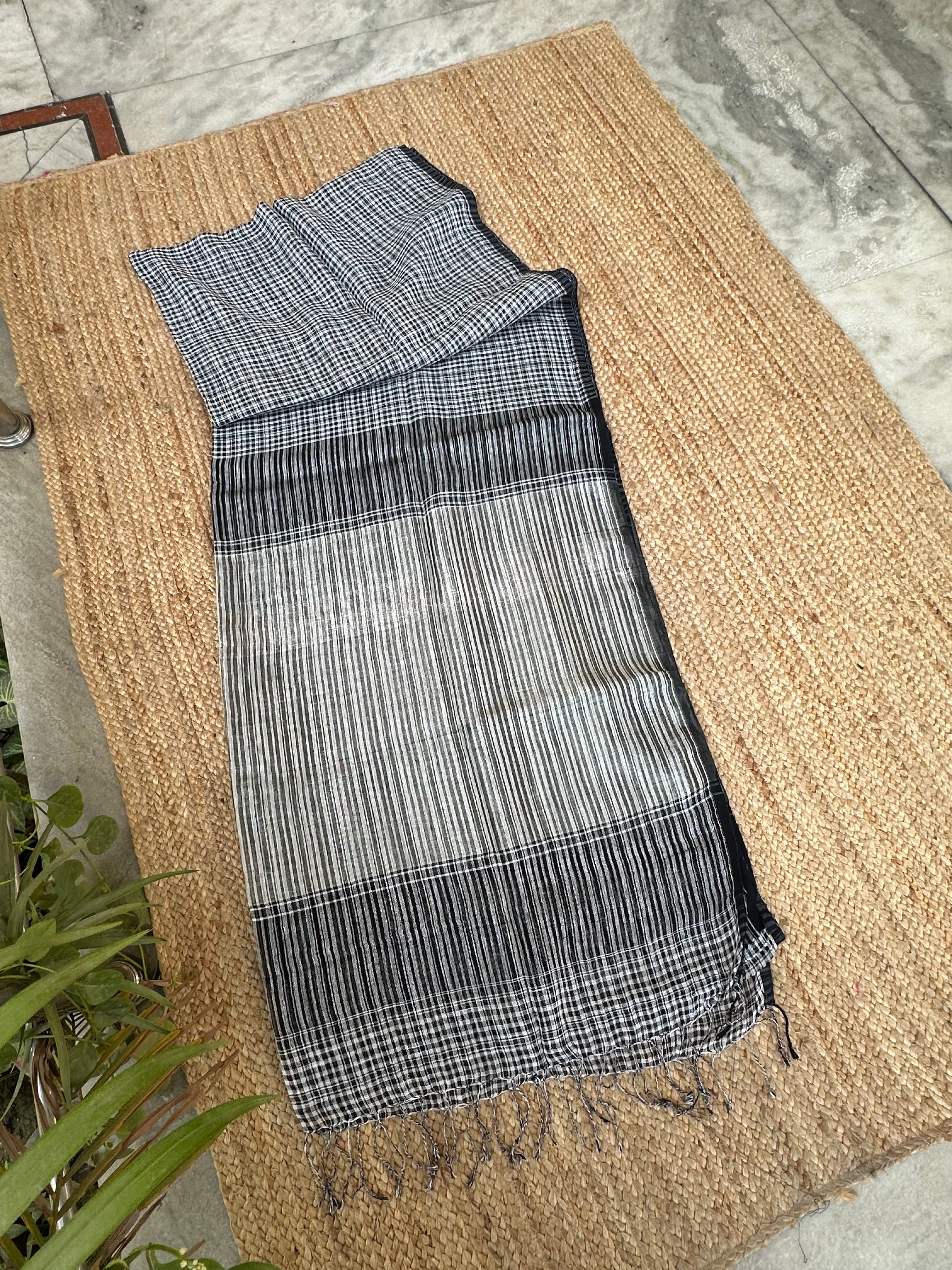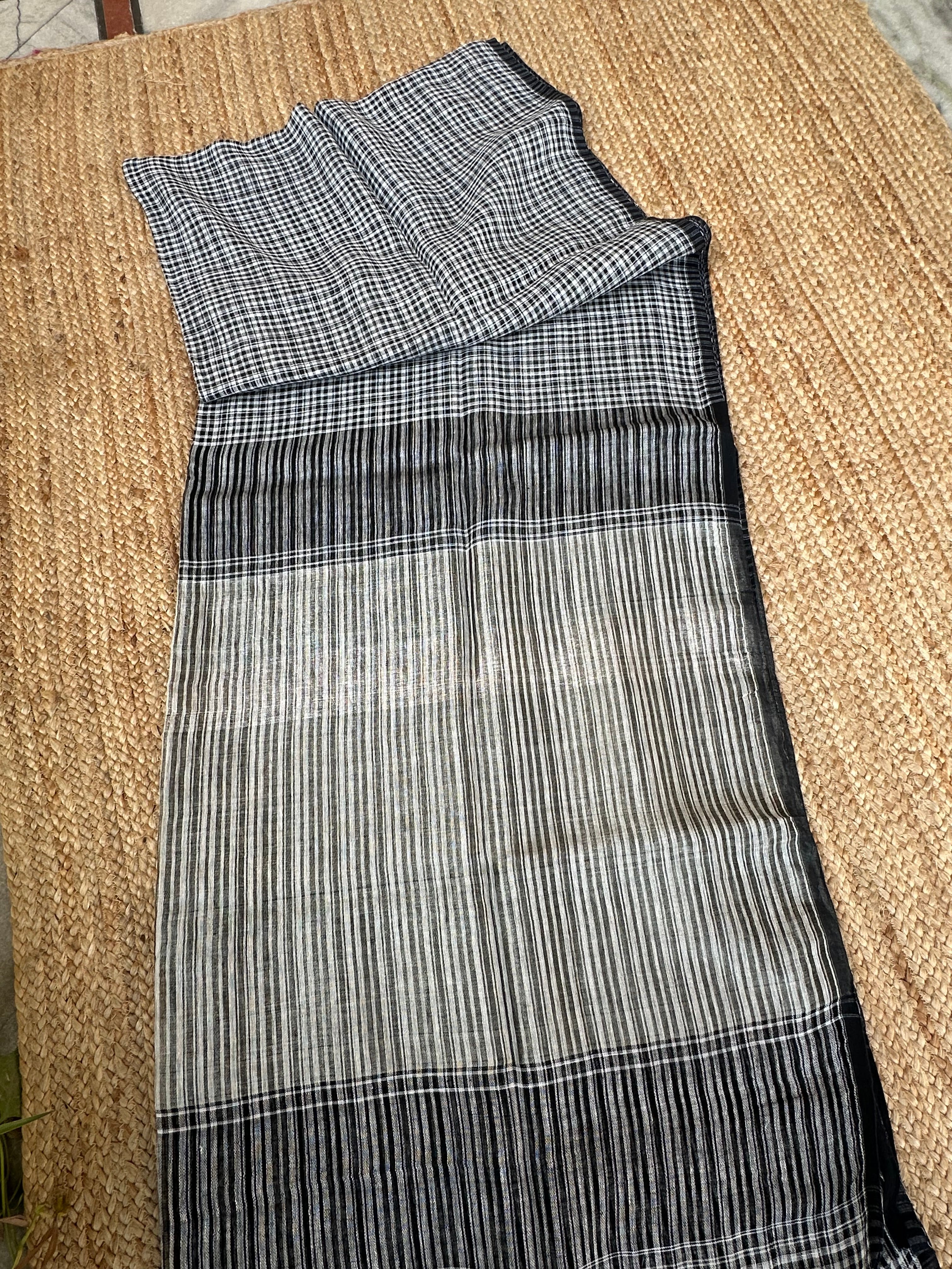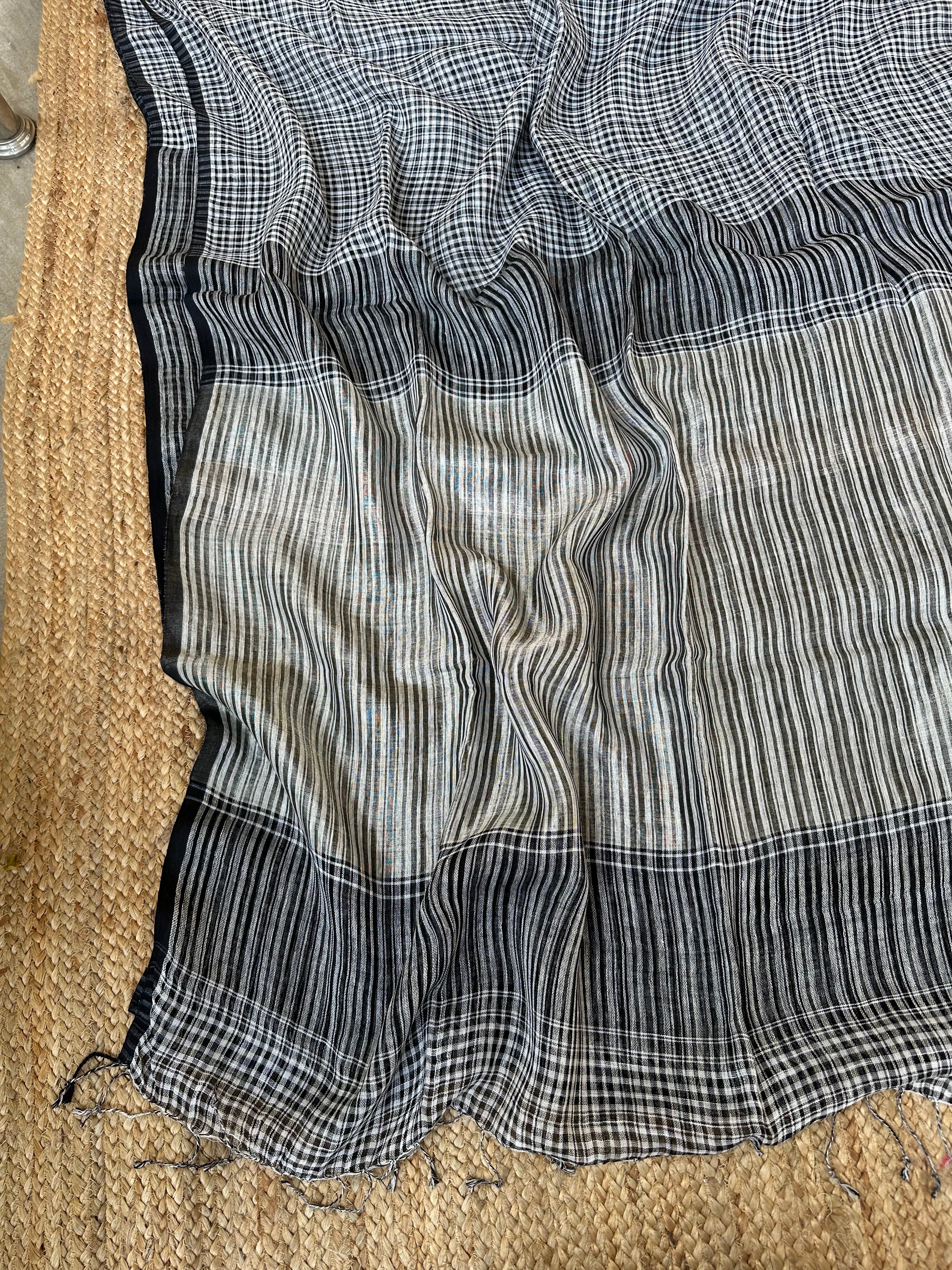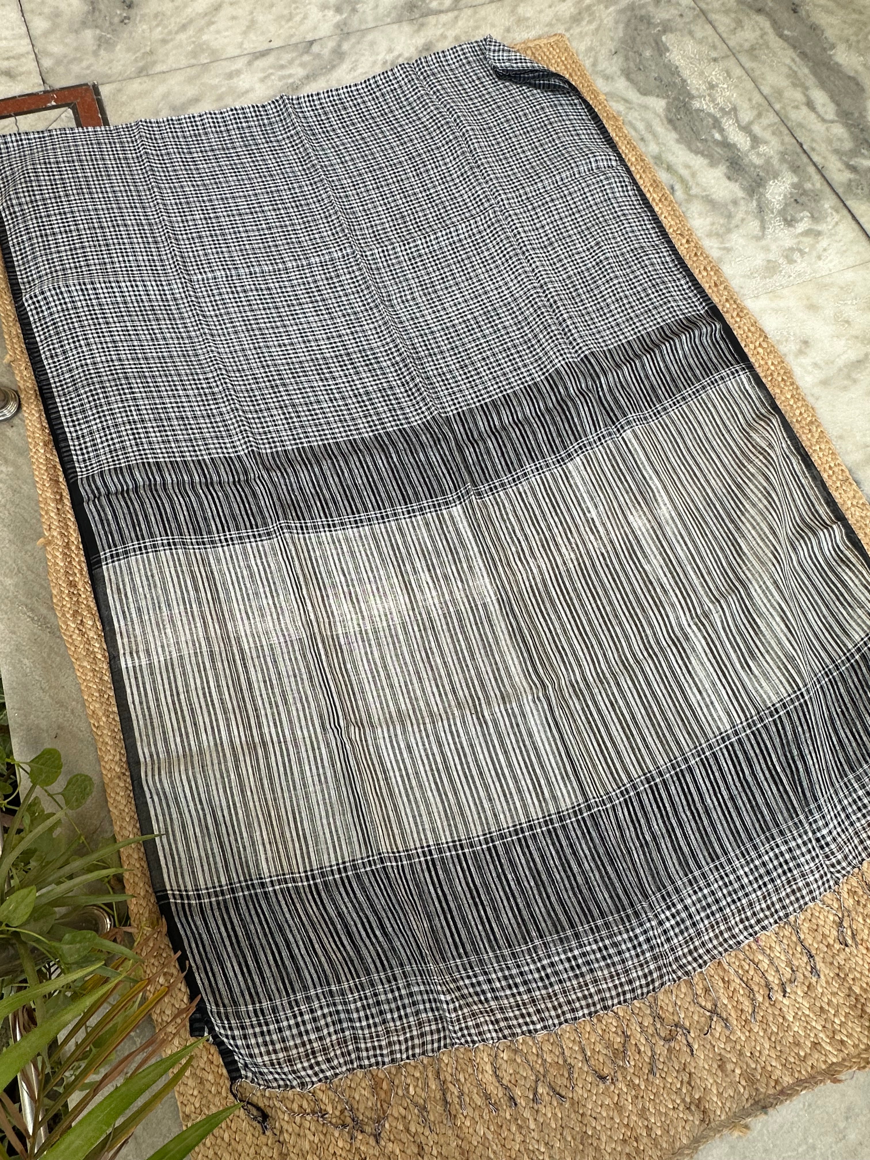 Black Linen Handloom Small Checks Silver Pallu Saree