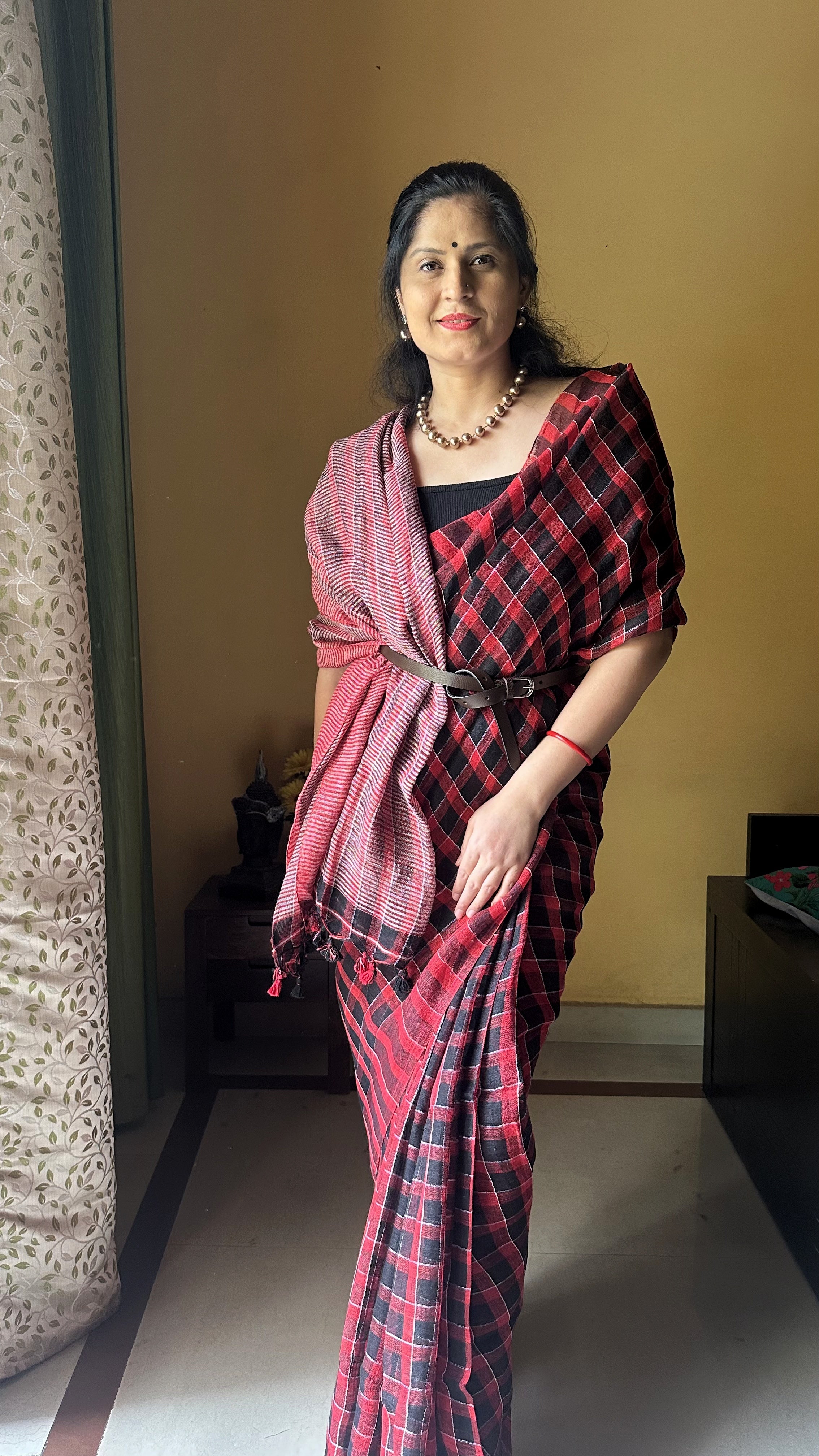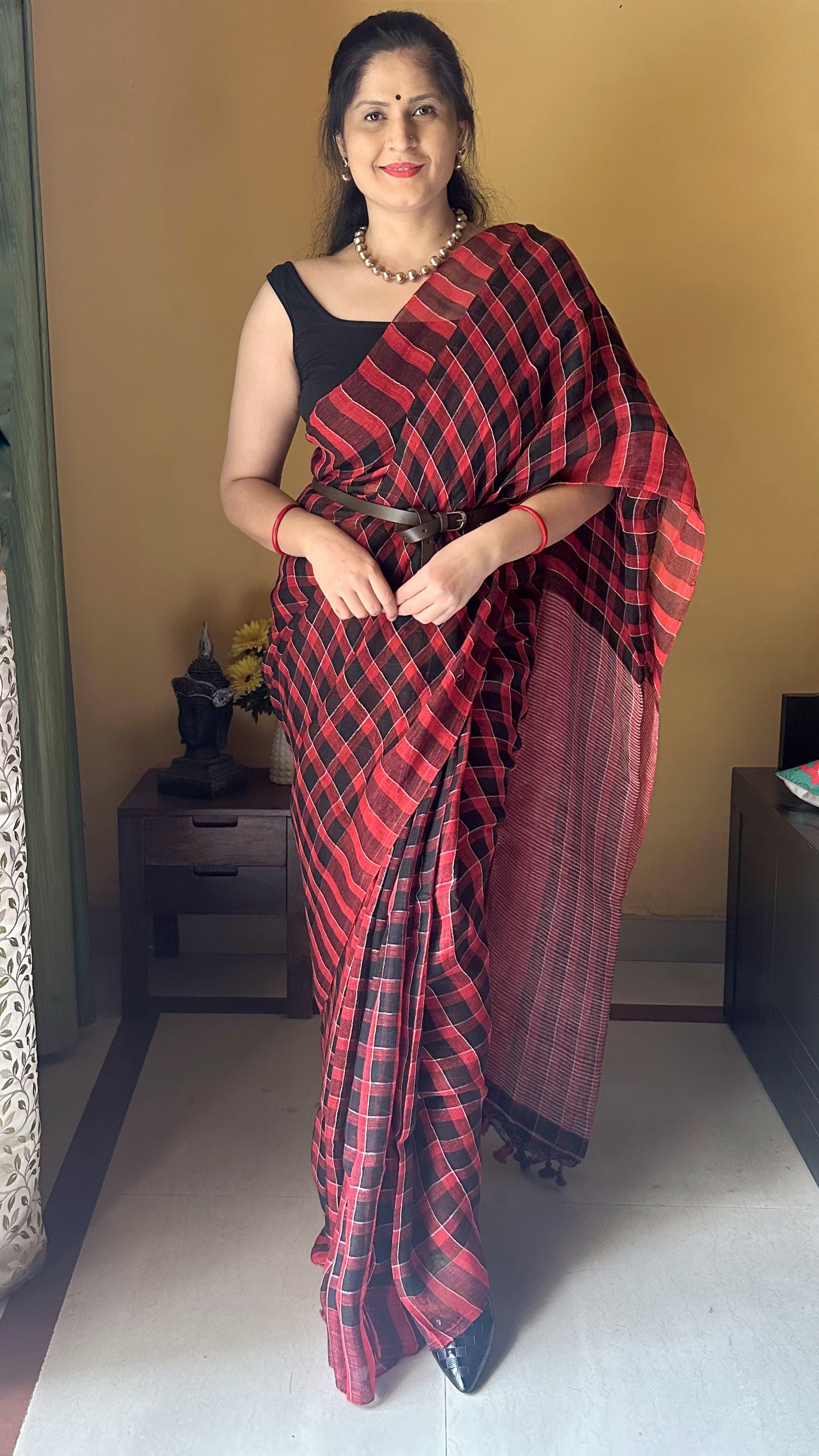 Checks Linen Handloom Saree (Red-Black)