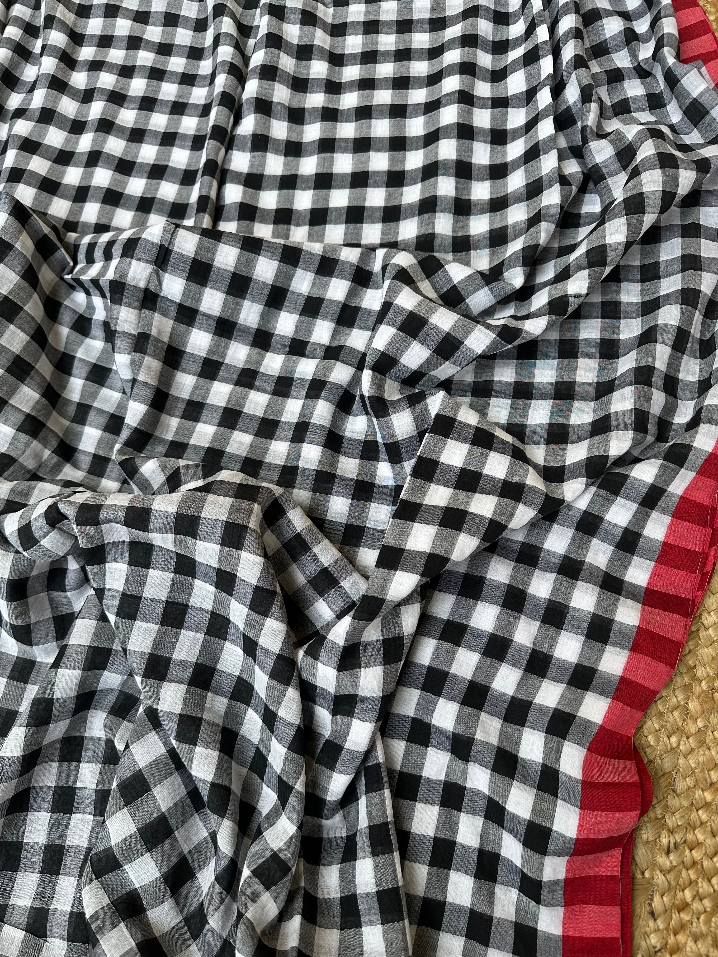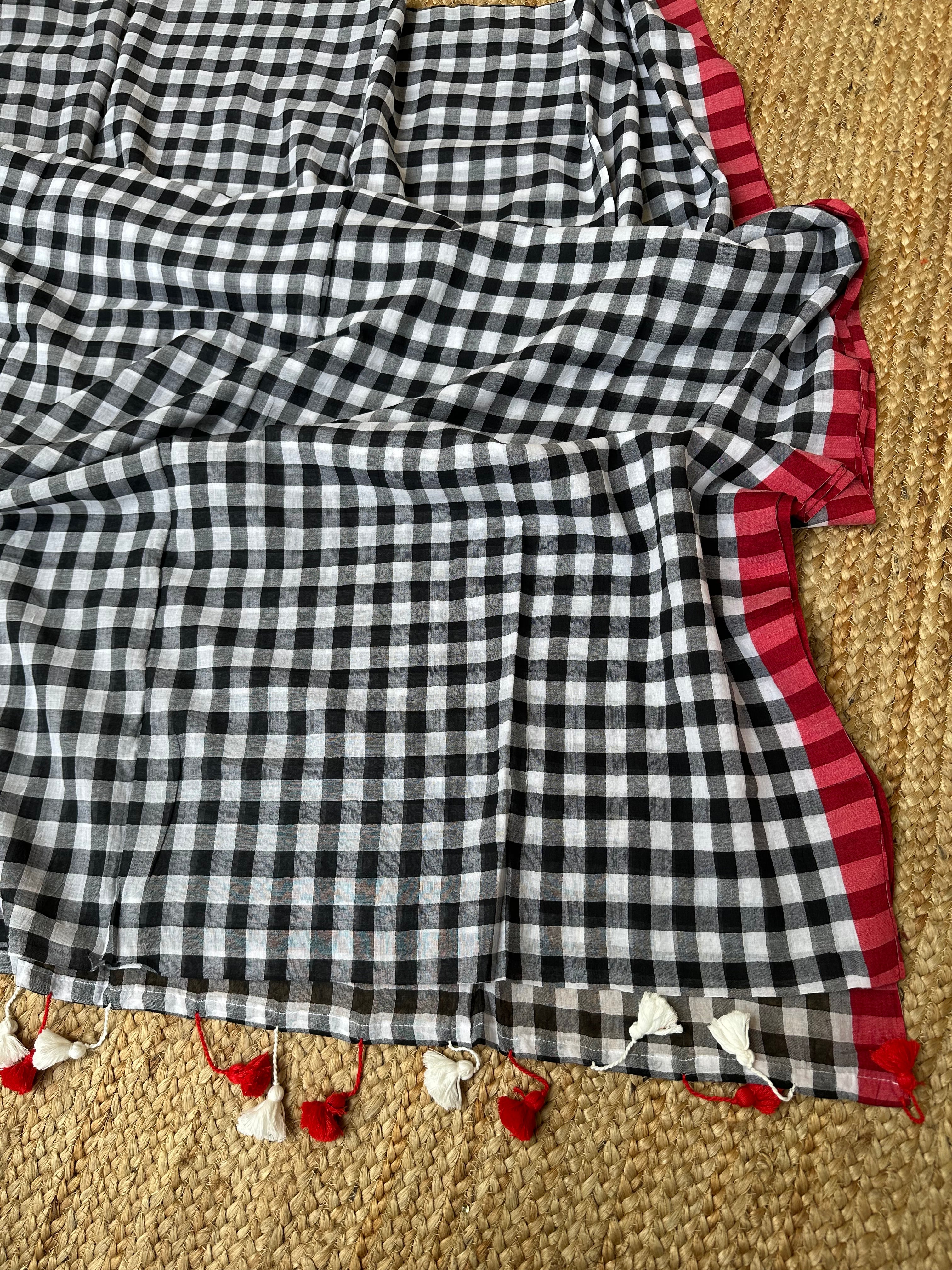 Cotton Handloom check saree Black White with Red Borders