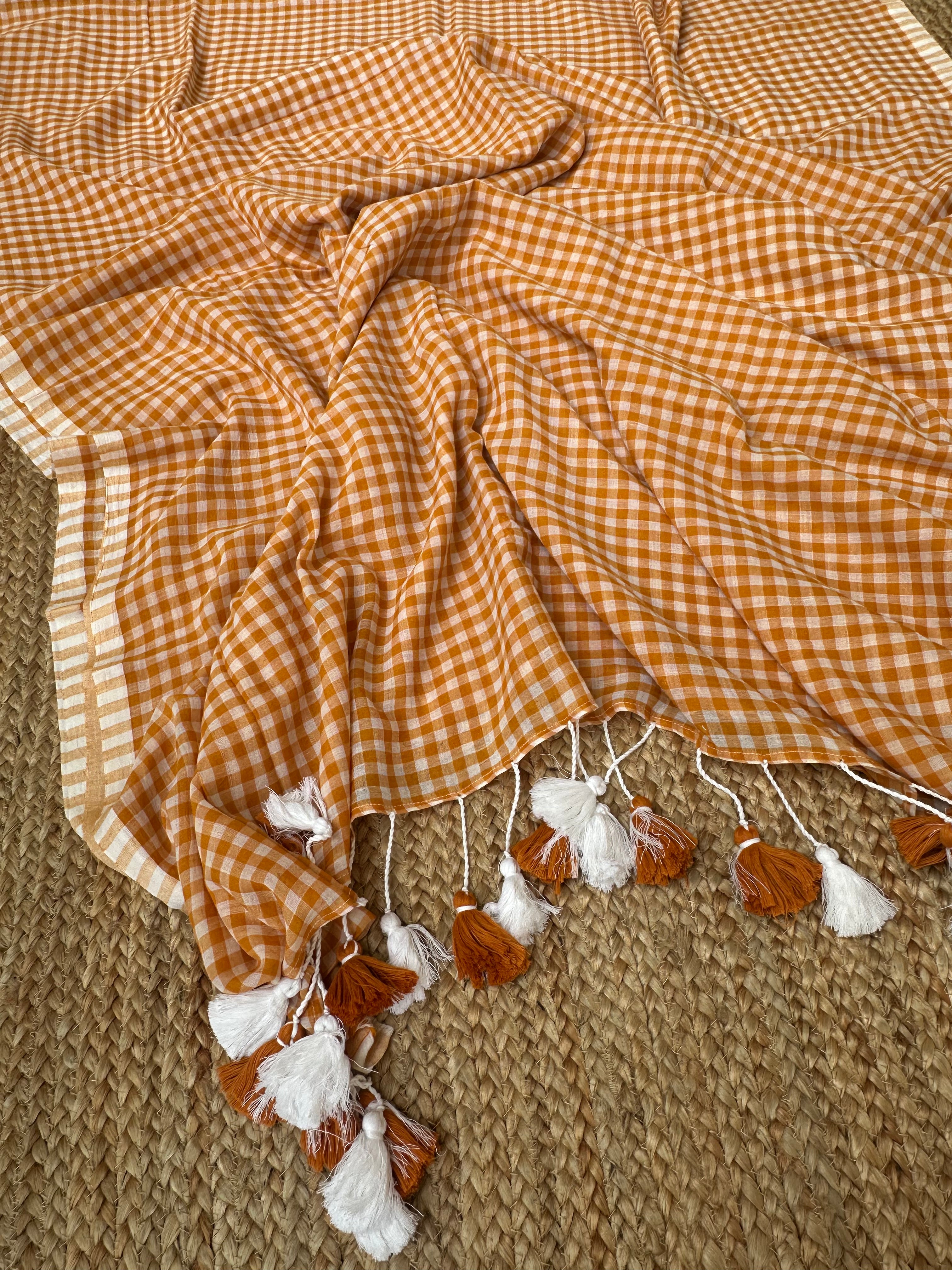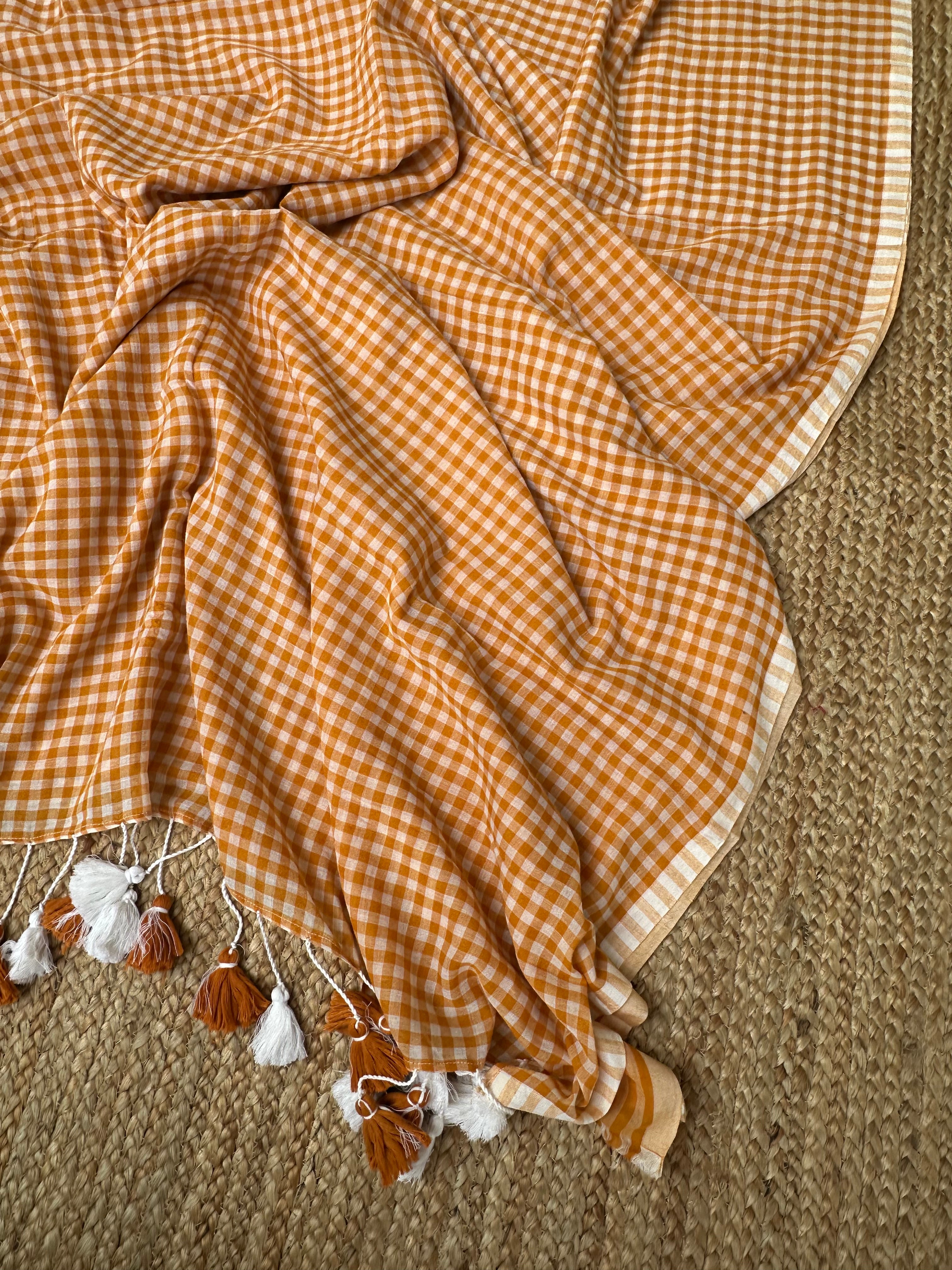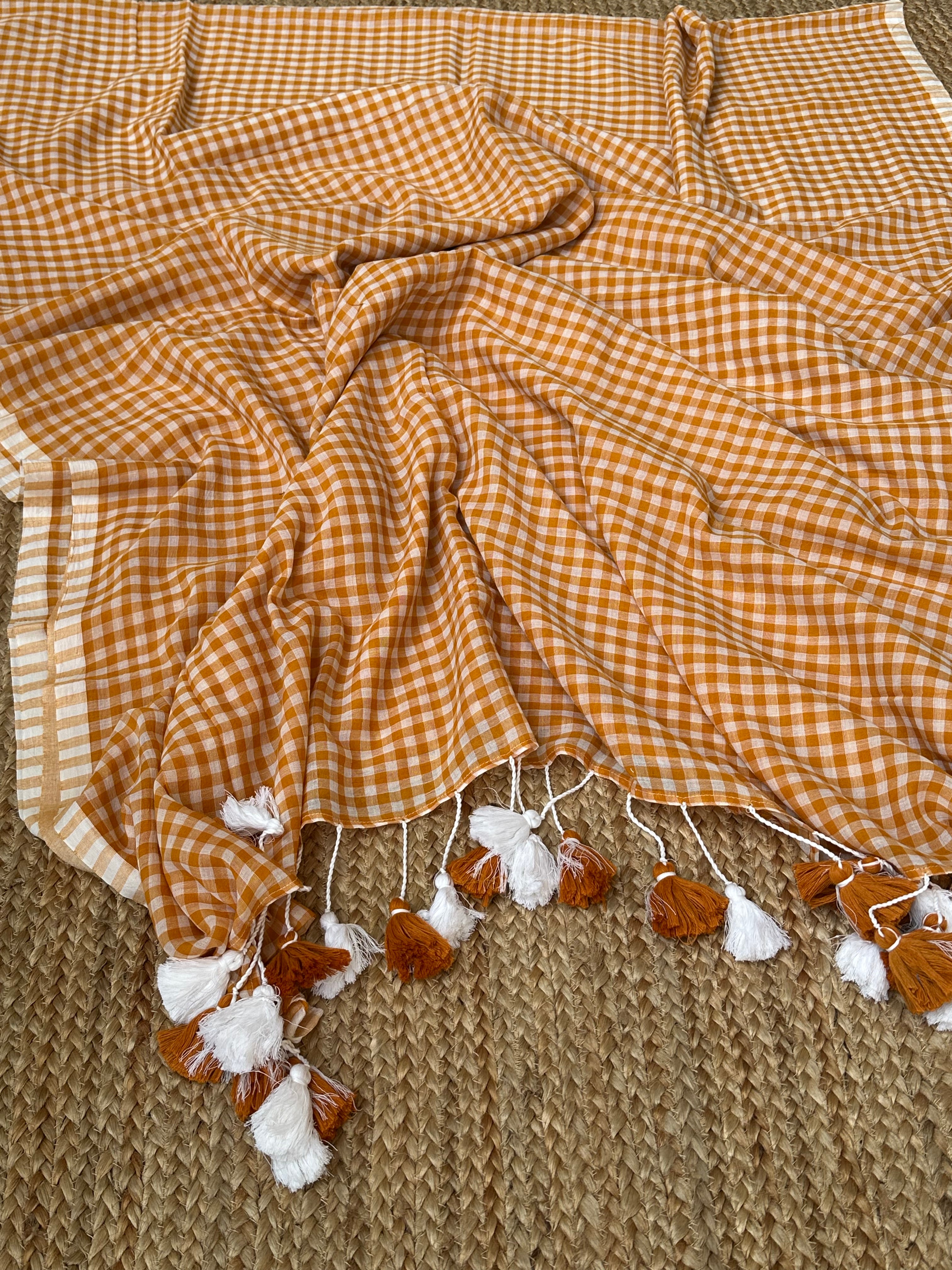 Orangish Mustard Cotton Handloom check saree