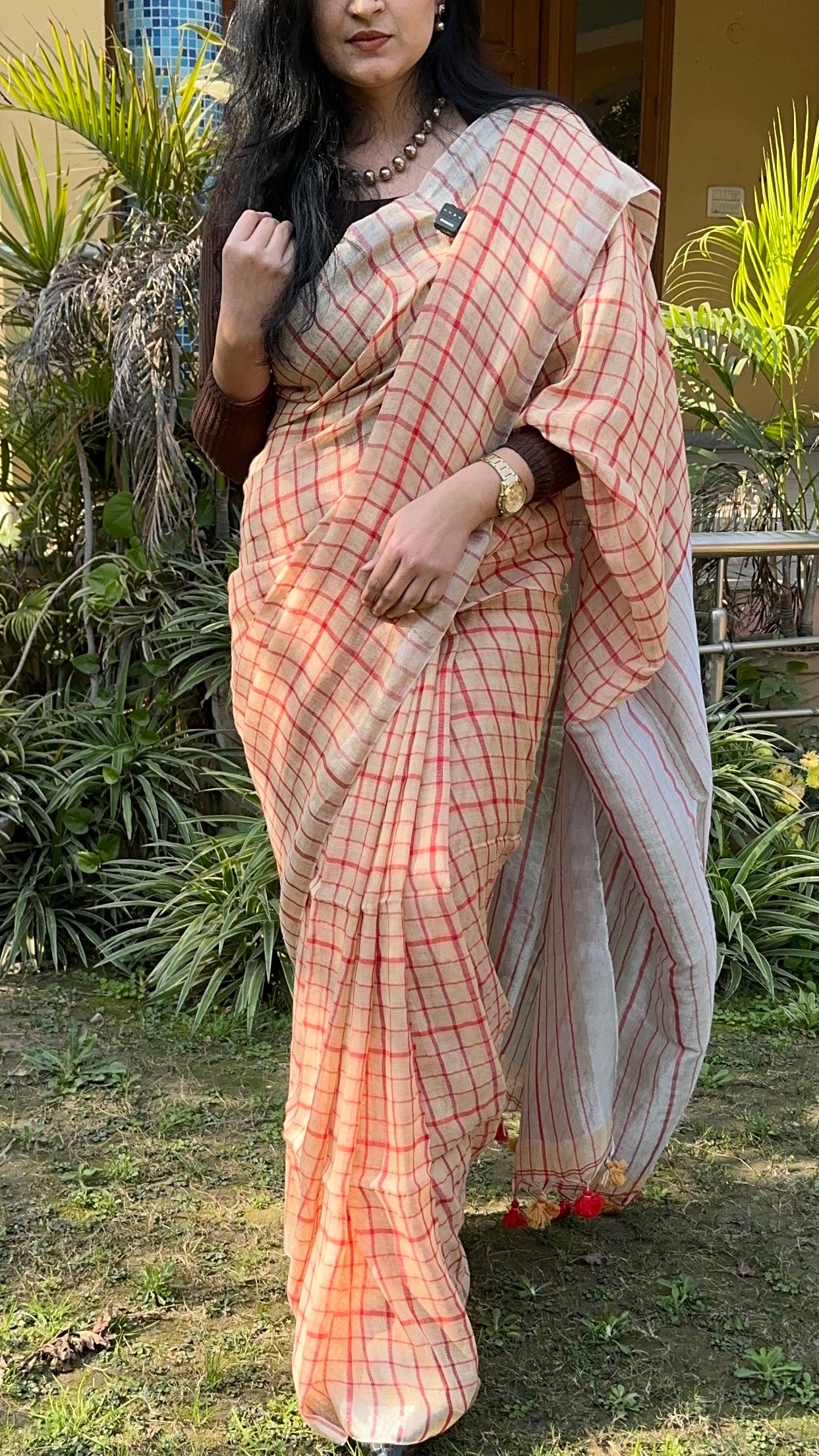 Cream Linen Handloom Red checks saree