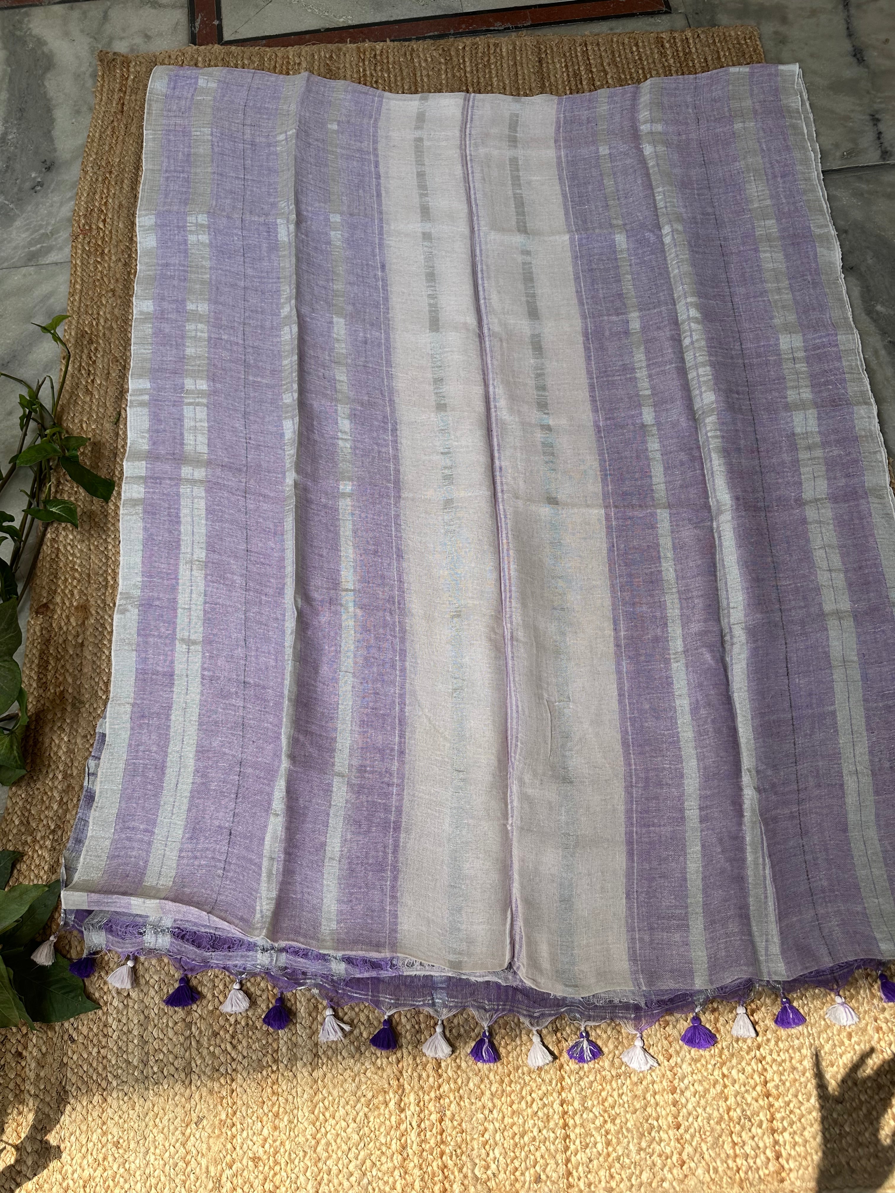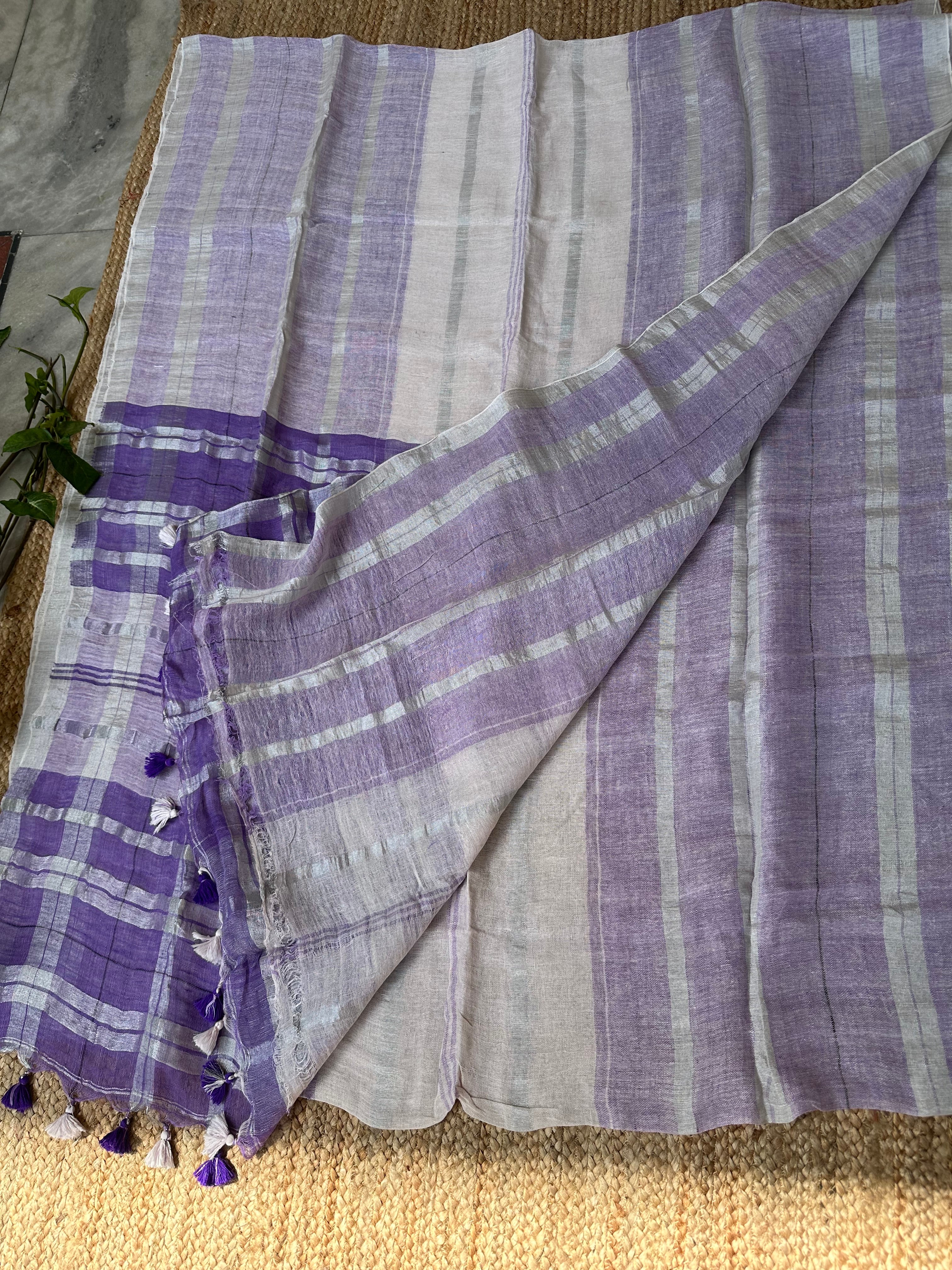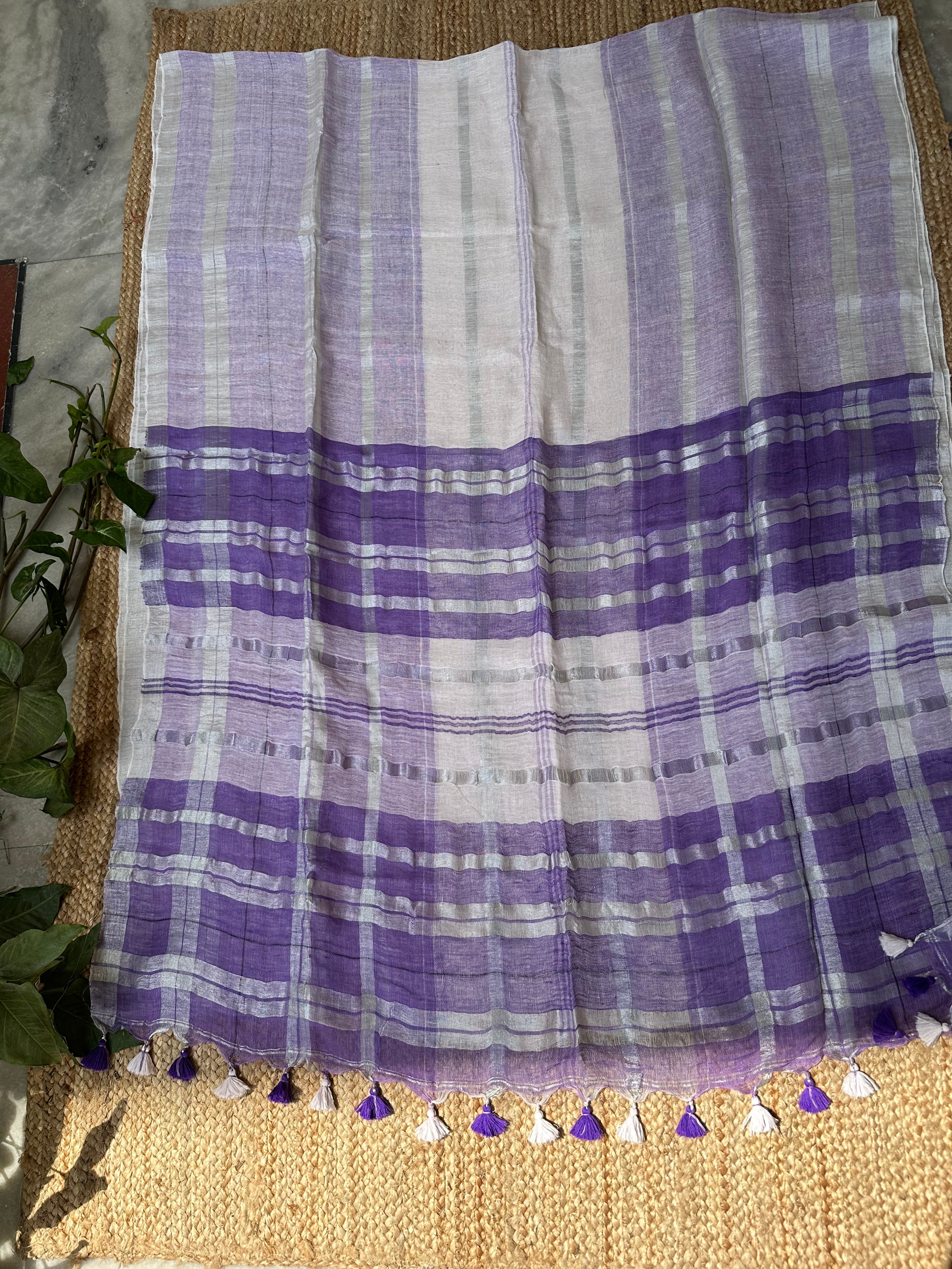 Purple White Pure Linen Handloom Saree