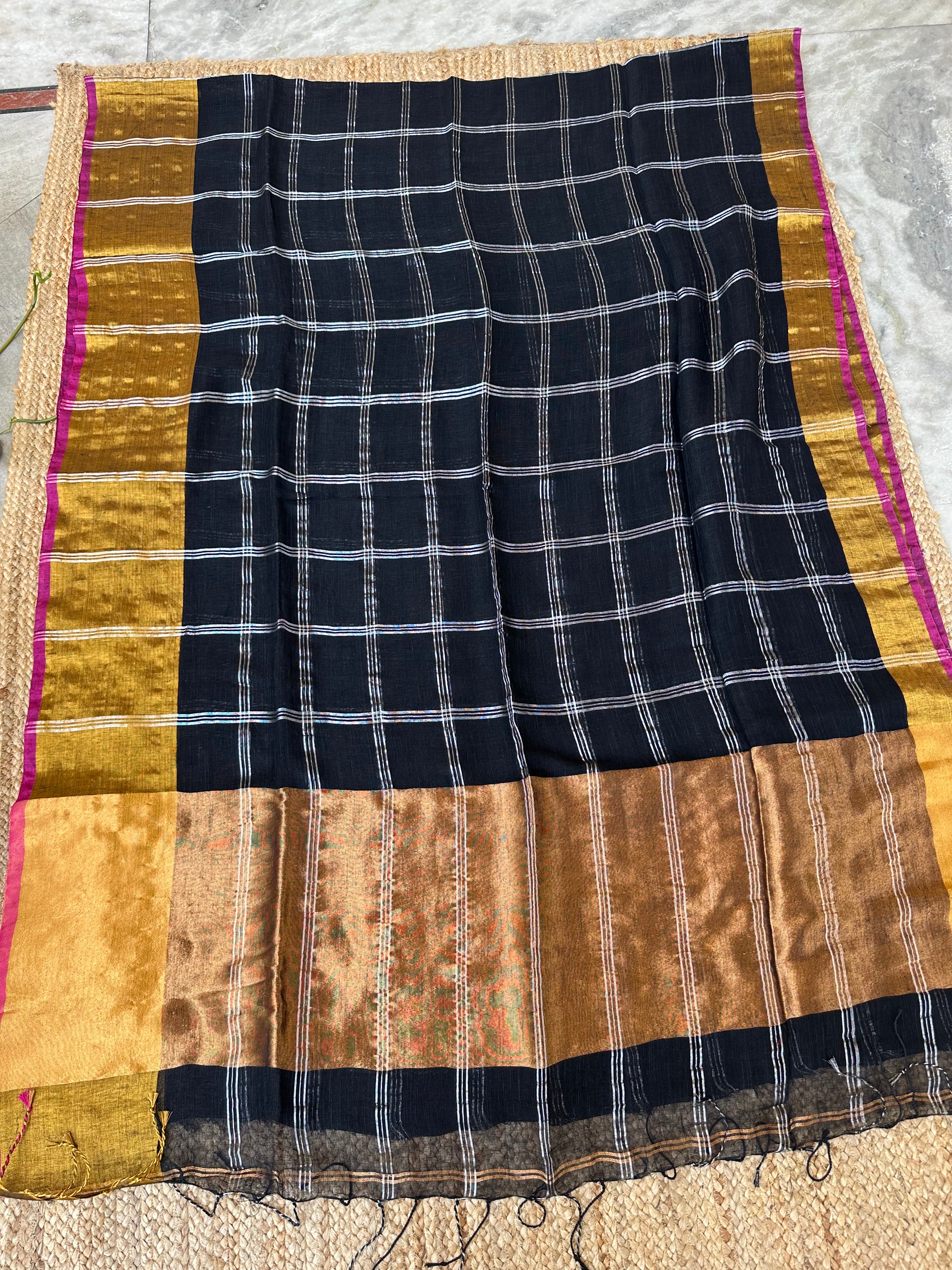 Black zari Checks Linen Saree