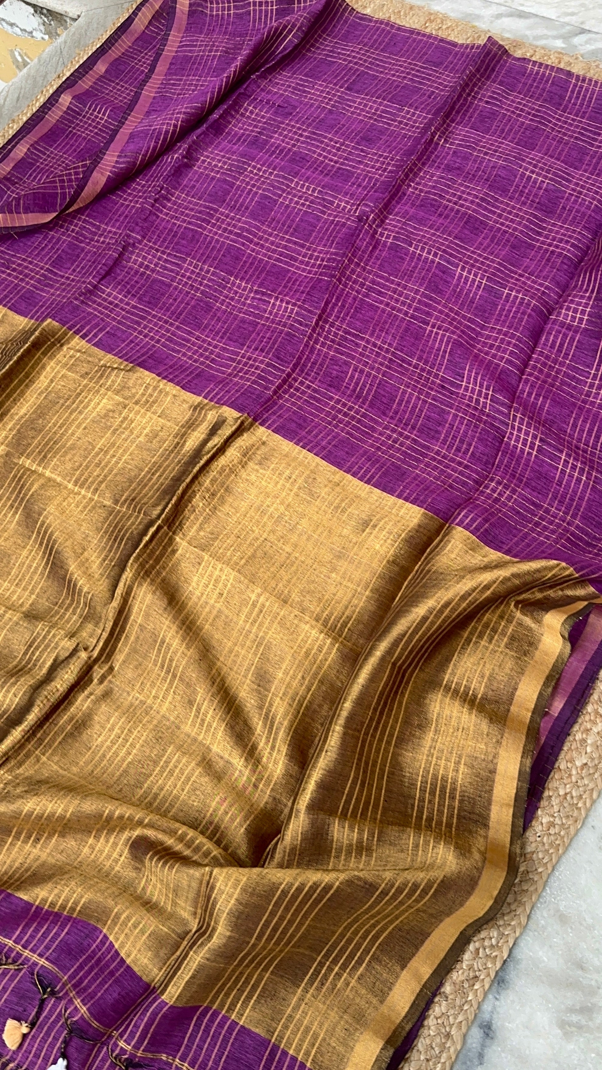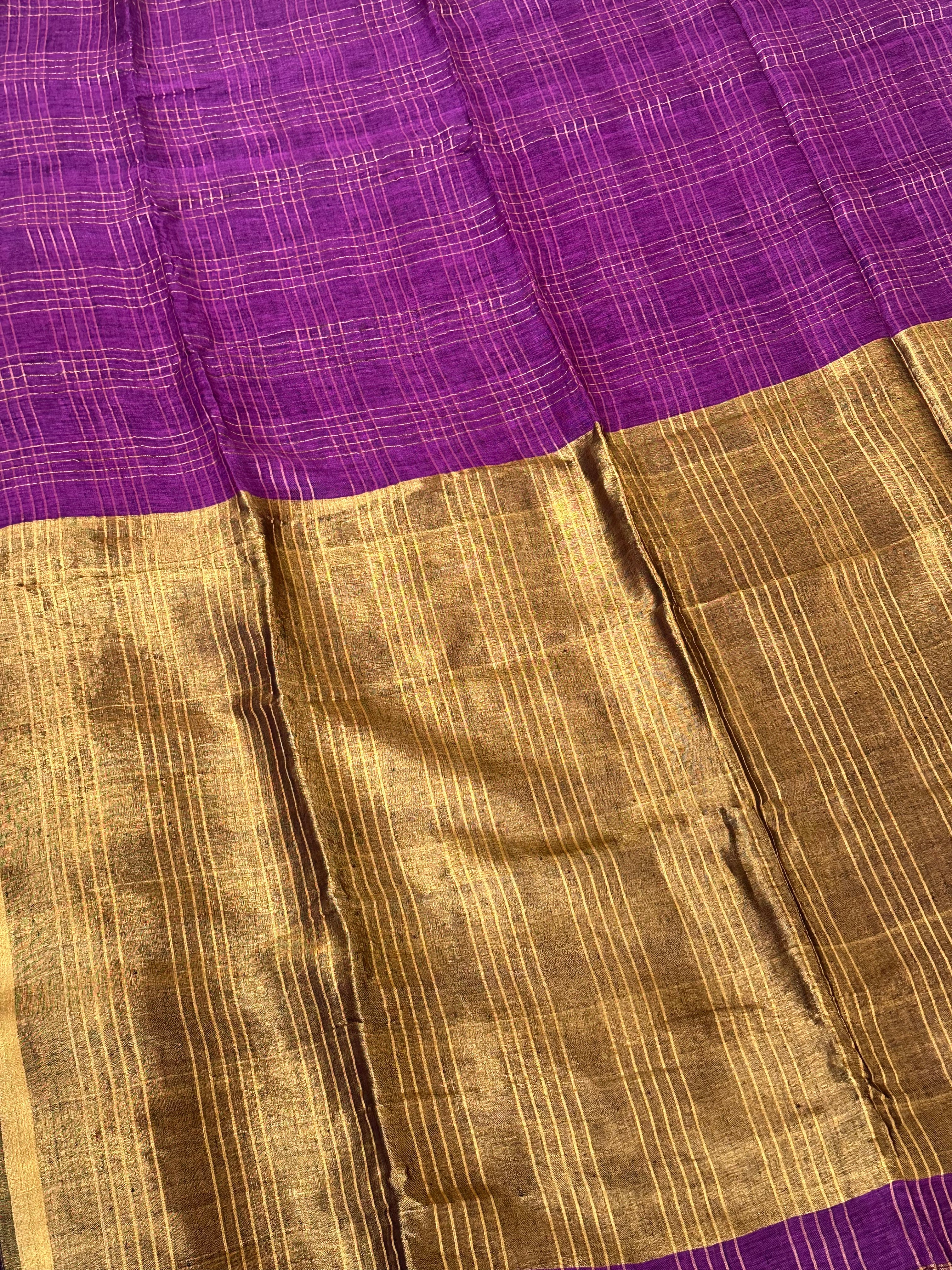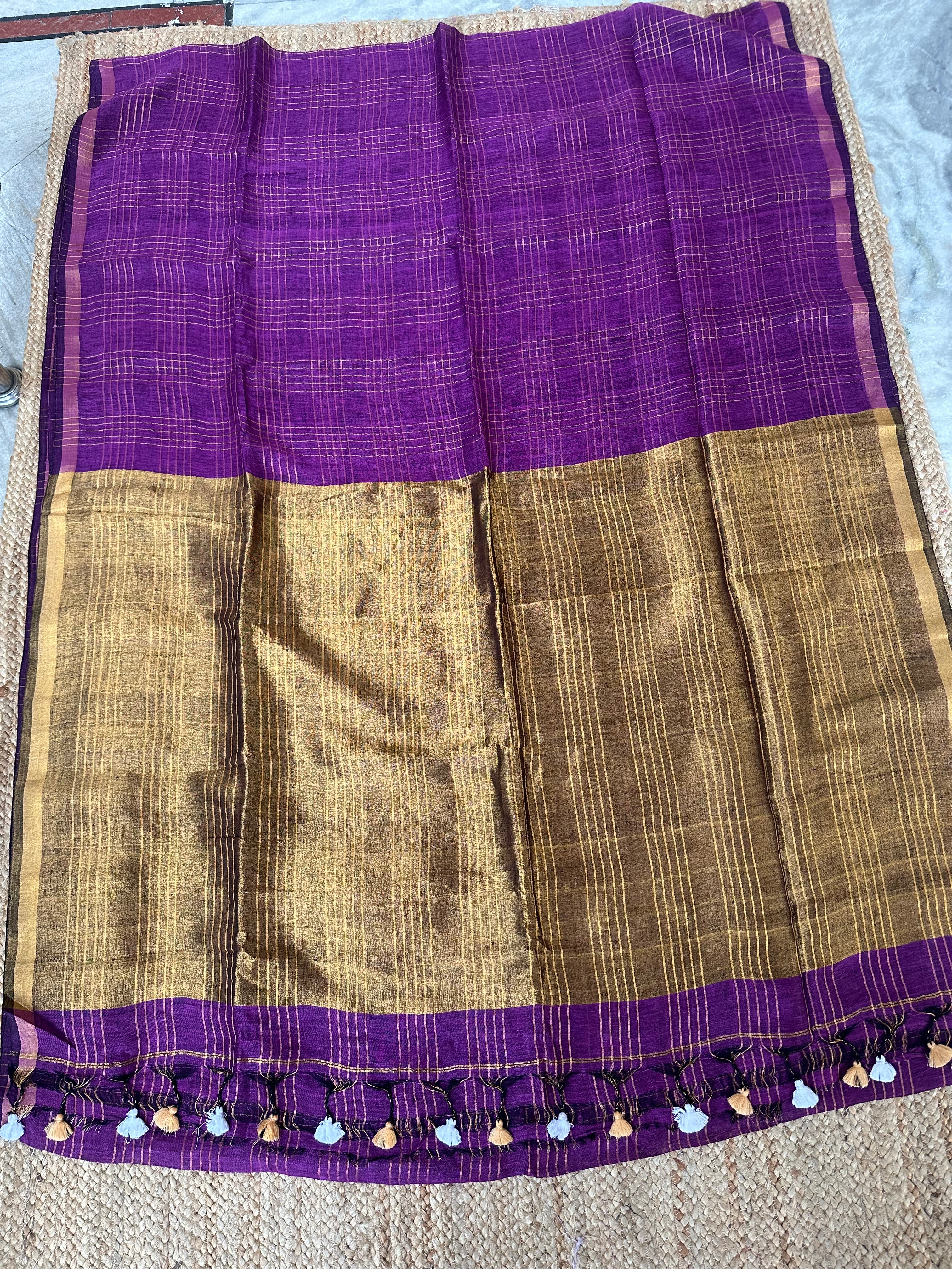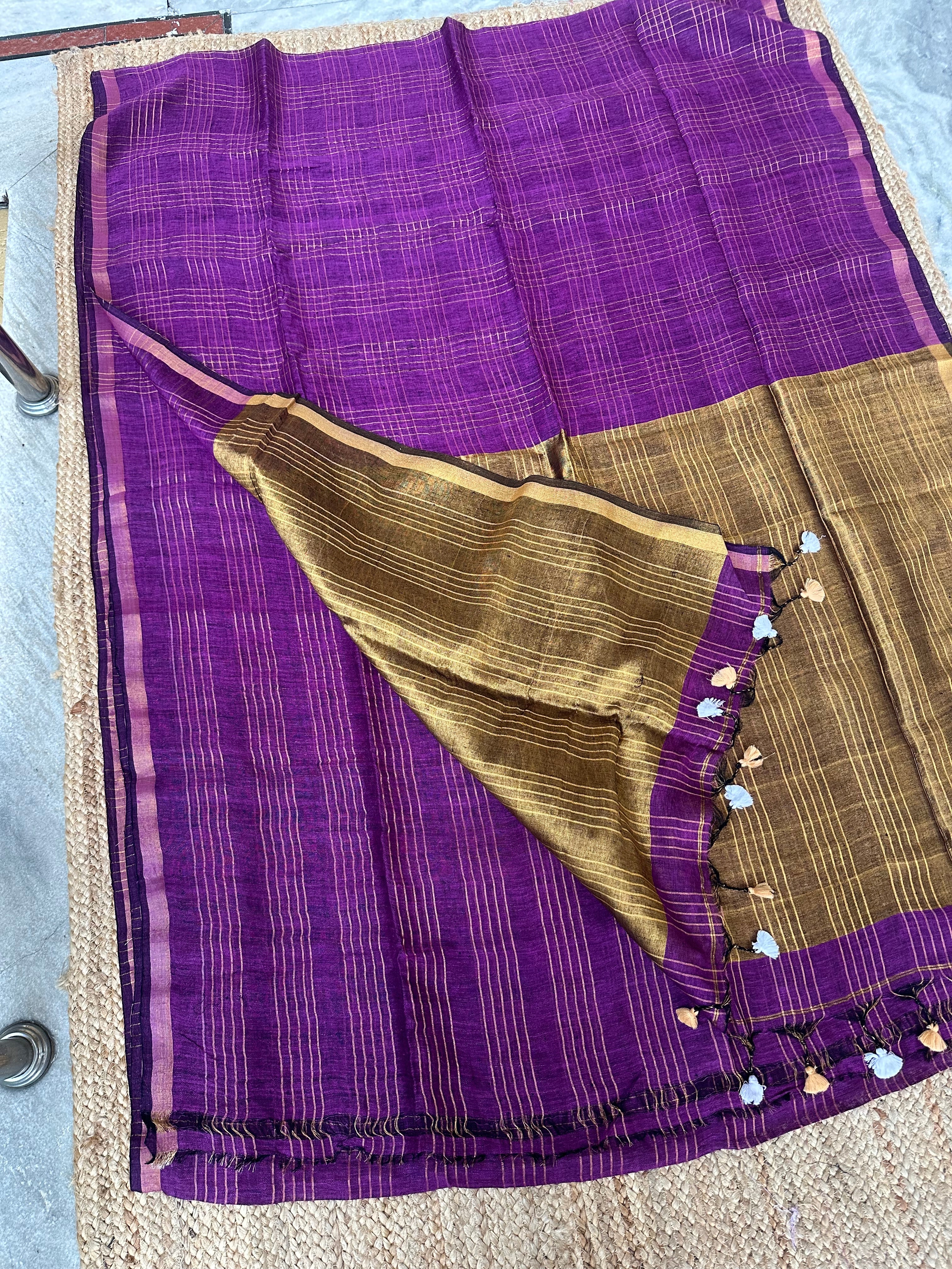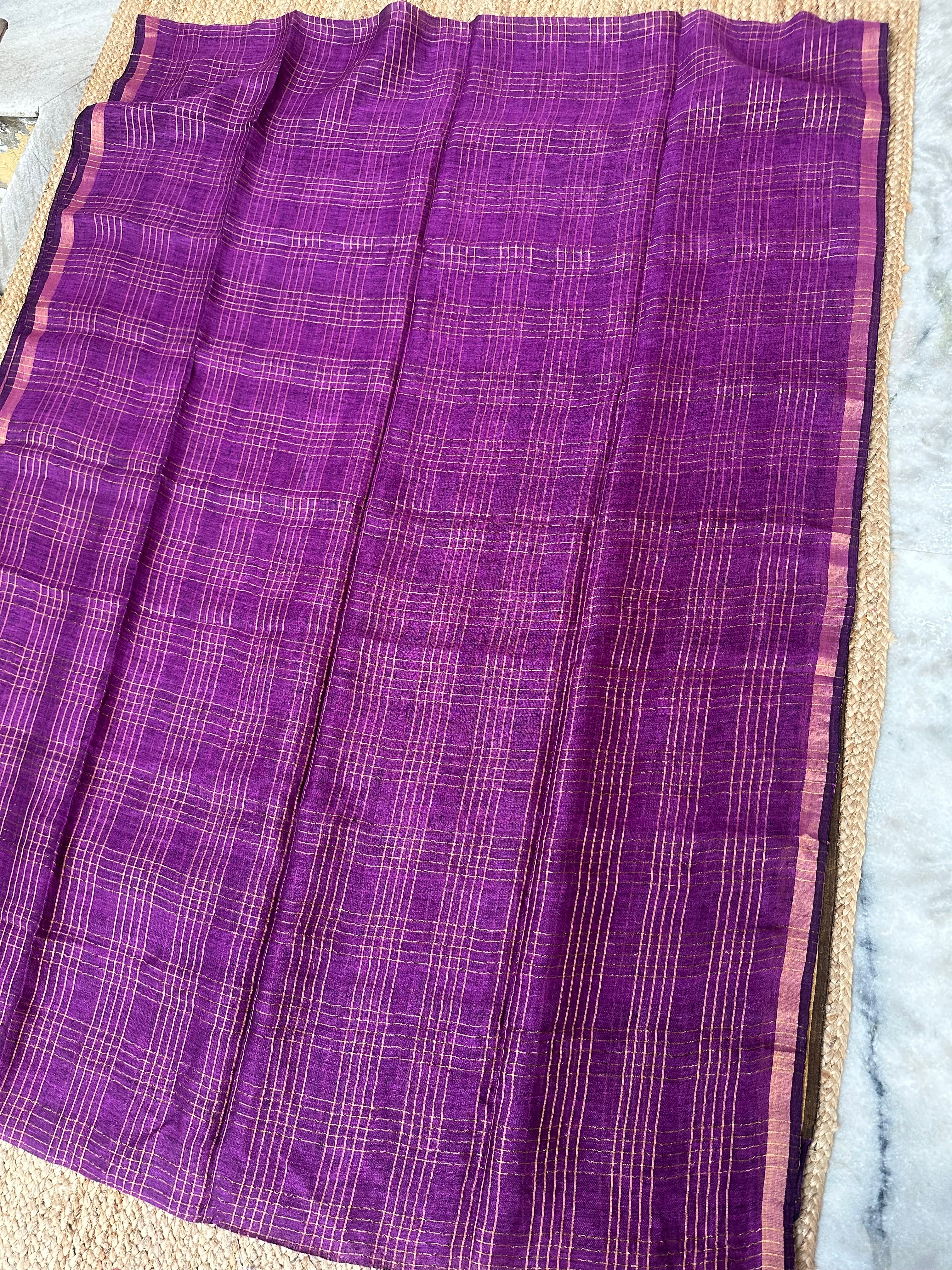 Purple Zari Checks Linen Handloom Saree
