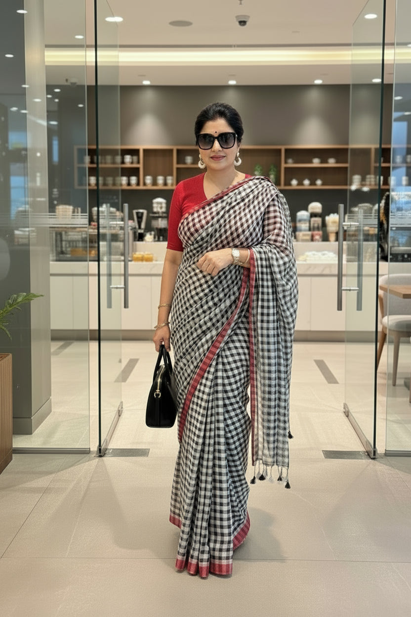 Black Checks Linen Handloom Saree with Red Borders