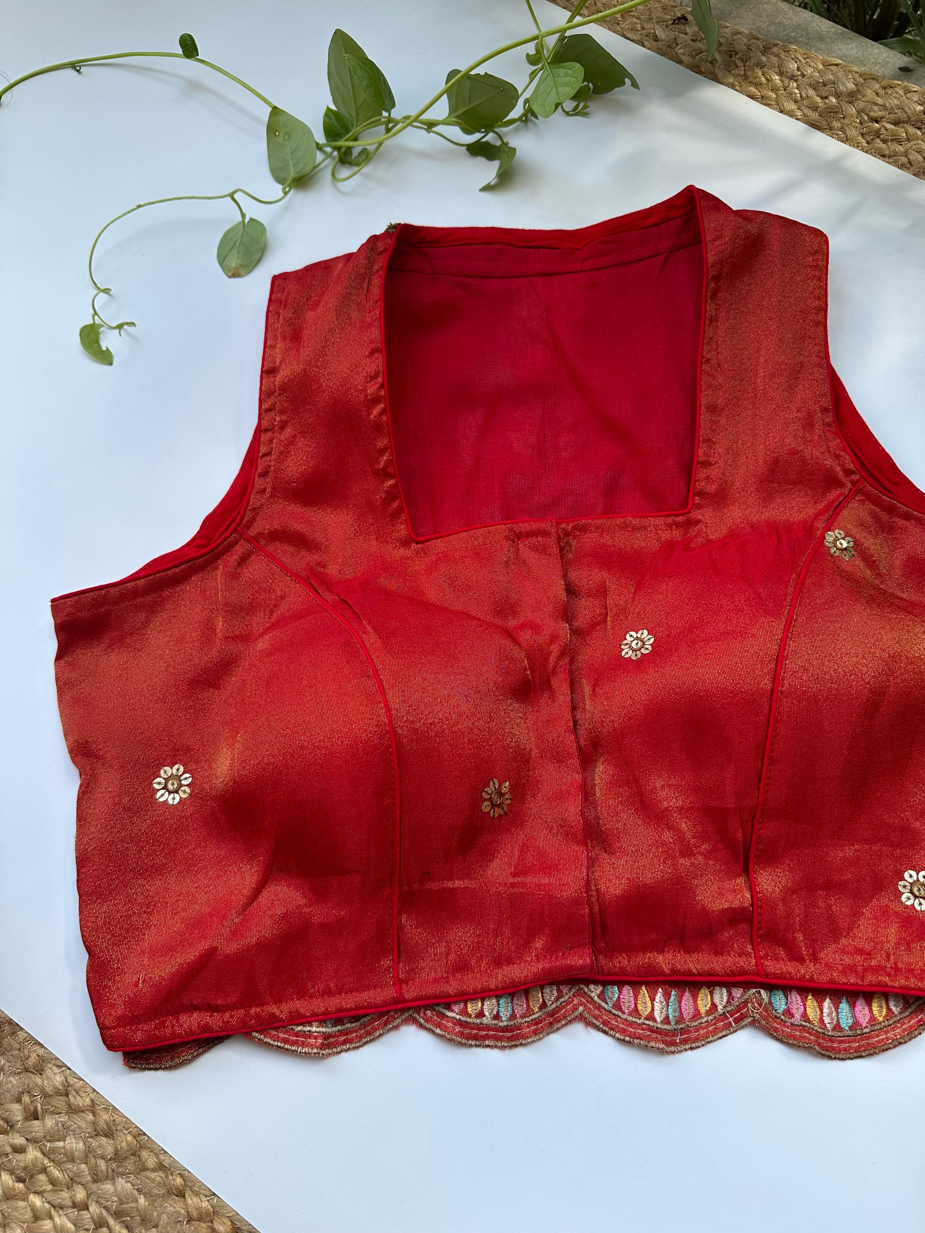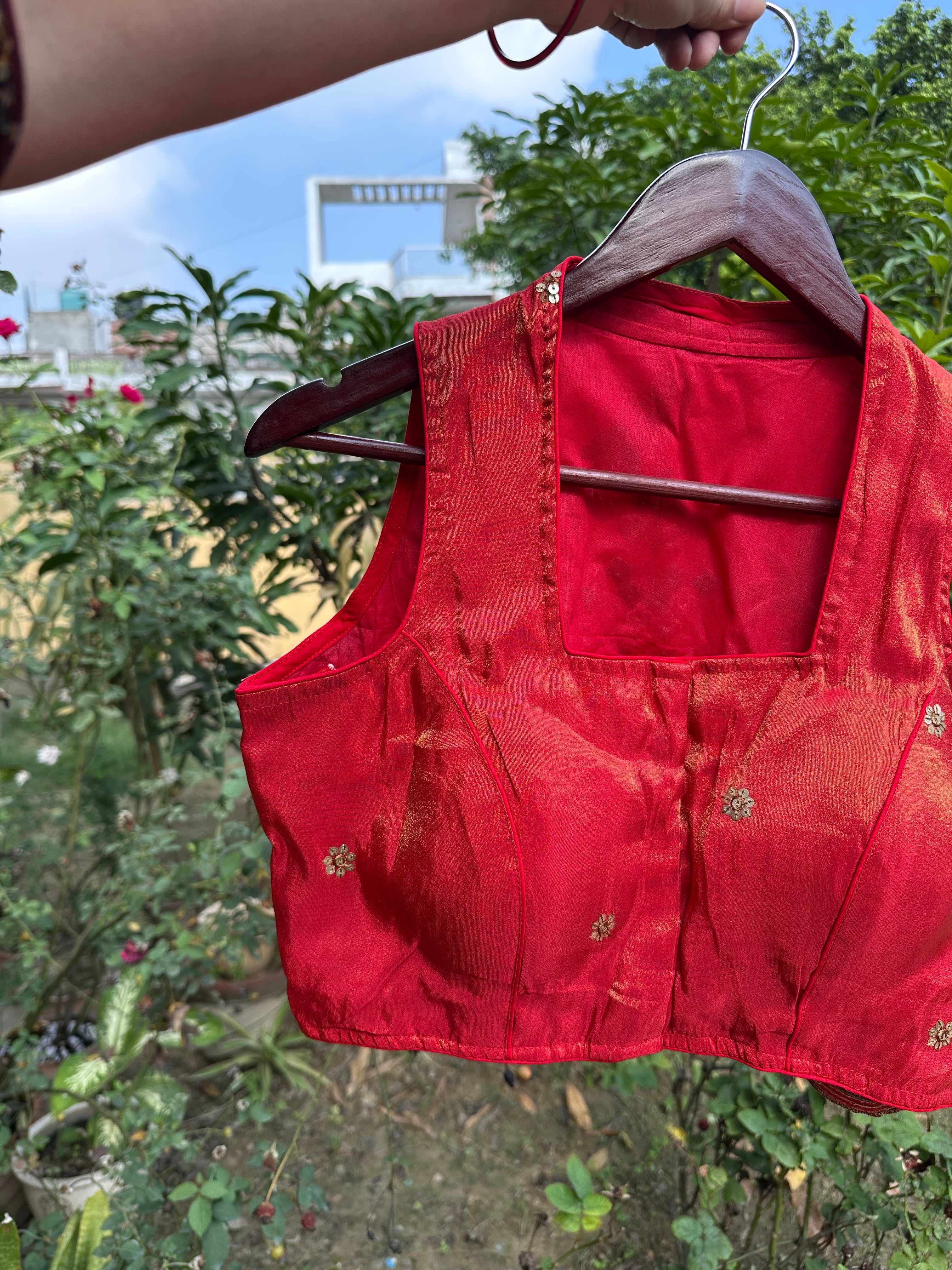 Handloom Gamcha Cotton Sleeveless Lace Work checks Blouse (Red)