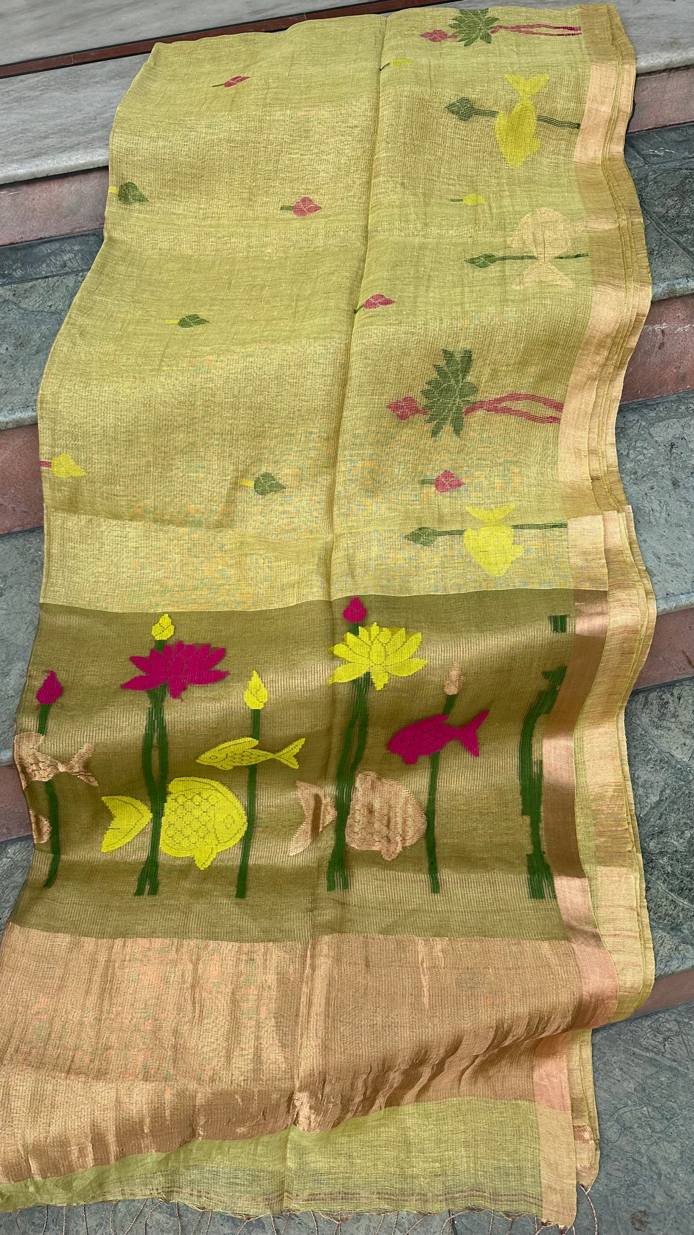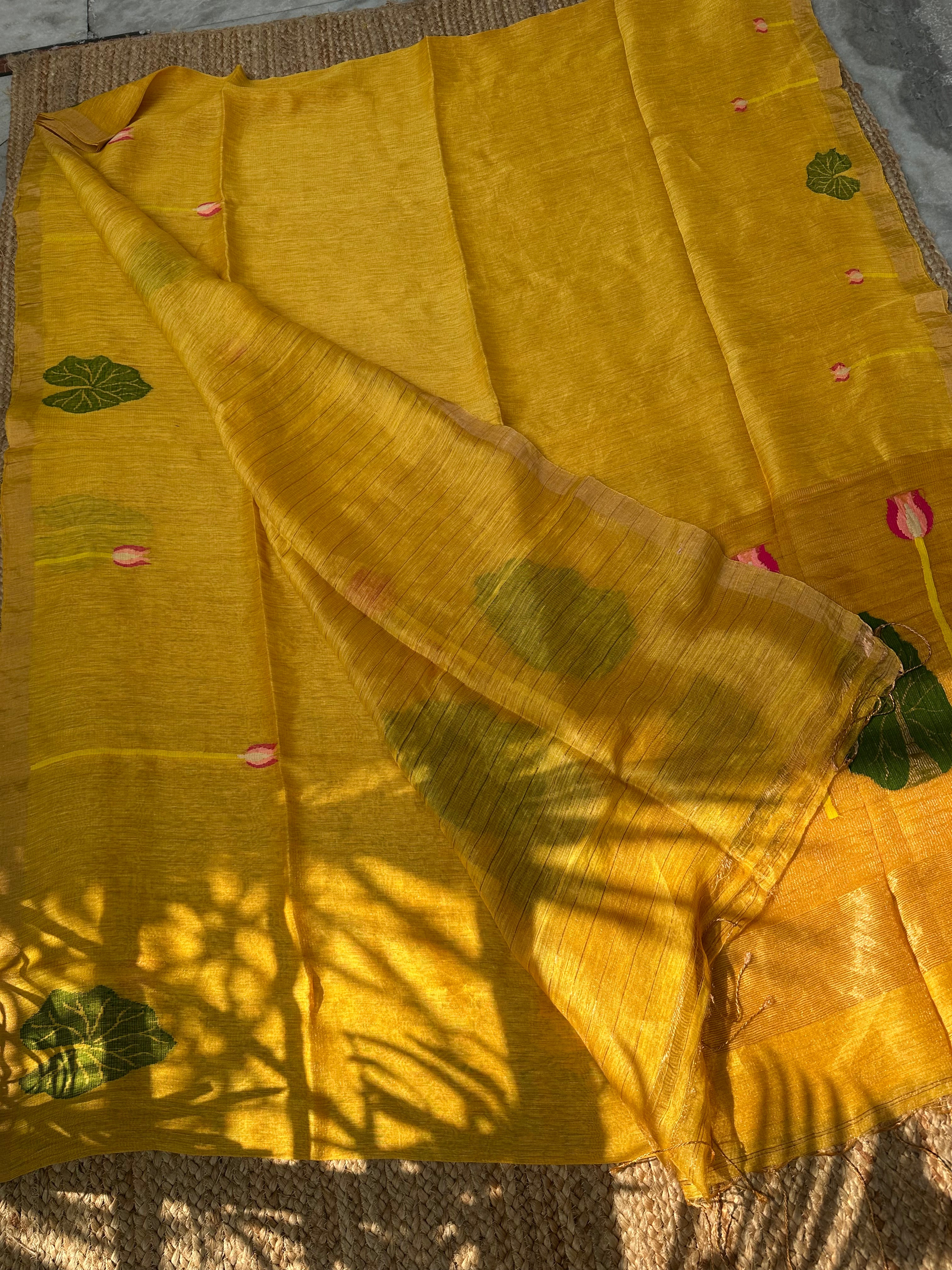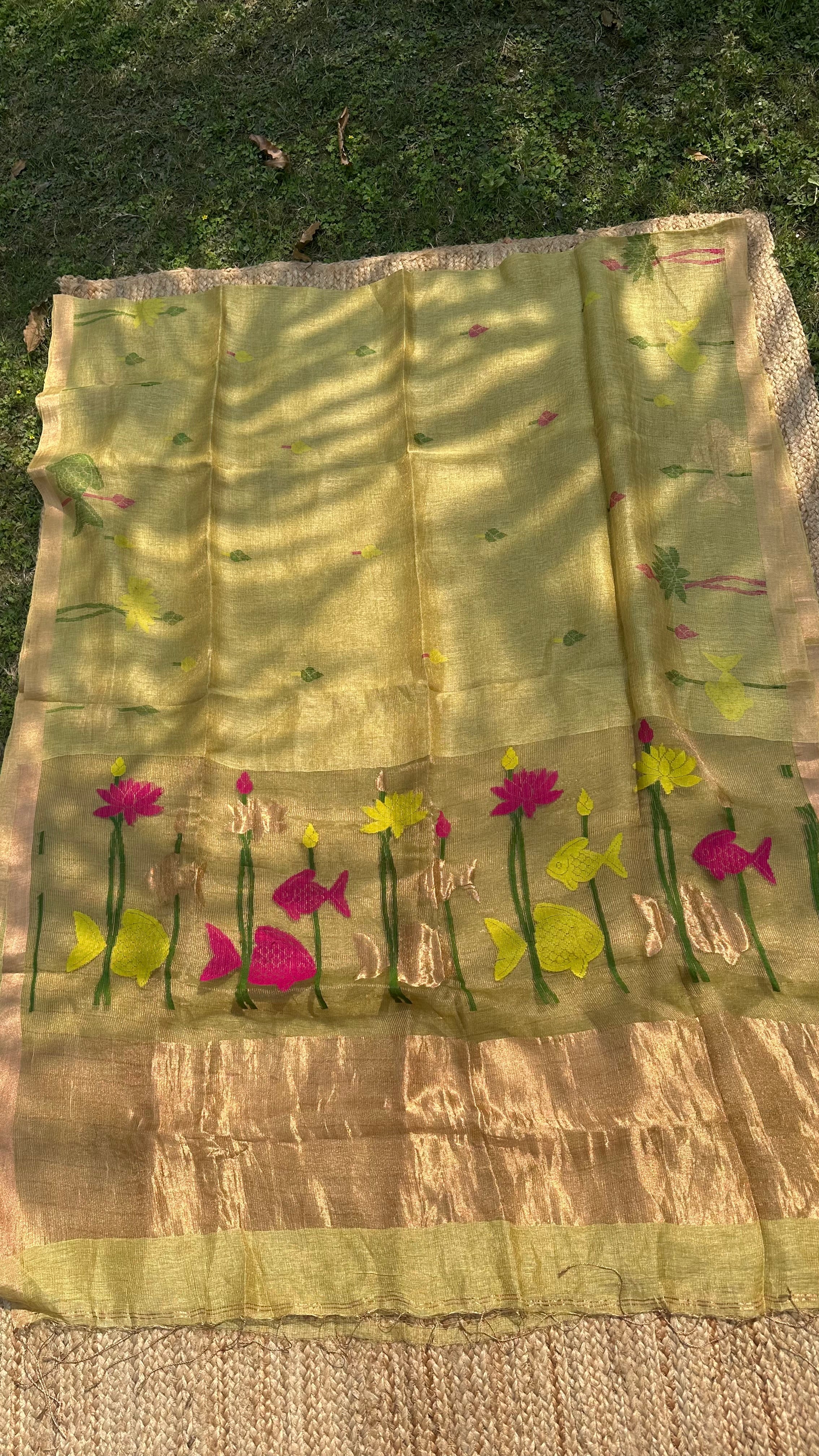 Yellow Jayshree Linen Tissue Handloom Jamdani Lotus Saree