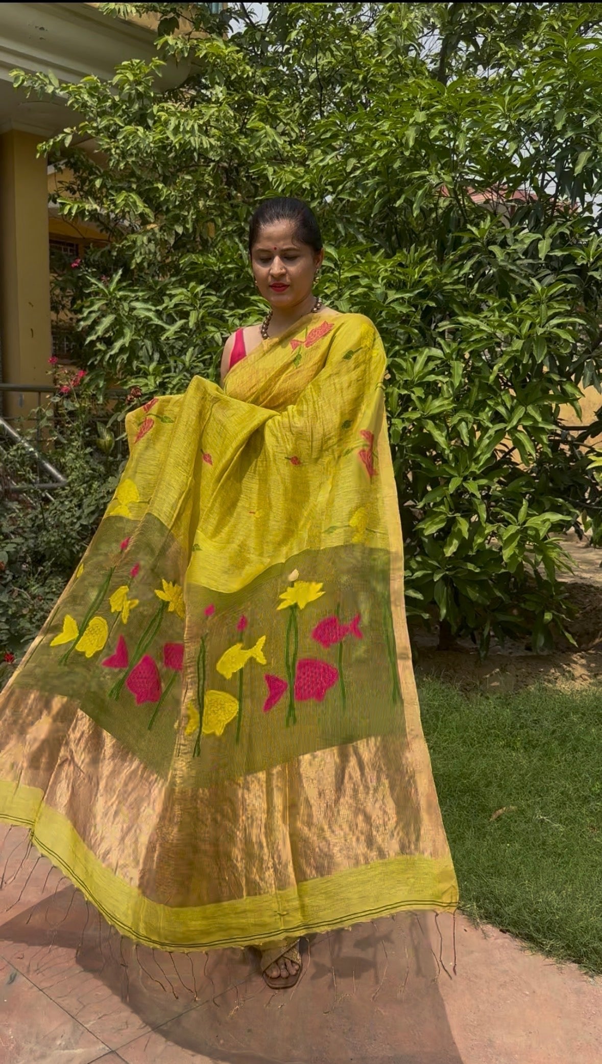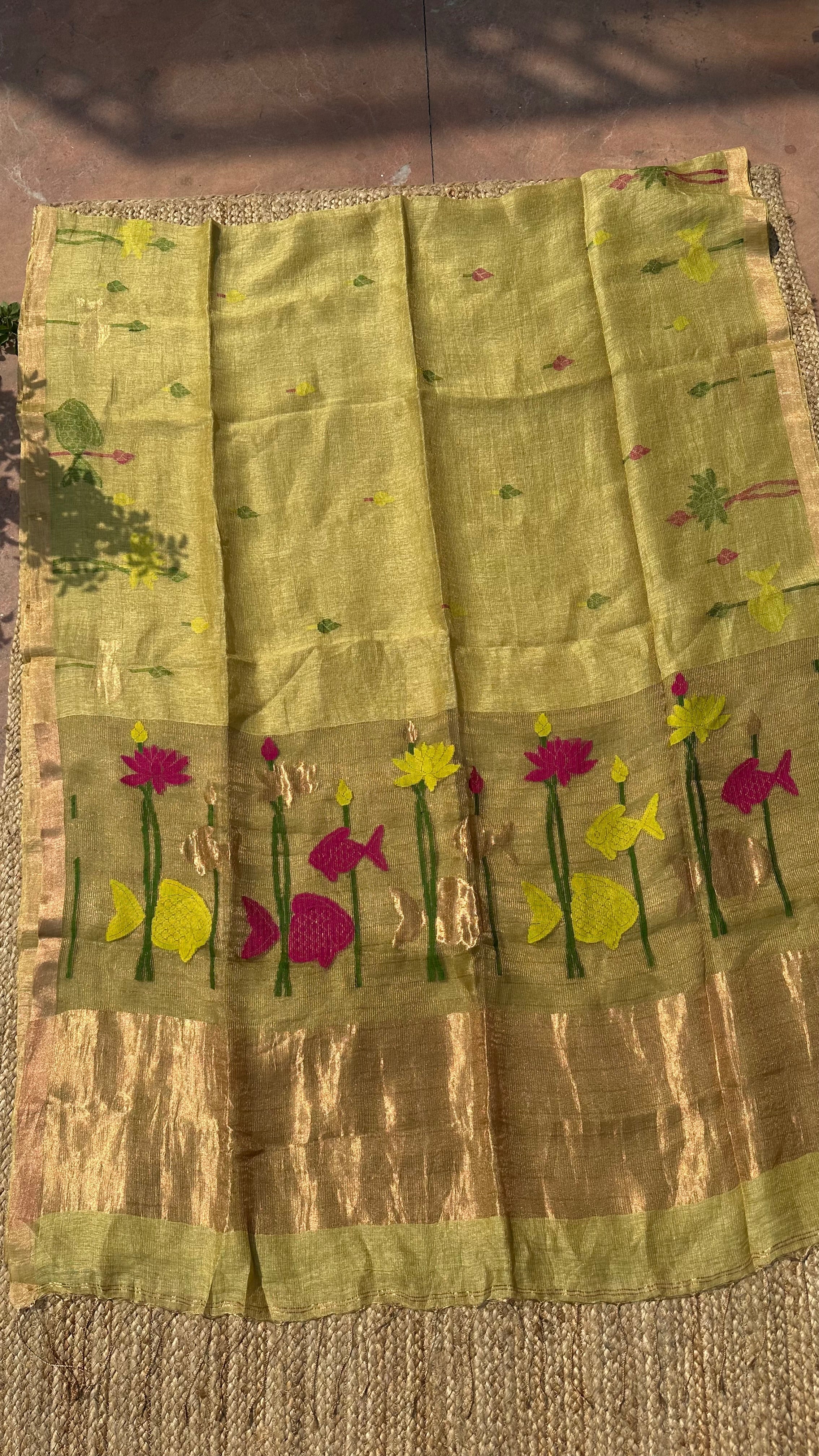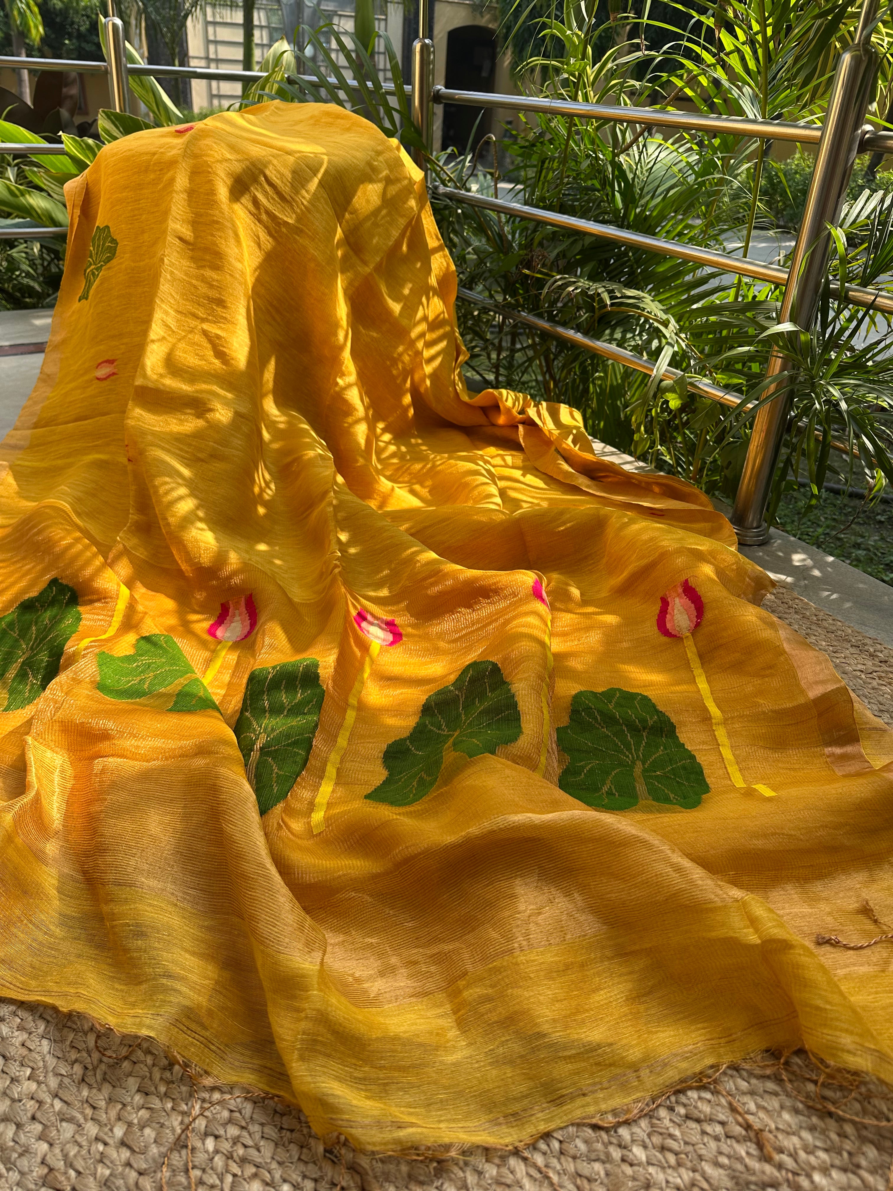 Yellow Jayshree Linen Tissue Handloom Jamdani Lotus Saree