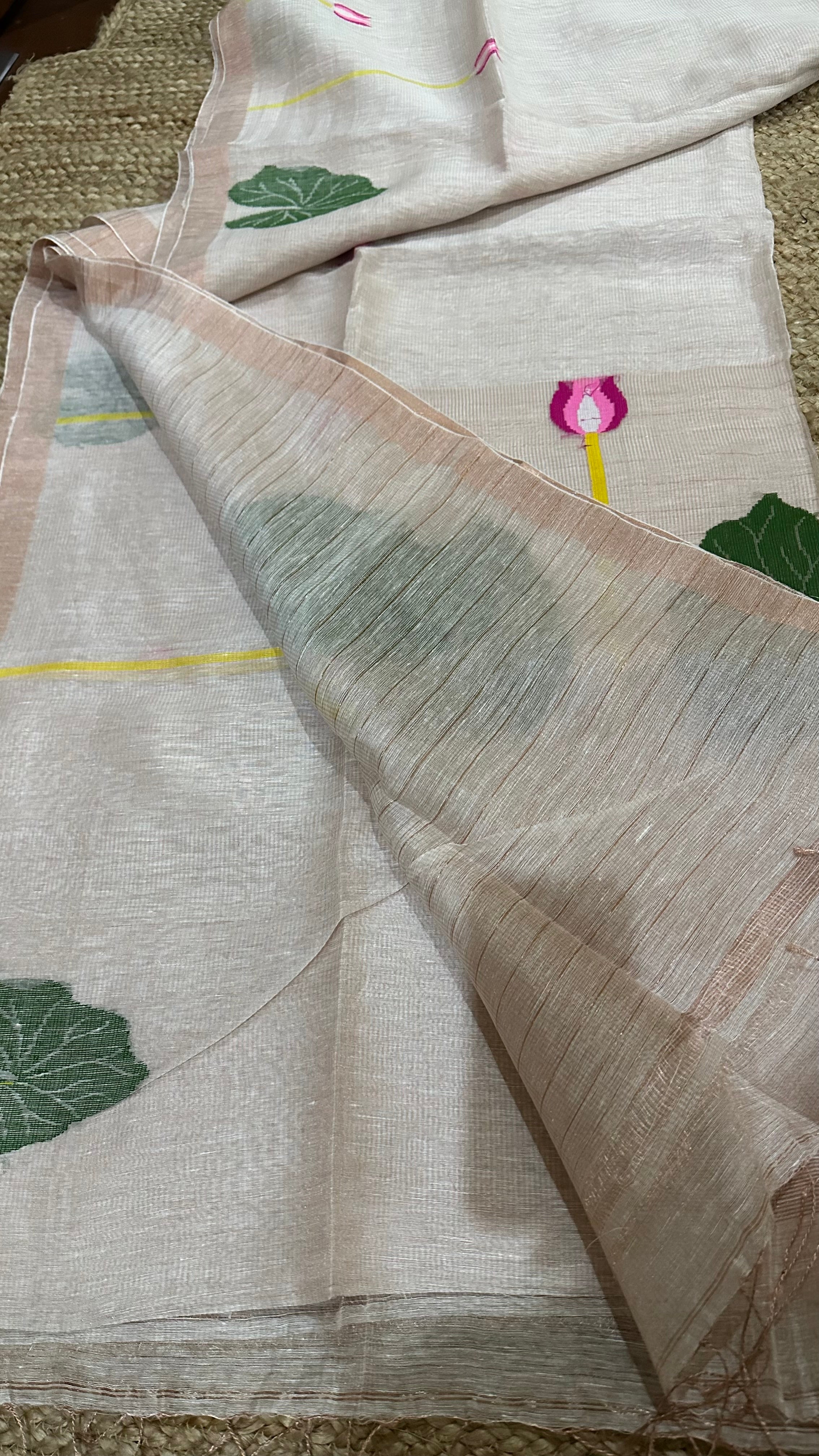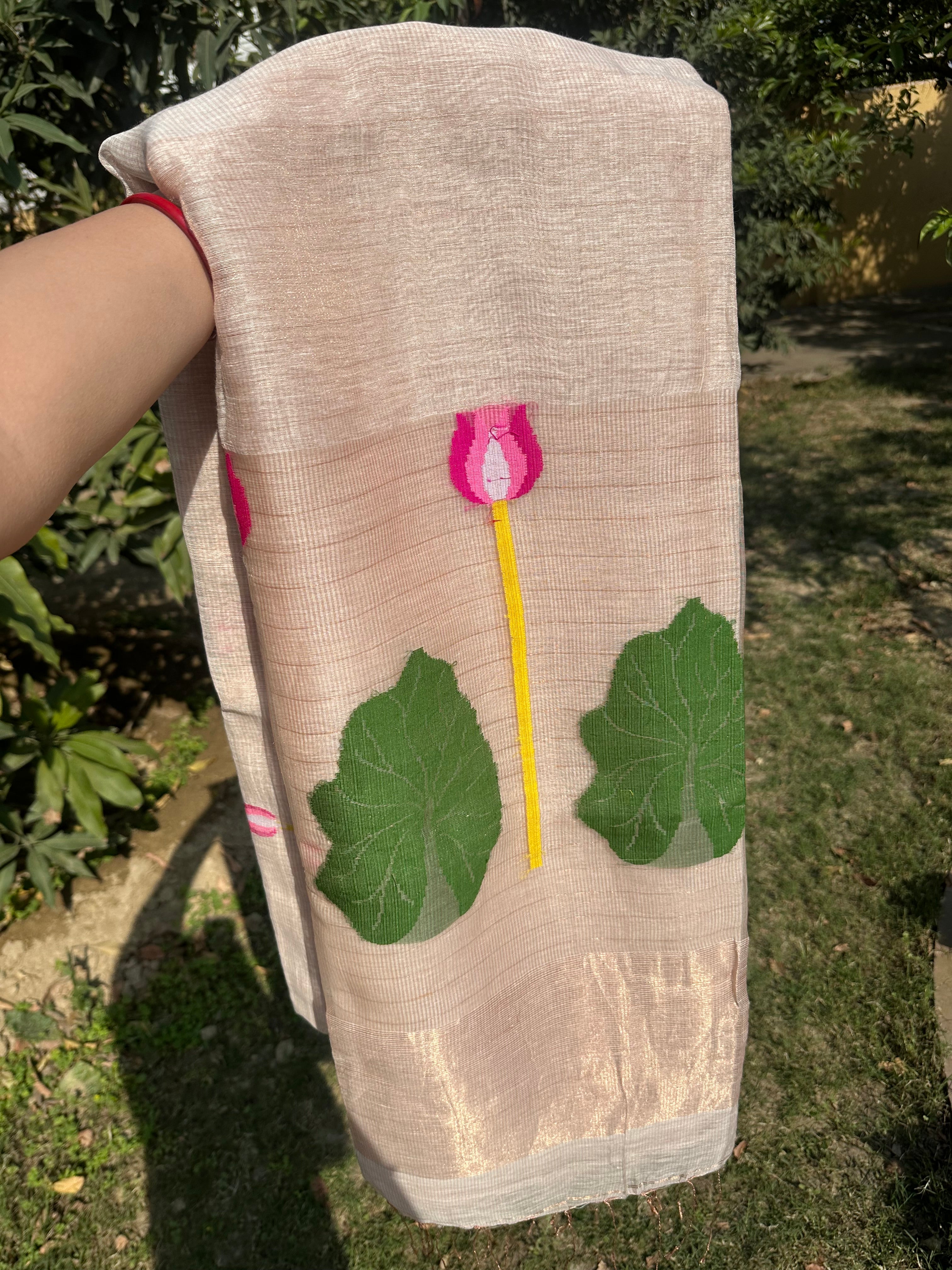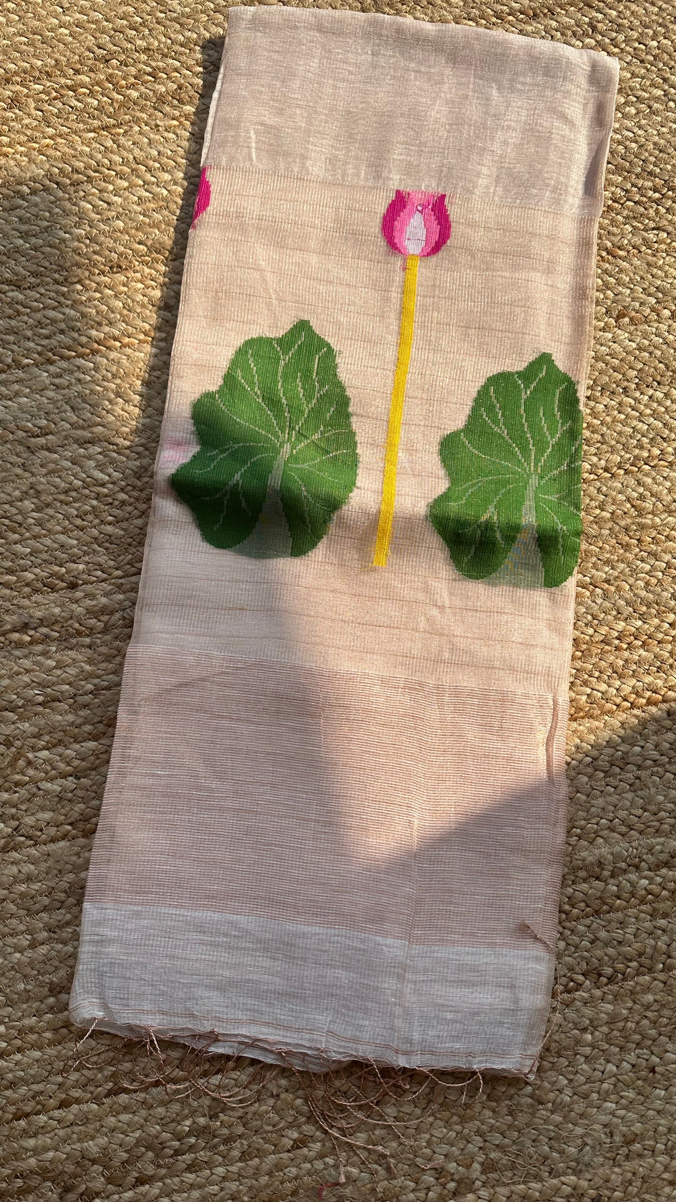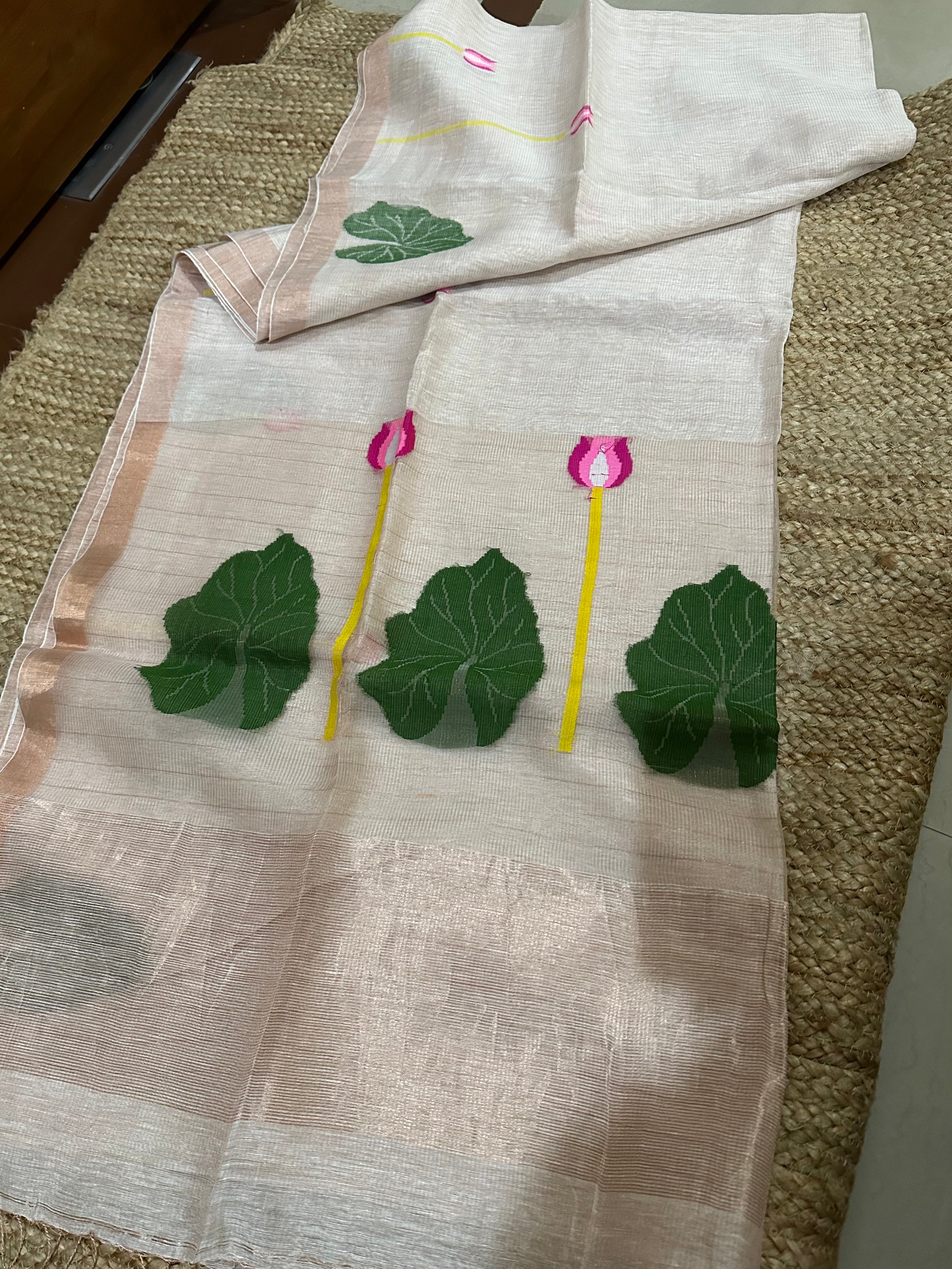 Peach Jayshree Linen Tissue Jamdani Lotus Handloom Saree