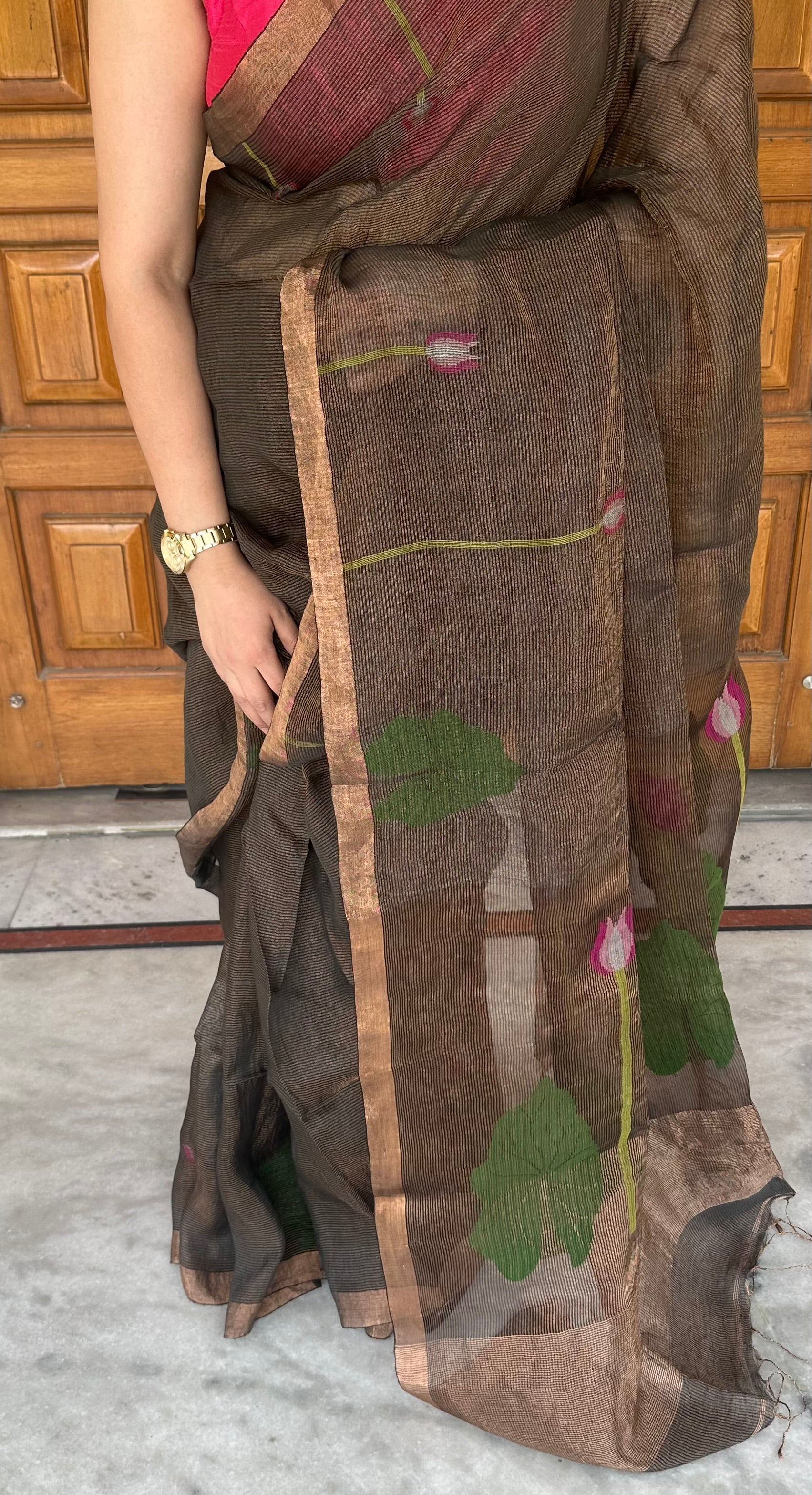 Brown Zari Linen Handloom Saree