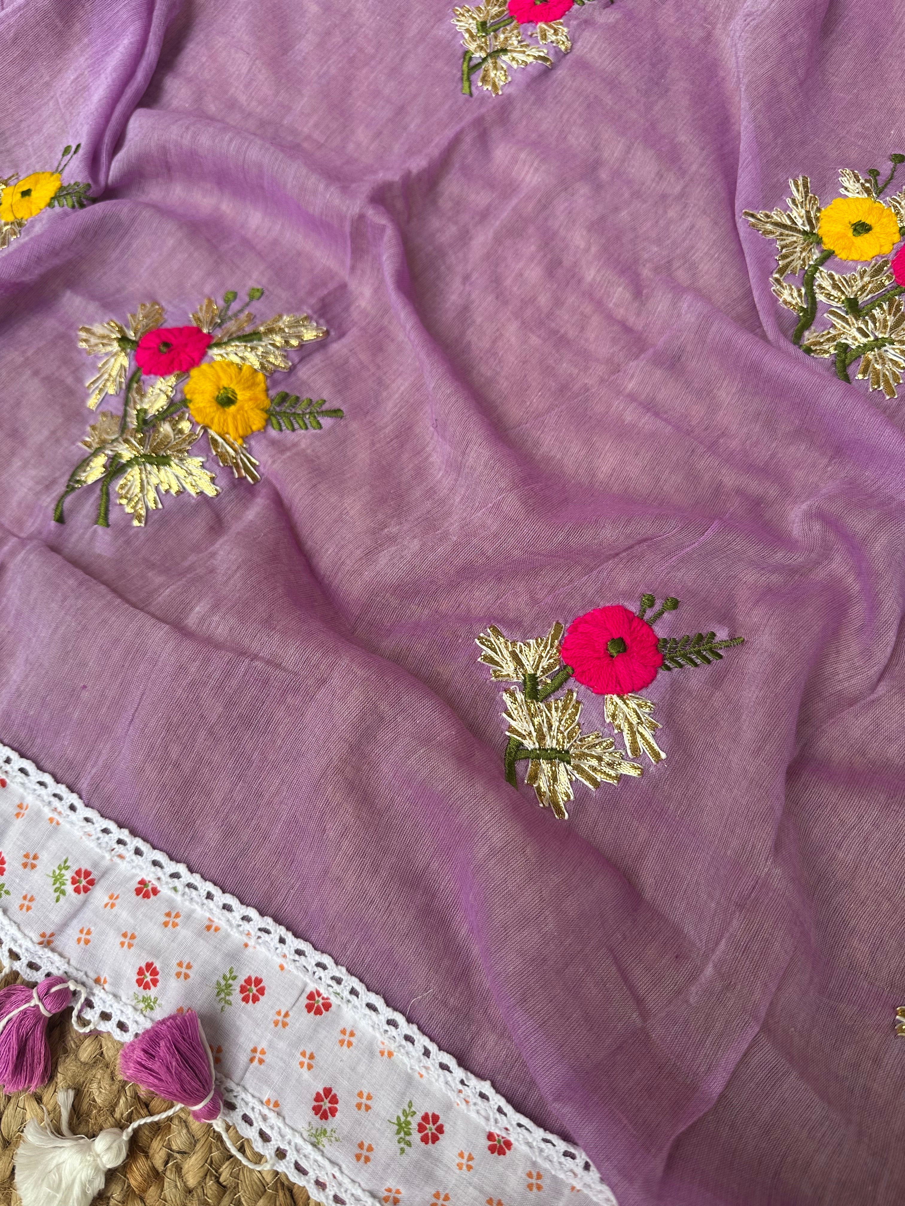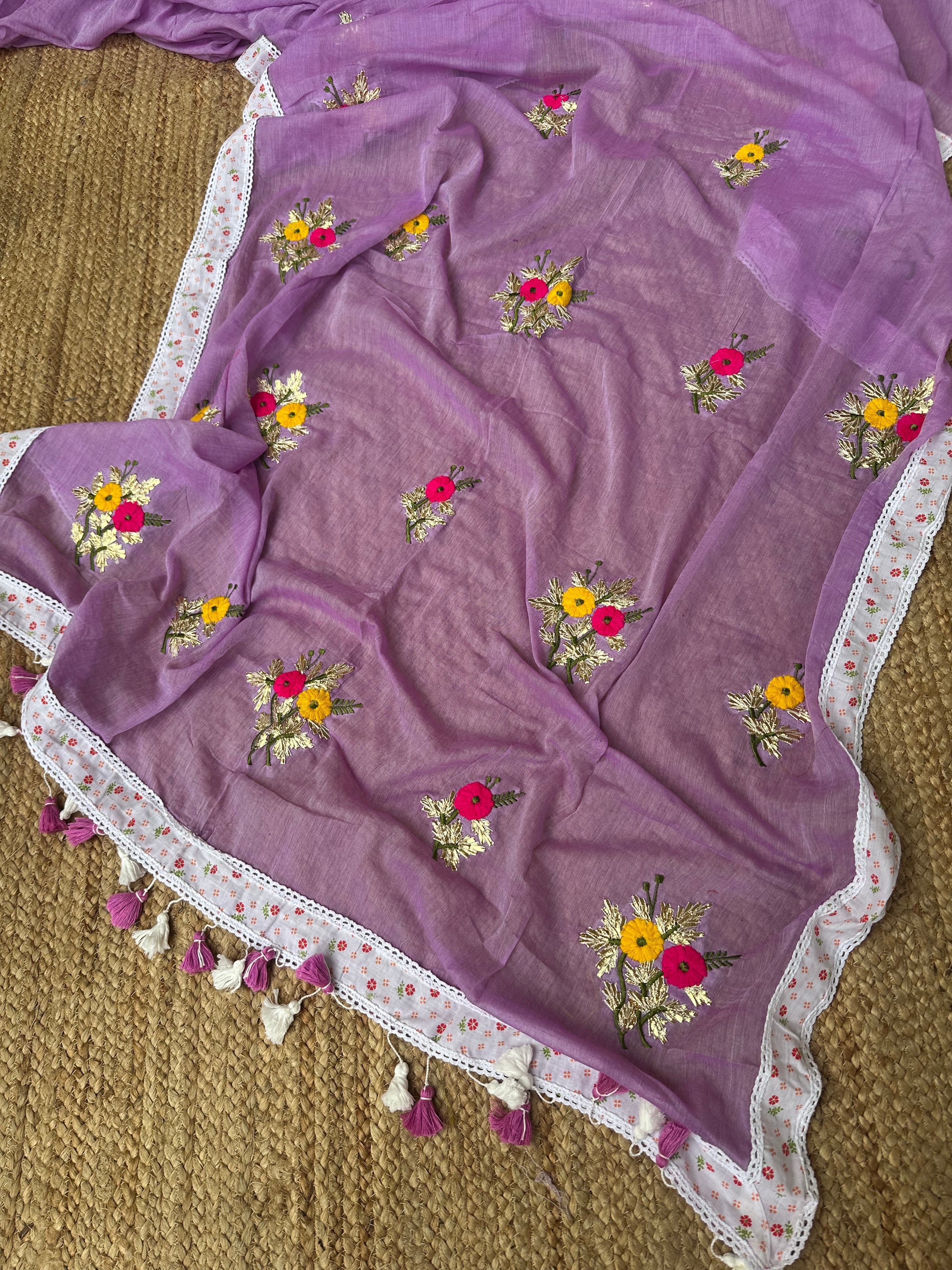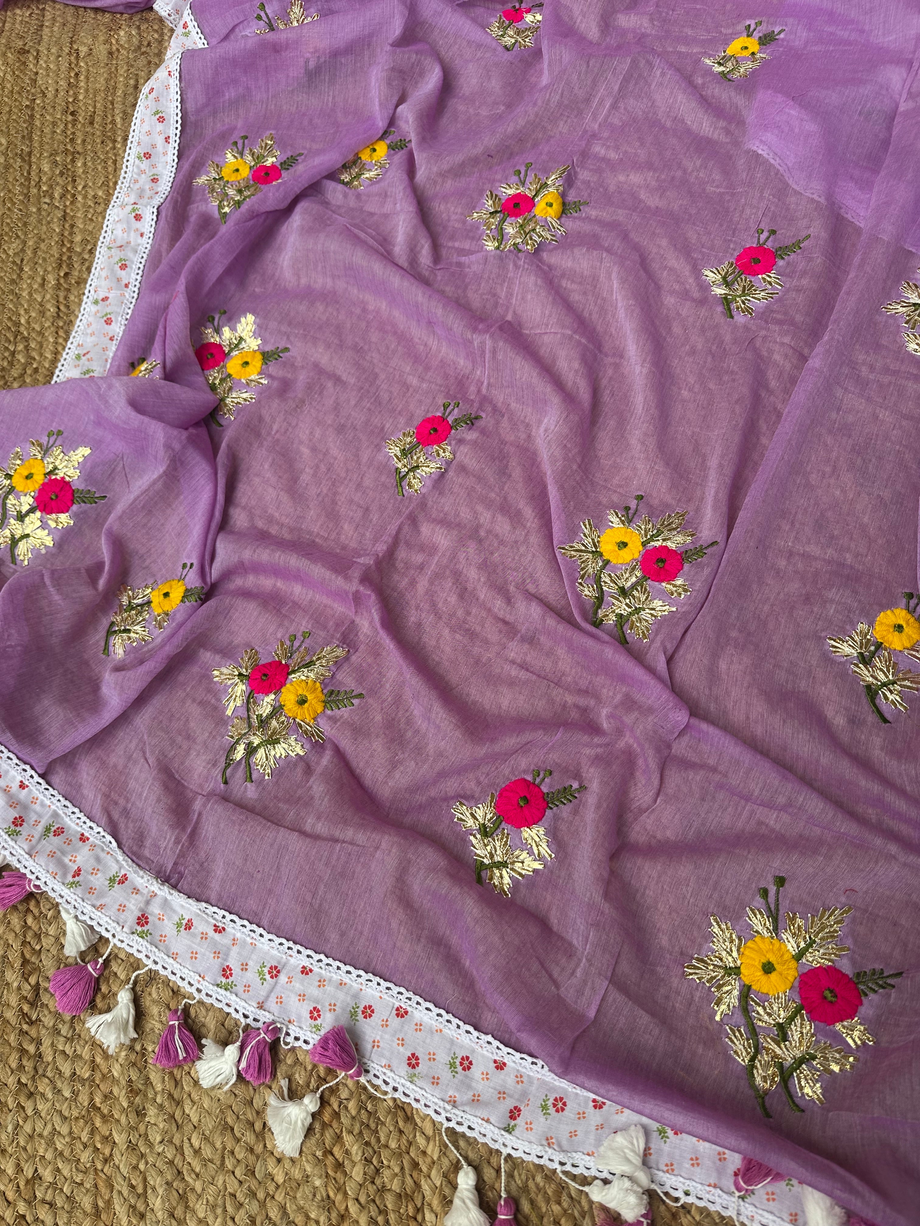 Purple Mul Cotton Gota Patti Embroidered Lacework Saree
