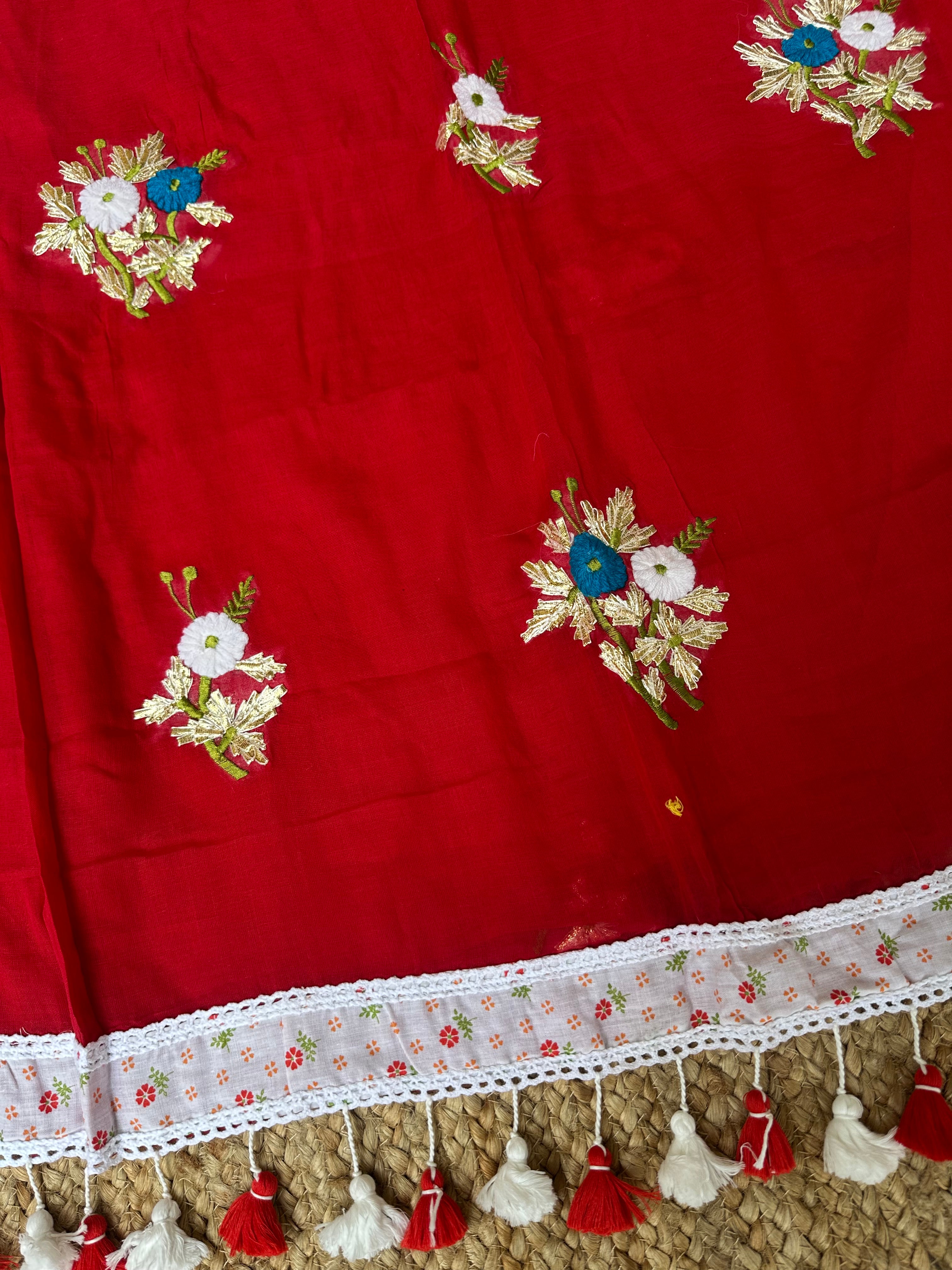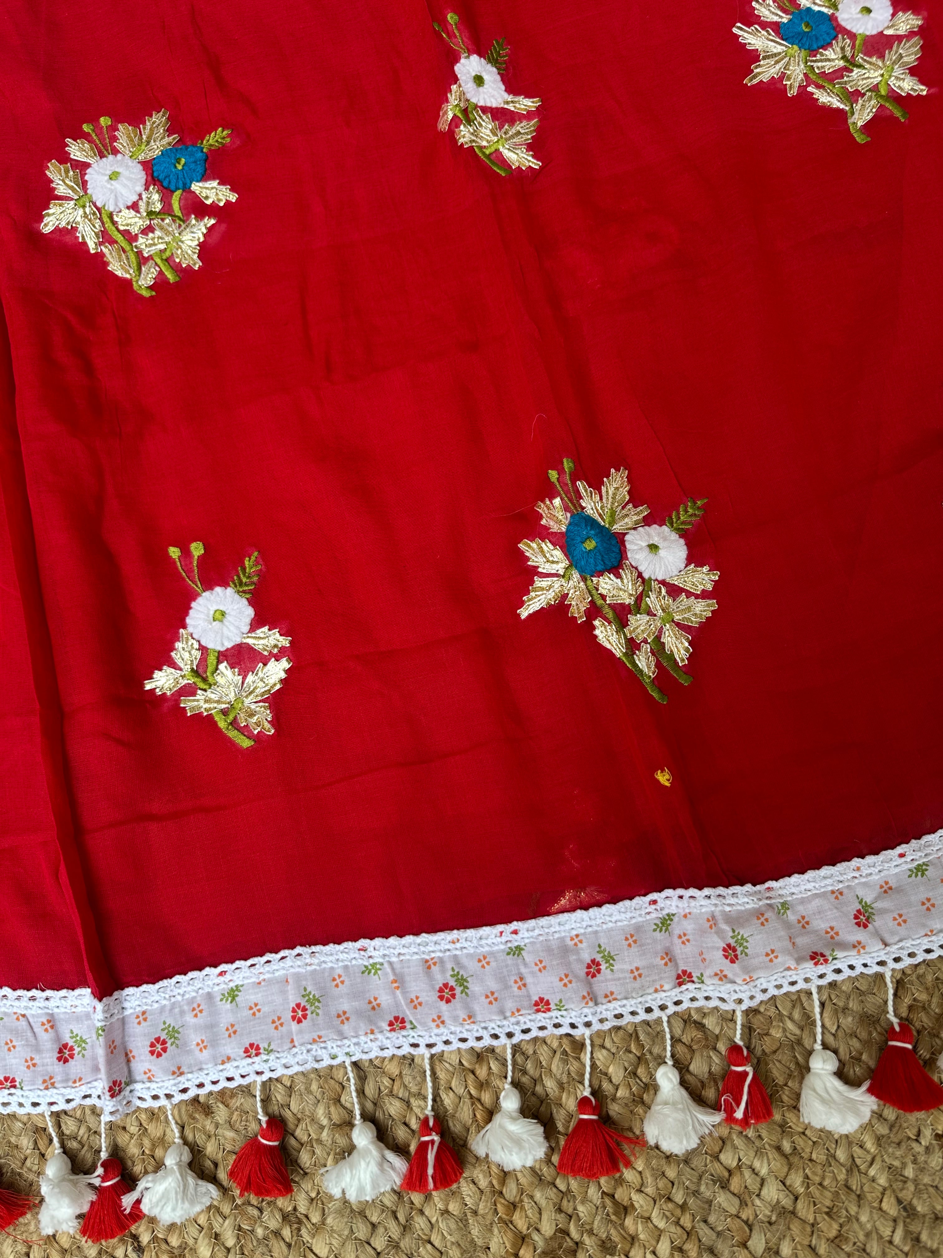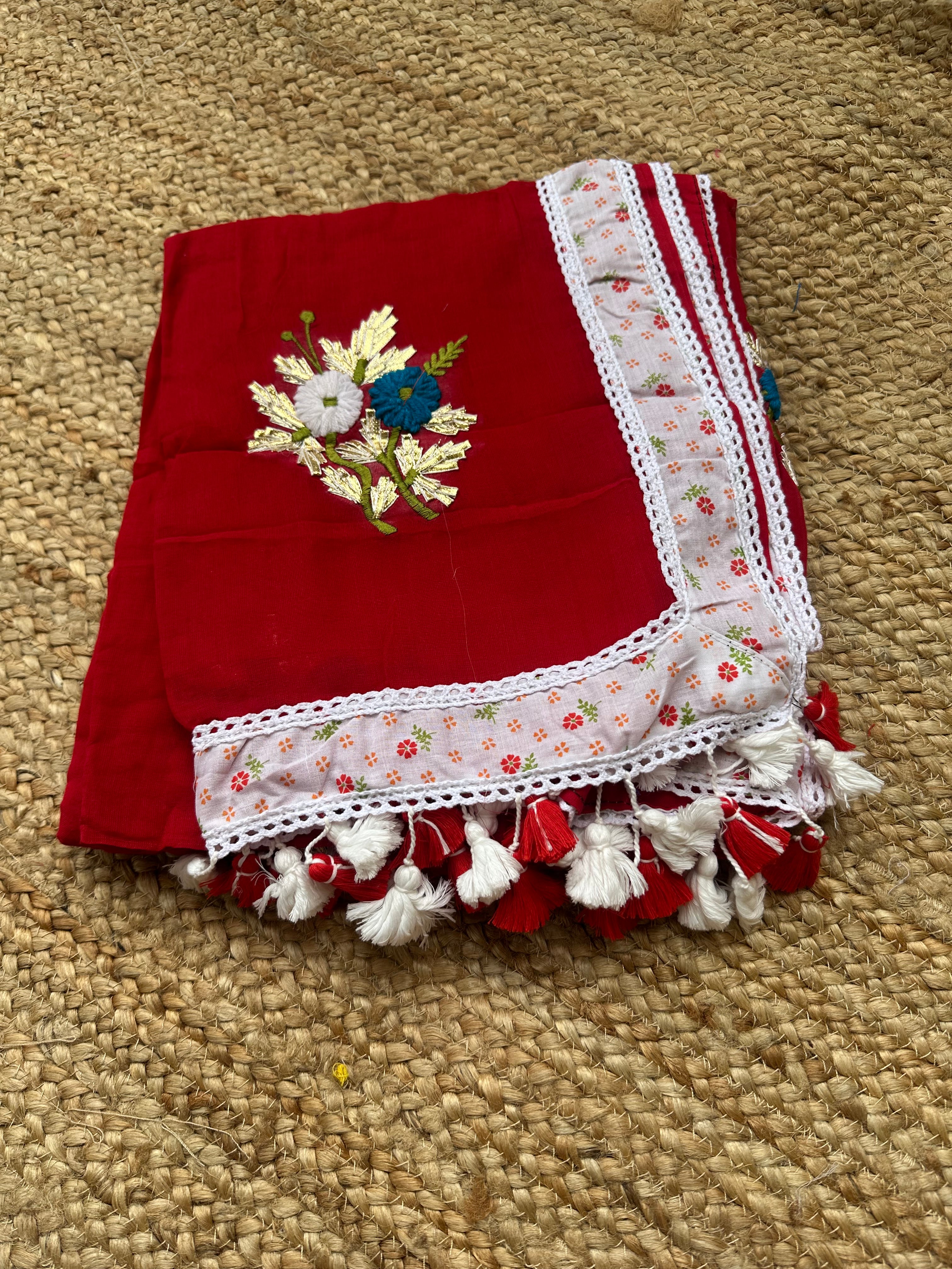 Red Mul Cotton Gota Patti Embroidered Lacework Saree