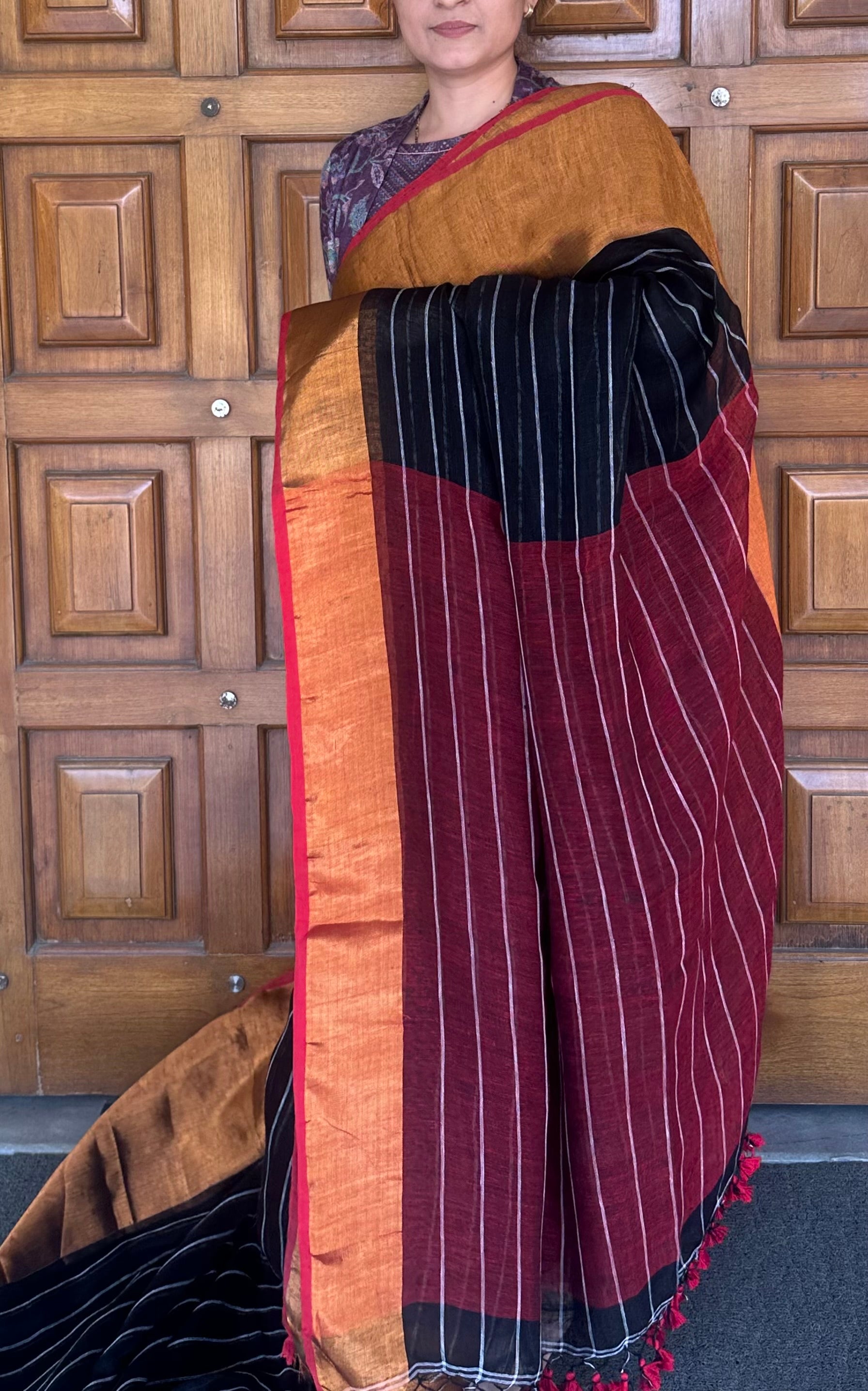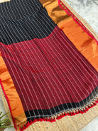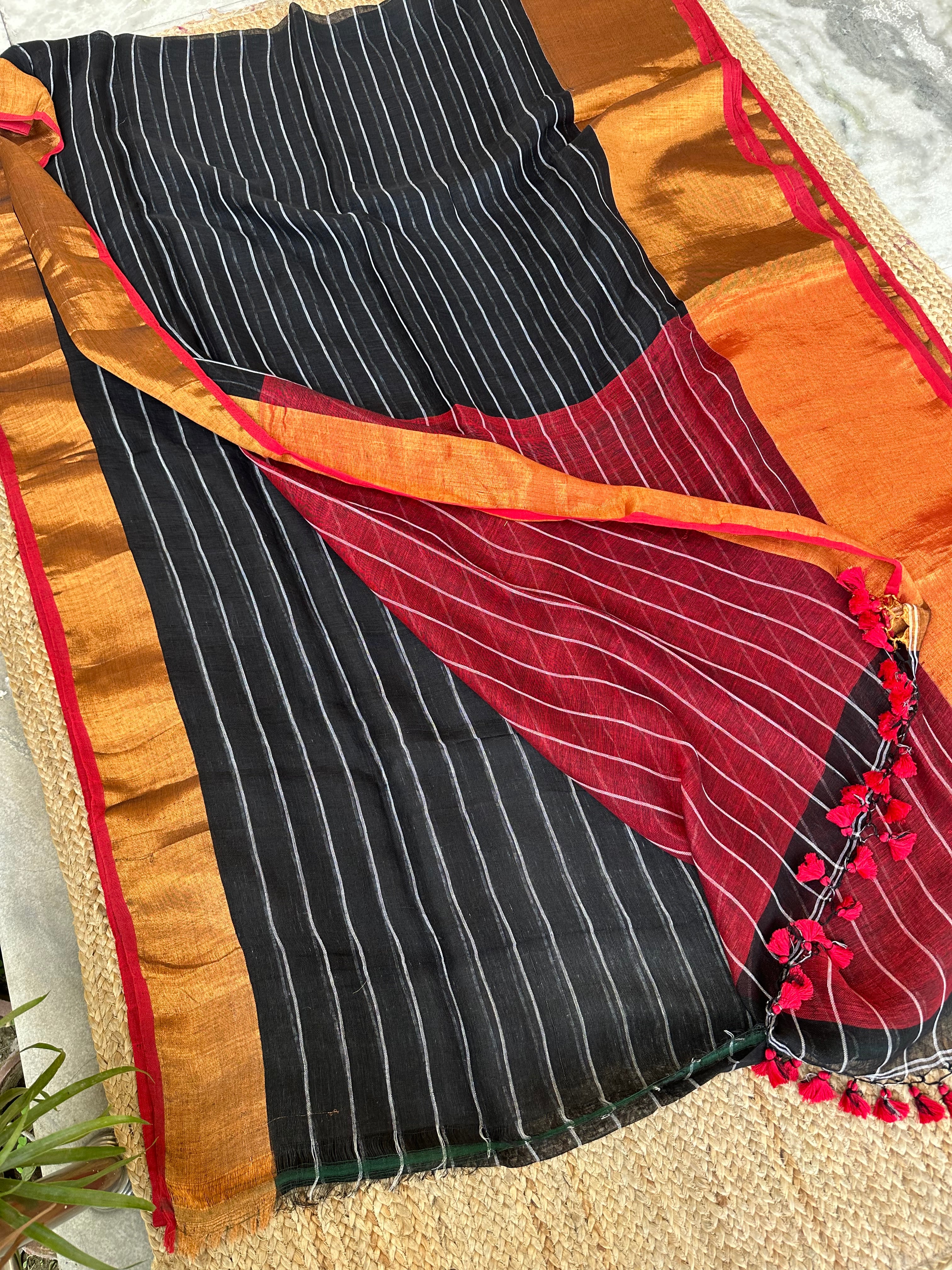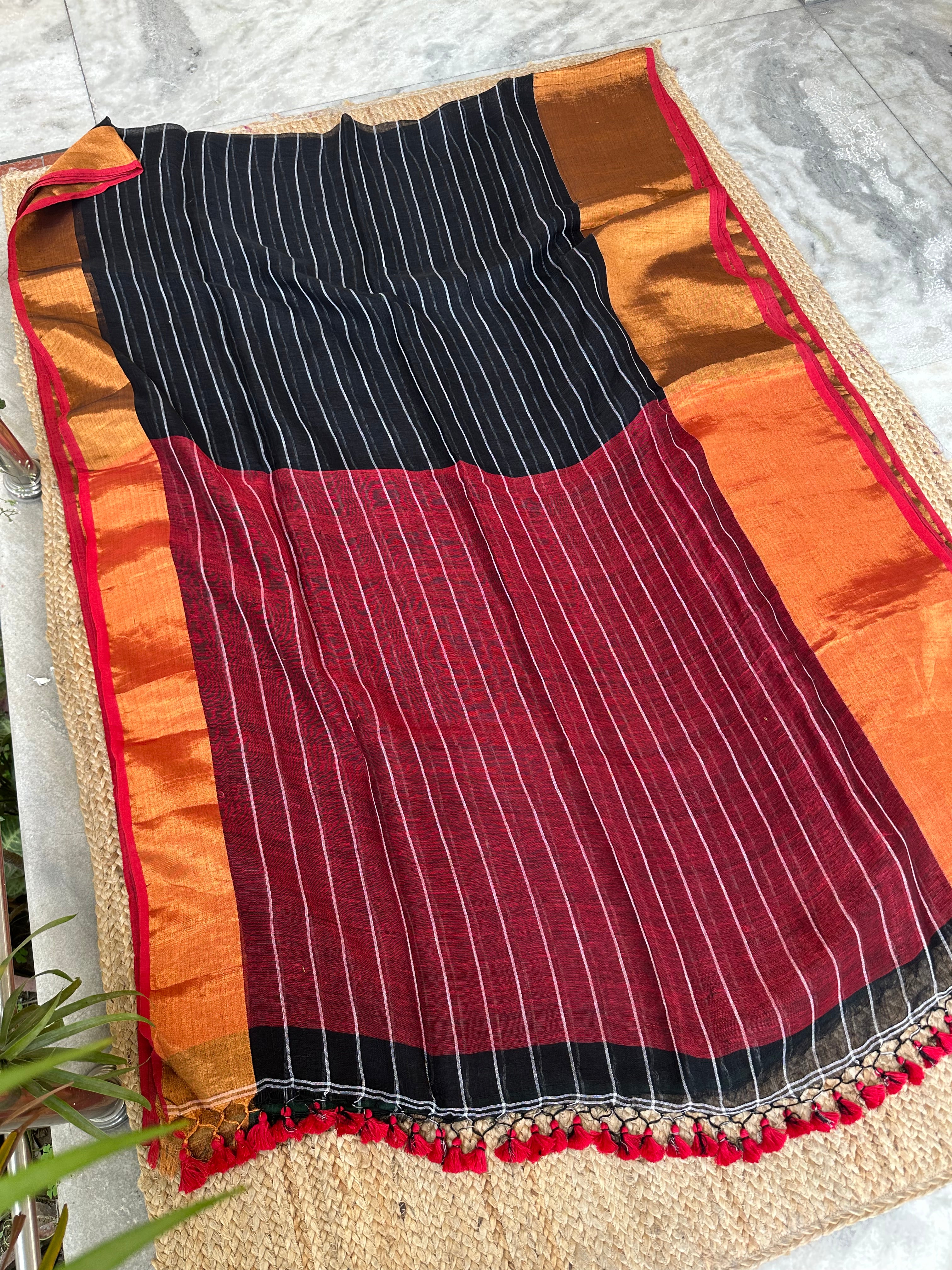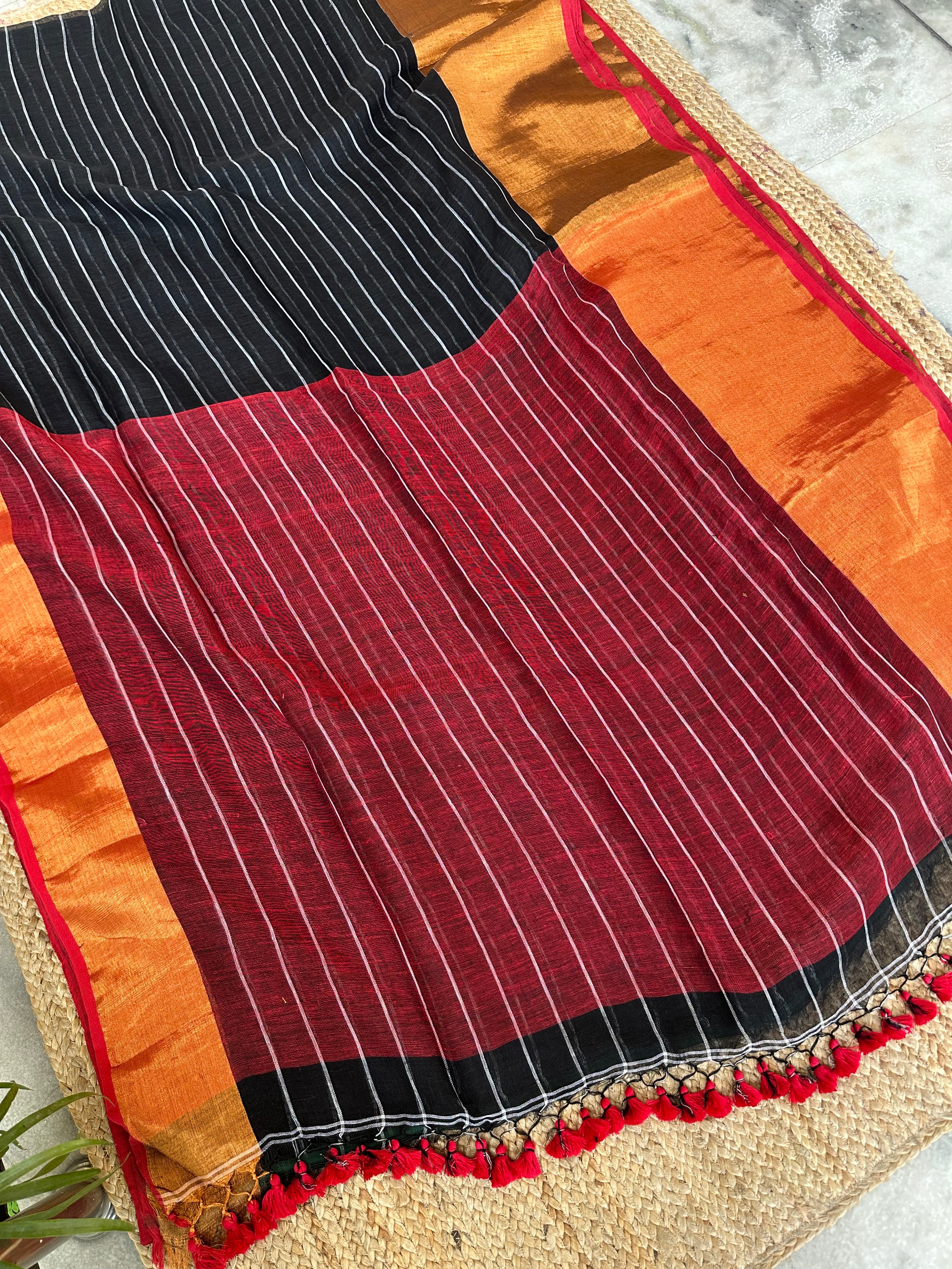 Black Maroon Striped Linen Handloom Saree