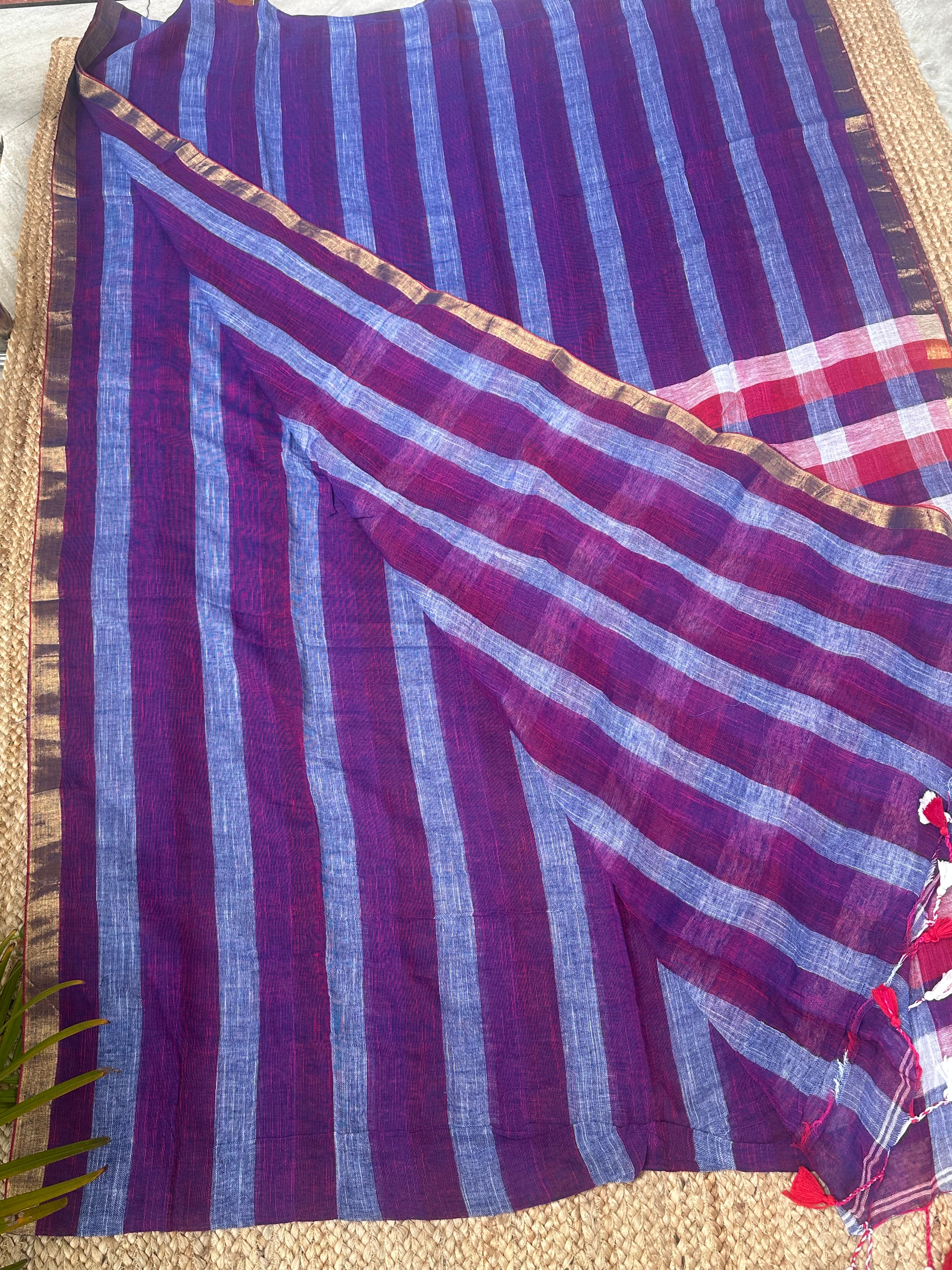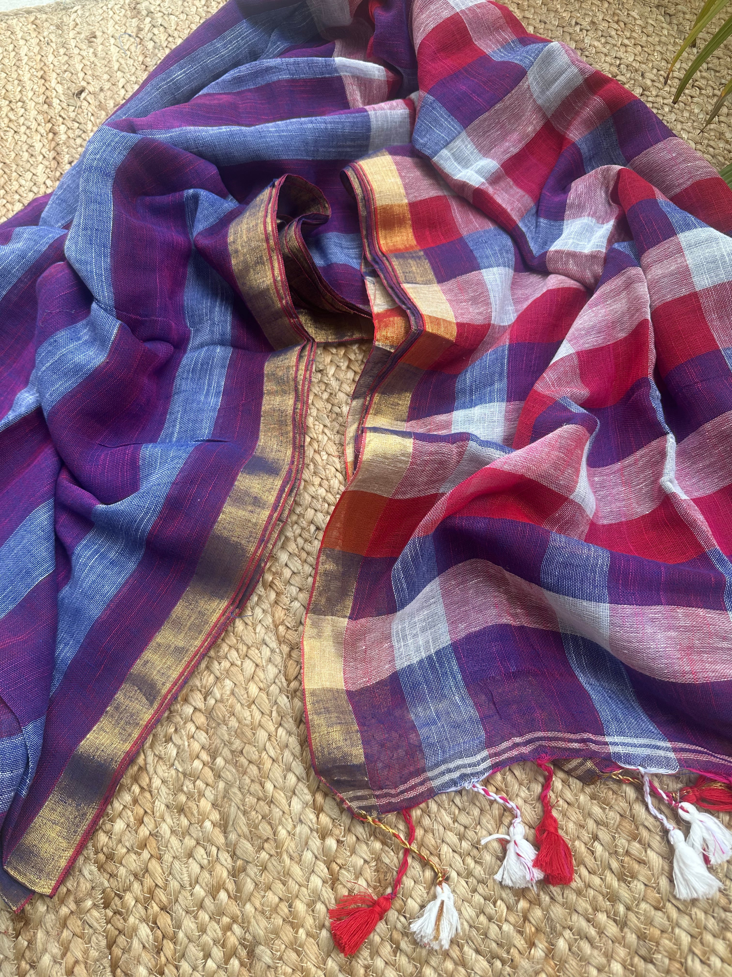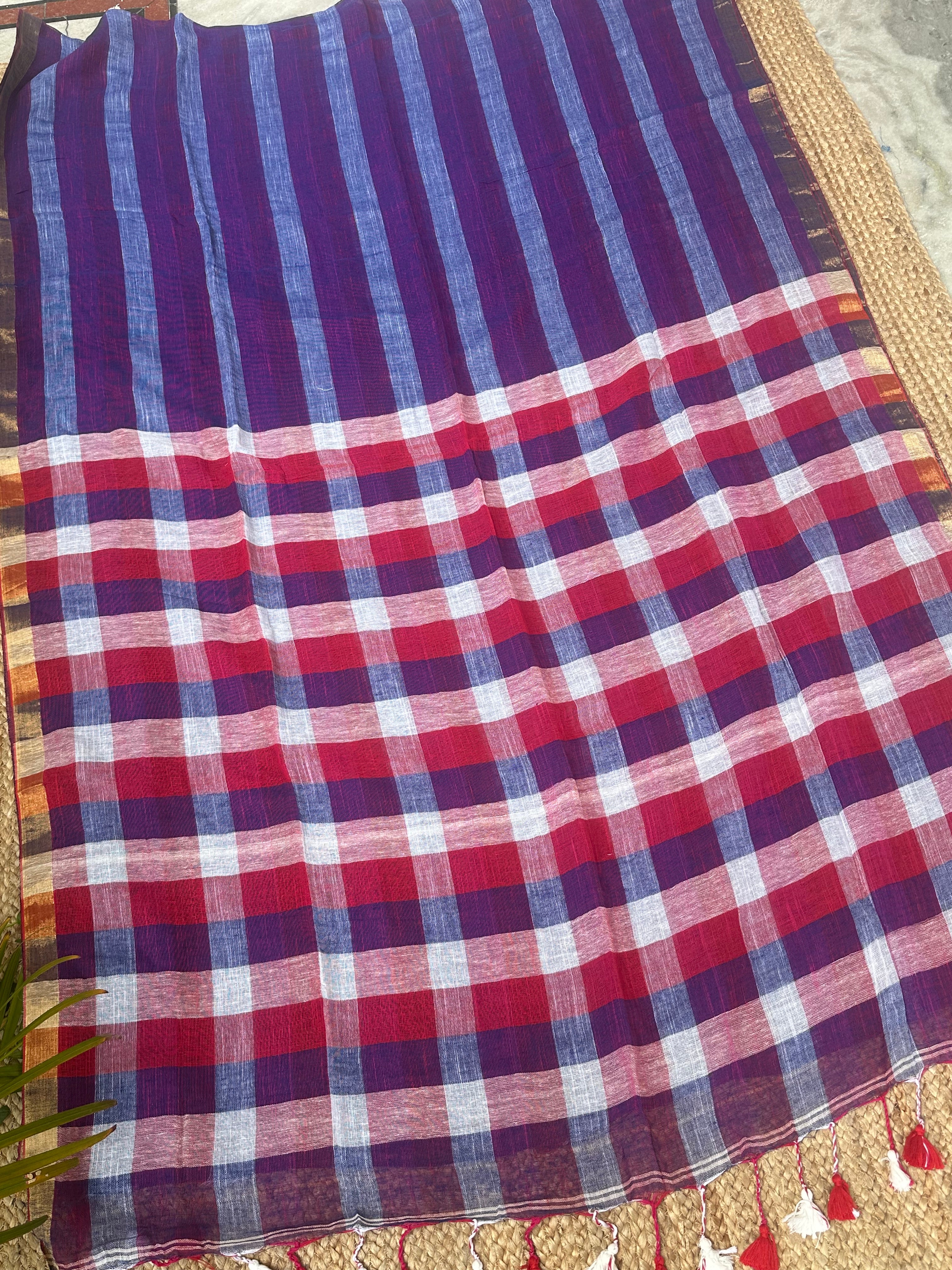 Blue Red Striped Checks Linen Cotton Handloom Saree