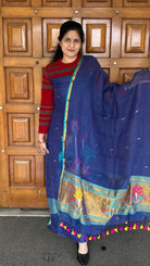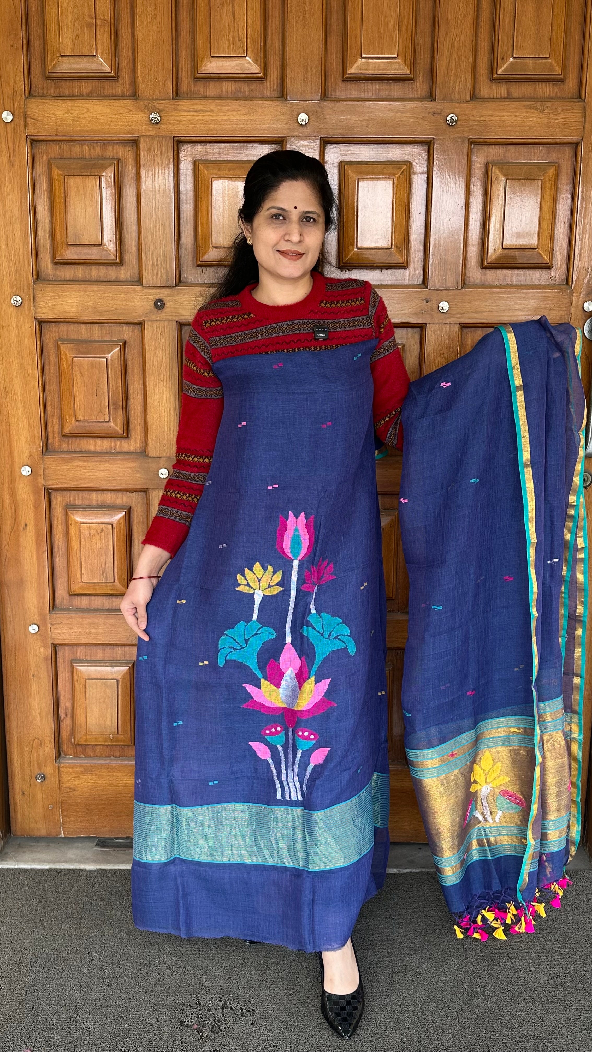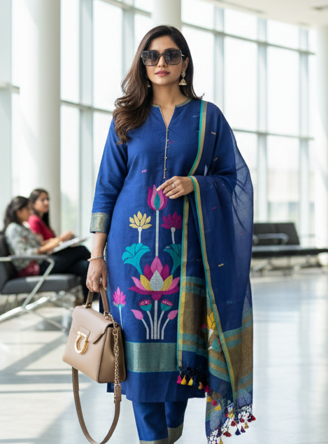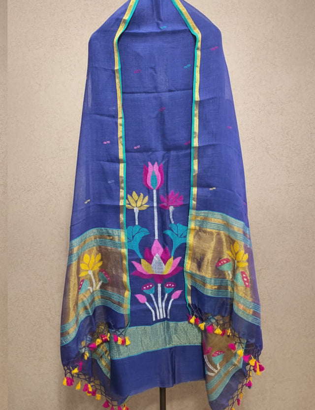 Ink Blue Linen Handloom Jamdani Zari Kurta Dupatta Set