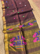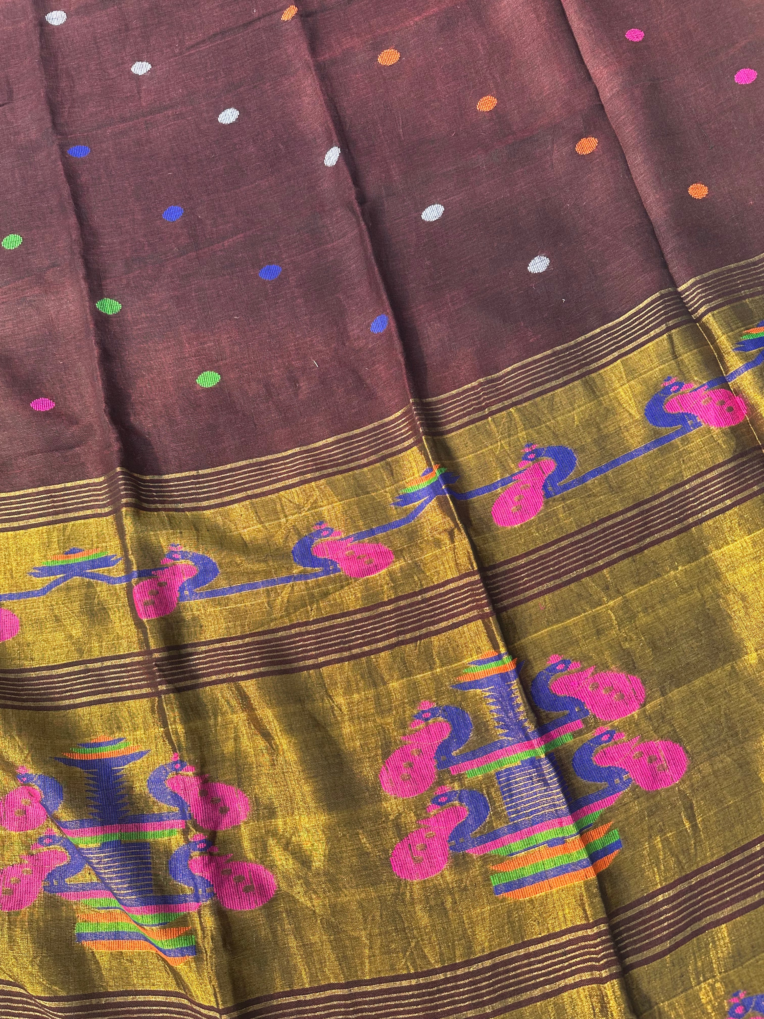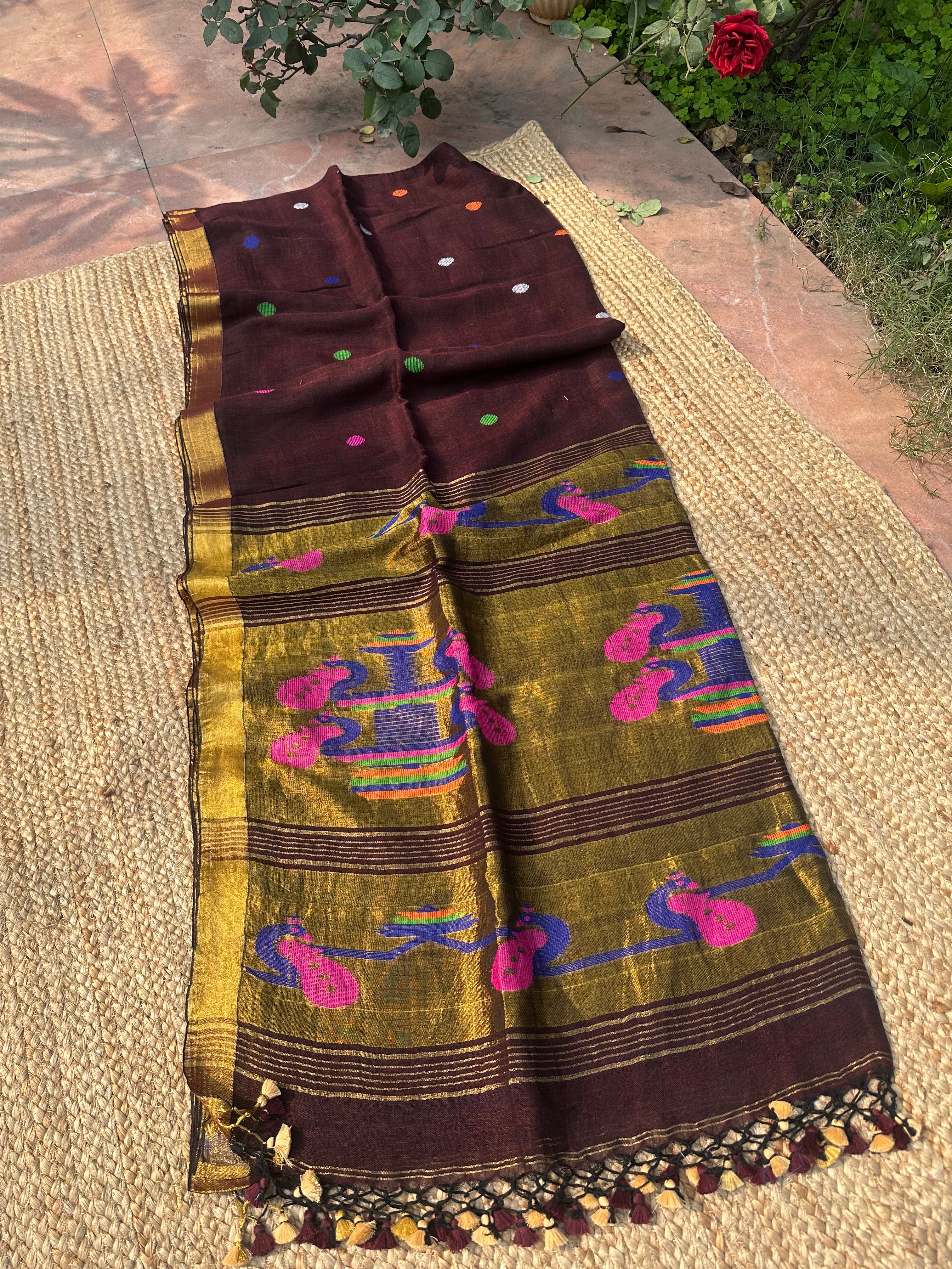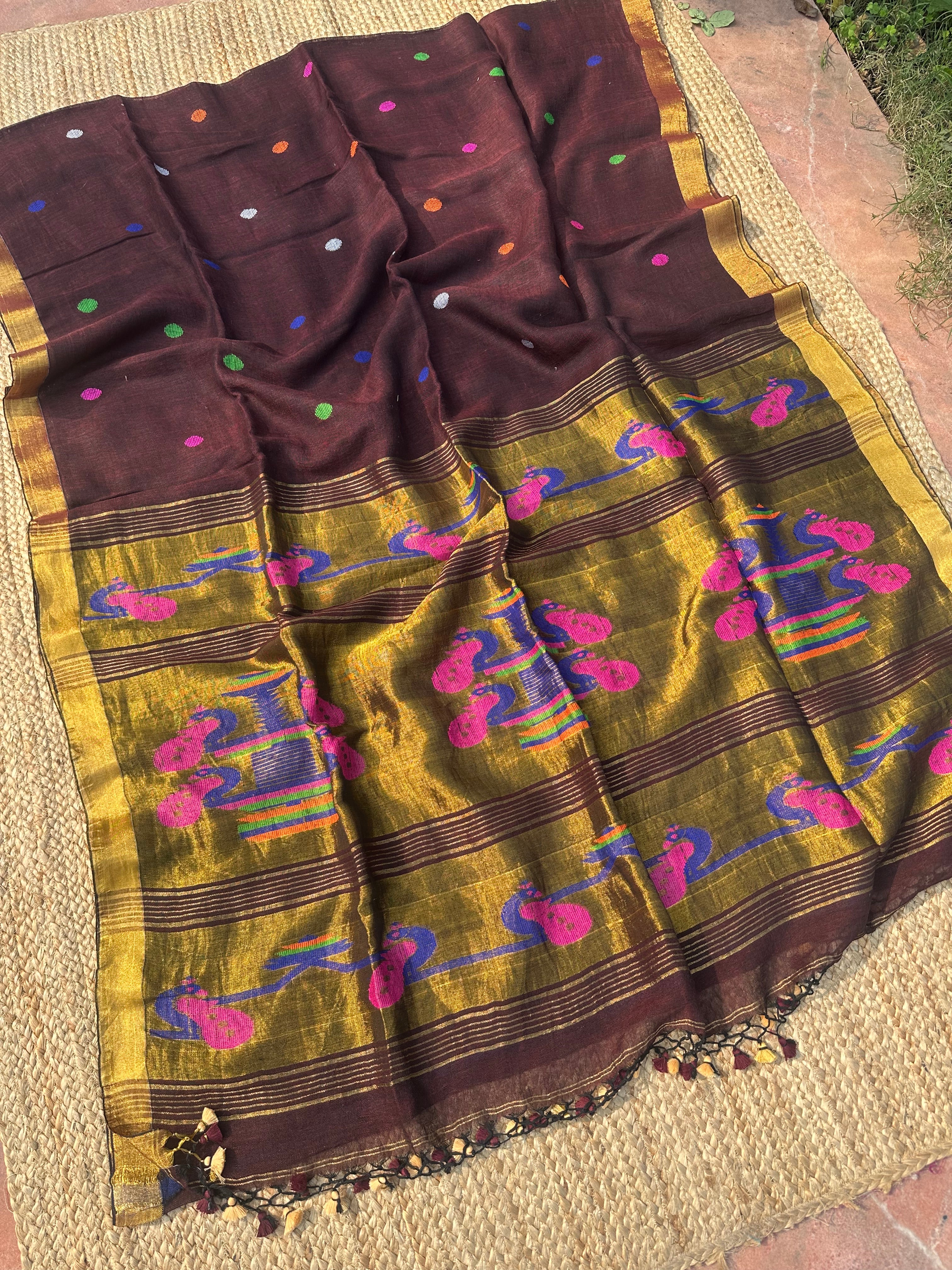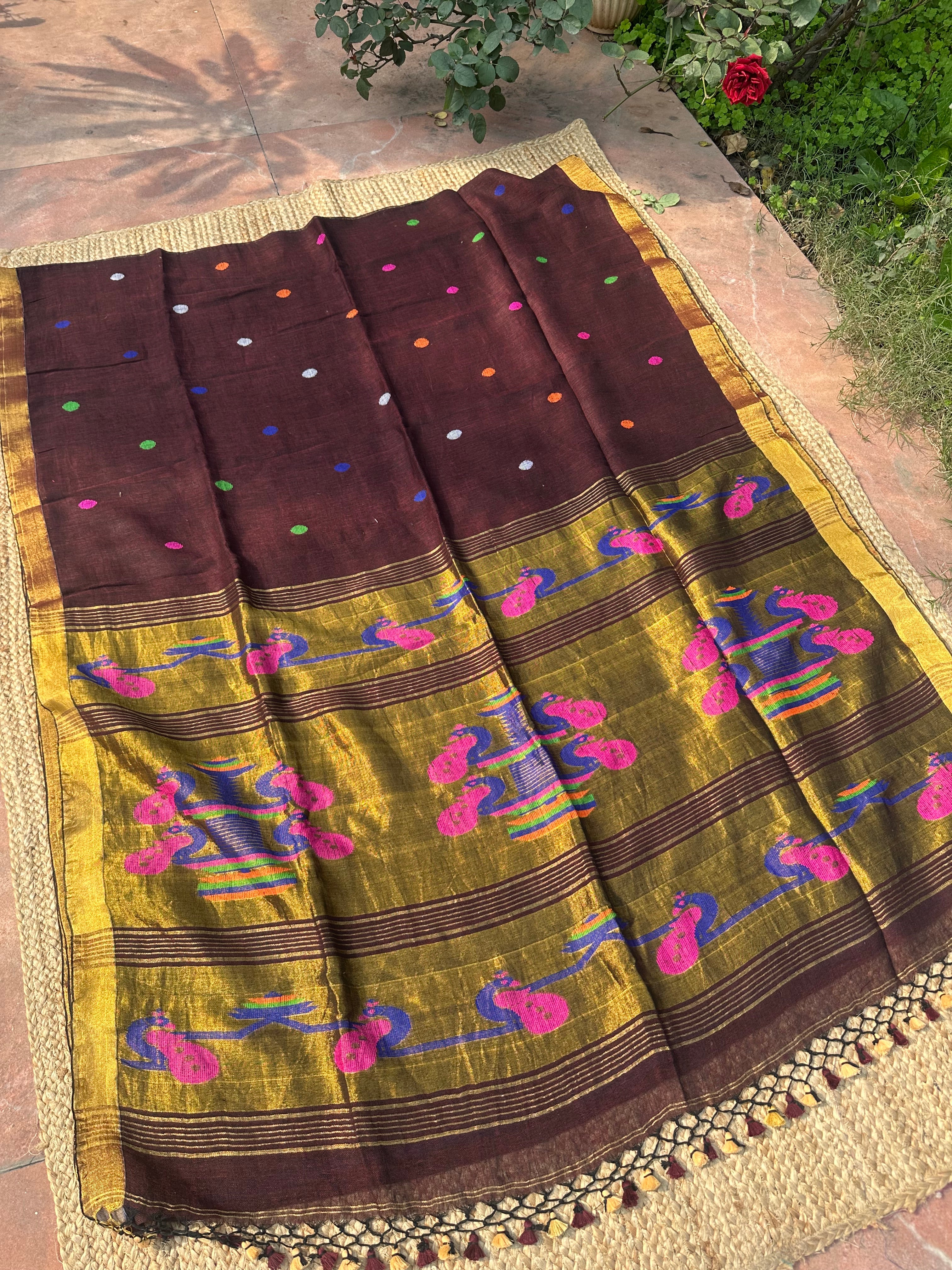 Linen Handloom Peacock Motif Paithani Pallu Saree - Brown