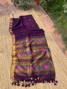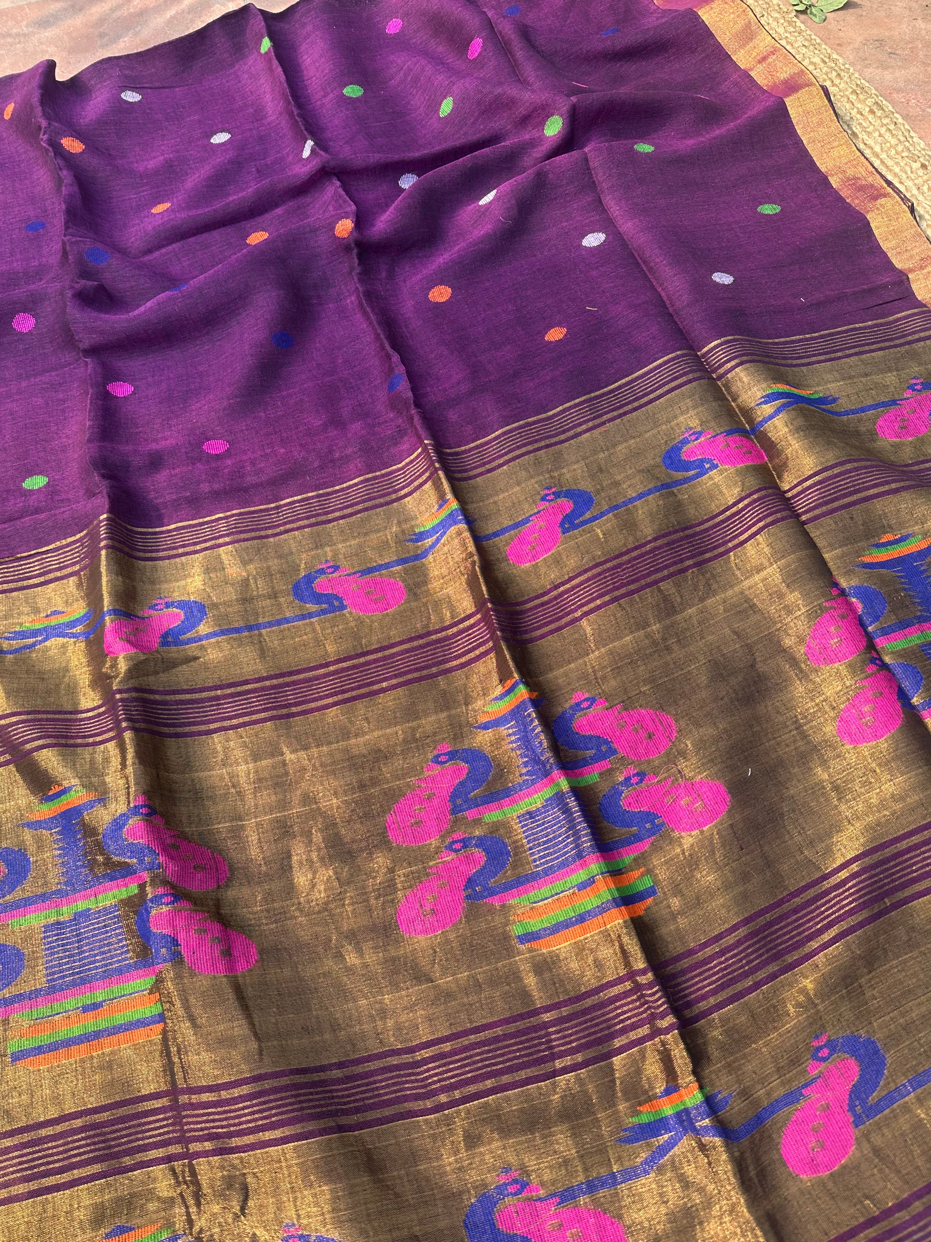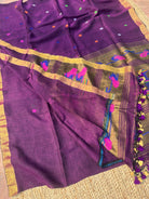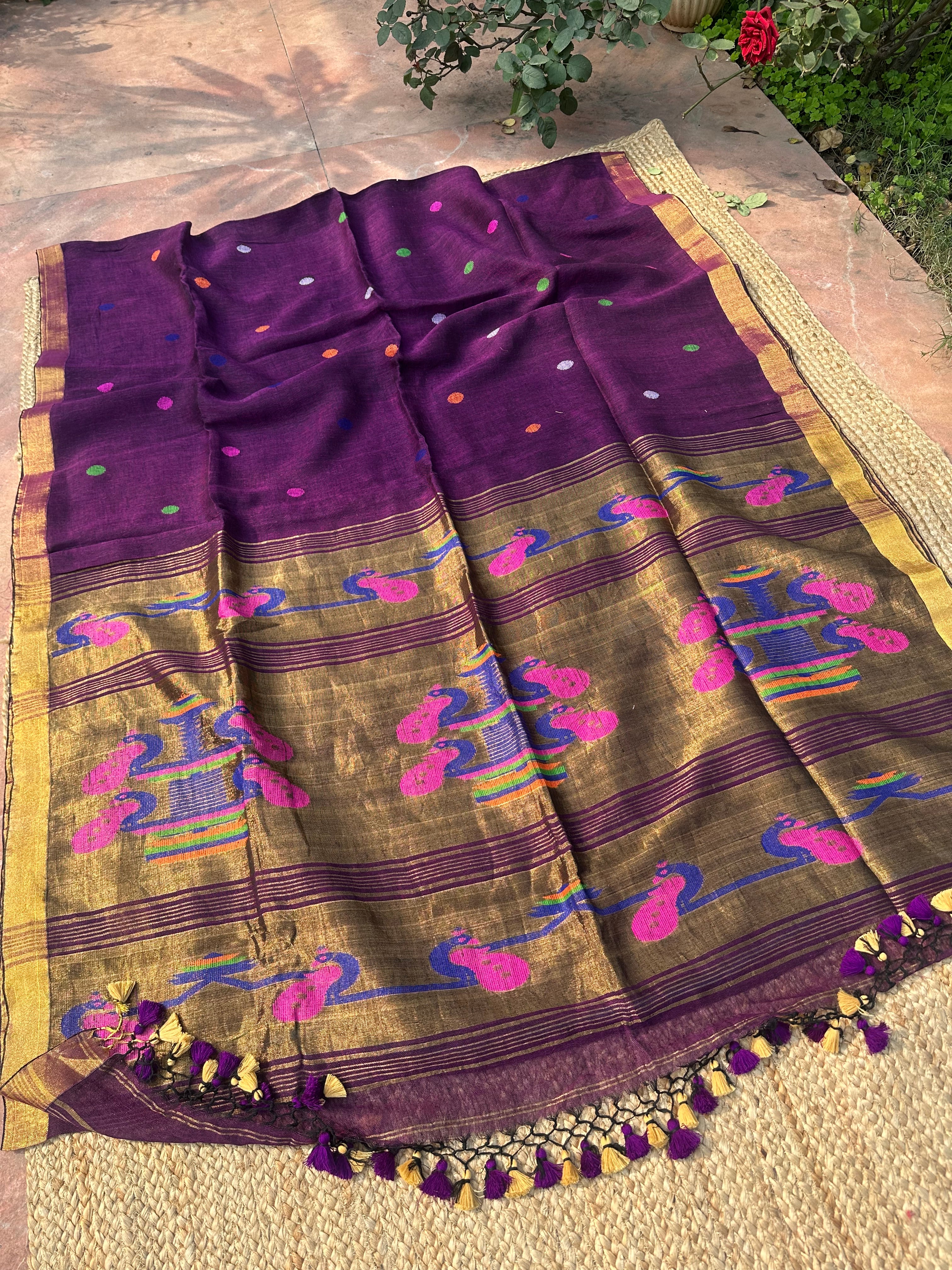 Linen Handloom Peacock Motif Paithani Pallu Saree - Purple