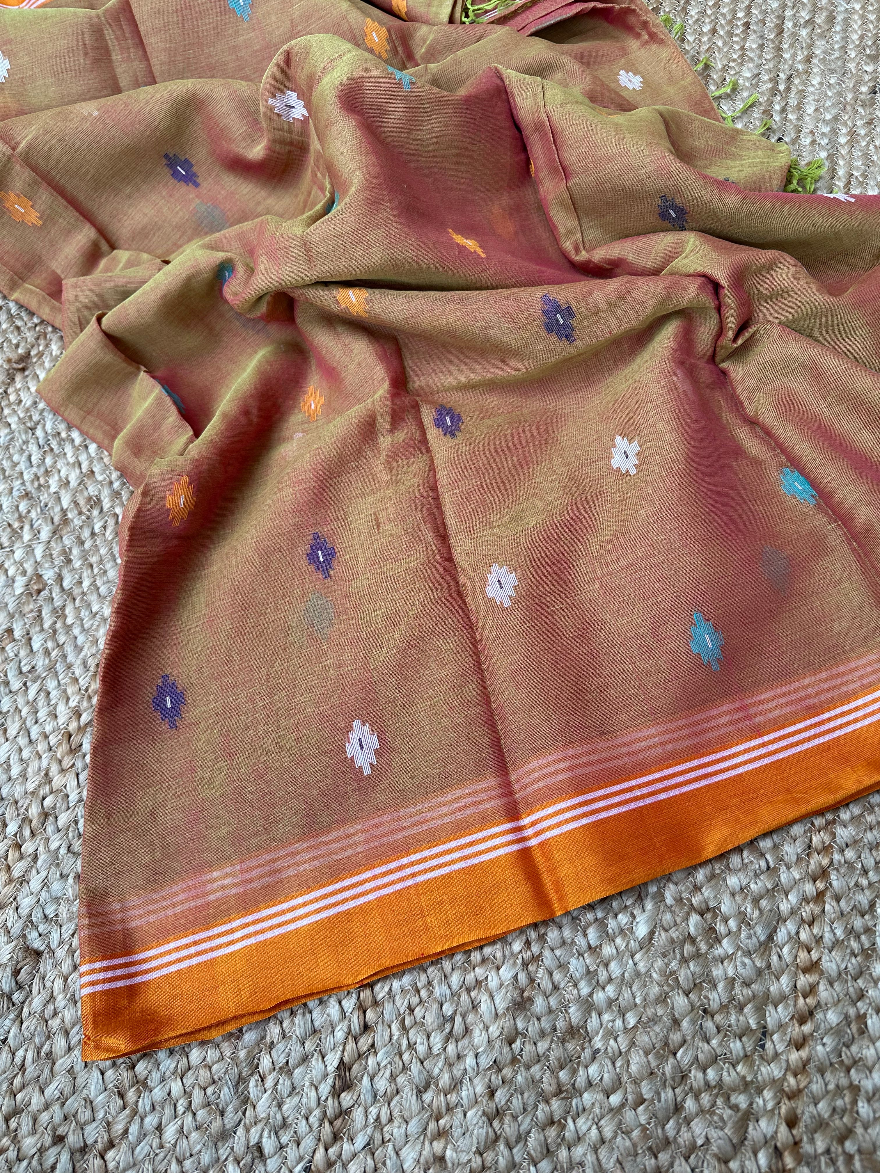 Mustard Maroon dual tone Cotton Handloom Jamdani Saree