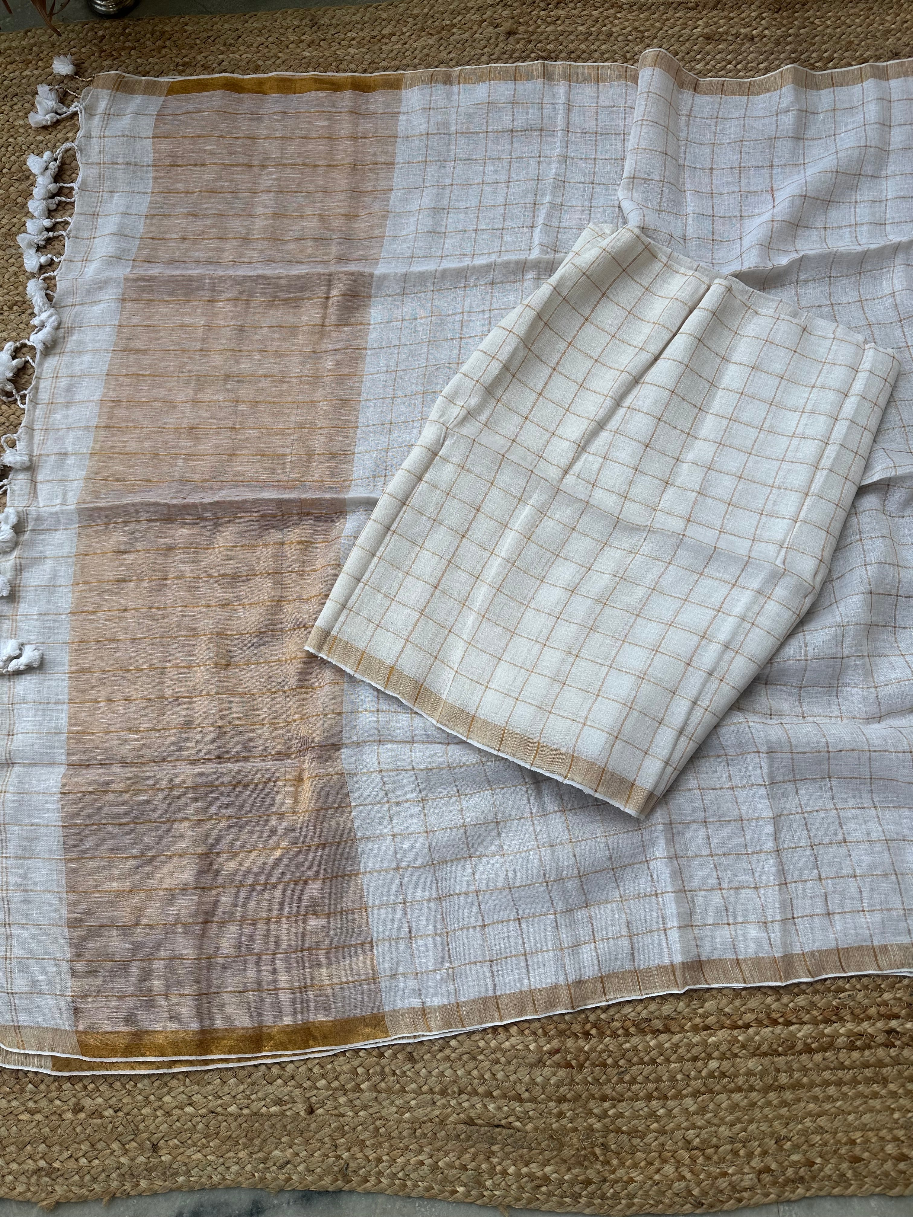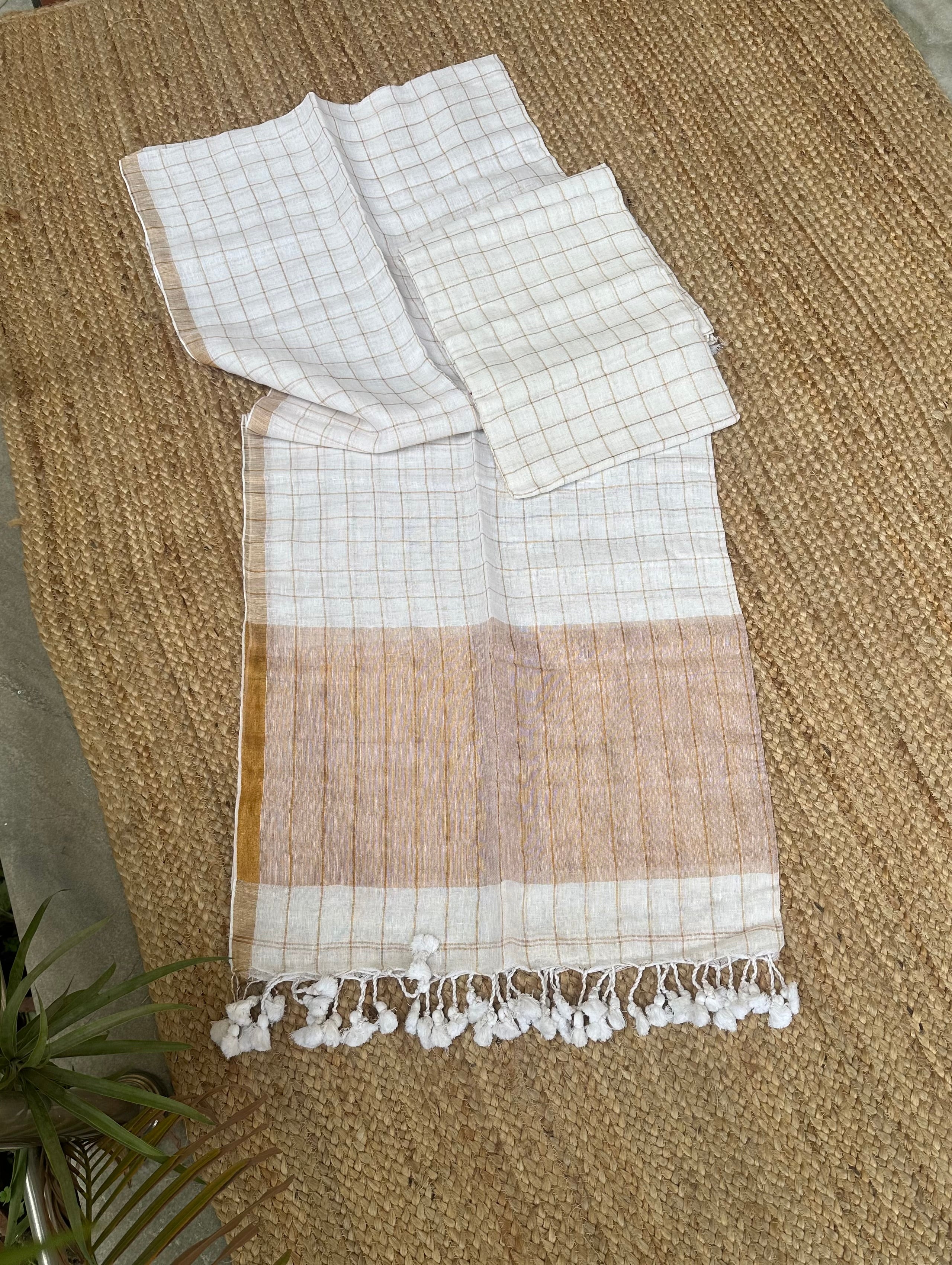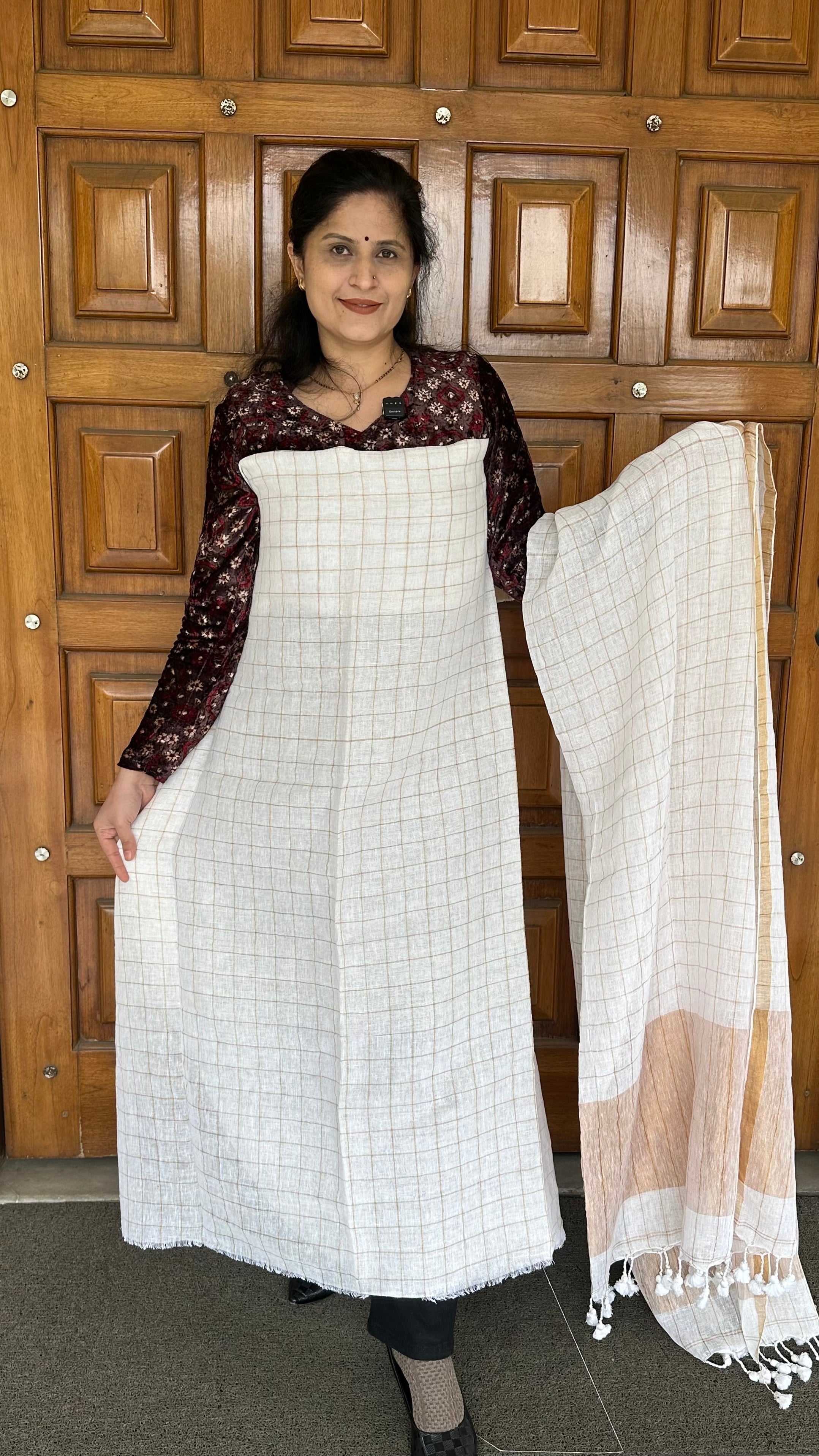 Kurta: Pure Jayshree Linen Handloom Kurta fabric with zari checks . 2.7-2.9 mtrs