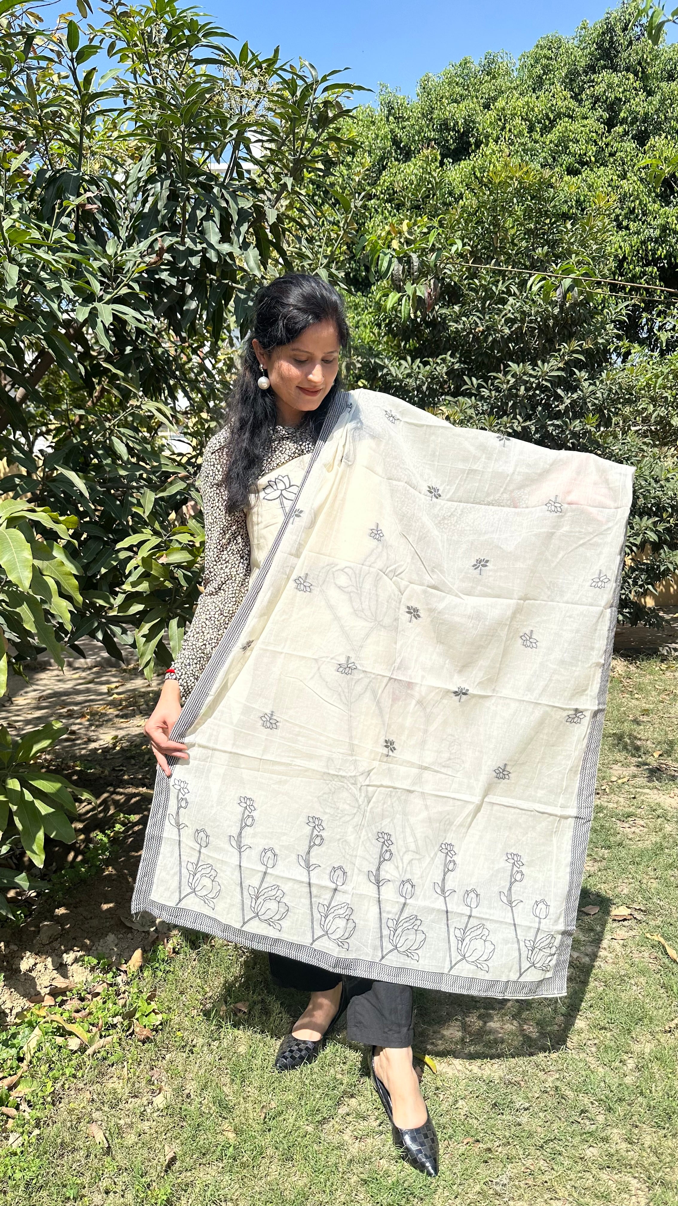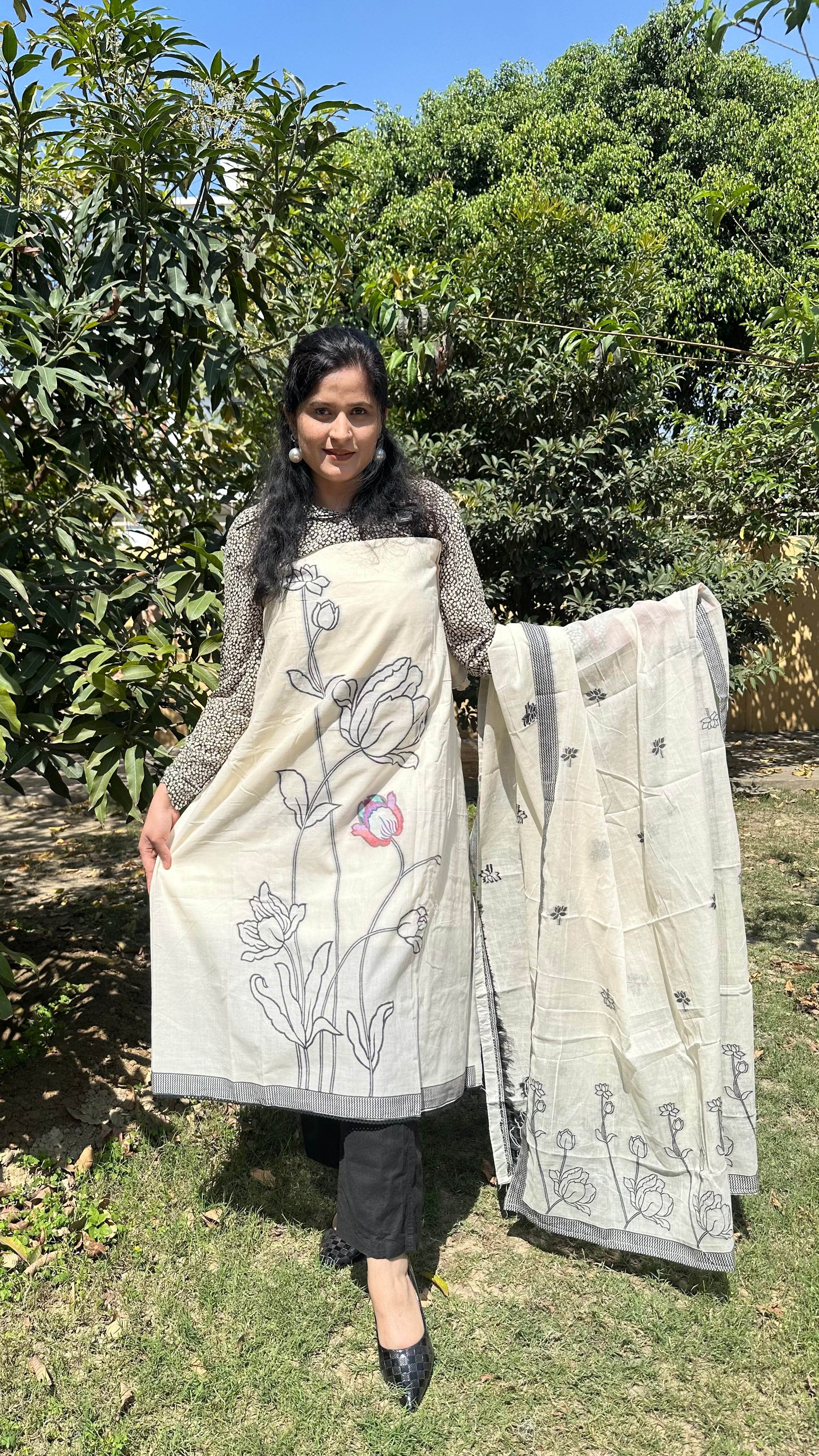 Kurta: Pure Thick Cotton base in off white shade. The work on this is Jamdani weaving. Black flowers making it beautiful and elegant. One flower is Meena work Jamdani. 2.5 mtrs 44 inches . Sleeves fabric is given plain with border same as suit ghera weaving lace.