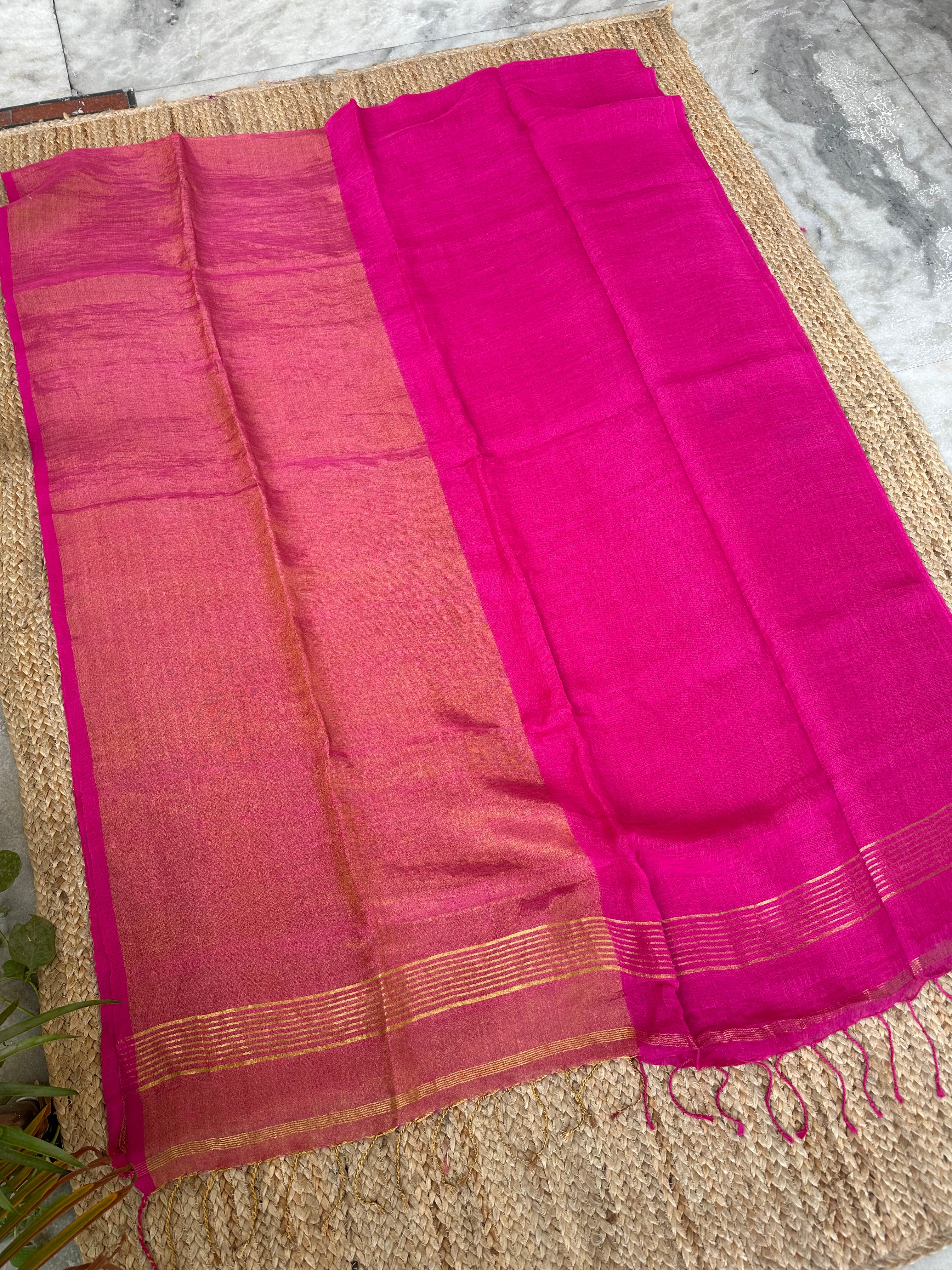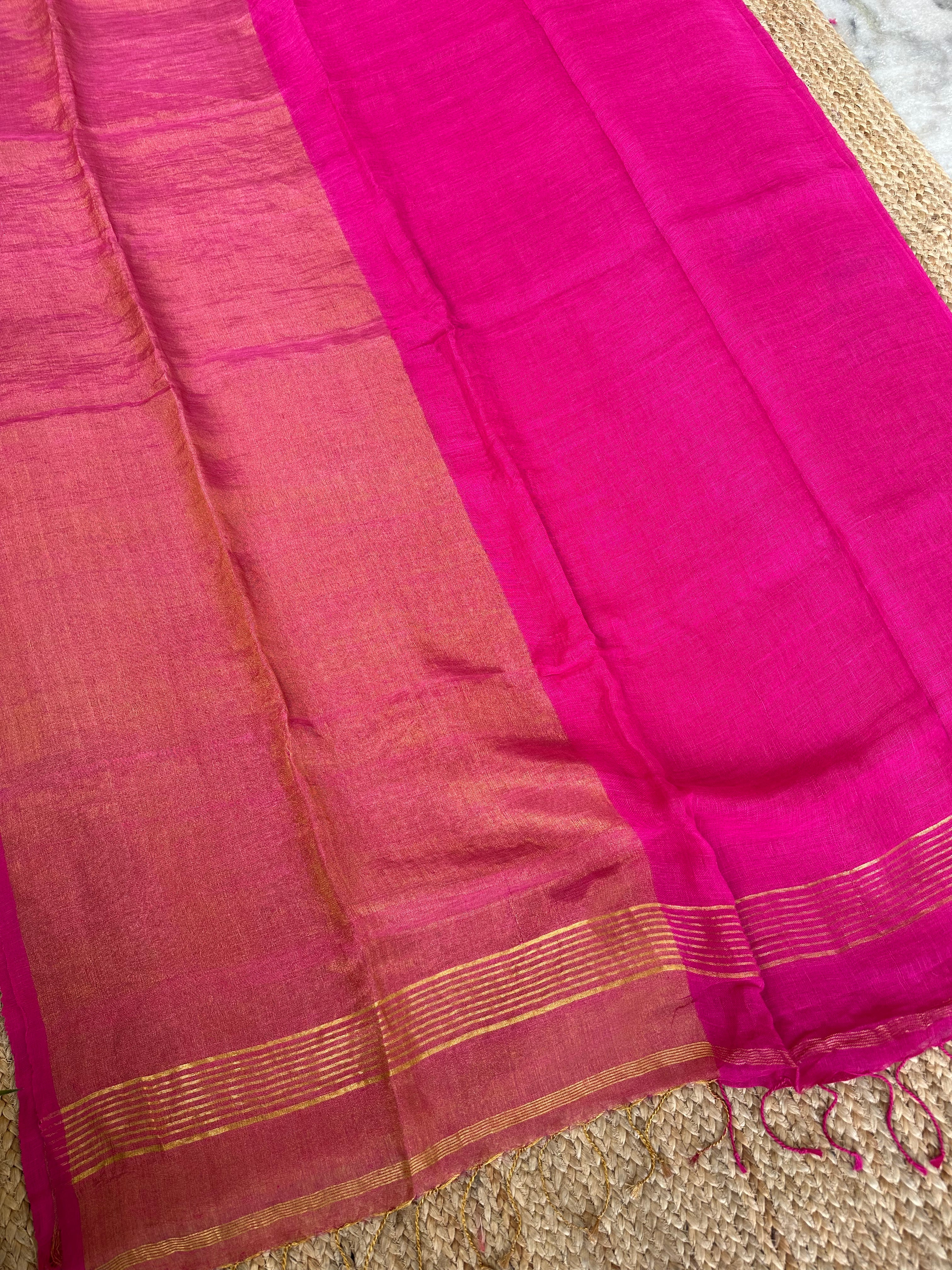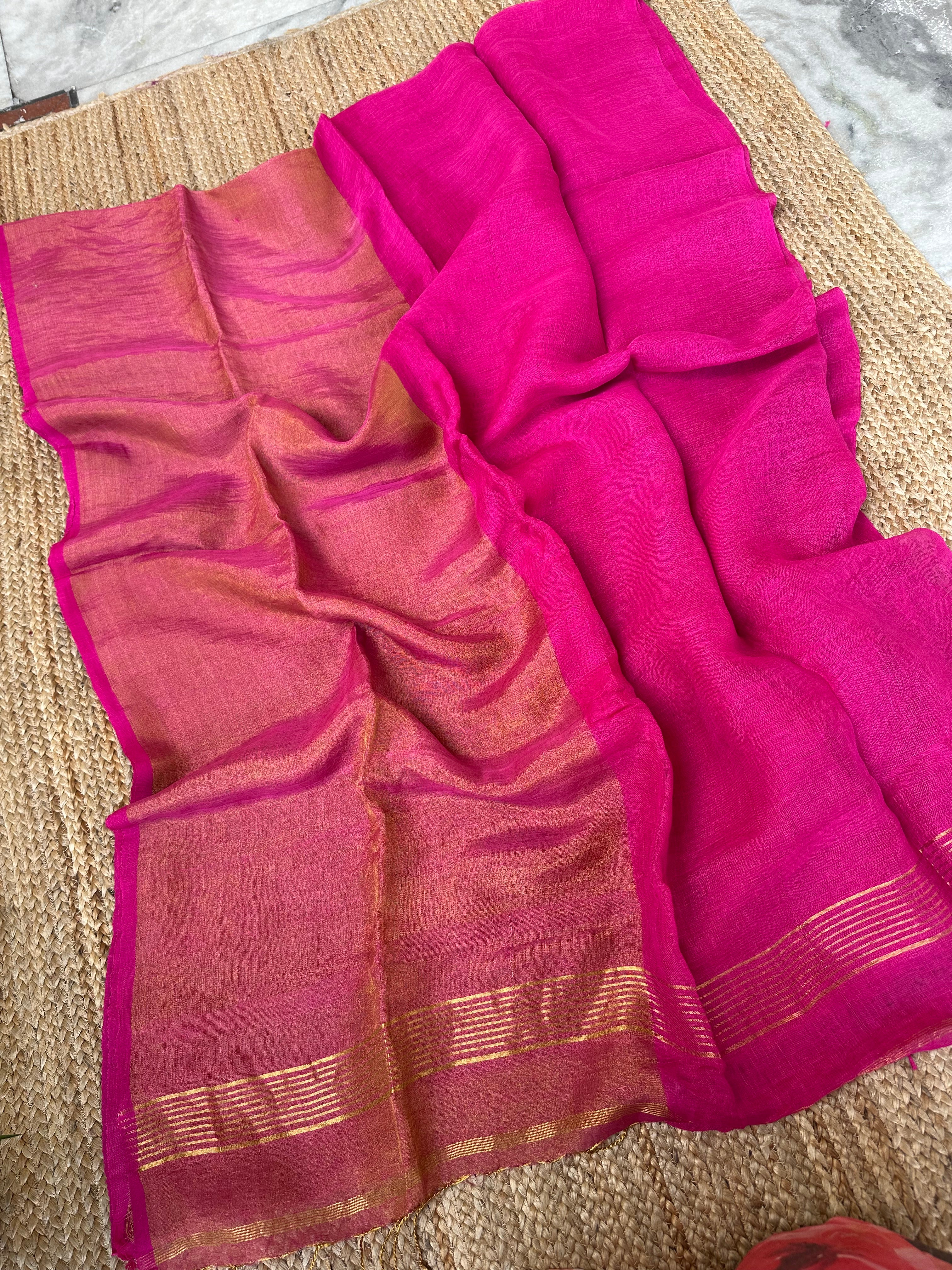 Pink Pure Handloom Linen Half n half Tissue Saree