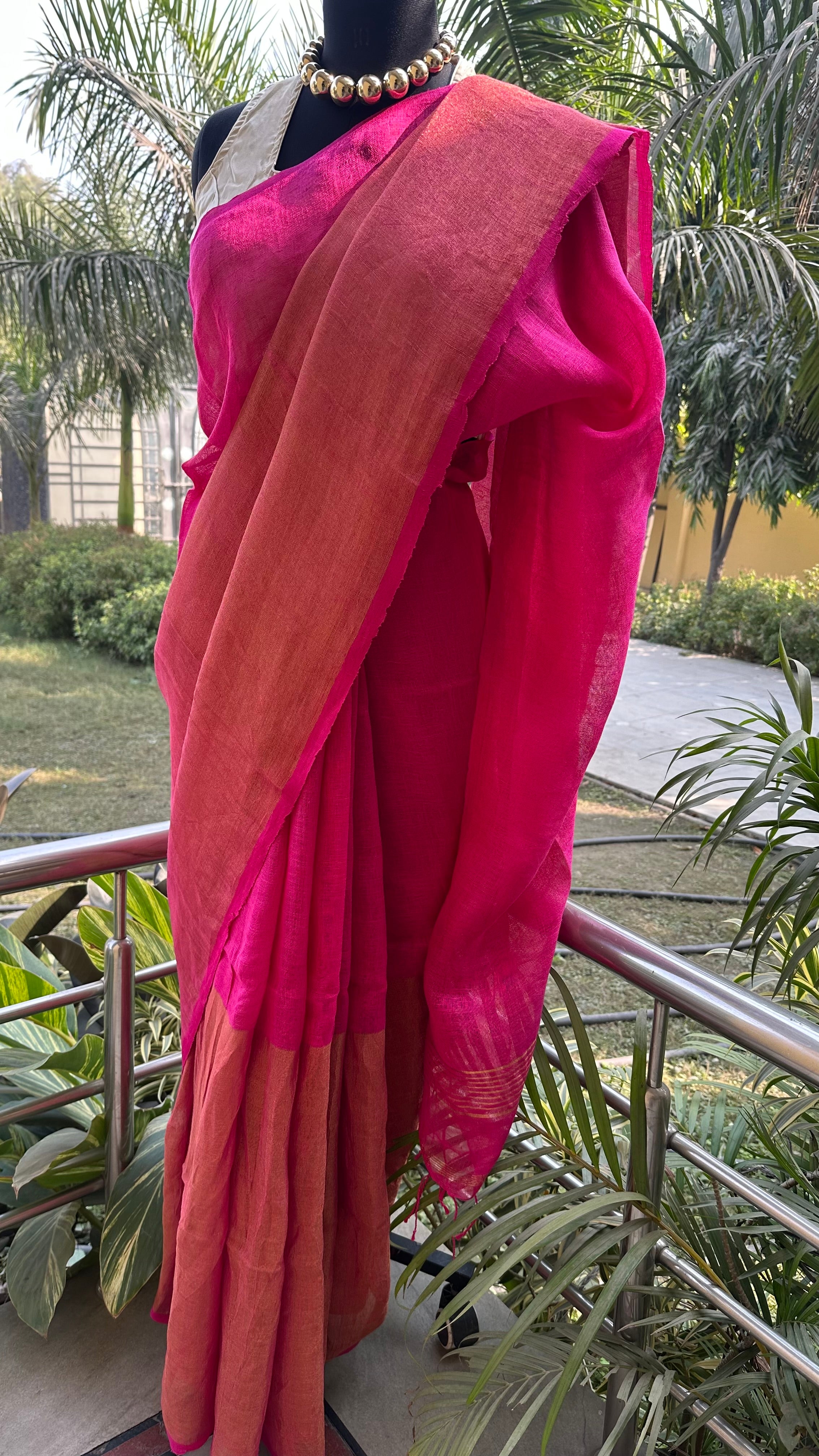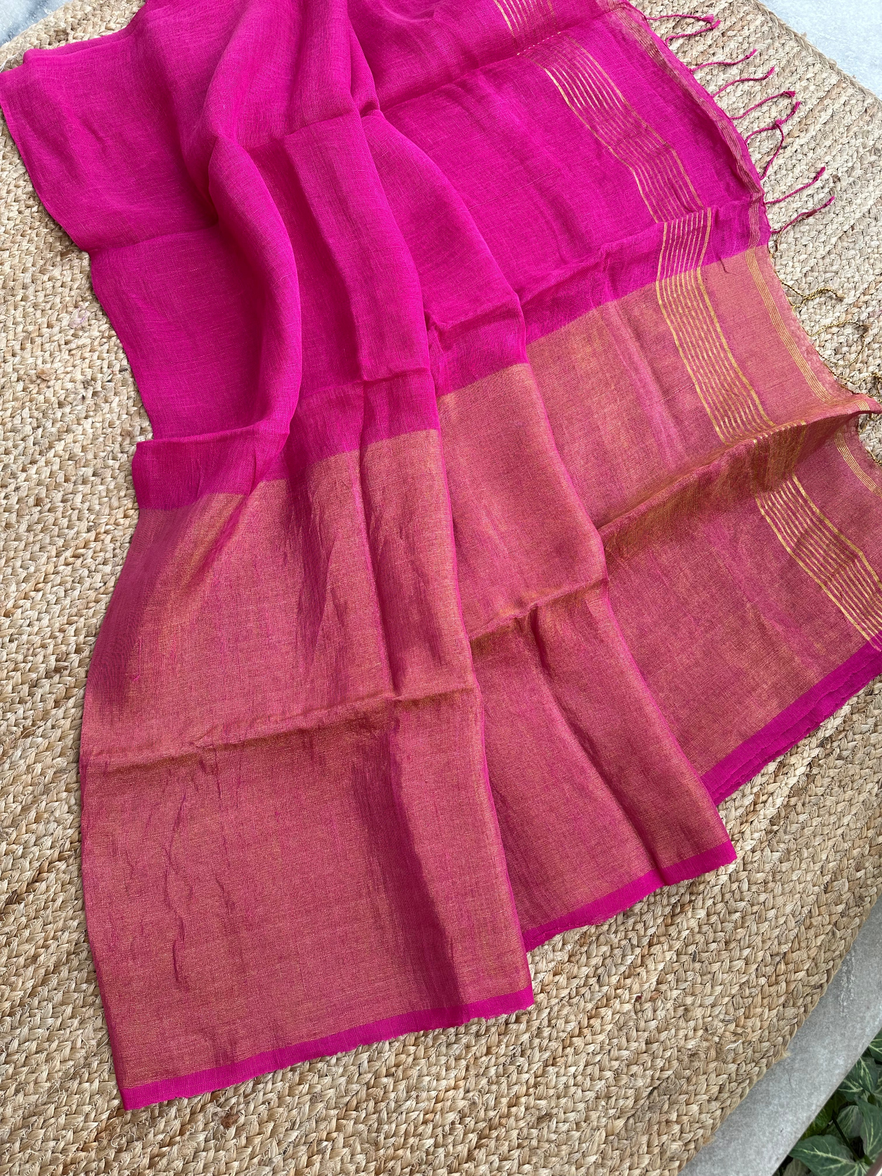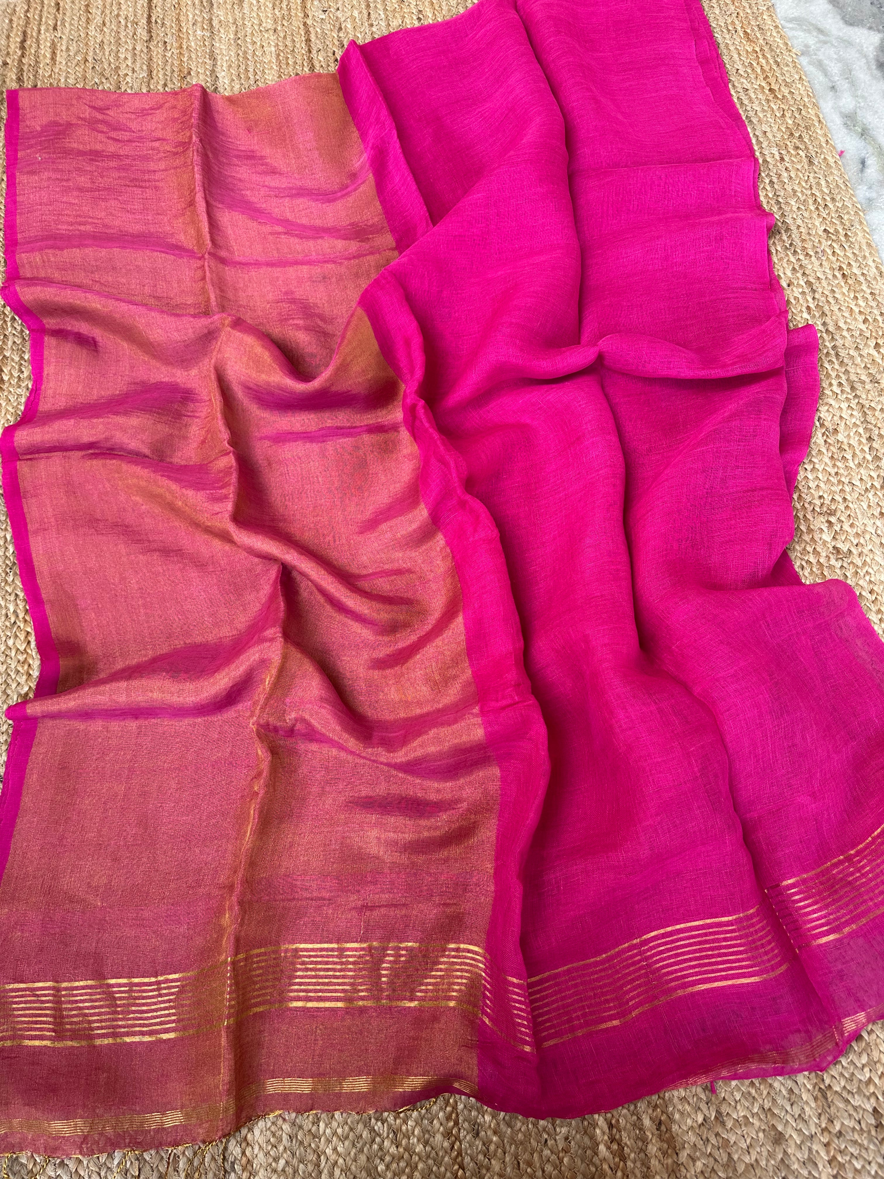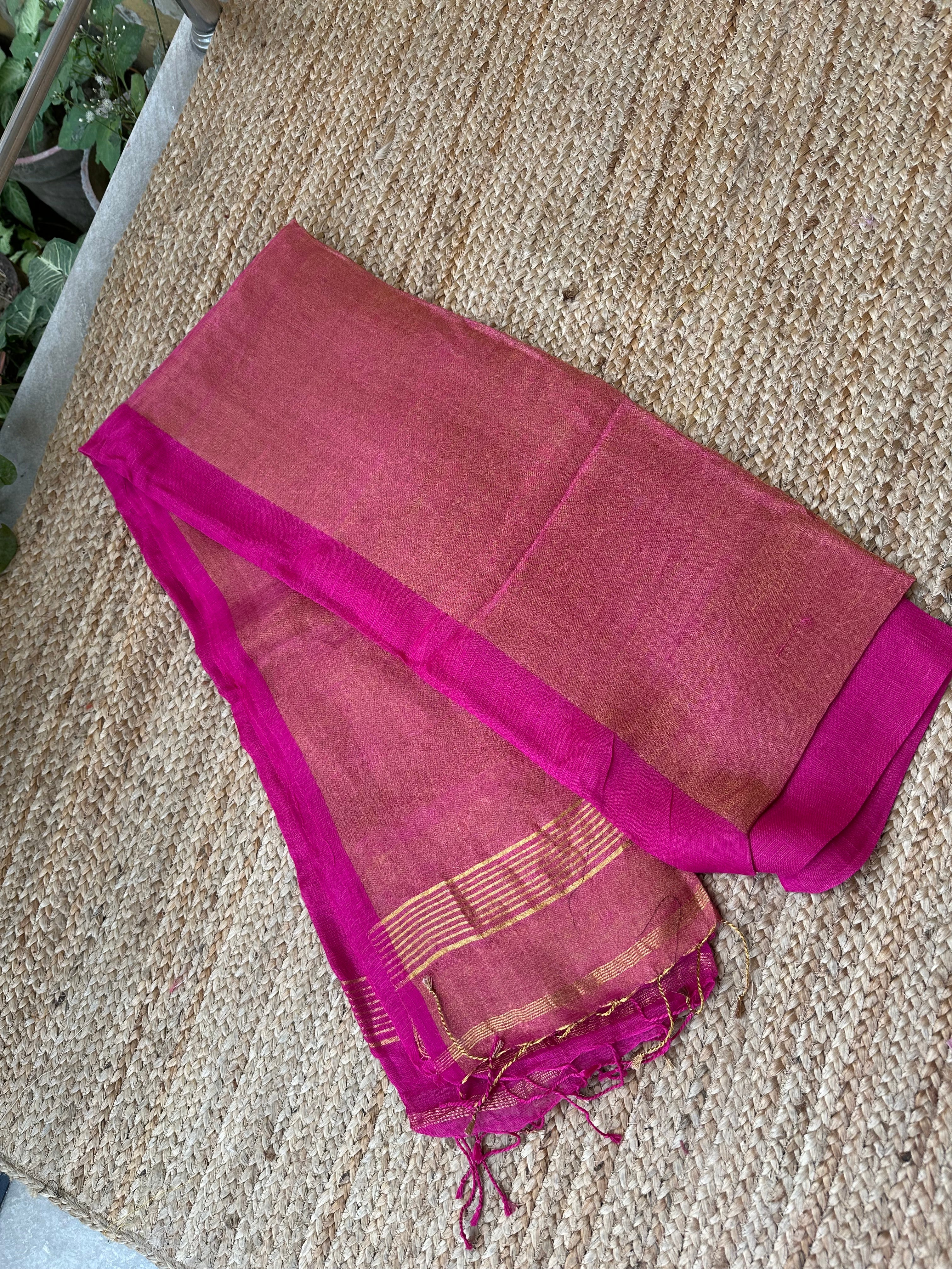 Pink Pure Handloom Linen Half n half Tissue Saree