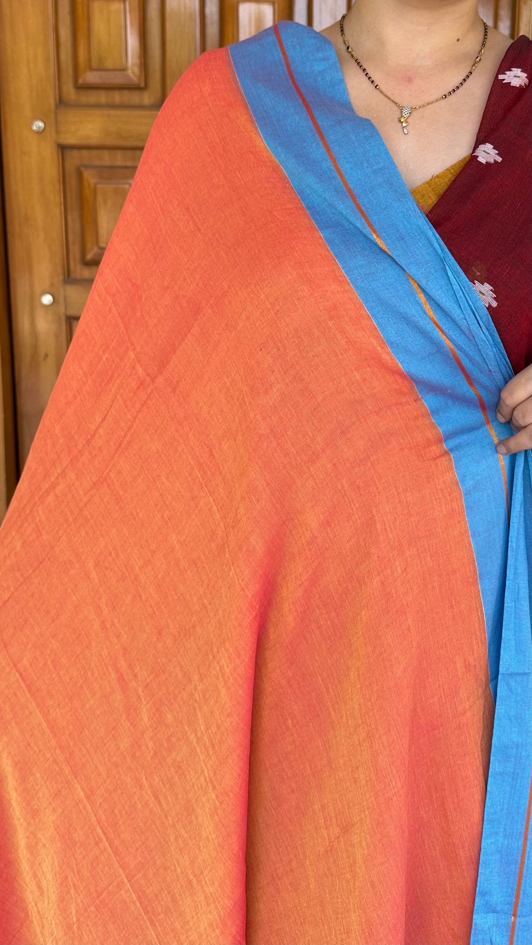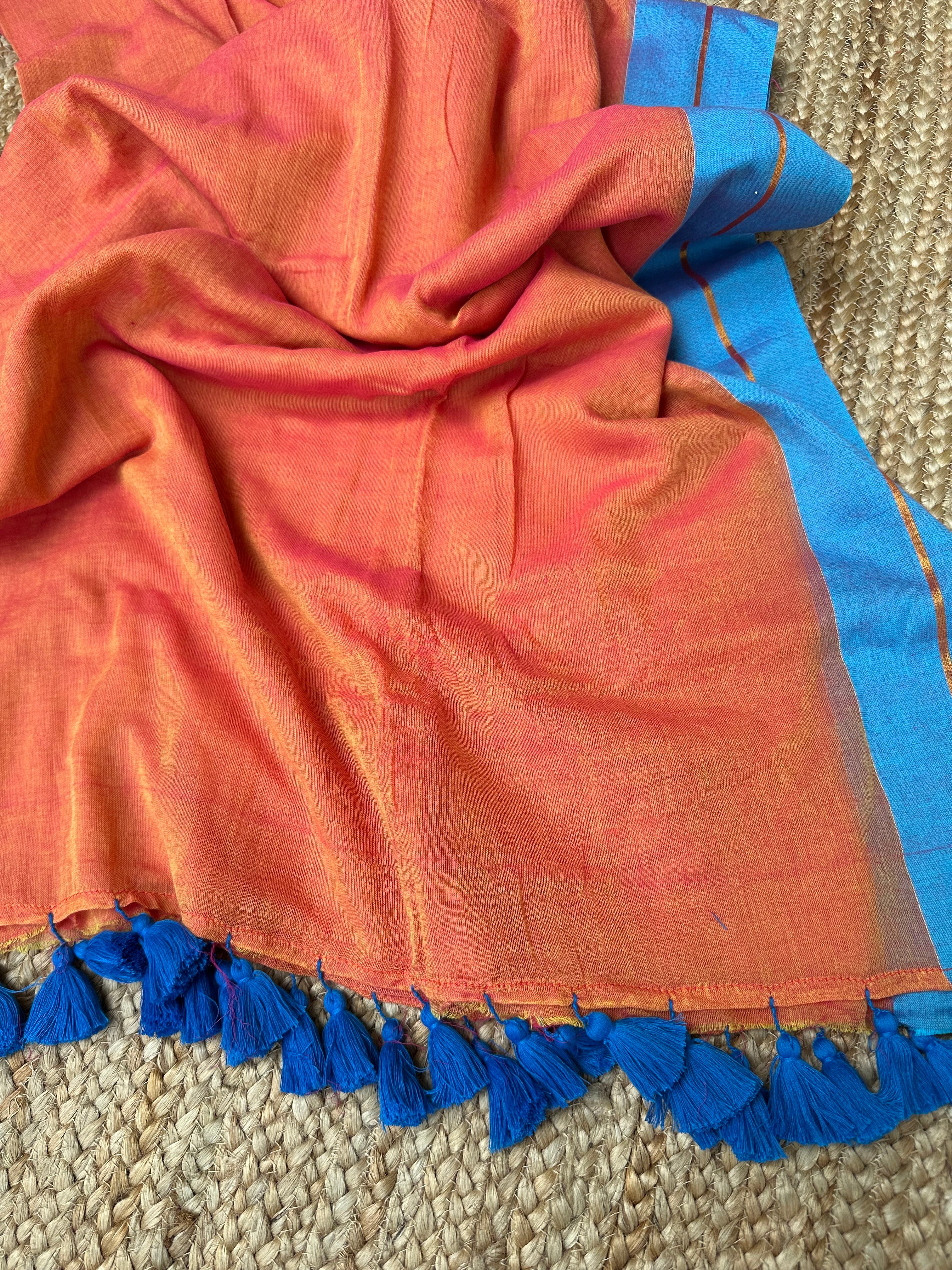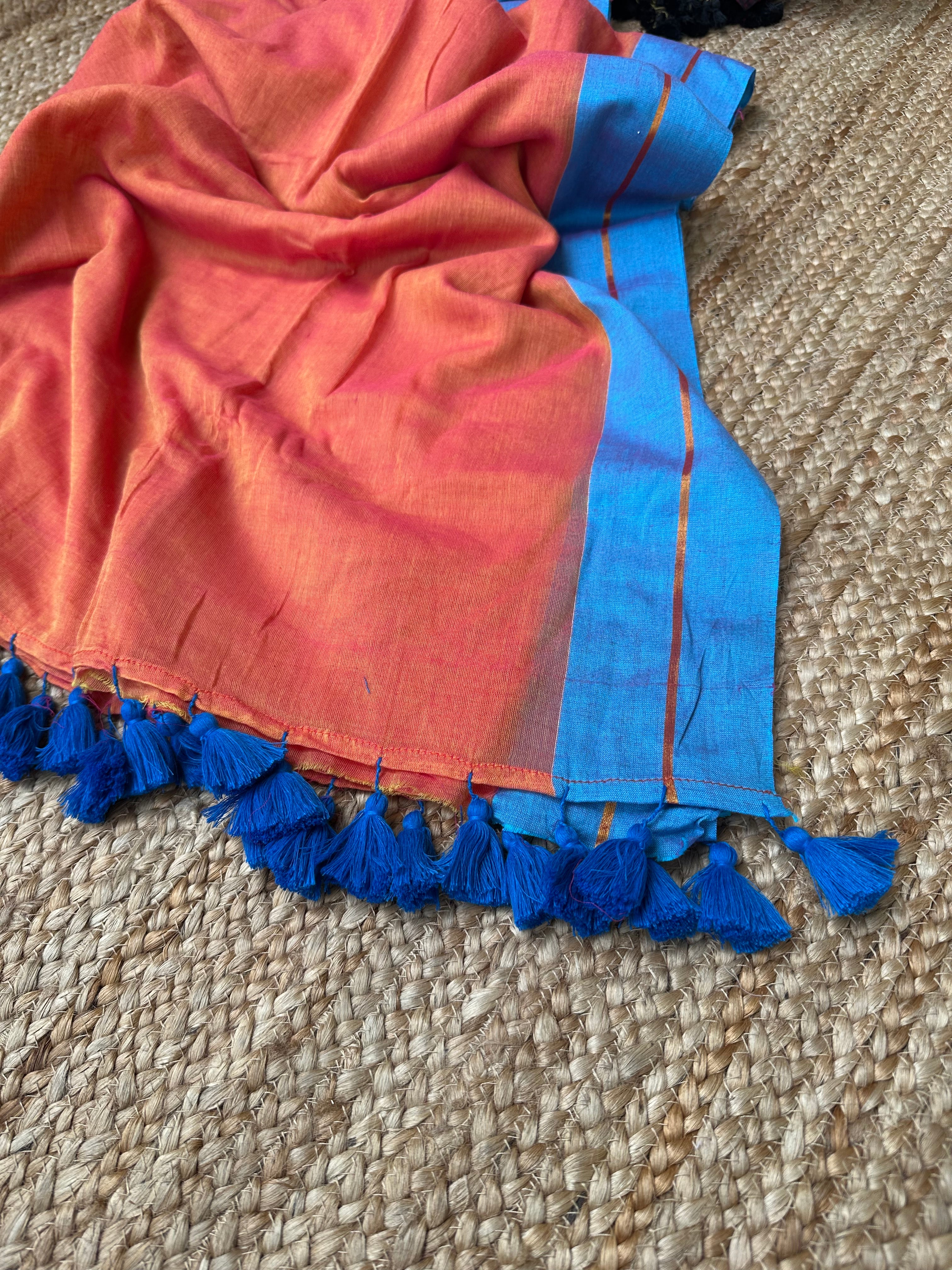 Material: Pure cotton handloom saree with contrast colour border and tassles. The saree is soft and made with premium quality cotton. Length 6 mtrs.