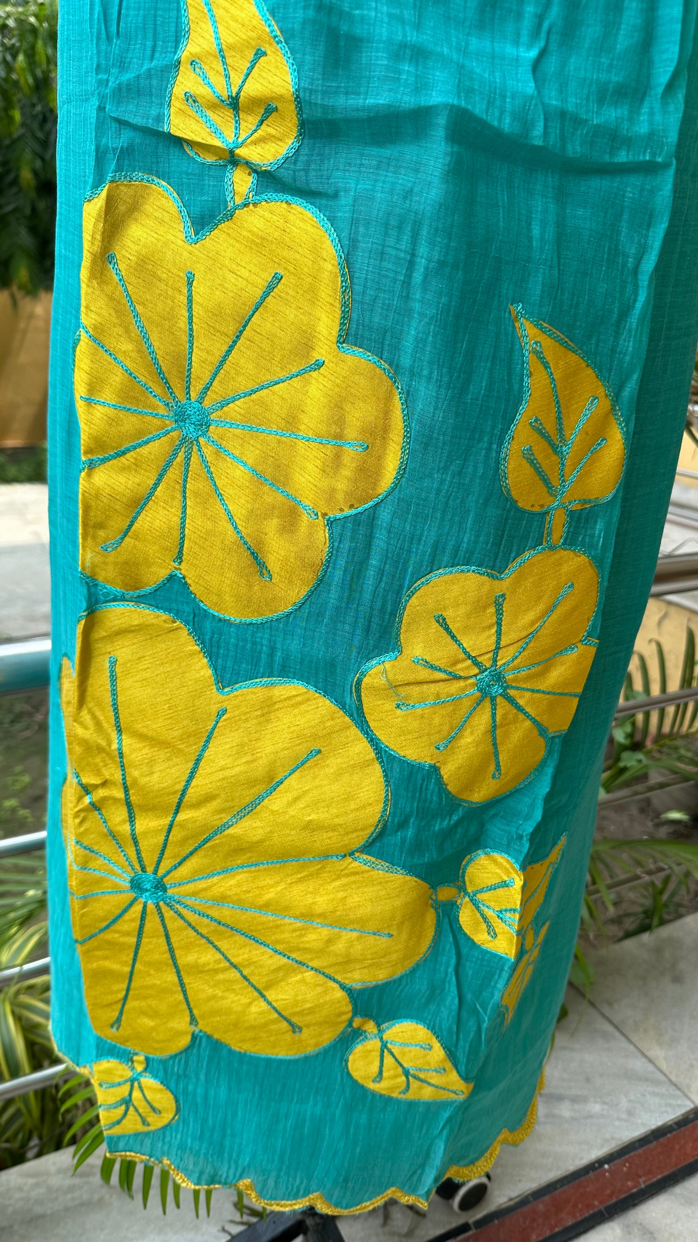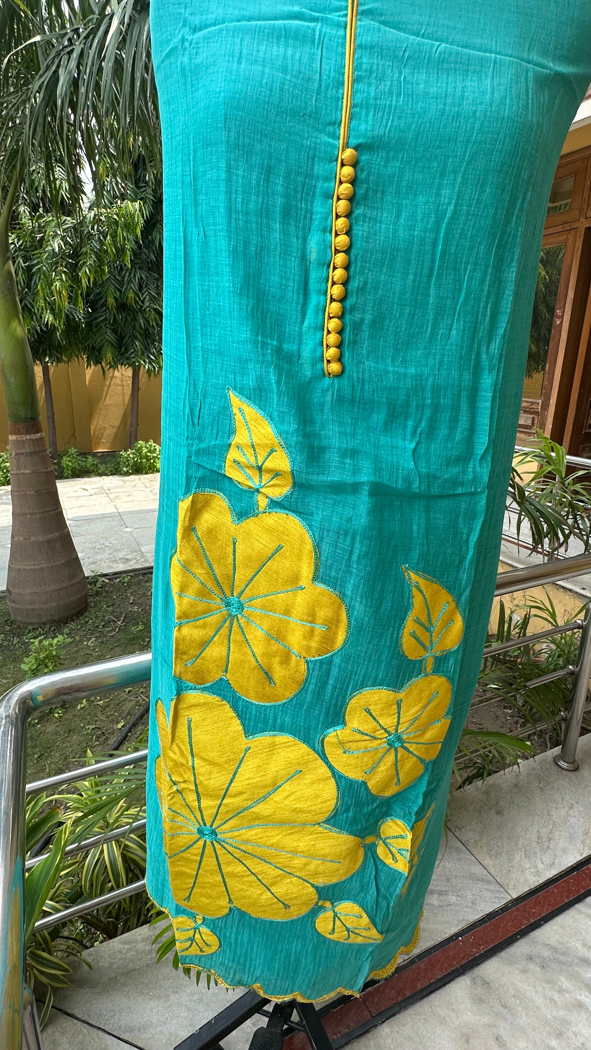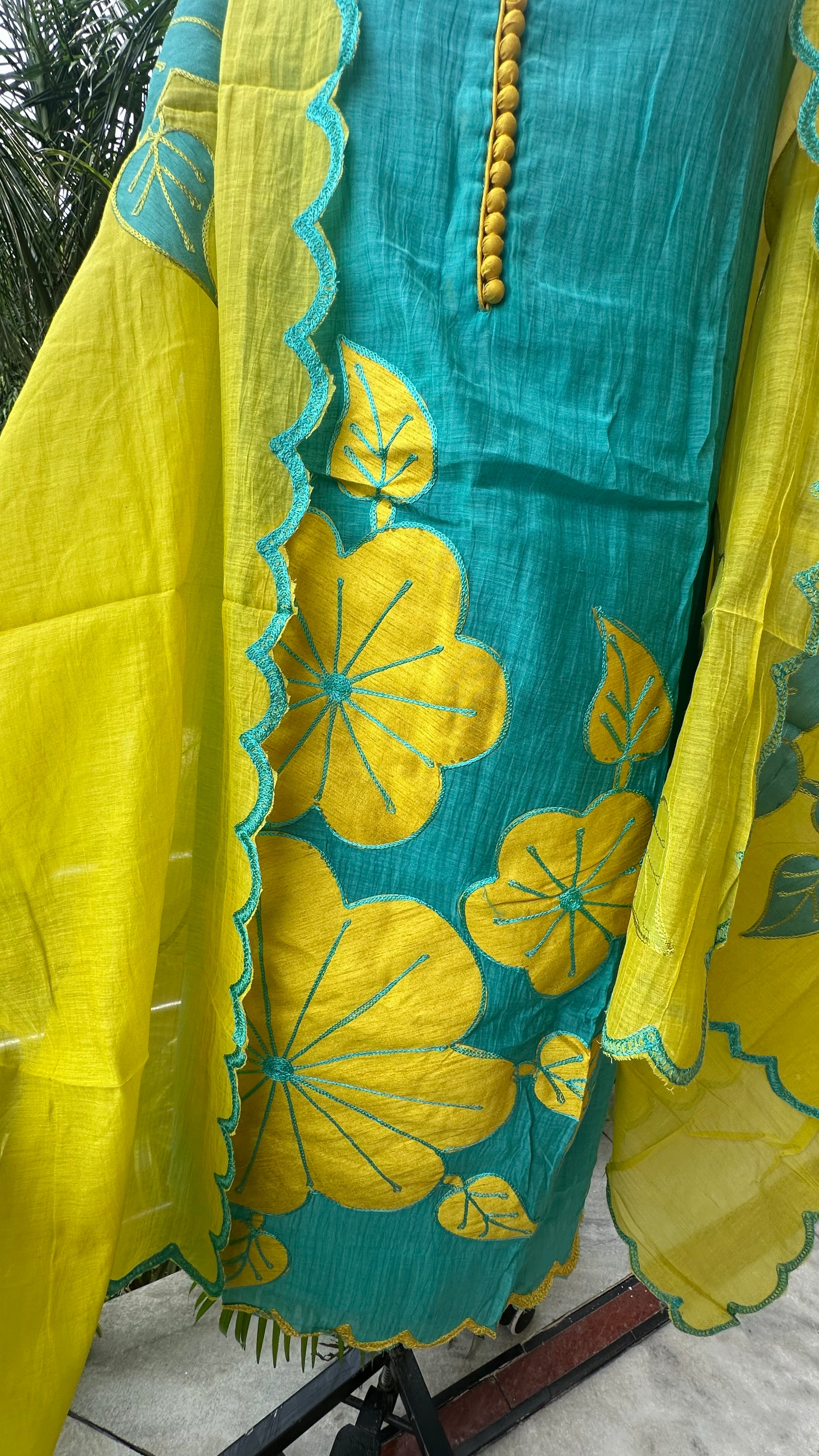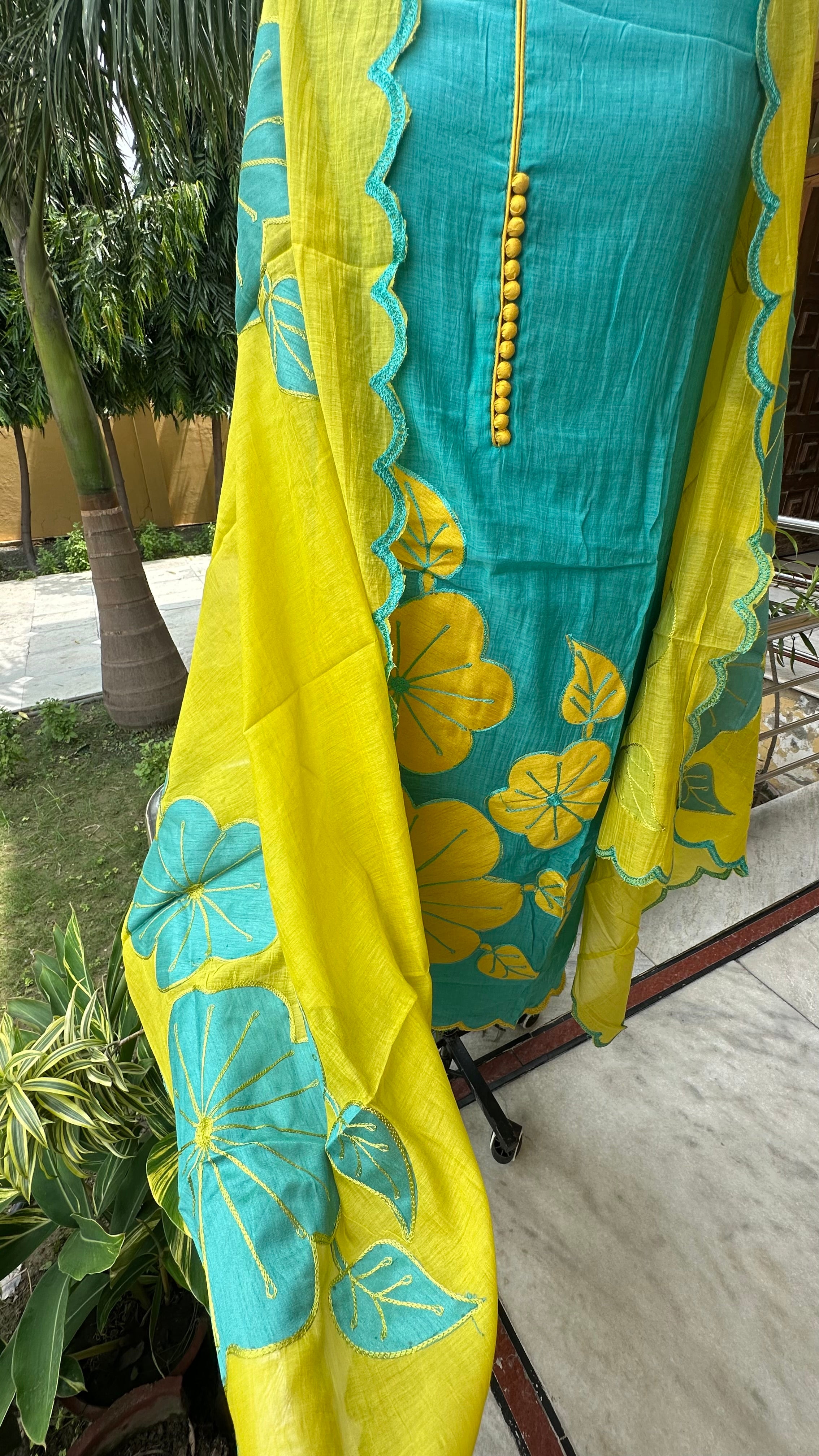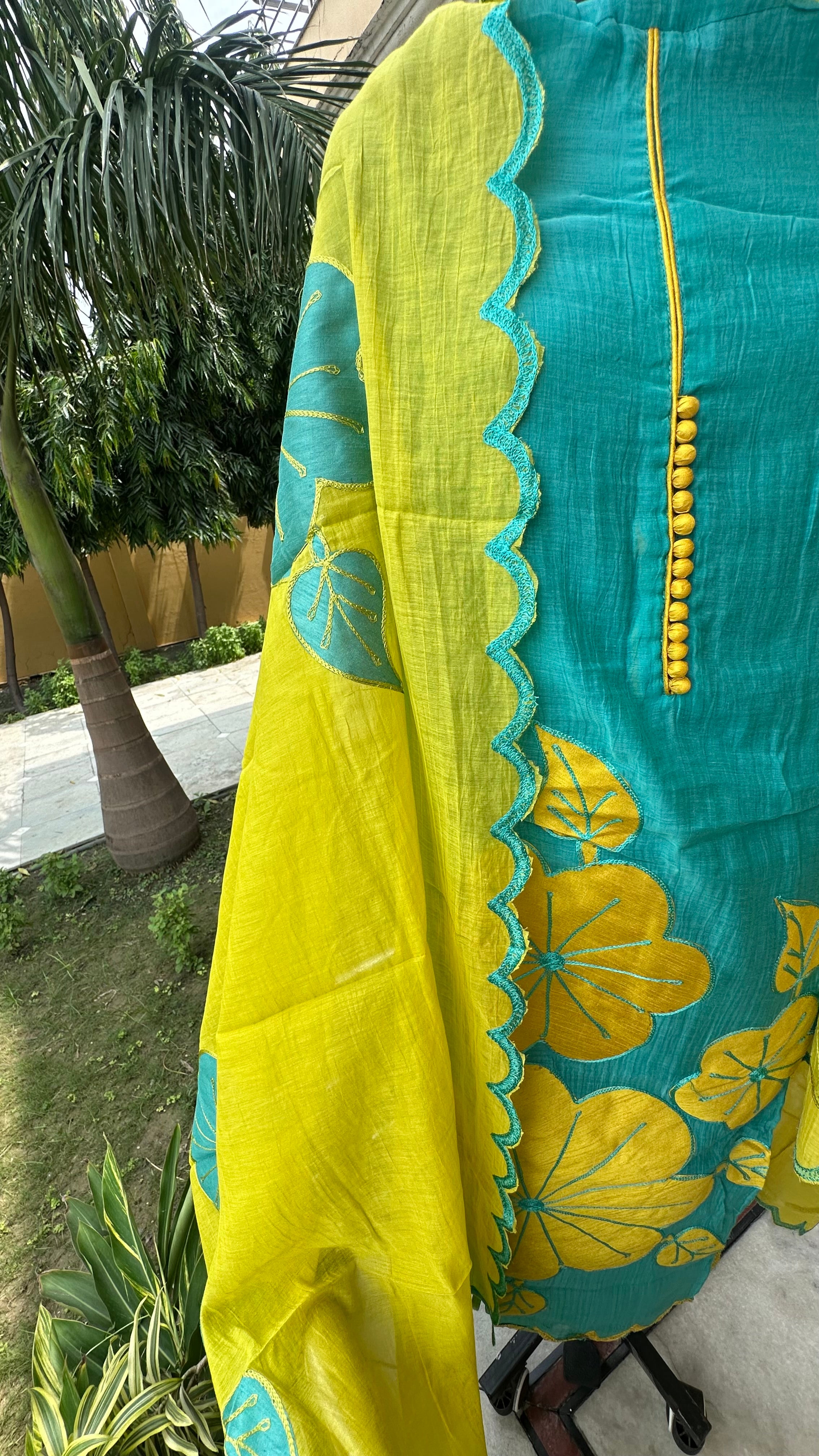 Premium Mul Chanderi Appliqué Work Suit-Teal Blue