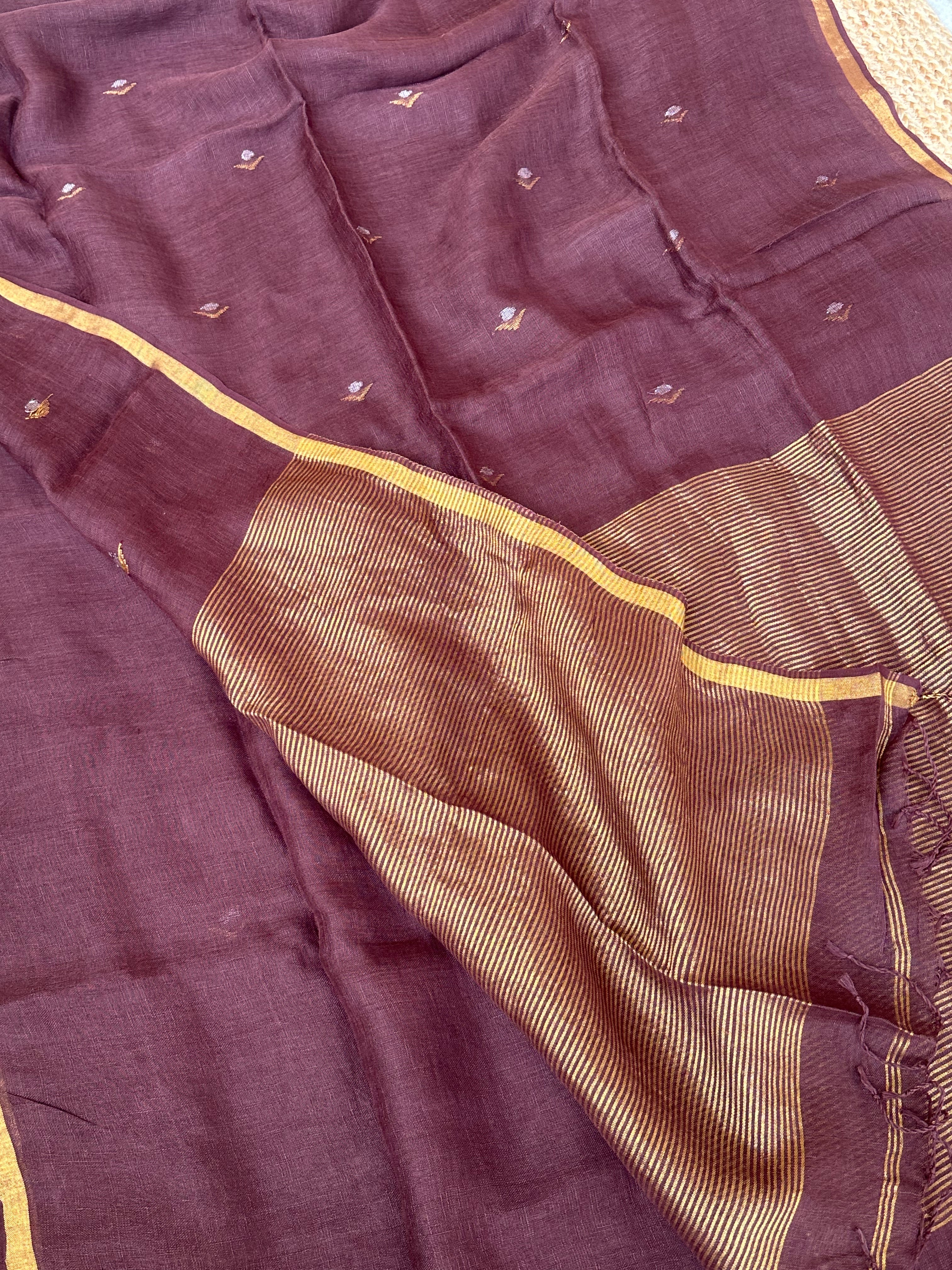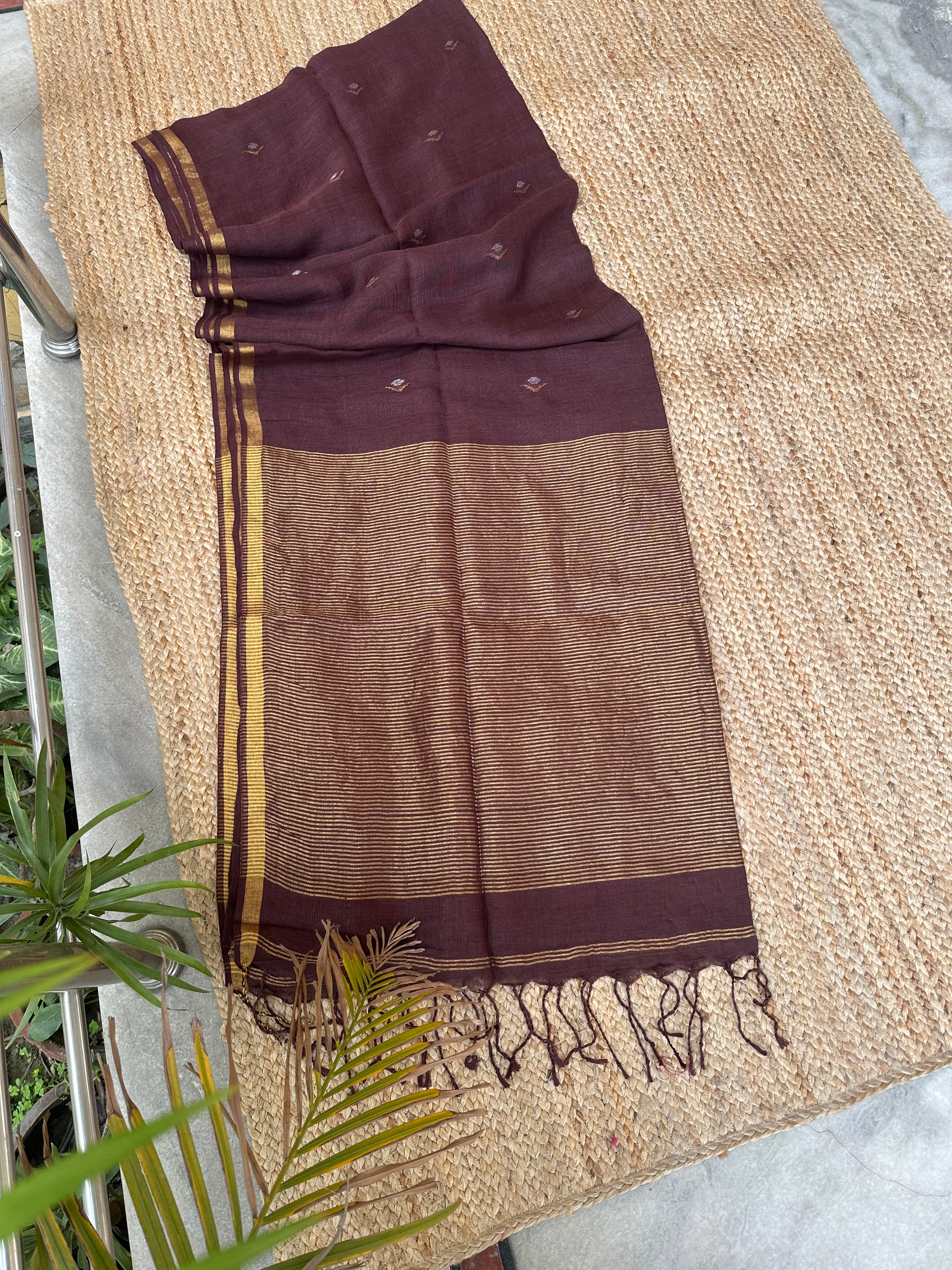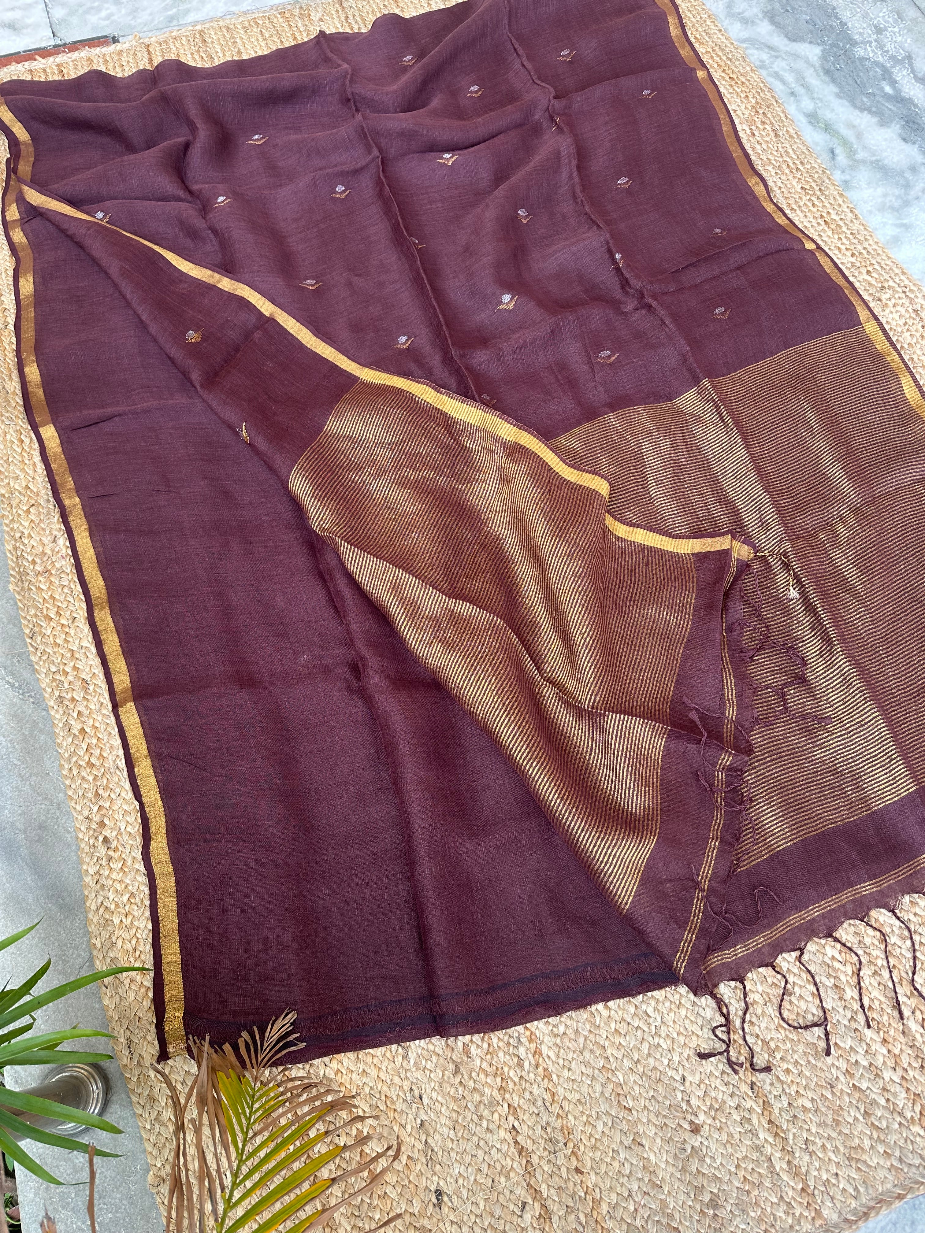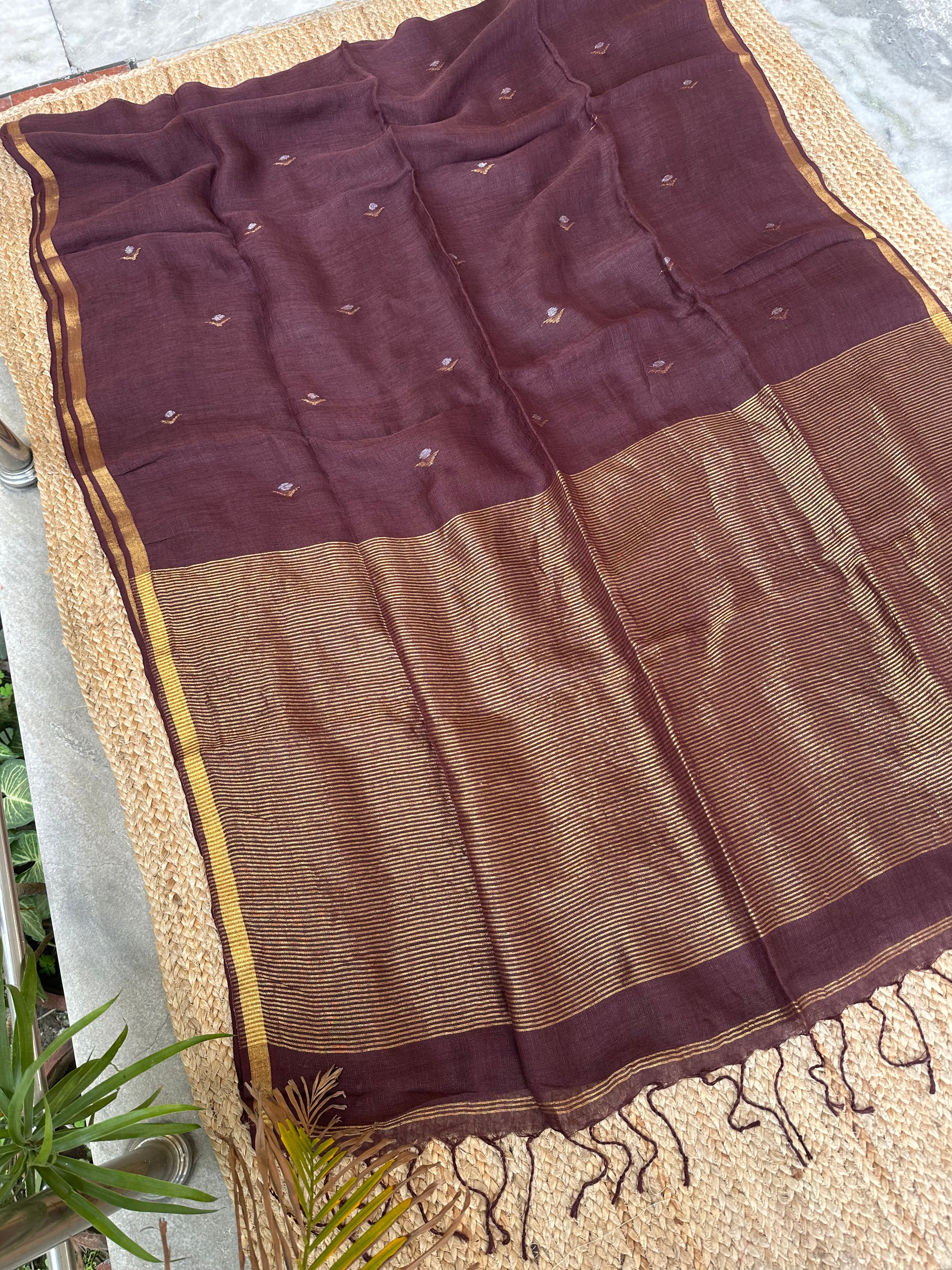 Pure Handloom Saree with Golden Zari bootas- Dark Brown