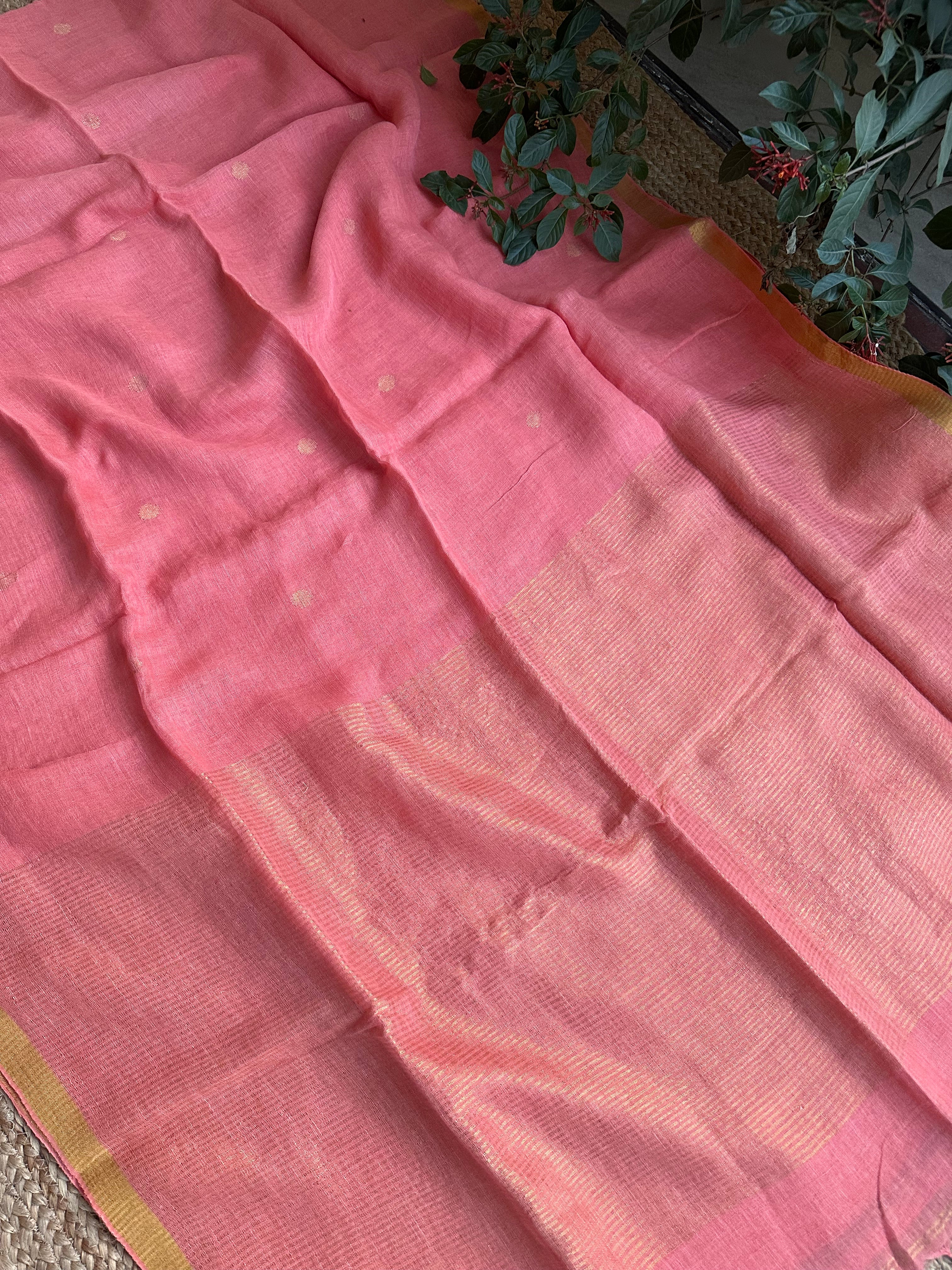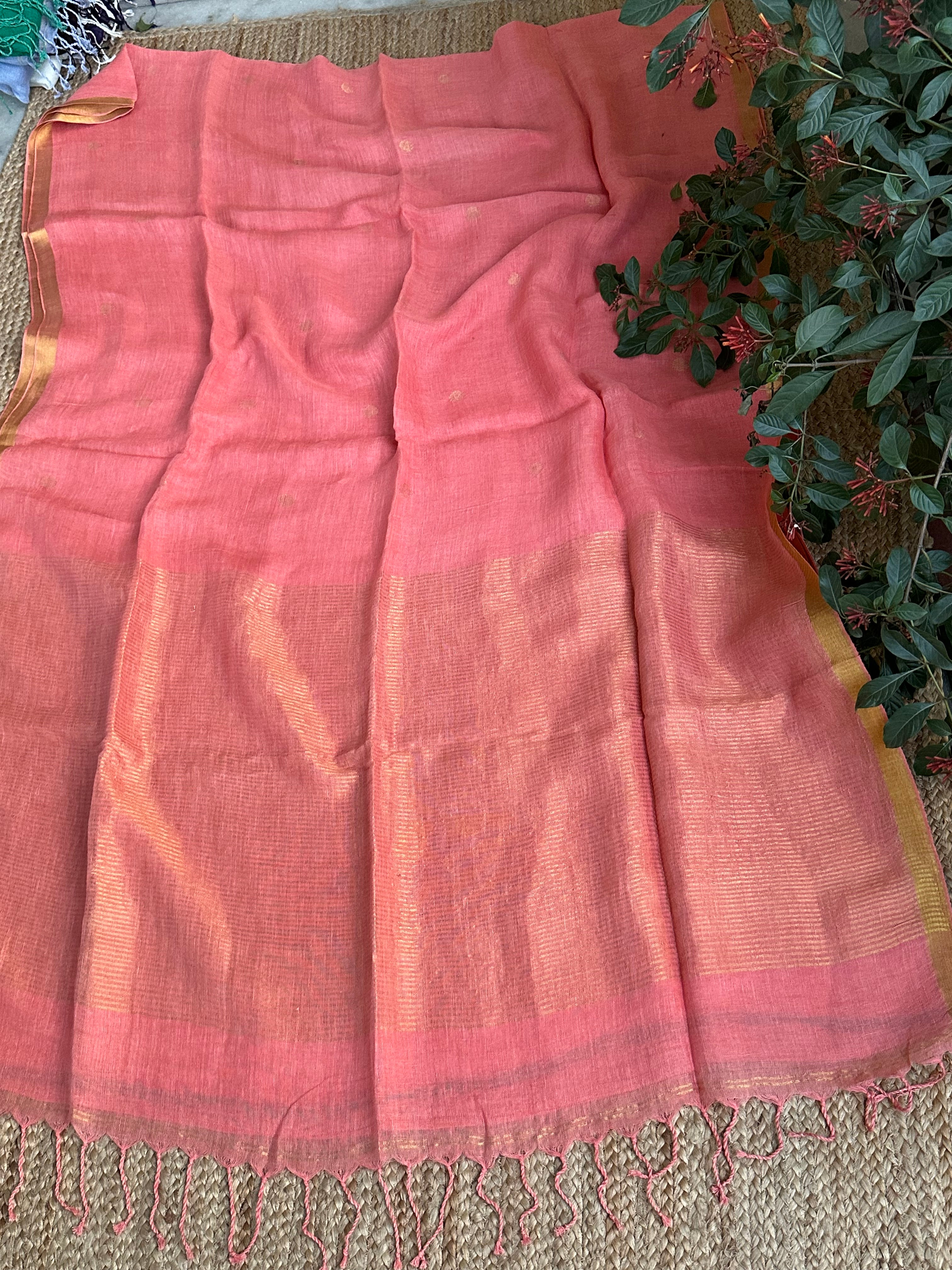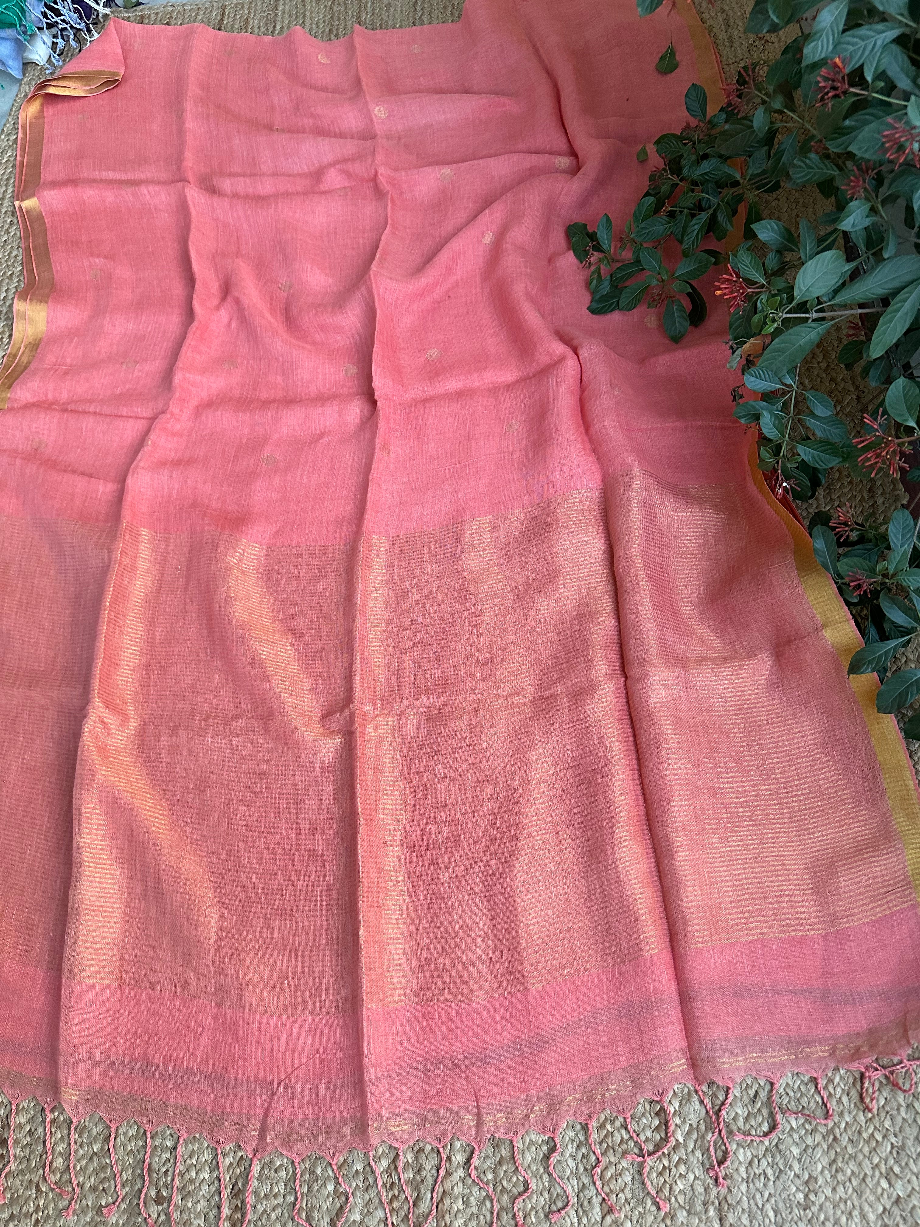 Material: Pure linen by linen handloom sarees with golden zari pallu and small circle bootas.