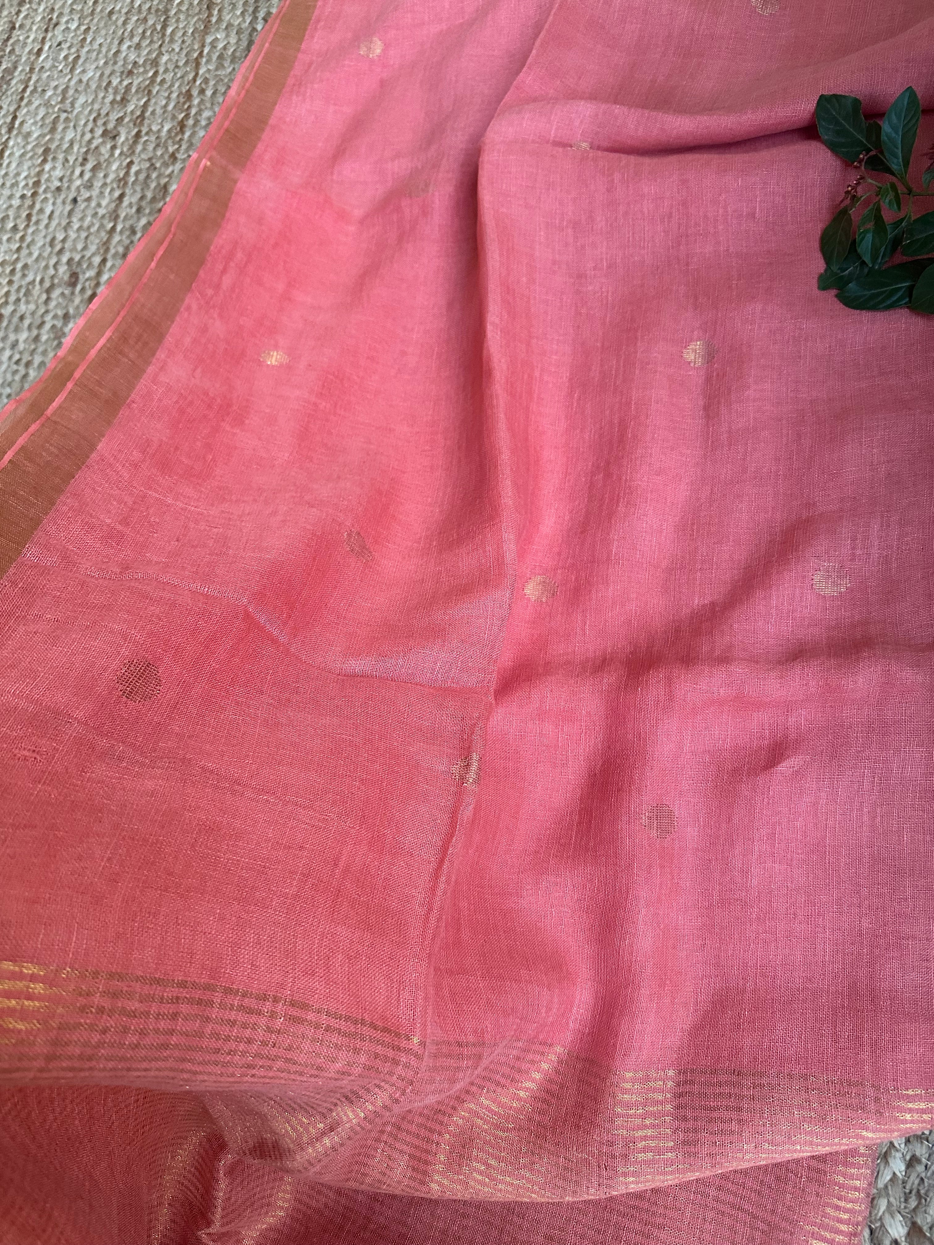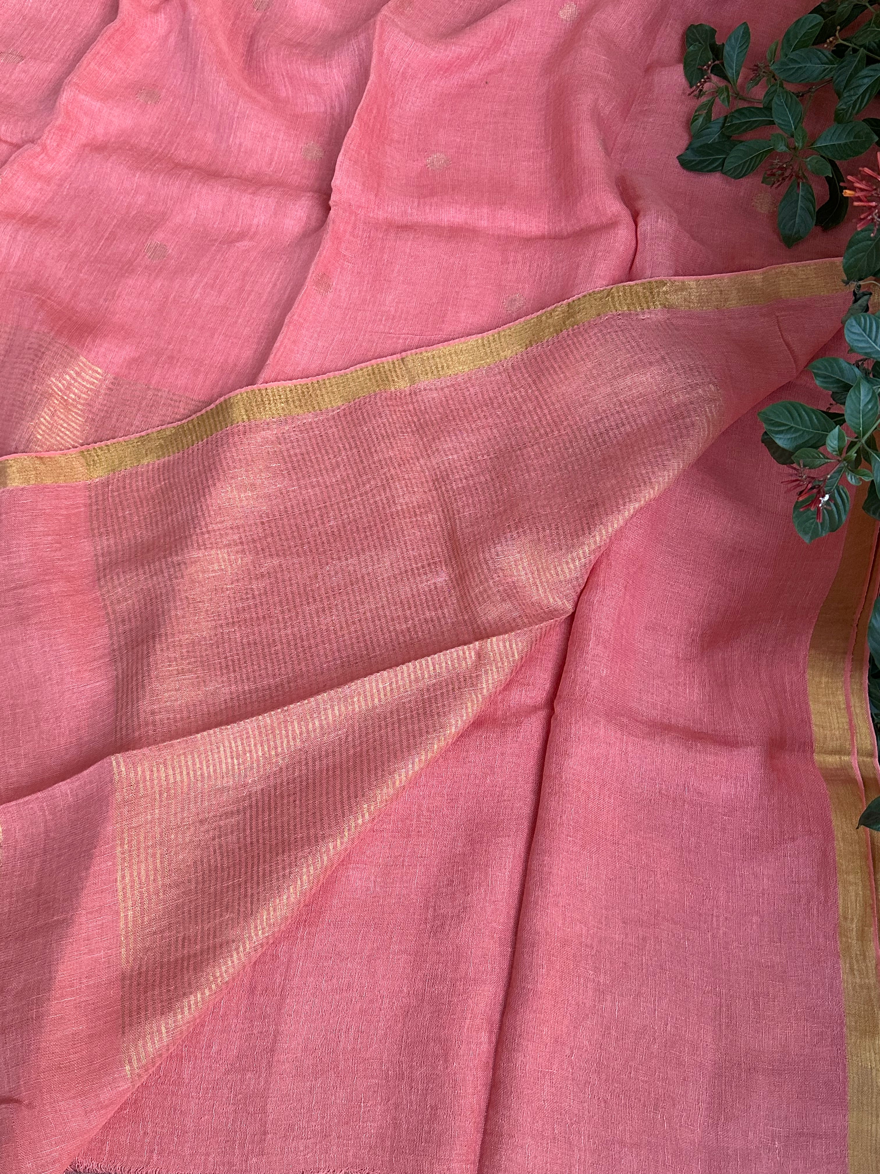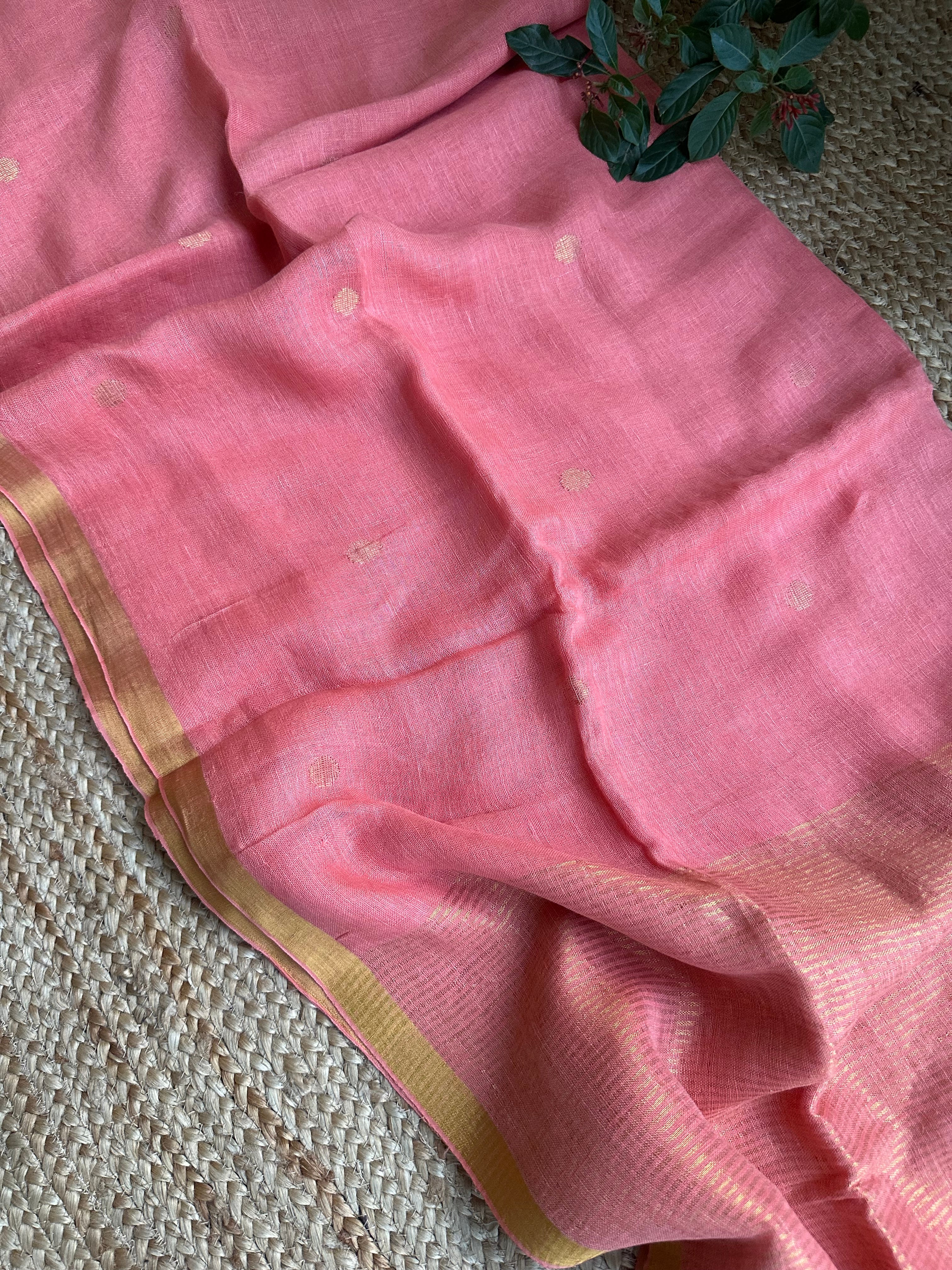 Material: Pure linen by linen handloom sarees with golden zari pallu and small circle bootas.