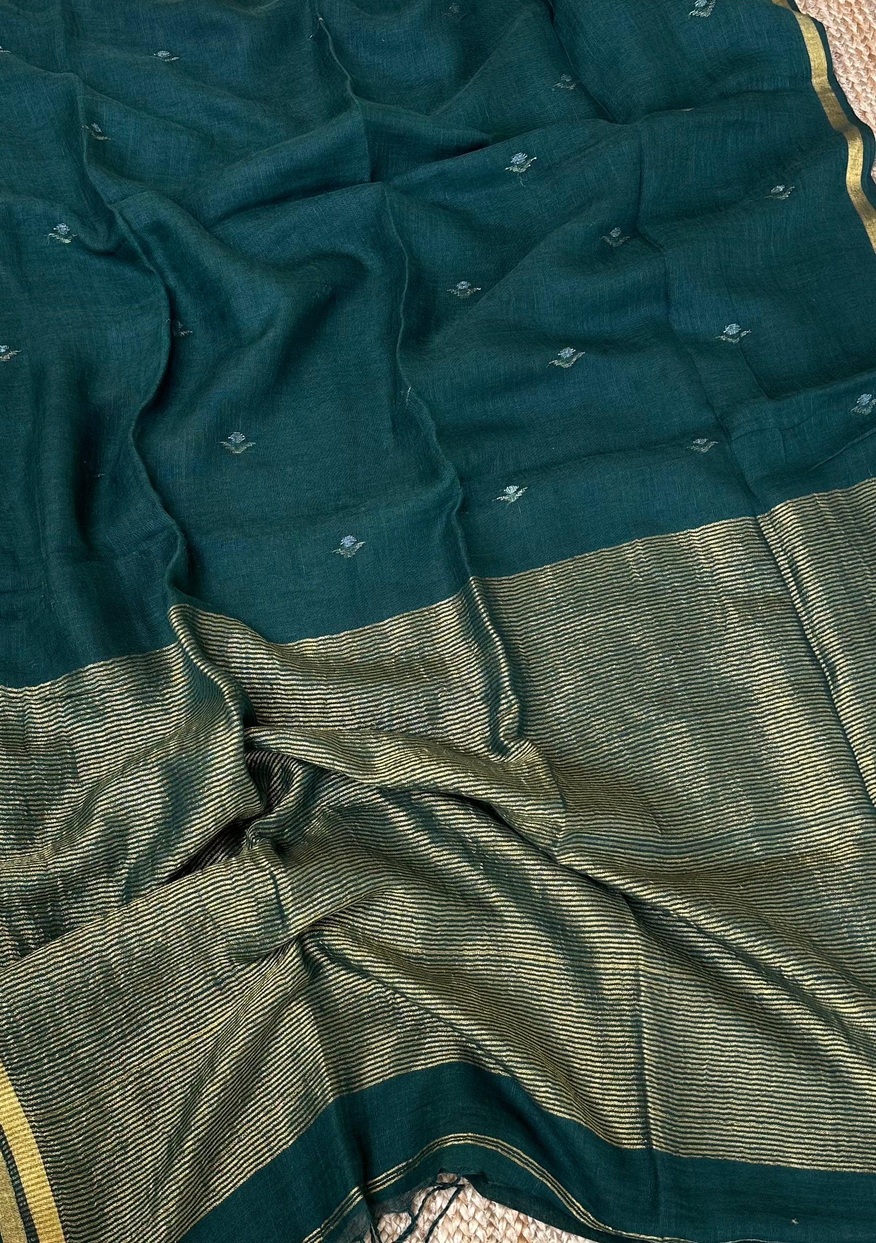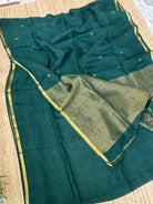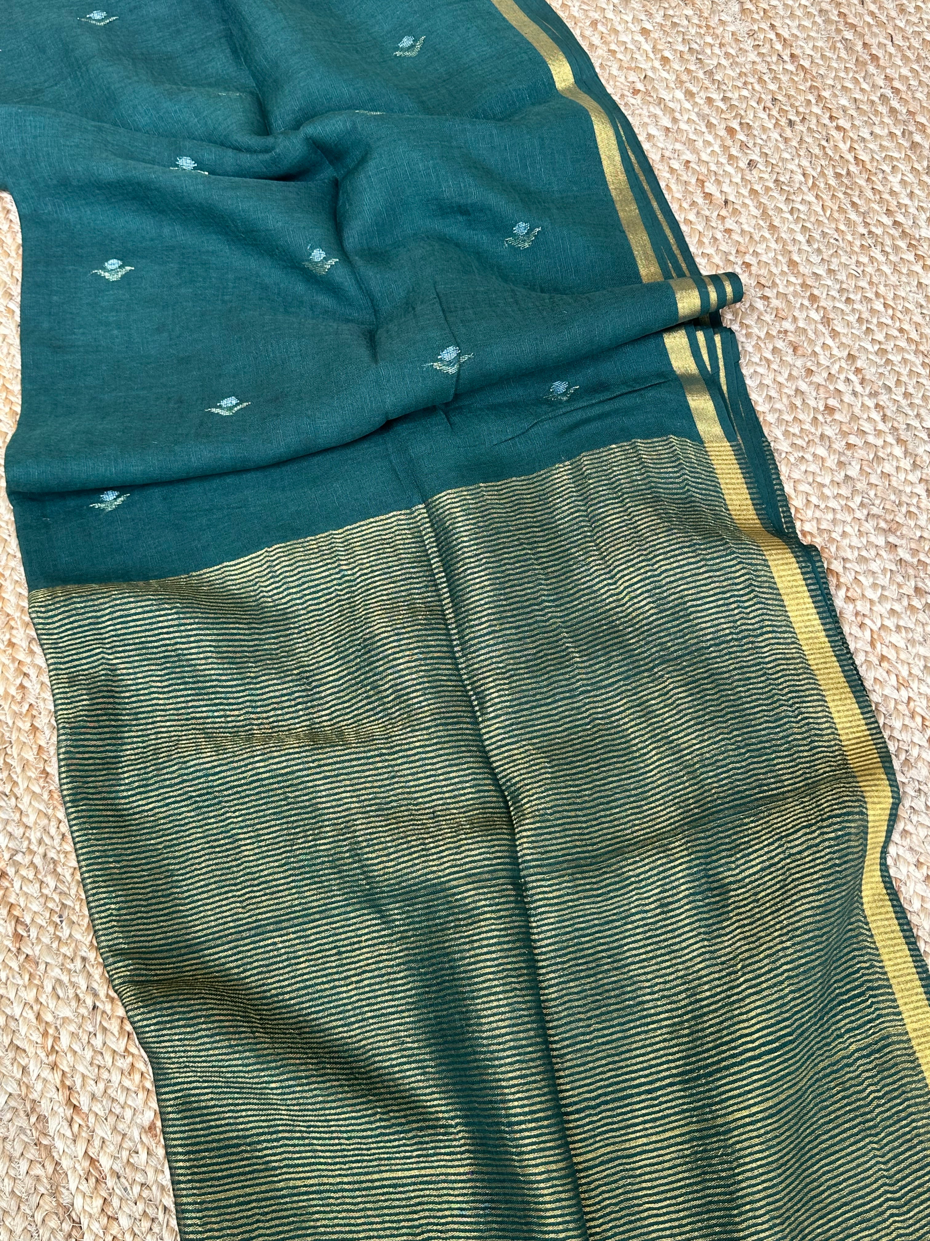 Pure Handloom Saree with Golden Zari bootas- Dark Green