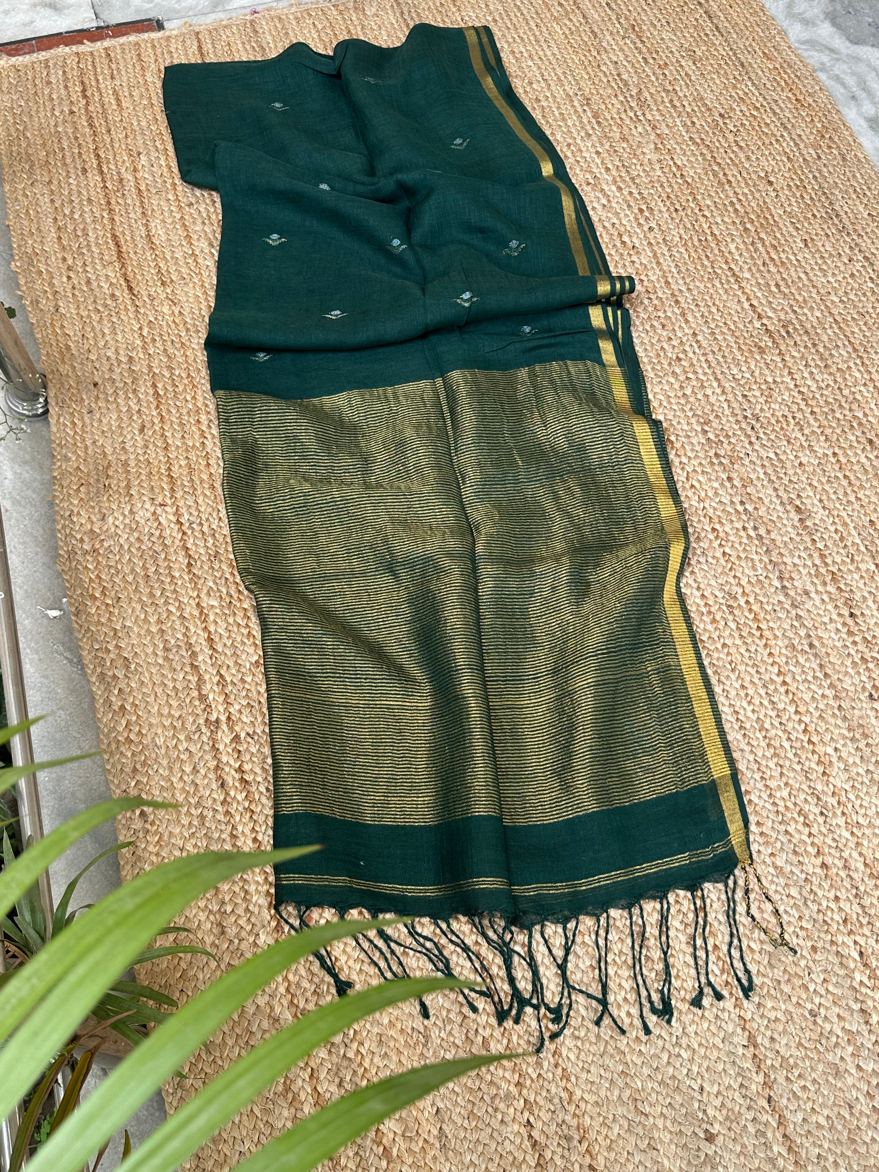 Material: Pure linen by linen handloom sarees with golden zari pallu and small circle bootas.