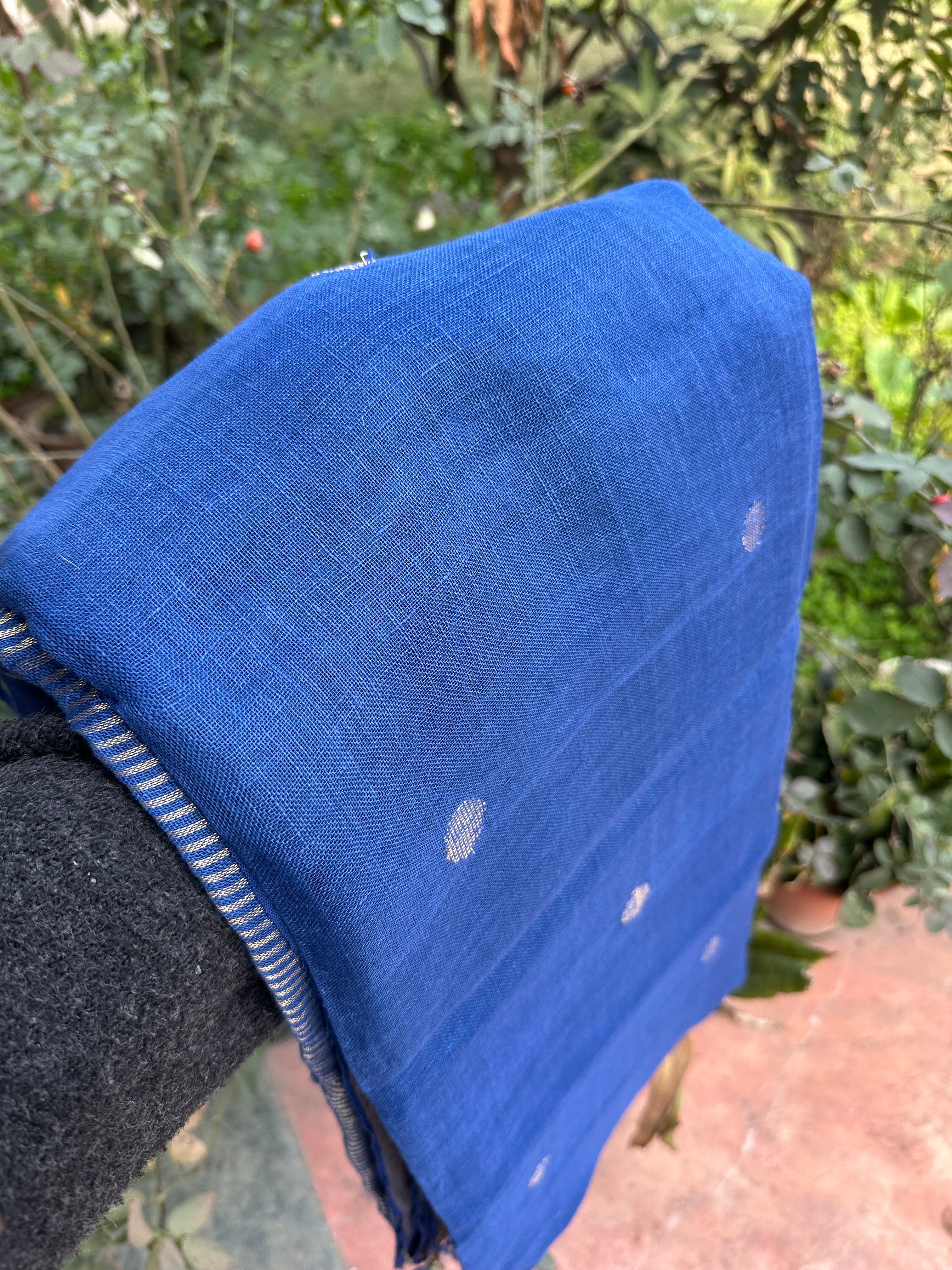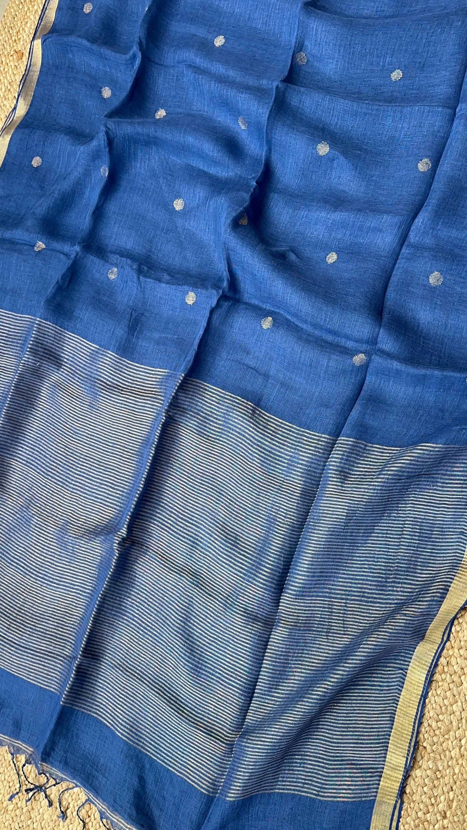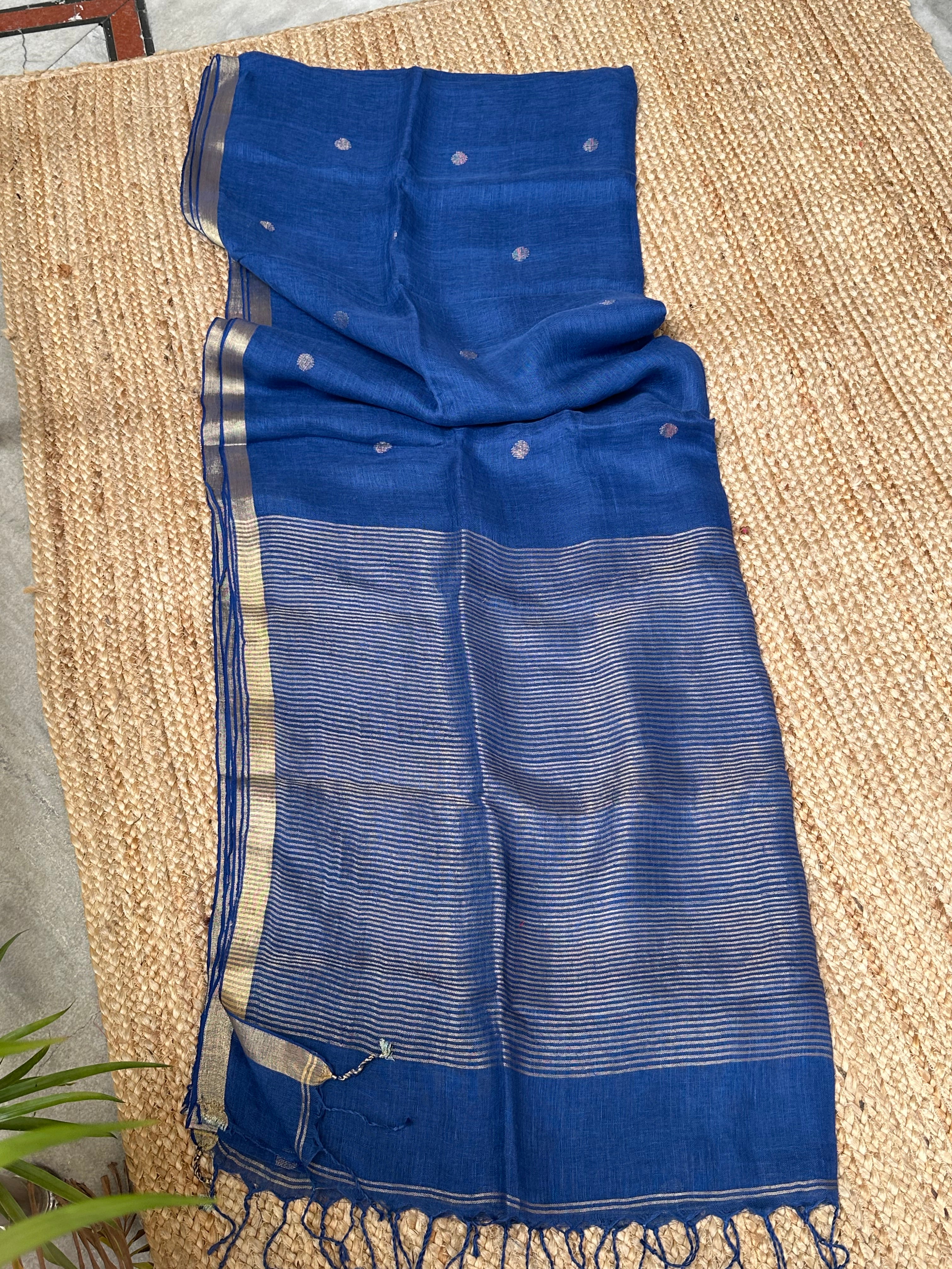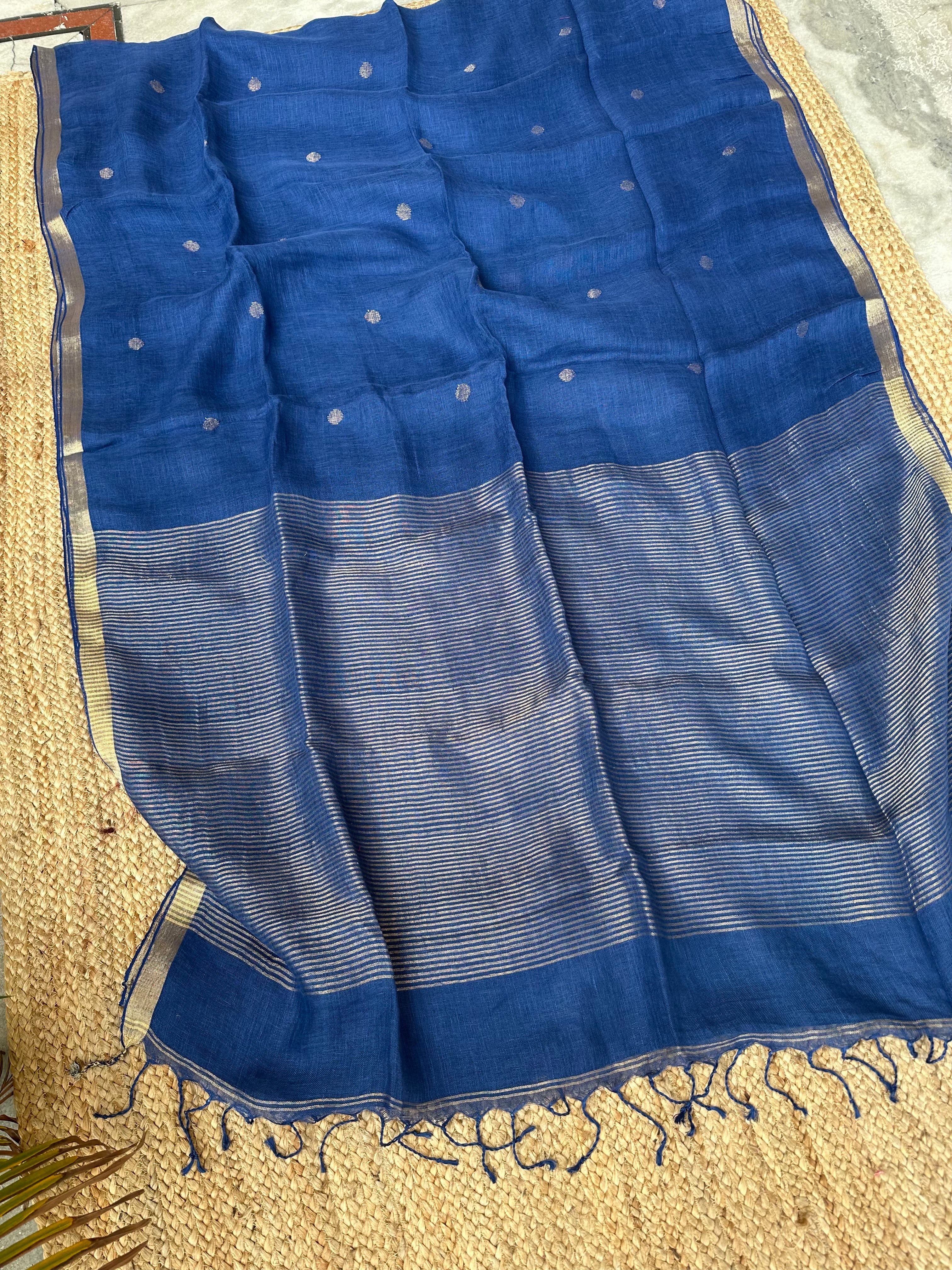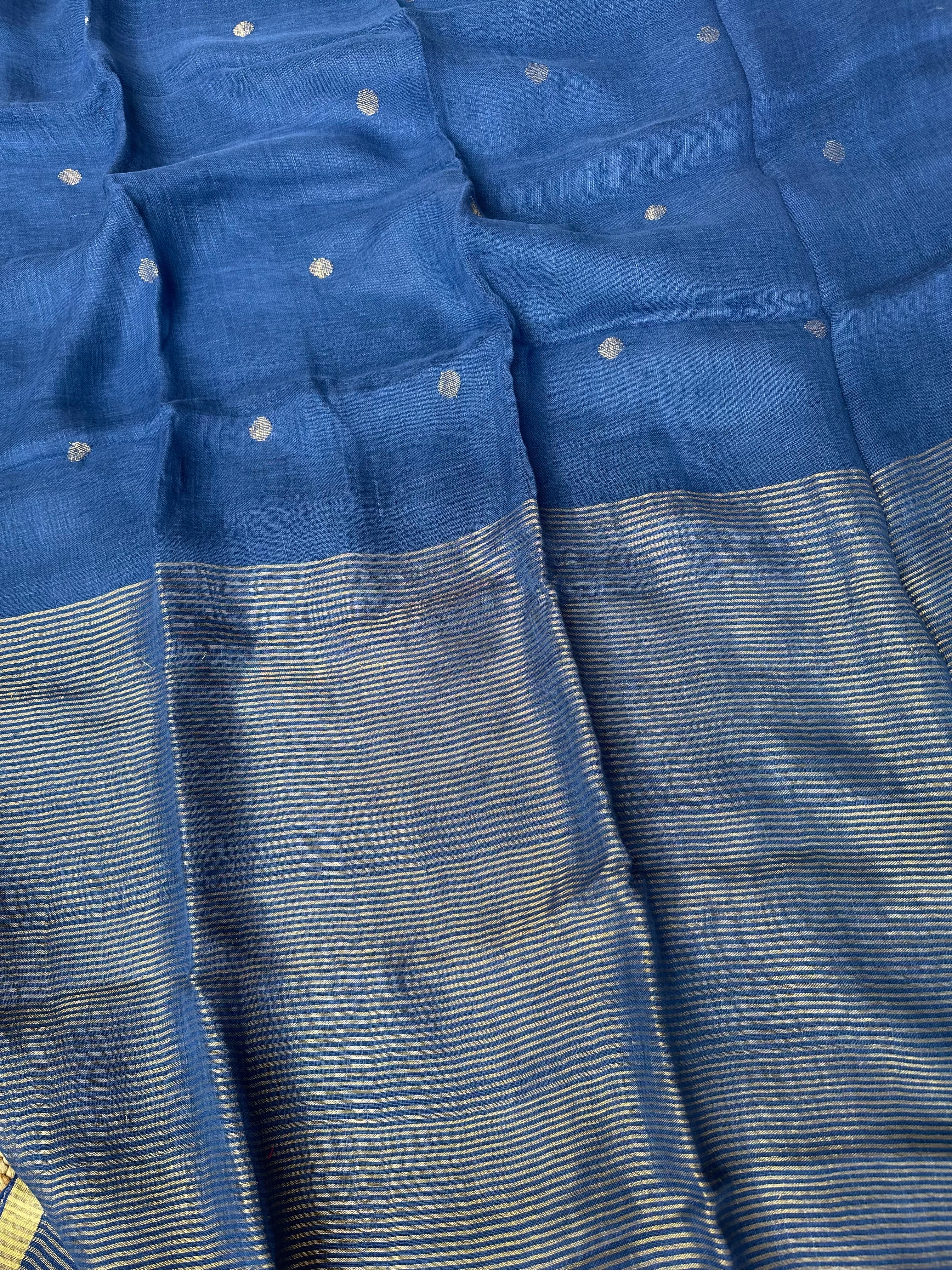 Material: Pure linen by linen handloom sarees with golden zari pallu and small circle bootas.