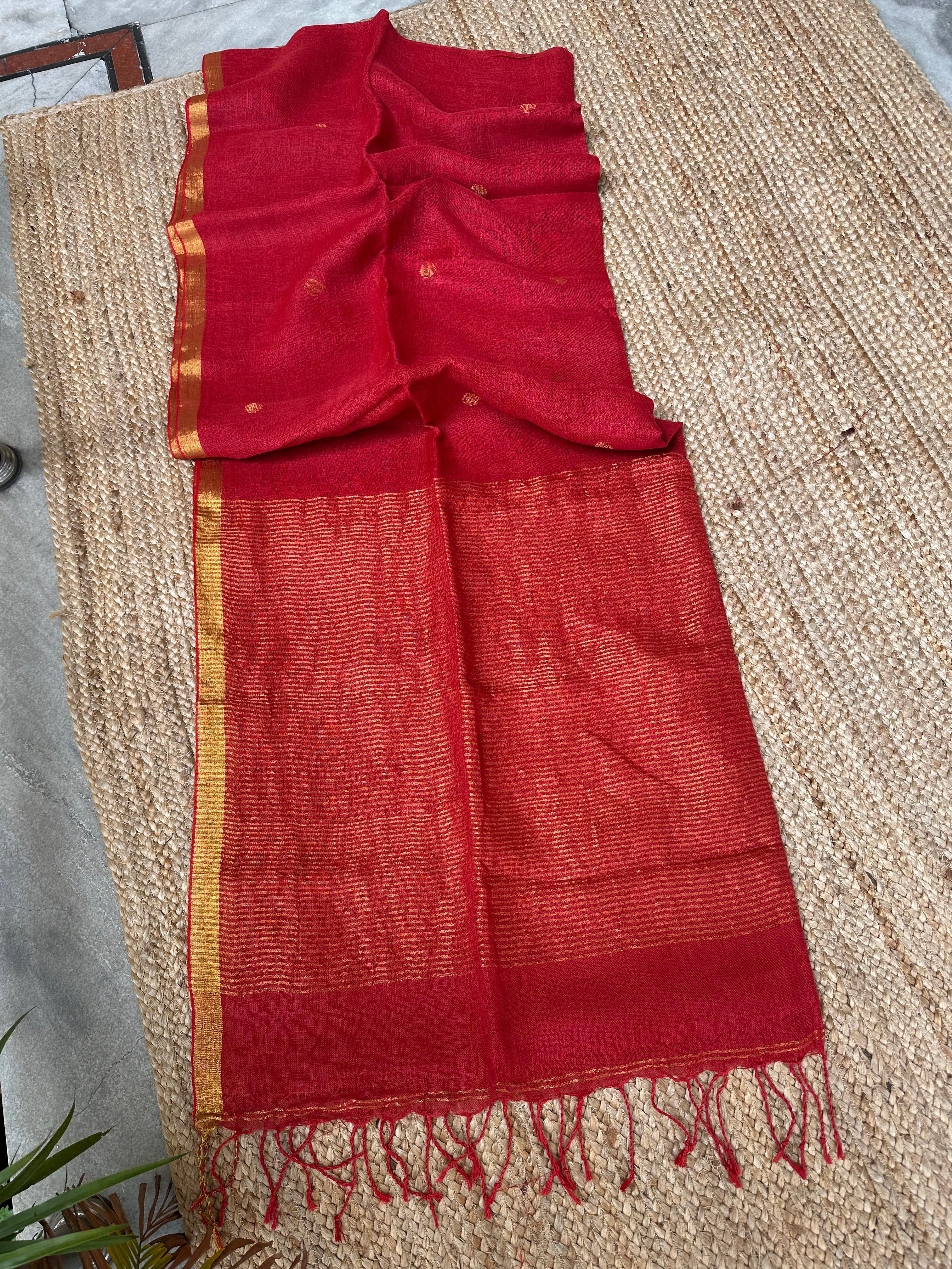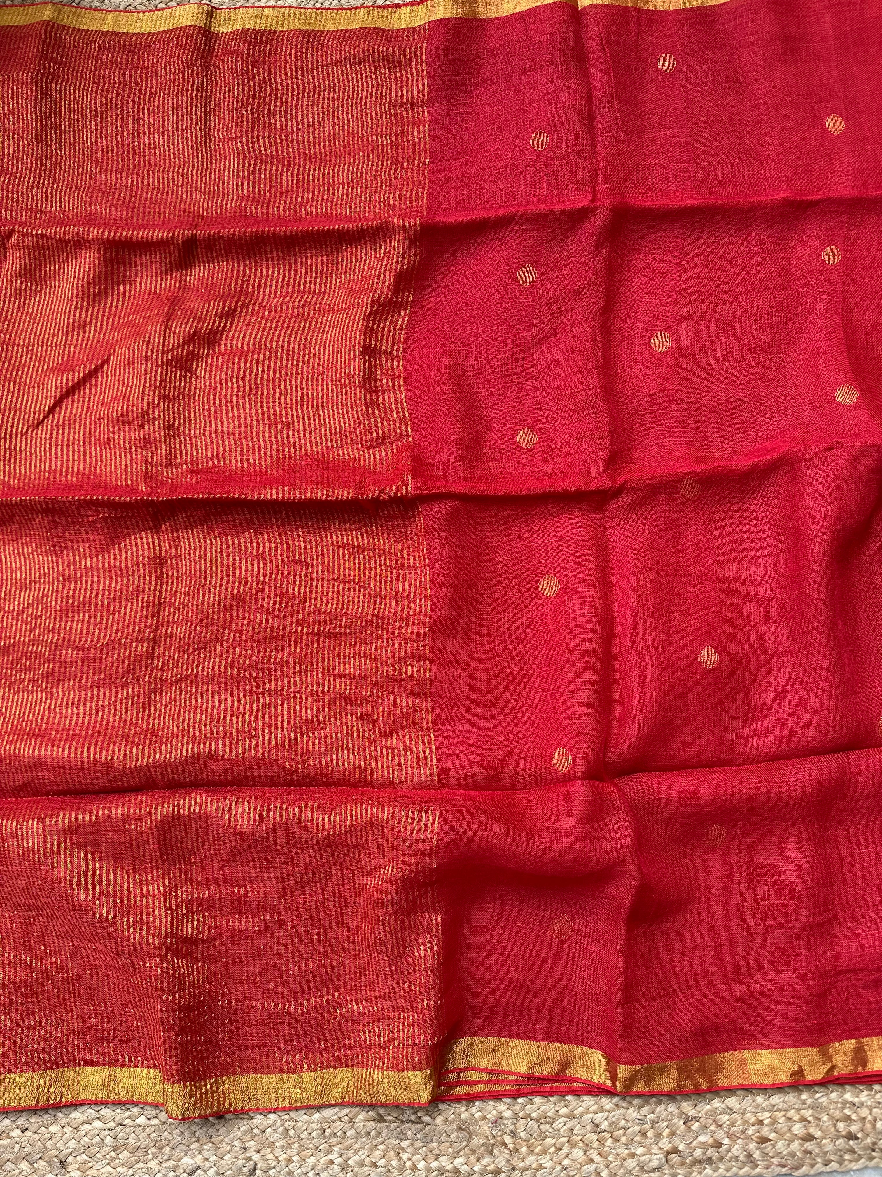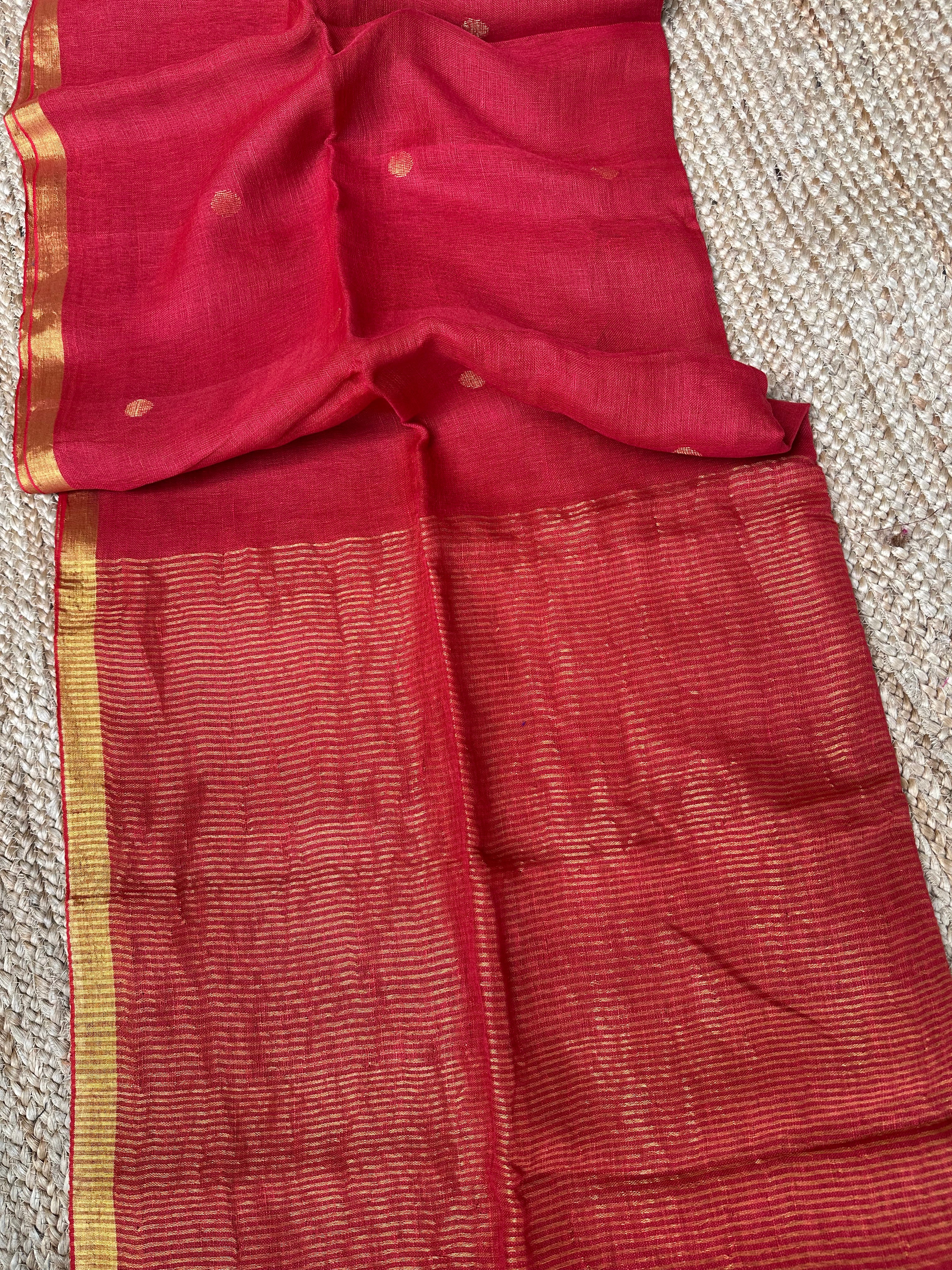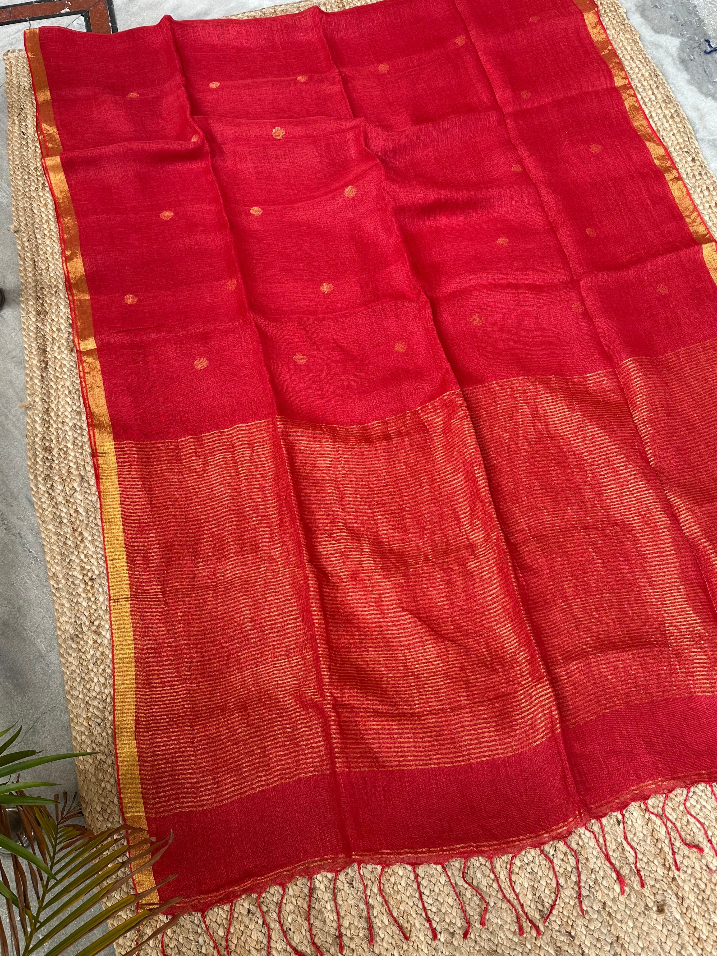 Material: Pure linen by linen handloom sarees with golden zari pallu and small circle bootas.
